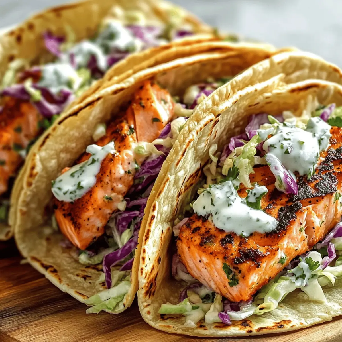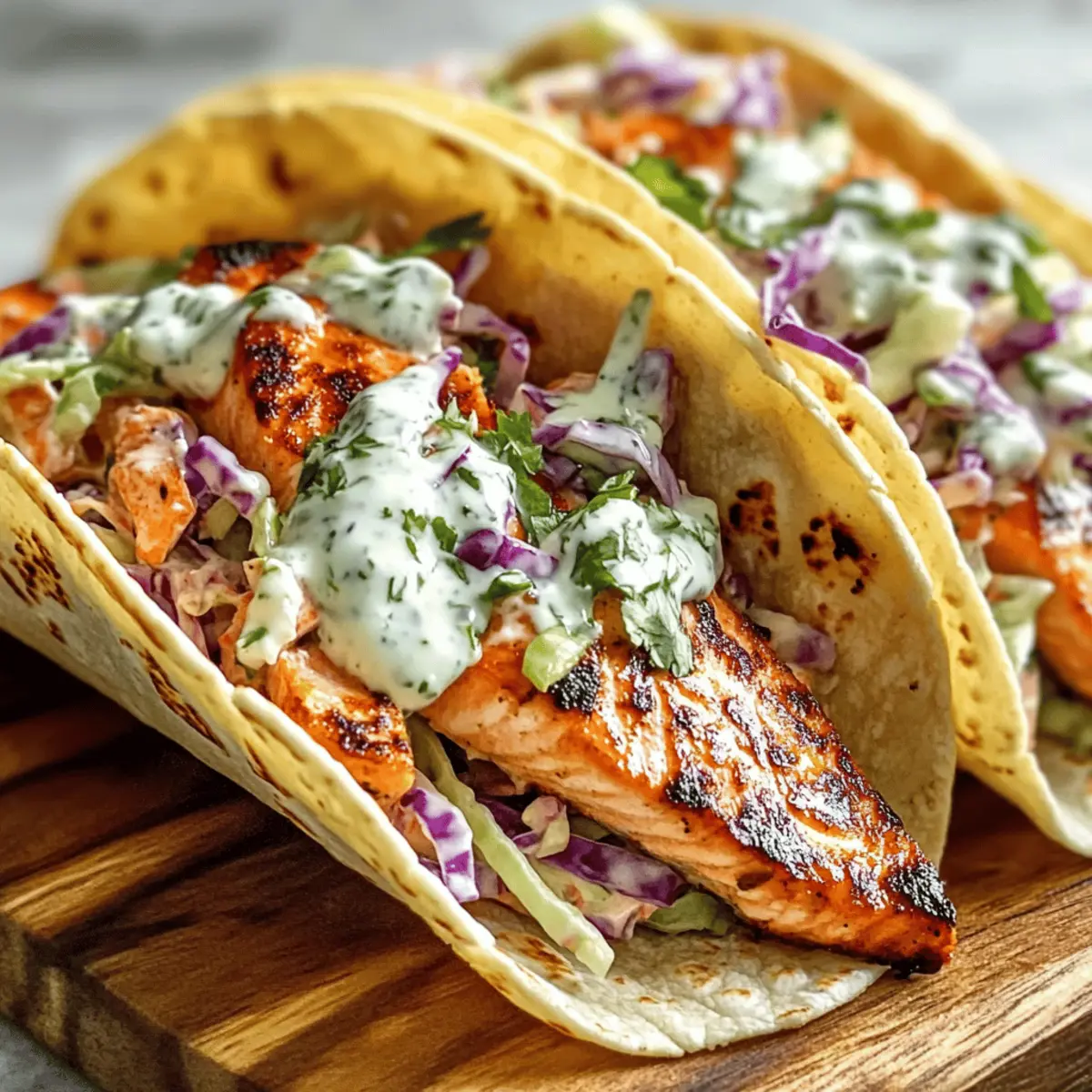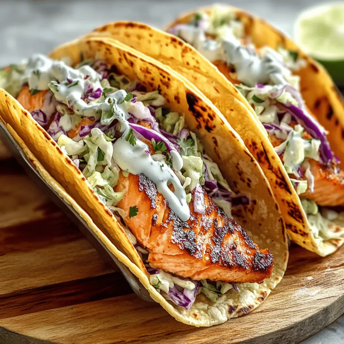 As I stood in my kitchen, the air filled with the tantalizing scent of spices mingling with the rich aroma of salmon, I knew I was in for a treat. These Air Fryer Salmon Tacos with Slaw are a revelation for busy weeknights—quick to prepare and completely customizable to suit every palate. The combination of flaky salmon and crunchy, vibrant slaw creates a delightful texture contrast, making this dish a family favorite. Plus, you can easily adapt these tacos for a gluten-free lifestyle by choosing the right tortillas. Picture yourself savoring these fresh, zesty bites while knowing you’ve prepared a wholesome meal in no time. What toppings will you add to make them your own? Let’s dive into this delicious adventure together! Why are Air Fryer Salmon Tacos a must-try? Quick and Easy: These tacos can be on your table in under 30 minutes, making them perfect for those busy weeknights. Endless Customization: With a variety of toppings like avocado or salsa, you can easily cater to everyone’s taste in your family. Healthy Yet Satisfying: Featuring flaky salmon and crunchy slaw, these tacos are both light and filling—great for those wanting a wholesome meal. Flavor Explosion: The blend of spices and creamy yogurt creates a mouthwatering taste experience that will keep you coming back for more. Gluten-Free Options: Simply swap corn tortillas for a gluten-free choice, ensuring everyone can enjoy this delightful dish! Pair these delicious tacos with a side of Cajun Salmon Lemon for a full seafood experience! Air Fryer Salmon Tacos Ingredients For the Salmon • Salmon Fillets – Main protein source; skinless for a tender and flaky texture. Substitute with any firm fish like cod or tilapia. • Olive Oil – Adds richness and helps the spice mix adhere; can substitute with avocado oil for a lighter flavor. • Chili Powder – Provides a warm, spicy flavor that complements the fish; adjust quantity for personal spice preference. • Garlic Powder – Enhances overall taste with depth; fresh garlic can be used as a flavorful substitute. • Smoked Paprika – Adds a smoky dimension to the dish; regular paprika can be used but will lack that distinct smokiness. • Salt – Essential for seasoning; use less if you’re following a diet-restricted plan. For the Slaw • Shredded Cabbage – Provides crunch and freshness; both red and green cabbage work well, or you can opt for a pre-bagged slaw mix to save prep time. • Fresh Cilantro – Adds a herbaceous note to slaw; parsley can be used for a milder flavor. • Greek Yogurt – Offers creaminess and tang; can be replaced with sour cream for a different flavor profile. • Lime Juice – Brightens the flavor of the slaw; lemon juice works as an alternative if needed. For the Tacos • Corn Tortillas – The base for your tacos; their small size is ideal for layering all the scrumptious ingredients. Consider flour tortillas for a soft texture. Feel free to experiment with your toppings on these Air Fryer Salmon Tacos to make them your own! Step‑by‑Step Instructions for Air Fryer Salmon Tacos with Slaw Step 1: Preheat the Air Fryer Begin by preheating your air fryer to 400°F (200°C). While the air fryer warms, prepare your salmon fillets by patting them dry with a paper towel—this ensures a nice, crispy texture. The fillets should look fresh and clean, ready to absorb that flavorful spice blend. Step 2: Prepare the Spice Mixture In a small bowl, mix together the olive oil, chili powder, garlic powder, smoked paprika, and salt until well combined. This vibrant mixture will coat your salmon fillets. Brush this spice blend generously over the salmon, ensuring an even coating that glistens, giving you an enticing aroma and flavor infusion for your Air Fryer Salmon Tacos. Step 3: Air Fry the Salmon Carefully place the spiced salmon fillets in the air fryer basket, ensuring they are not overcrowded. Air fry the salmon for about 8-10 minutes, or until it flakes easily with a fork and appears slightly golden on the edges. The fish should be fragrant and cooked through, ready to be transformed into delicious tacos. Step 4: Make the Slaw While the salmon is cooking, find a mixing bowl to create your slaw. Combine the shredded cabbage, fresh cilantro, Greek yogurt, and lime juice. Toss everything together until the cabbage is well coated and the ingredients meld beautifully. The slaw should look fresh and vibrant, adding a delightful crunch to your tacos. Step 5: Warm the Tortillas Warm your corn tortillas either in a skillet over medium heat for about 30 seconds on each side or in the microwave for about 15 seconds. This step will make your tortillas pliable and slightly toasted, enhancing the overall experience of your Air Fryer Salmon Tacos with Slaw. Step 6: Assemble the Tacos Once the salmon has finished cooking, flake it into bite-sized pieces using a fork. Take a tortilla and layer on the flaked salmon followed by a generous spoonful of the refreshing slaw you just prepared. These vibrant layers will create a perfect balance of flavors, and your tacos should look colorful and inviting. Step 7: Serve and Enjoy Serve your assembled Air Fryer Salmon Tacos immediately while the tortillas are still warm and they maintain their delightful crunch. Feel free to add any extra toppings like avocado slices or a squeeze of lime to enhance the flavor. Enjoy this quick and delicious meal with family and friends, creating cherished moments around the table! Make Ahead Options These Air Fryer Salmon Tacos with Slaw are perfect for busy cooks who love meal prep! You can prep the slaw up to 3 days in advance; simply mix the shredded cabbage, cilantro, Greek yogurt, and lime juice in a bowl and refrigerate to keep it fresh and crunchy. The salmon can be marinated in the spice blend and stored in the refrigerator for up to 24 hours before cooking, ensuring flavors develop beautifully. When you’re ready to enjoy, air fry the marinated salmon and warm the