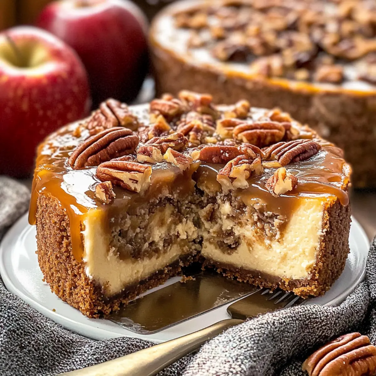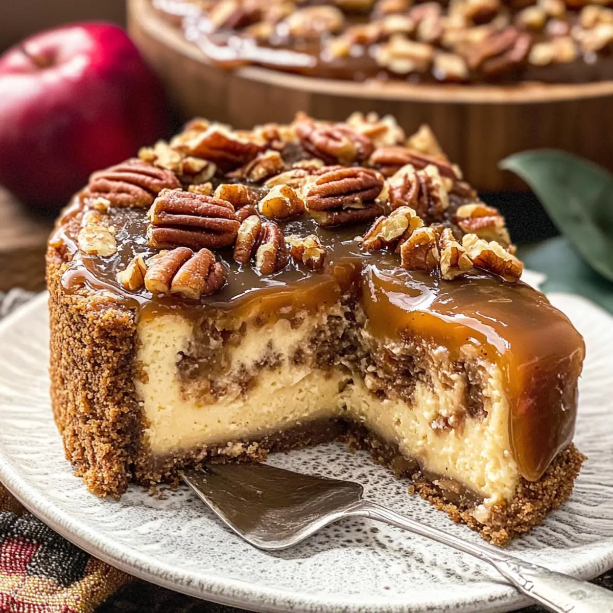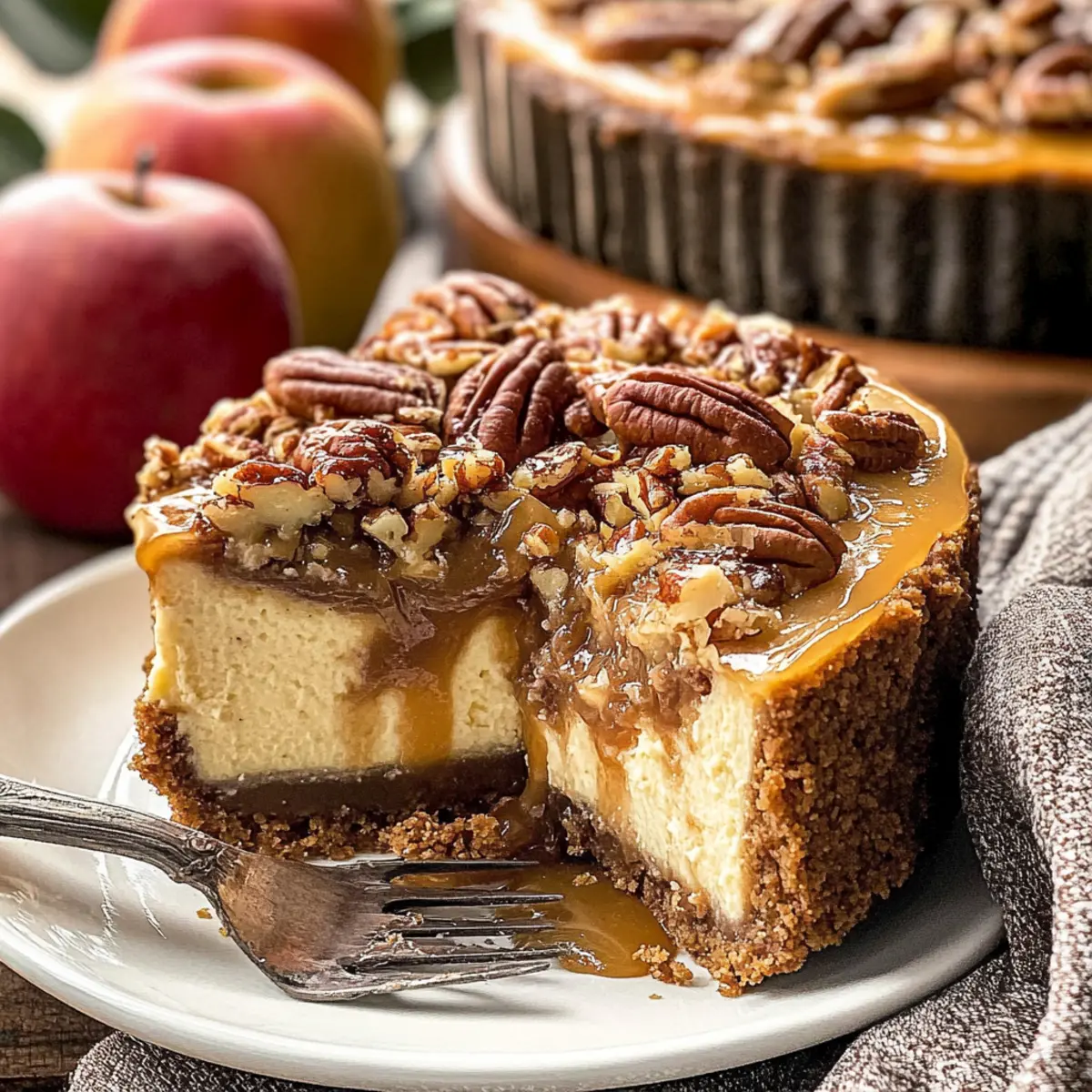 Facebook Twitter Pinterest LinkedInAs the sweet aroma of caramelized apples fills the air, I can’t help but recall the childhood joy of homemade desserts. This Apple Bottom Bourbon Pecan Cheesecake is that very essence transformed into an indulgent delight. With layers of bourbon-infused caramel apples perched atop a velvety cream cheese filling and crowned with a crunchy praline pecan topping, it’s the perfect decadent Southern dessert for any celebration. It’s not just about taste; this cheesecake is a manageable baking adventure that caters to both novice bakers and seasoned pros alike. So, whether you’re hosting a gathering or simply looking to treat yourself, this dessert will surely become a cherished recipe in your kitchen. Are you ready to embark on a sweet journey that’ll impress everyone at the table? Why is this cheesecake a must-try? Decadent flavors: The Apple Bottom Bourbon Pecan Cheesecake beautifully marries tangy cream cheese and bourbon-infused caramel apples, creating a rich flavor profile that’s simply irresistible. Easy to make: With straightforward steps, even novice bakers can confidently craft this stunning dessert without feeling overwhelmed. Versatile options: Feel free to customize! You can easily swap the pecans for hazelnuts or adjust the spices for a personalized touch. Perfect for celebrations: This cheesecake shines at any gathering, making it a go-to choice for holidays, birthday parties, or family get-togethers. Pair it with freshly whipped cream and coffee for the ultimate dessert experience! Lasting memories: Baking this beauty can evoke warm memories of homemade treats and cherished family time, making it not just a recipe, but a tradition. Don’t forget to check out our Crock Pot Bourbon for another delightful twist on the bourbon theme! Apple Bottom Bourbon Pecan Cheesecake Ingredients For the Crust • Graham Crackers (or Gingersnaps) – Base structure for the crust; substitute with Oreo for extra chocolatey goodness. • Unsalted Butter – Binds the crust ingredients; make sure it’s melted before mixing. • Granulated Sugar – Adds sweetness to the crust. For the Caramel Apple Layer • Bourbon – Flavor enhancer in the caramel apple layer; feel free to substitute with apple juice for a non-alcoholic version. • Salt – Balances sweetness in both the caramel and praline. • Granny Smith Apples – The star of the caramel layer, providing tartness; you can swap for Honeycrisp apples for a sweeter bite. • Cinnamon – Adds warmth and depth to the flavor profile. • Vanilla Extract – Enhances the overall flavor, making the apples sing. For the Cheesecake Filling • Cream Cheese – The core of the cheesecake filling; use full-fat cream cheese for the creamiest texture. • Cornstarch – Acts as a stabilizer for the cheesecake filling; don’t substitute with flour as it alters the texture. • Eggs & Egg Yolk – Essential for richness and structure in the filling. • Sour Cream – Adds moisture and a hint of tang; opt for Greek yogurt for a lighter substitute. For the Praline Topping • Brown Sugar – Adds depth to the praline topping; choose between light or dark depending on your taste. • Heavy Cream – Gives the praline topping its creamy, rich texture; can be replaced with coconut cream for a non-dairy option. • Pecan Halves – Creates the delightful texture of the praline topping; substitute with walnuts for a different flavor profile. Step‑by‑Step Instructions for Apple Bottom Bourbon Pecan Cheesecake Step 1: Prepare the Crust Preheat your oven to 350°F (175°C). In a food processor, pulse graham crackers or gingersnaps into fine crumbs, then mix with melted butter and granulated sugar. Press this mixture firmly into the bottom of a springform pan, ensuring an even layer. Bake for about 10 minutes until golden brown, then let it cool. Lower the oven temperature to 325°F (160°C) for the next steps. Step 2: Make the Caramel Apple Layer In a medium saucepan over medium heat, melt granulated sugar until it turns a golden amber color. Carefully stir in bourbon and allow the alcohol to cook off for about 1-2 minutes. Add in butter, salt, and finely chopped Granny Smith apples. Cook for 5-7 minutes until the apples soften. Finally, mix in cinnamon and vanilla extract before pouring this delicious caramel apple layer over your cooled crust. Step 3: Prepare the Cheesecake Filling In a large mixing bowl, beat together softened cream cheese and granulated sugar until smooth and creamy. Gradually add in cornstarch, mixing well to eliminate lumps. Incorporate eggs one by one, ensuring each is fully combined before adding the next. Add the egg yolk, sour cream, and a splash of vanilla extract, and beat until the filling is silky. Pour this luxurious cheesecake batter over the caramel apple layer in your springform pan. Step 4: Bake Carefully place the springform pan into a larger baking dish, filling the outer dish with hot water to create a water bath. Bake at 325°F (160°C) for 1.5 to 2 hours, checking for doneness when the center is set and jiggles slightly. Once baked, turn off the oven, crack the door, and let the cheesecake cool in the oven for at least an hour before transferring it to the fridge to chill overnight. Step 5: Make the Praline Topping In a saucepan over medium heat, combine brown sugar, heavy cream, and a splash of bourbon. Stir the mixture continuously until it starts to bubble and thickens slightly, about 3-5 minutes. Remove from heat and stir in pecan halves, ensuring they’re well coated. Allow the praline topping to cool completely before spreading it generously over the chilled cheesecake. Step 6: Serve Once the cheesecake has chilled overnight, carefully release it from the springform pan. Top the cheesecake with the cooled praline mixture evenly. Slice with a sharp knife for neat portions, and serve chilled or at room temperature for that perfect balanced flavor in your Apple Bott