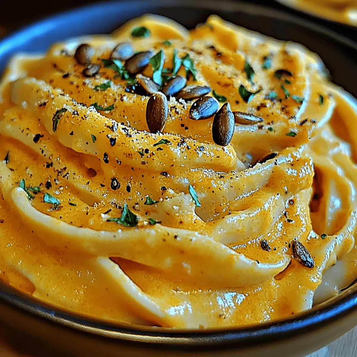 Plate the Autumn Harvest Creamy Pumpkin Alfredo Pasta into bowls, garnishing with freshly chopped herbs like parsley or basil for a pop of color. For an extra crunch, sprinkle some toasted pumpkin seeds on top, adding texture and seasonal flair that will make your meal visually appealing and irresistibly delicious.