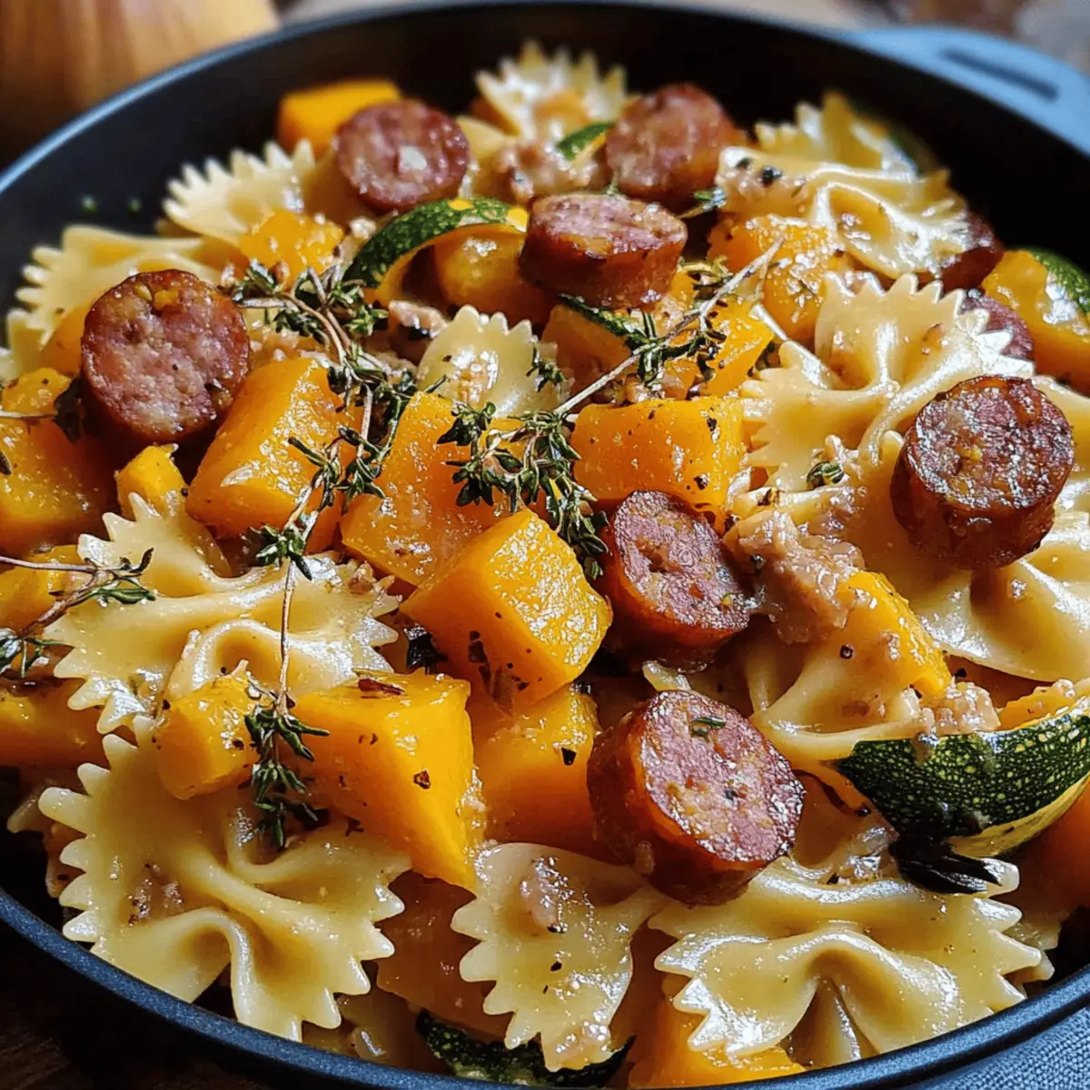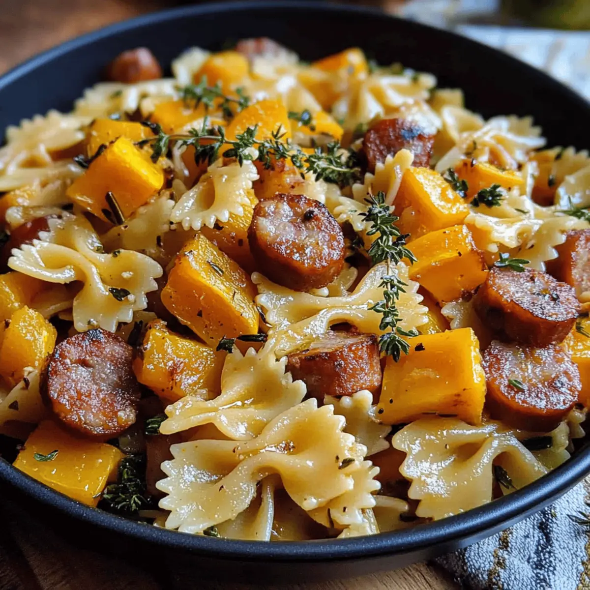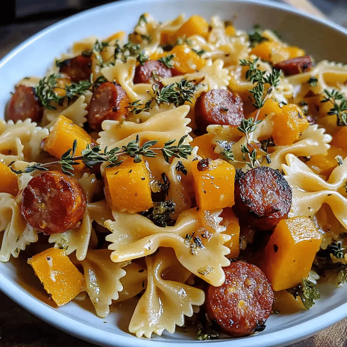 As the leaves turn and the air gets crisp, my kitchen shifts into a comforting cocoon where soul-soothing meals come to life. You can’t help but fall in love with this Autumn Sausage Pasta Squash, featuring sweet roasted butternut squash and hearty smoked sausage, all enveloped in a fragrant garlic butter sauce. This one-skillet meal isn’t just a quick prep—it’s a delightful escape from fast food that nourishes both body and soul. In just 25 minutes, you can serve up a platter of cozy comfort food that showcases the best flavors of fall while accommodating both meat lovers and vegetarians alike. Ready to savor the season? Let’s dive into how to create this delightful dish! Why is this pasta perfect for fall? Comforting, cozy flavors abound in this dish, as the roasted butternut squash and smoked sausage create a warm hug for your taste buds. Quick and easy to whip up, this one-skillet meal is ready in just 25 minutes—a lifesaver for busy weeknights! Versatile ingredients allow you to customize with different sausages or squash, making it suitable for both meat lovers and vegetarians. Rich garlic butter sauce ties everything together, elevating your dining experience. Pair with a fresh salad or warm bread to complete the meal, and you’ll find yourself saying goodbye to fast food for good! Autumn Sausage Pasta Squash Ingredients For the Pasta • Bow Tie Pasta – Acts as the carbohydrate base of the meal; substitute with any pasta shape you prefer. For the Vegetables • Butternut Squash – Provides sweetness and texture; substitute with acorn squash or sweet potatoes during off-season. • Brussels Sprouts – Adds bitterness and crunch; can be replaced with green beans or bell peppers. For the Sausage • Smoked Sausage – Adds rich, savory flavor (cajun, andouille, or regular); use vegetarian sausage crumbles or extra roasted vegetables for a vegetarian version. For Cooking and Flavor • Olive Oil – Used for roasting and sautéing; enhances flavor; can substitute with cooking spray or butter. • Garlic – Provides aromatic depth; fresh garlic is best; avoid overcooking to prevent bitterness. • Butter – Adds richness to the sauce; optional for a dairy-free version. • Smoked Paprika – Contributes subtle smokiness and color; can replace it with regular paprika or omit. • Fresh Thyme – Offers fresh herbal notes; you can use dried thyme if fresh is unavailable. Notes: Gather these ingredients for a cozy bowl of Autumn Sausage Pasta Squash. Enjoy the vibrant fall flavors! Step‑by‑Step Instructions for Autumn Sausage Pasta Squash Step 1: Preheat the Oven Begin by preheating your oven to 200°C (400°F). This temperature is ideal for roasting the butternut squash and Brussels sprouts, ensuring they become tender and caramelized. While the oven heats, prepare your vegetables to maximize efficiency. Step 2: Prepare the Butternut Squash In a large bowl, toss the cubed butternut squash with olive oil, salt, and pepper until evenly coated. Spread the squash on a baking sheet, making sure to keep the pieces in a single layer for optimal roasting. Place in the preheated oven and roast for 15-20 minutes or until fork-tender and beginning to brown. Step 3: Roast the Brussels Sprouts Nestle your prepared Brussels sprouts on the same baking sheet or another. Drizzle with olive oil, sprinkle with salt and pepper, and toss to coat. Roast for 20-30 minutes, stirring halfway through, until they are golden brown and crispy on the outside, enhancing their natural flavors. Step 4: Cook the Pasta While the vegetables roast, bring a large pot of salted water to a boil. Add the bow tie pasta and cook according to the package instructions until al dente, about 8-10 minutes. Just before draining, reserve about 1 cup of the starchy pasta water, then drain the rest and set the pasta aside. Step 5: Brown the Sausage In a large skillet over medium heat, add a drizzle of olive oil and the sliced smoked sausage. Cook for 5-7 minutes, or until the sausage is browned and crispy on the edges. Once browned, remove the sausage from the skillet and set it aside on a plate, leaving the drippings for added flavor. Step 6: Sauté the Garlic Use the same skillet to add the minced garlic over medium heat, stirring constantly for about 1 minute until fragrant—be careful not to let it burn. Add the butter and let it melt, creating a rich garlic butter sauce that becomes the flavorful base for your Autumn Sausage Pasta Squash. Step 7: Combine the Ingredients In the skillet with the garlic butter, toss in the cooked bow tie pasta, mixing well to coat with the sauce. Gradually add in the roasted butternut squash, Brussels sprouts, and browned sausage. If the mixture seems dry, pour in some reserved pasta water to achieve a creamy texture. Step 8: Final Seasoning Sprinkle fresh thyme over the pasta mix, along with a pinch of smoked paprika, and toss gently until all ingredients are well combined. Taste and adjust the seasoning with additional salt and pepper as needed. This rich and cozy Autumn Sausage Pasta Squash is now ready to serve. Make Ahead Options These Autumn Sausage Pasta Squash components are perfect for meal prep, allowing for an effortless dinner on busy weeknights! You can roast the butternut squash and Brussels sprouts up to 3 days in advance; simply refrigerate them in an airtight container. You can also cook the pasta up to 24 hours ahead and store it with a little olive oil to prevent sticking. When it’s time to enjoy your meal, heat the roasted vegetables in the skillet, add the garlic butter, then toss in the pasta and sausage as you finish cooking. This technique ensures your dish remains just as delicious, saving you precious time while delivering comforting flavors! Expert Tips for Autumn Sausage Pasta Squash Roast Together: Roasting the butternut squash and Brussels sprouts on the same tray not only saves time but also enhances the flavors through caramelization. Perfectly 