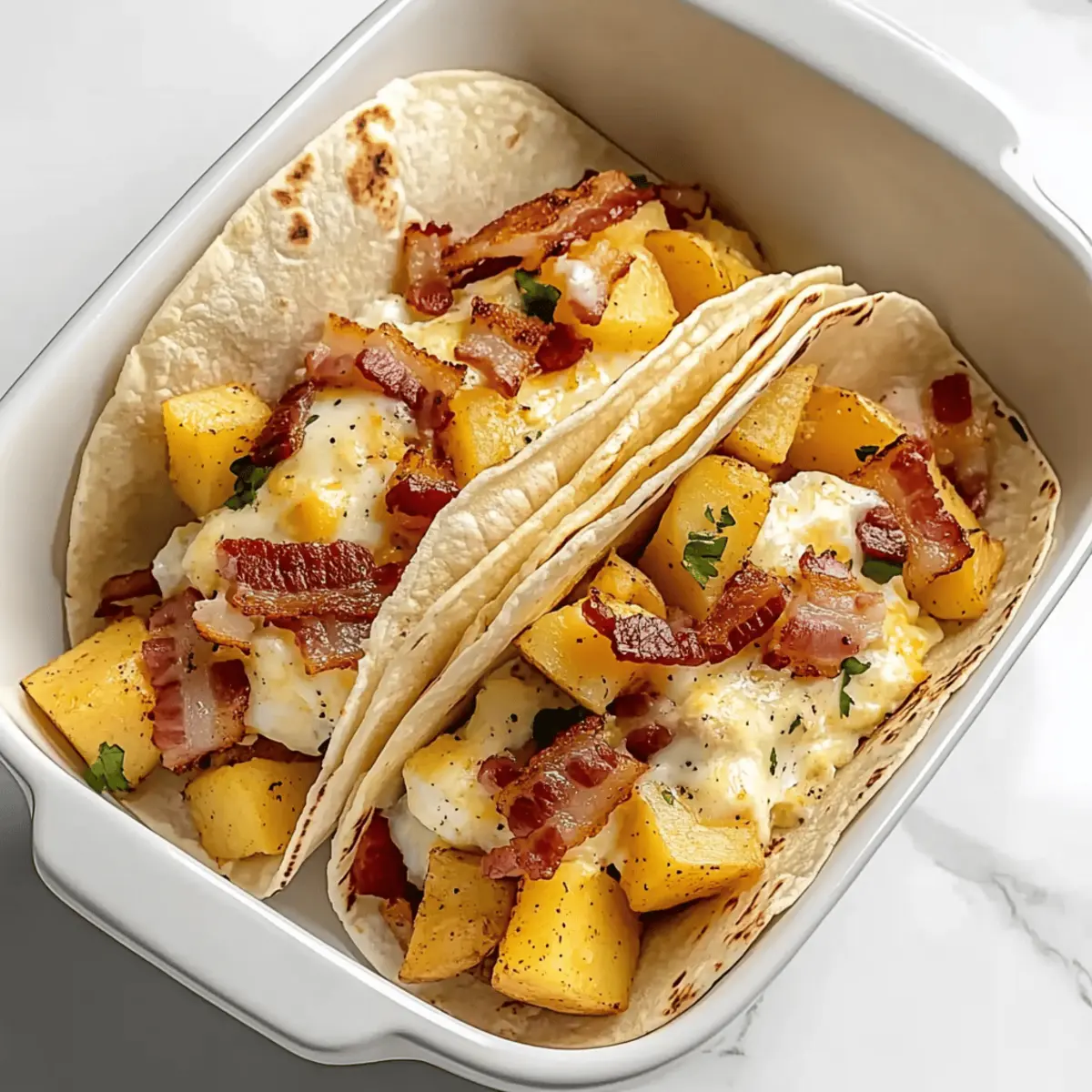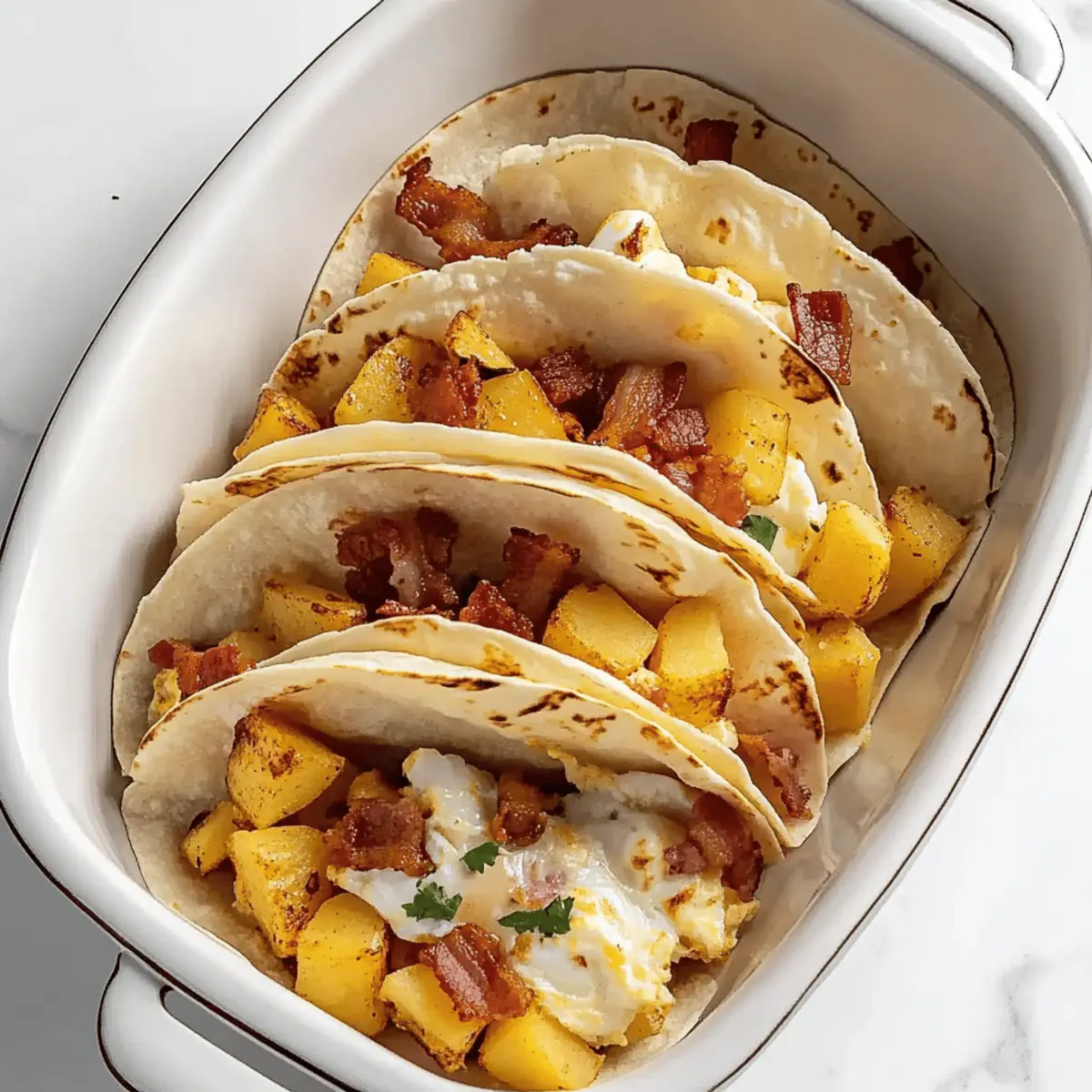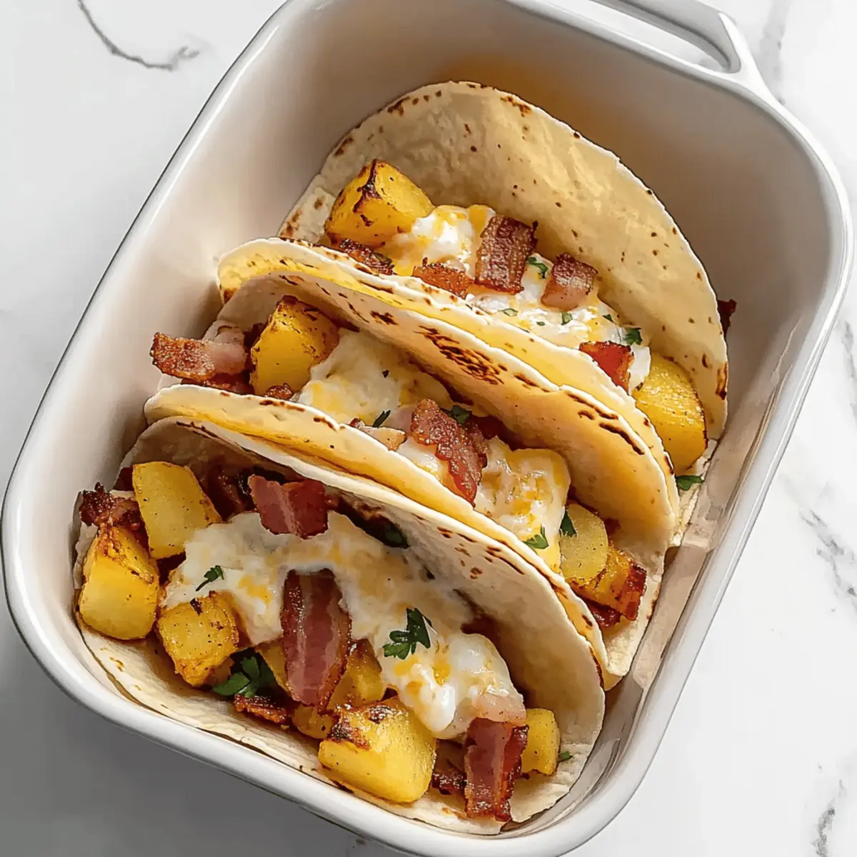 As I shuffled through my pantry one hectic morning, I stumbled upon an assortment of leftovers just begging to be transformed. That’s when the idea of Baked Breakfast Tacos popped into my mind—a quick and easy breakfast that balances convenience with heartiness. Imagine crispy potatoes and fluffy eggs tucked inside soft tortillas, creating the ultimate family-friendly meal! Not only can you whip these up ahead of time, but they also welcome any fillings you have on hand. Whether it’s the remnants of last night’s dinner or fresh veggies peeking from the fridge, these tacos are adaptable and delicious. Ready to start your day with a satisfying bite? Let’s dive into this scrumptious recipe that will revolutionize your breakfast routine! Why Make Baked Breakfast Tacos? Morning Magic: These Baked Breakfast Tacos are perfect for busy mornings, transforming your leftover ingredients into a delicious breakfast. Flavorful Comfort: The crispy potatoes and fluffy eggs create a hearty base, while optional toppings like cheese and fresh salsa elevate each bite. Customizable Fun: You can mix and match fillings to suit your taste, whether that’s savory bacon, vibrant veggies, or zesty beans. Make-Ahead Simple: Prepare them in advance, so you can easily enjoy a nutritious breakfast in no time—ideal for family gatherings or hectic weekdays. Crowd-Pleasing Delight: Perfect for brunch parties or family meals, these tacos will have everyone asking for seconds! Baked Breakfast Tacos Ingredients For the Tacos • Corn Tortillas – These soft shells are essential for a delightful wrap. Choose fresh ones for the best texture. • Yukon Gold Potatoes – Their creamy texture ensures a satisfying bite; russet potatoes can be used for extra crispiness. • Canola Oil – This oil helps fry the potatoes to golden perfection, enhancing their flavor. • Eggs – A nutritious protein source; cook them until just set to maintain a fluffy texture. For the Filling • Bacon – Adds a savory crunch; bake it to avoid excess grease while achieving the perfect crispiness. • Taco Seasoning – A must for flavoring the potatoes; feel free to use a homemade blend or leave it out for a milder taste. • Monterey Jack Cheese – Optional for an extra layer of creaminess; cheddar can be used instead if desired. These Baked Breakfast Tacos are not only quick and easy but also a fantastic way to clear out your fridge while enjoying a hearty meal! Step‑by‑Step Instructions for Baked Breakfast Tacos Step 1: Preheat the Oven Begin your baking adventure by preheating your oven to 375°F (190°C). This temperature ensures that your Baked Breakfast Tacos will cook evenly and achieve perfect crispiness. While the oven warms up, gather your ingredients, and prepare for the delicious assembly of your tacos. Step 2: Bake the Bacon Arrange slices of bacon on a foil-lined cookie sheet, ensuring they’re spaced out for even cooking. Place the sheet in the preheated oven and bake for about 10 minutes until the bacon is golden brown and crispy. Once done, remove it from the oven and let it cool before chopping into bite-sized pieces for your taco filling. Step 3: Cook the Potatoes In a large skillet, heat a couple of tablespoons of canola oil over medium-high heat. Add in cubed Yukon Gold potatoes, stirring to coat them in oil. Cook for 15-20 minutes, occasionally stirring until the potatoes soften and crisp up. They should turn golden brown, giving you that satisfying texture for your Baked Breakfast Tacos. Step 4: Season the Potatoes Once the potatoes are tender and crispy, sprinkle taco seasoning over them, ensuring even distribution. Stir gently to incorporate the seasoning fully, allowing the flavors to blend beautifully. Continue cooking for another 3-5 minutes to allow the spices to bloom, enhancing the overall taste of your taco filling. Step 5: Scramble the Eggs In a separate pan, crack open your eggs and whisk them lightly in a bowl. Over medium heat, pour the eggs into the pan, stirring continuously. Cook until the eggs are slightly wet—about 3-4 minutes—and then remove them from the heat. This technique keeps your eggs fluffy and prevents them from drying out in the oven during baking. Step 6: Prepare the Baking Dish Take a 13×9 inch baking dish and stand the corn tortillas upright, forming taco shells. Make sure they are tightly packed to hold your delicious filling. This arrangement not only supports the structure but also ensures that each taco is loaded with goodness once baked. Step 7: Assemble the Tacos Now it’s time to fill each tortilla! Start by adding approximately 1/4 cup of the crispy potato mixture into each taco shell. Next, layer on the fluffy scrambled eggs and top with the chopped bacon pieces. For an extra indulgent touch, sprinkle a generous amount of Monterey Jack cheese over the filled tortillas. Step 8: Bake the Assembled Tacos Place your assembled Baked Breakfast Tacos in the oven and bake for about 10 minutes. This step allows the cheese to melt and become gooey, gluing all the delicious fillings together. Once the cheese is bubbly and slightly golden, your tacos are ready to be savored straight from the oven! What to Serve with Baked Breakfast Tacos? Elevate your breakfast taco experience with vibrant sides and delightful accoutrements that add flavor and freshness. Fresh Fruit Salad: A colorful mix of seasonal fruits like berries and melons perfectly complements the savory tacos. Their natural sweetness balances the richness of the filling. Zesty Salsa: A fresh pico de gallo adds a refreshing burst of flavor, enhancing each bite with juicy tomatoes and crisp cilantro. The acidity cuts through the heaviness, making the meal feel lighter. Spicy Avocado Toast: Creamy avocado spread topped with a hint of lime pairs beautifully with the textures of the tacos. This dish adds a creamy element that marries well with the crunchiness. Crisp Green Salad: A salad dressed in a light vinaigret