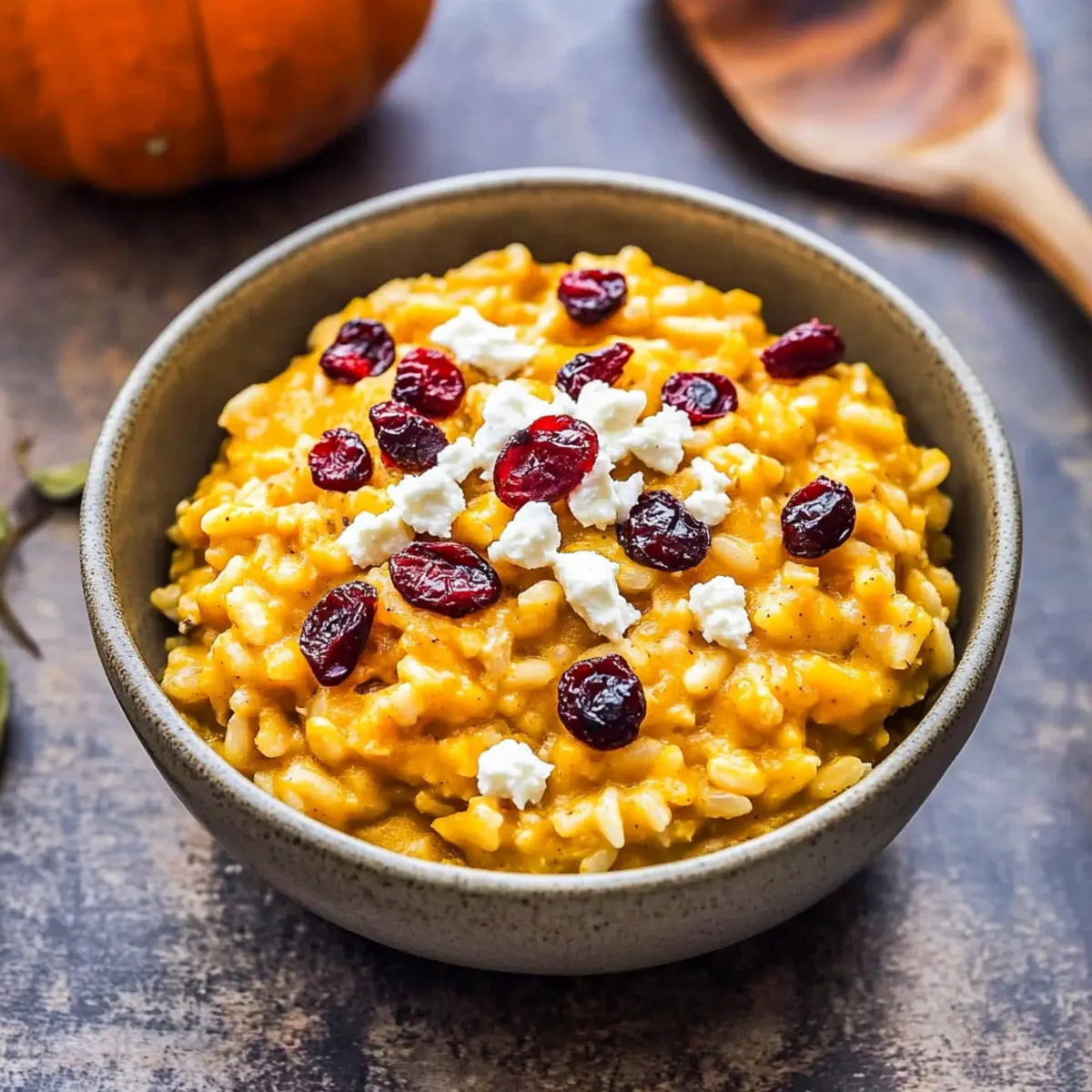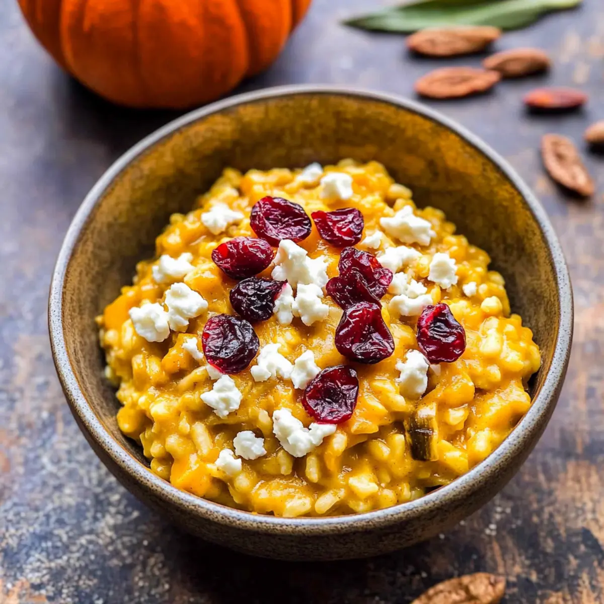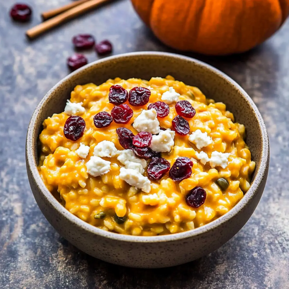 As the leaves crunch beneath my feet and the air turns crisp, there’s no better way to embrace the season than with a warm, comforting bowl of Baked Pumpkin Goat Cheese Risotto. This vegetarian side dish captures the essence of fall flavors, transforming simple ingredients into creamy, savory delight. With its oven-baked method, there’s minimal stirring involved, allowing you to enjoy the gathering instead of being tethered to the stove. Each spoonful carries the rich notes of pumpkin, complemented perfectly by the tangy goat cheese and a hint of sweetness from dried cranberries. Not only does it elevate any Thanksgiving table, but it’s also an easy and satisfying dish to whip up when friends come over. Are you ready to bring a taste of autumn into your home? Why Is This Risotto a Must-Try? Simplicity Meets Flavor: The oven-baked method means minimal hands-on time, letting you enjoy cozy moments with family and friends. Fall’s Best Ingredients: Featuring rich pumpkin and creamy goat cheese, this risotto celebrates autumn flavors that are both festive and comforting. Versatile Side Dish: Perfect alongside roasted meats or as a stand-alone vegetarian main, it fits any gathering effortlessly. Crowd-Pleasing Appeal: Its creamy texture delights all palates, making it a great addition to your Thanksgiving feast. Don’t forget to serve it with a side of Baked Salmon Lemon for a balanced meal! Easy Make-Ahead Option: Prepare it in advance and simply reheat; adding a splash of broth keeps it creamy and delicious. Baked Pumpkin Goat Cheese Risotto Ingredients For the Risotto Olive Oil – Adds richness; can be substituted with butter for a different flavor profile. Shallot (1/2 cup, finely chopped) – Provides sweetness and depth; onion can be used as a substitute. Garlic (2 cloves, grated/minced) – Enhances flavor; fresh or powdered garlic can work in a pinch. Arborio Brown Rice (1 1/2 cups) – The main body of the risotto, lending creaminess; traditional Arborio rice can be used if short grain brown rice is unavailable. Dry White Wine (1/2 cup) – Adds acidity and enhances flavor; omit if desired or replace with additional broth. Low Sodium Vegetable Broth (4 cups) – Forms the cooking liquid; chicken broth can be used for non-vegetarian versions. Pumpkin Purée (1 cup) – Provides the fall flavor and creaminess; can be substituted with butternut squash purée. Fresh Chopped Sage (1.5 teaspoons) – Offers a fragrant herb note; thyme can be substituted. Chopped Fresh Rosemary (1 teaspoon) – Adds earthiness; Italian seasoning can be used as a substitute. Ground Nutmeg (1/4 teaspoon) – Enhances warmth and flavor; can be omitted or replaced with cinnamon for a twist. Red Pepper Flakes (1/4 teaspoon) – Adds a bit of heat; optional based on preference. Kosher Salt and Fresh Ground Black Pepper – Essential for seasoning; adjust to taste. For the Topping Goat Cheese (4 ounces, reserve 1 ounce for topping) – Provides creaminess and tang; any soft cheese, like feta, can substitute. Dried Cranberries (1/3 cup) – Offers sweetness and texture contrast; consider using raisins or chopped dates. Pumpkin Seeds (2 tablespoons) – Adds crunch; sunflower seeds can work as a substitute. This Baked Pumpkin Goat Cheese Risotto is not only a delightful way to celebrate fall but also brings warmth and comfort to your dining table! Step‑by‑Step Instructions for Baked Pumpkin Goat Cheese Risotto Step 1: Preheat the Oven Begin by preheating your oven to 375°F (190°C). This ensures a perfect environment for our Baked Pumpkin Goat Cheese Risotto. While the oven warms up, gather your heavy oven-safe pot and the ingredients to move through the next steps seamlessly. Step 2: Mix the Pumpkin Broth In a large measuring cup, whisk together 1 cup of vegetable broth with 1 cup of pumpkin purée until fully blended. Set this mixture aside, as it will impart that rich, autumn flavor to your risotto. This blend will be stirred in later to create a creamy consistency. Step 3: Sauté Aromatics Place your heavy pot over medium-high heat and add a drizzle of olive oil. Once hot, add the finely chopped shallots and sauté for about 1 minute until they’re translucent. Next, stir in the minced garlic, cooking for an additional 30 seconds until fragrant. Season with a pinch of salt and pepper to enhance the flavors. Step 4: Deglaze with Wine Pour in 1/2 cup of dry white wine, scraping up any delicious brown bits that may have formed at the bottom of the pot. Allow it to cook for 1 minute, letting the alcohol evaporate and the flavors concentrate, setting a rich base for your Baked Pumpkin Goat Cheese Risotto. Step 5: Combine Liquid Ingredients Stir in the pumpkin broth mixture along with the remaining 3 cups of vegetable broth, fresh chopped sage, chopped rosemary, ground nutmeg, and red pepper flakes. Bring this mixture to a gentle boil, allowing all those wonderful, earthy flavors to meld beautifully together. Step 6: Add the Rice Once boiling, add 1 1/2 cups of Arborio brown rice into the bubbling pot. Stir it in so that every grain is coated with the flavorful liquid. Cover the pot with a tight-fitting lid, then transfer it to the preheated oven to bake for about 60-70 minutes until the rice is tender and has absorbed the liquid. Step 7: Incorporate Goat Cheese As the baking time ends, carefully remove the pot from the oven and open the lid. Stir in 4 ounces of goat cheese until it fully melts and creates a creamy texture throughout the risotto. If it appears too thick, adjust the consistency by adding a splash more broth to achieve desired creaminess. Step 8: Garnish and Serve Serve your Baked Pumpkin Goat Cheese Risotto warm, topped with the reserved goat cheese, a scatter of dried cranberries, and pumpkin seeds for added texture. Feel free to sprinkle more fresh herbs on top to elevate presentation; this comforting dish is now ready to impress your family and friends! Baked Pumpkin Goat Cheese Risot