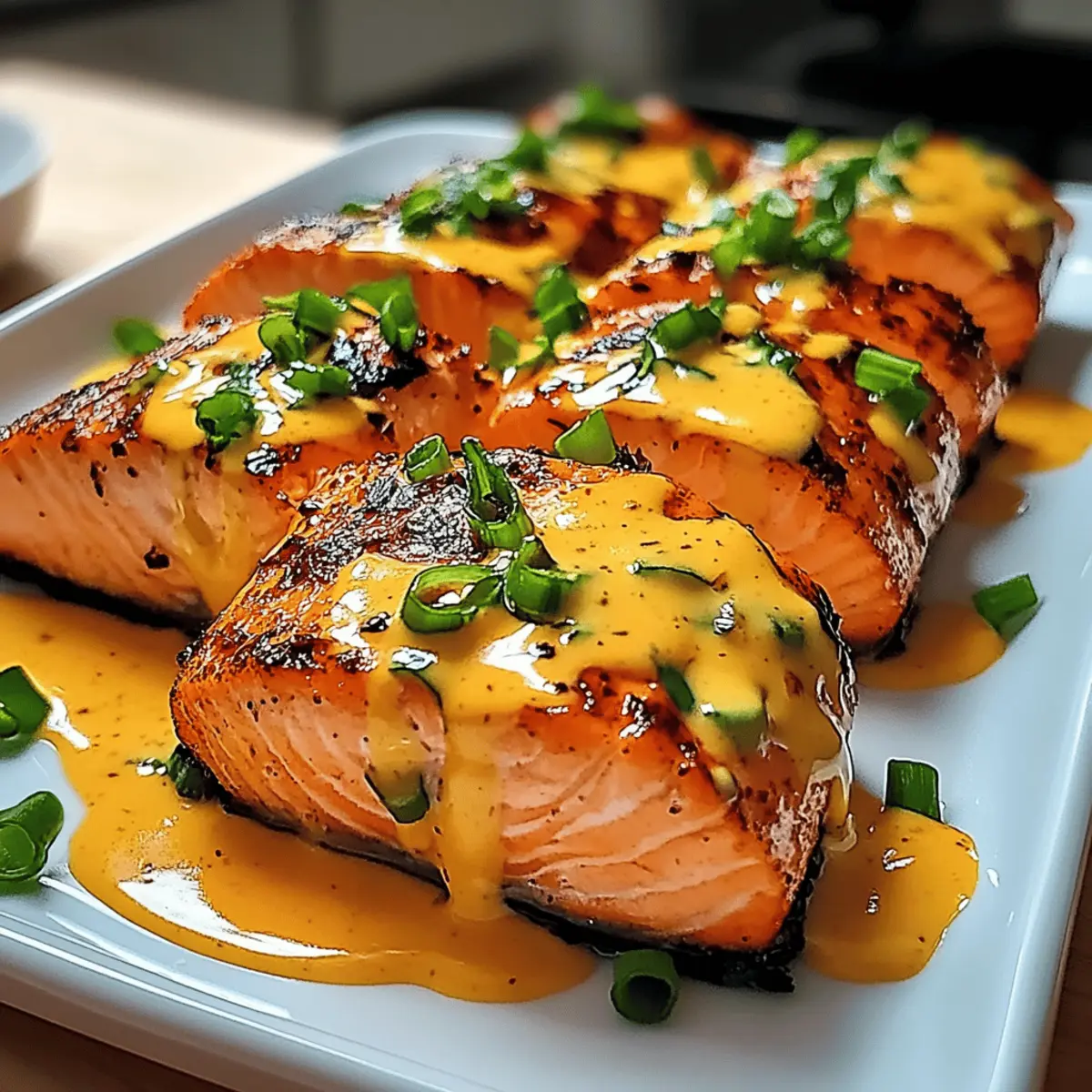 5. Transfer the cooked salmon to a plate, let it rest for 1 minute, then drizzle with Bang Bang sauce and garnish with green onions.