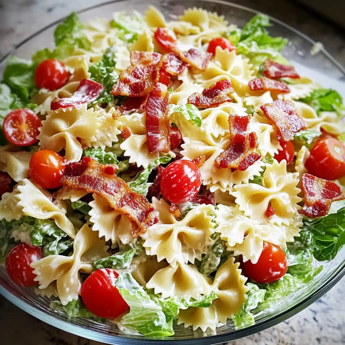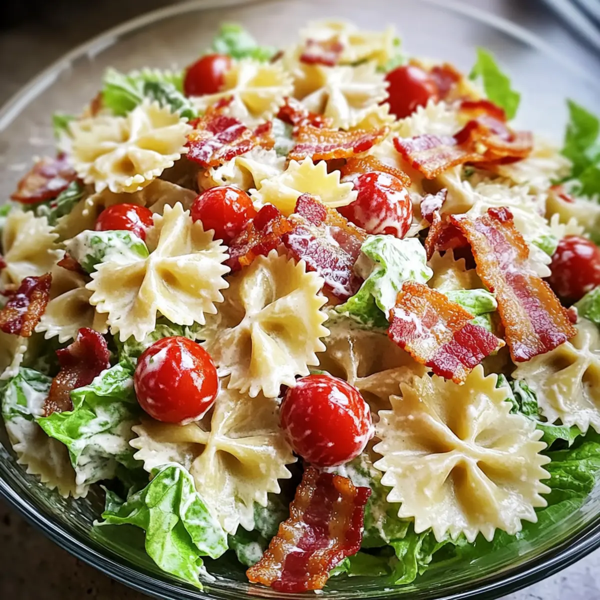 Facebook Twitter Pinterest LinkedInAs I stood in my kitchen, the sizzling sound of bacon filled the air, tempting my senses and igniting my appetite. Today, I’m excited to share my creamy BLT Pasta Salad, a delightful twist on the classic sandwich that’s perfect for any occasion. This quick and easy dish combines crispy bacon, fresh romaine lettuce, and sweet cherry tomatoes mingling with farfalle pasta, all enveloped in a dreamy Ranch dressing. What I love most about this recipe is how versatile it is. You can enjoy it as a satisfying side at summer picnics or as a main dish for a busy weeknight dinner. Plus, feel free to customize with optional additions like creamy avocado or your favorite cheese. Could a salad get any better? Let’s dive in and make it together! Why is BLT Pasta Salad a Must-Try? Creamy, Dreamy Flavor: Each bite delivers a tantalizing blend of savory bacon and zesty Ranch dressing that dances on your palate. Quick to Prepare: Made in just 35 minutes, this dish is perfect for those weeknight dinners when time is of the essence. Fresh Ingredients: Crisp romaine and vibrant cherry tomatoes add a refreshing touch, making it feel light yet satisfying. Endless Customization: Add grilled chicken, corn, or even avocado to make it your own—there’s no wrong way to enjoy this meal! Crowd-Pleasing Appeal: Serve it at your next gathering, and watch it disappear—everyone loves a creamy pasta salad that nods to a classic favorite! Pair it with a side dish like Pineapple Cucumber Salad for a complete meal that’s both delicious and easy! BLT Pasta Salad Ingredients • The perfect blend of flavors awaits! For the Pasta Farfalle Pasta – The base of the salad that gives structure; rotini or penne can be swapped if you prefer. For the Salad Bacon – Adds a rich, crunchy texture; feel free to substitute with turkey bacon for a lighter option. Romaine Lettuce – Freshness with a crisp bite; iceberg lettuce is a great alternative if needed. Cherry Tomatoes – Sweet and juicy, they enhance the flavor; any small tomato variety will do. Red Onion – Introduces a mild sharpness; consider green onions for a milder taste or skip entirely. For the Dressing Ranch Dressing – The creamy, tangy glue that binds everything; while store-bought is quick, homemade dressing truly elevates the dish. BBQ Sauce – This optional addition brings a smoky sweetness; omit it for a classic flavor or replace it with hot sauce for heat. Optional Additions Avocado – For a rich, creamy texture that pairs beautifully with the salad. Cheese – Adding cheese like feta or cheddar can intensify the creaminess, making the dish even more indulgent. Make sure to gather all these ingredients to create a creamy BLT Pasta Salad that’s sure to impress your guests! Step‑by‑Step Instructions for BLT Pasta Salad Step 1: Prepare the Dressing In a large measuring cup, whisk together ½ cup of milk, ½ cup of sour cream, and one packet of Ranch seasoning until smooth. The mixture will thicken as it cools, so refrigerate it for at least 15 minutes while you prepare the rest of the ingredients. This creamy Ranch dressing is the heart of your BLT Pasta Salad, bringing everything together deliciously. Step 2: Cook the Pasta Bring a large pot of salted water to a rolling boil and add 8 ounces of farfalle pasta. Cook according to the package instructions, typically about 10–12 minutes, until the pasta is al dente. Once cooked, drain the pasta in a colander and drizzle with a bit of olive oil to prevent sticking. Spread it out on a sheet pan to cool down for about 10 minutes. Step 3: Fry the Bacon In a large skillet, add 6 slices of bacon over low heat. Cook for about 10–12 minutes, turning occasionally, until the bacon is evenly crispy. Once done, transfer the bacon to a paper towel-lined plate to absorb excess grease. Allow it to cool slightly before chopping it into bite-sized pieces, setting aside some for garnishing your finished BLT Pasta Salad. Step 4: Combine the Pasta and Dressing In a large mixing bowl, add the cooled pasta and pour in ½ cup of the prepared Ranch dressing. Gently toss the pasta with the dressing until each piece is thoroughly coated. This creamy mixture serves as a delicious base for the remaining ingredients of your BLT Pasta Salad, ensuring every bite bursts with flavor. Step 5: Add the Vegetables and Bacon To the bowl with the pasta, add 2 cups of chopped romaine lettuce, 1 cup of halved cherry tomatoes, and ¼ cup of chopped red onion. Also, include ¾ of the chopped bacon and 2 tablespoons of BBQ sauce if using. Gently toss everything together, taking care not to crush the lettuce, ensuring a fresh, light texture throughout your BLT Pasta Salad. Step 6: Serve or Chill Transfer the BLT Pasta Salad into a serving bowl, topping it with the reserved bacon pieces for a crispy finish. You can serve it immediately for a delightful meal or cover and chill it for up to 3 hours to let the flavors meld together. Either way, this dish promises a refreshing and satisfying experience that everyone will love! Tips for the Best BLT Pasta Salad Crispy Bacon Essential: Ensure your bacon is perfectly crispy; this adds the best texture and flavor to your BLT Pasta Salad. If it’s chewy, the salad may lose its delightful crunch. Cool Pasta Thoroughly: Allow the pasta to cool completely before mixing. This prevents wilting the greens and maintains the freshness of the salad. Reserve Dressing: Save a portion of the Ranch dressing to serve on the side. This way, diners who enjoy extra dressing can customize their servings as they like. Add Ingredients Last: If preparing ahead, mix the lettuce and tomatoes only just before serving. This keeps your salad vibrant and prevents sogginess. Taste Before Serving: Always give your BLT Pasta Salad a taste test before serving! Adjust seasoning or add a splash more Ranch dressing if needed for optimal flavor. Make Ahead Options Preparing this delightful BLT Pas