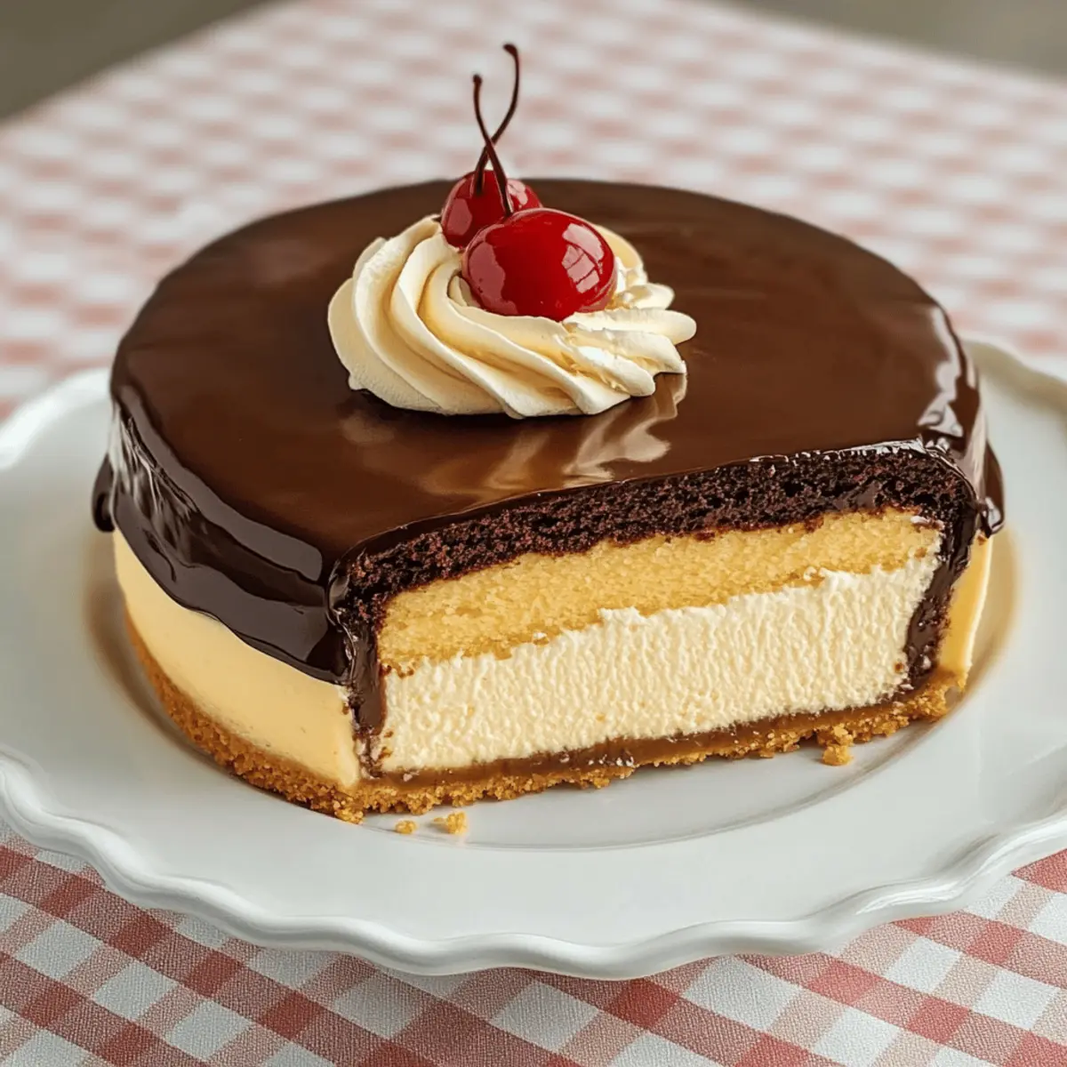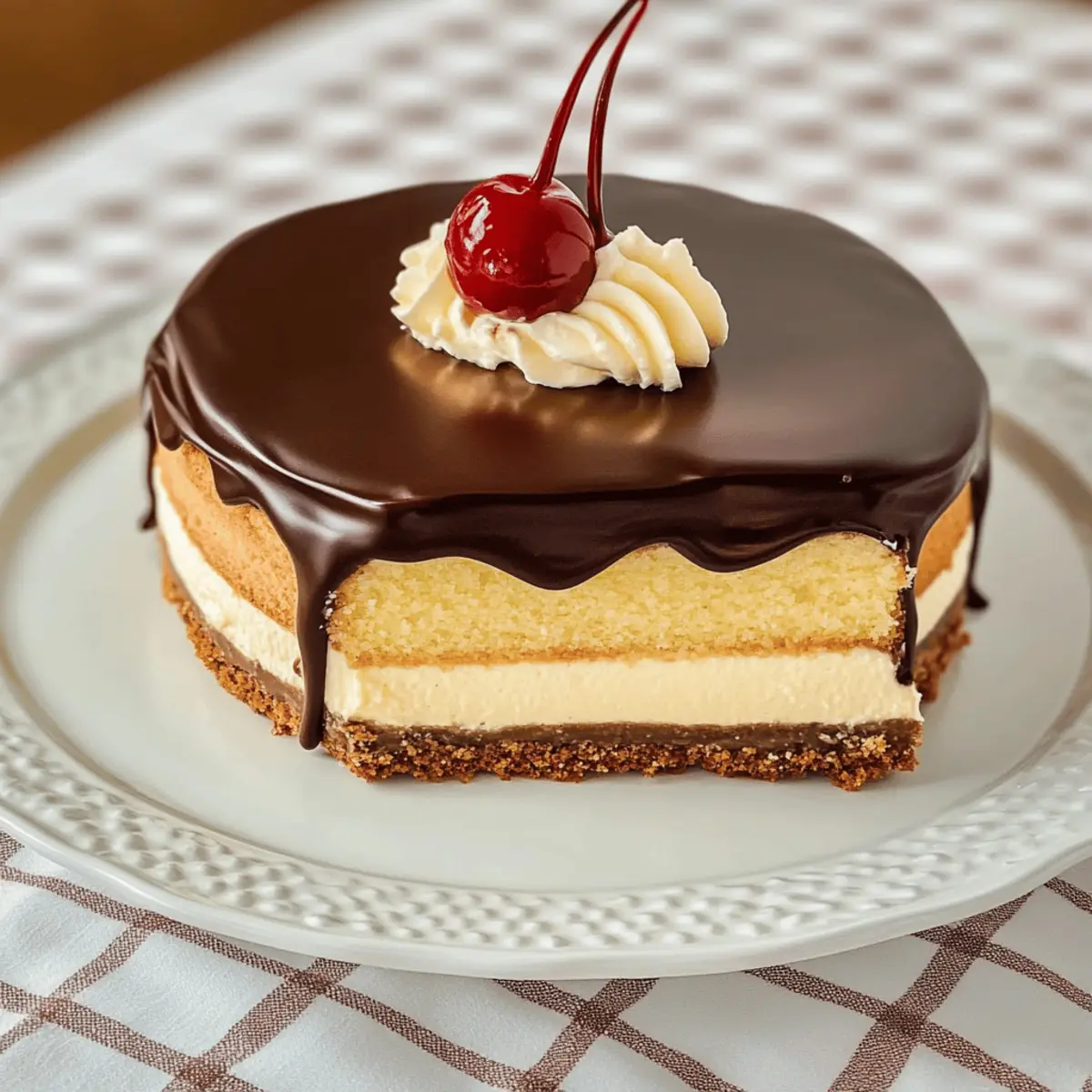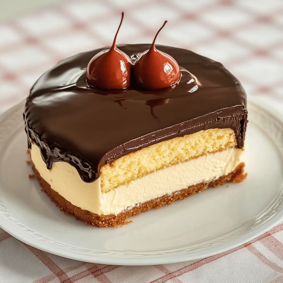 Indulge in Boston Cream Pie, a nostalgic dessert with rich layers of cake, buttery custard, and luxurious ganache.