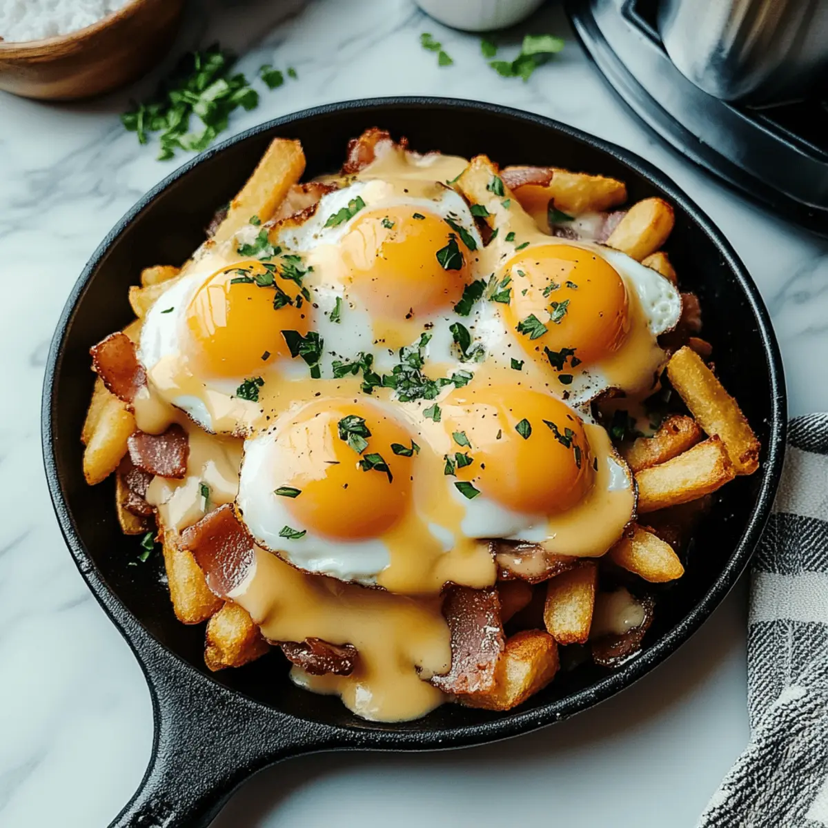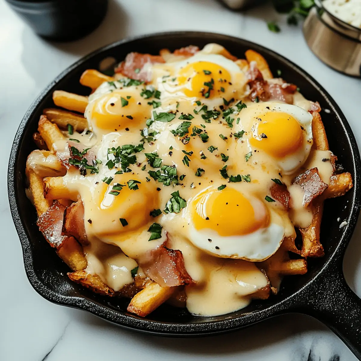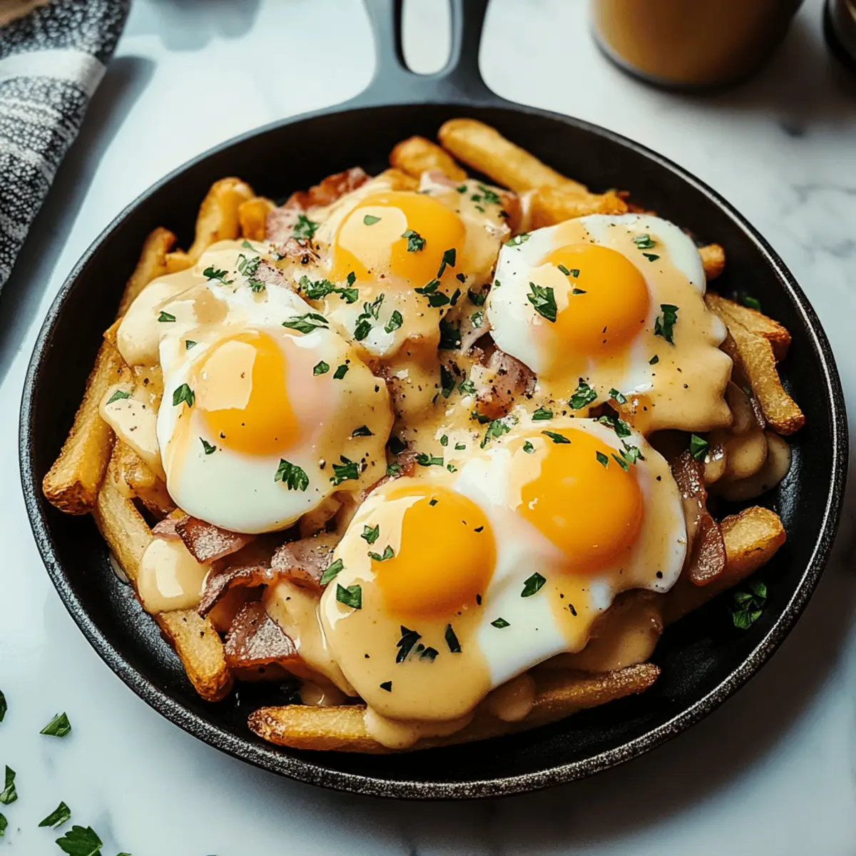 As I took my first bite, the creamy hollandaise sauce cascaded over the crispy hash browns, making me realize I had just discovered breakfast nirvana. This Breakfast Poutine with Hollandaise Sauce transforms the traditional Canadian favorite into a comforting morning meal that will make your taste buds dance. Not only is it a delightful combination of creamy, cheesy goodness—perfect for satisfying those indulgent cravings—but it also comes together quickly, making it a fantastic choice for busy mornings or leisurely brunches alike. Whether you’re looking to impress weekend guests or simply want to treat yourself, this dish is sure to elevate your breakfast game. Ready to stir up some culinary magic? Let’s dive into how to whip up this comfort food masterpiece! Why is Breakfast Poutine a Must-Try? Indulgent Comfort Food: This dish is a game-changer, combining crispy hash browns and creamy hollandaise for a breakfast-packed punch. Quick and Easy: With just a few ingredients and straightforward steps, you can whip up this mouthwatering meal in no time. Crowd-Pleasing: Perfect for brunch with friends or a cozy family breakfast, it’s sure to impress anyone who loves homemade comfort. Versatile Ingredients: Feel free to mix up toppings—add sautéed mushrooms or fresh herbs to customize your poutine. Decadent and Satisfying: The combination of rich textures and flavors guarantees a delightful start to your day that beats any fast-food option. Don’t forget to check out my other delicious recipes like Hawaiian Roll Breakfast or Egg Cheese Breakfast for more breakfast inspiration! Breakfast Poutine Ingredients • Dive into the flavorful world of breakfast poutine with these essential ingredients. For the Hash Browns Frozen Hash Browns – The crispy base that gives the dish its signature crunch. Substitution: Fresh potatoes can be diced and prepared as hash browns. For the Eggs Large Eggs – Key for rich, delicious poached eggs. Substitution: Use egg whites for a lighter option. For the Hollandaise Sauce Unsalted Butter – Provides the necessary richness for a creamy hollandaise. Egg Yolks – The foundation of hollandaise; don’t swap with whole eggs for best results. Dijon Mustard – Adds a subtle kick and depth to the sauce. White Wine Vinegar – Aids in poaching eggs and balances hollandaise acidity. Lemon Juice – Brightens the hollandaise flavor. Cayenne Pepper & Garlic Powder – Delivers a hint of heat and flavor to the sauce. For the Toppings Bacon – Crispy, savory bites add irresistible flavor. Substitution: Swap for turkey bacon or crispy tempeh for a vegetarian option. Cheddar Cheese (shredded) – Offers creamy, tangy notes. Substitution: Try Monterey Jack or Gouda for a different twist. Mozzarella Cheese (shredded) – Melts beautifully, enhancing the gooey texture. Note: A blend of Italian cheeses works well here too. Prepared Gravy – Makes the dish a true poutine classic. Substitution: Creamy béchamel or mushroom sauce can also be delicious. Seasoning Salt – Essential for amplifying flavors; adjust to your taste. Black Pepper – Adds a necessary subtle heat; freshly cracked is best. Now that you have everything you need for this Breakfast Poutine with Hollandaise Sauce, it’s time to get cooking! Enjoy the delightful blend of flavors and textures that will warm your heart and satisfy your cravings. Step‑by‑Step Instructions for Breakfast Poutine with Hollandaise Sauce Step 1: Prepare the Hash Browns Preheat your oven to 400°F (200°C). Spread the frozen hash browns evenly across a baking sheet, ensuring they are not overcrowded. Bake for 20 minutes, flipping them halfway through, until they are golden brown and crispy. This crispy foundation is essential for the delicious breakfast poutine! Step 2: Cook the Bacon While the hash browns bake, heat a skillet over medium heat and add a drizzle of olive oil. Cook the bacon for about 6-8 minutes, flipping as necessary until it’s crispy and browned. Transfer the bacon to a paper towel-lined plate to drain excess grease, then crumble it into bite-sized pieces for topping your breakfast poutine. Step 3: Scramble the Eggs Using the same skillet, reduce the heat to low and melt a tablespoon of butter. Crack in the large eggs and scramble them to your desired doneness, stirring gently for about 3-5 minutes. The creamy, fluffy eggs will perfectly complement the crispy hash browns, taking your Breakfast Poutine to the next level! Step 4: Whisk the Hollandaise Sauce Set up a double boiler by simmering water in a pot and placing a heatproof bowl on top. Add egg yolks, Dijon mustard, and white wine vinegar into the bowl. Whisk constantly for about 2-3 minutes until the mixture thickens and doubles in volume. Gradually drizzle in the melted unsalted butter, continuing to whisk until your hollandaise sauce reaches a silky, creamy consistency. Step 5: Season the Hollandaise Once the hollandaise sauce is thickened, bring in the final flavors by adding a splash of lemon juice, cayenne pepper, and garlic powder. Stir to combine and taste; adjust seasoning if necessary. This velvety hollandaise will be the luscious crown on your breakfast poutine! Step 6: Assemble the Breakfast Poutine To assemble your breakfast poutine, start with a generous layer of crispy hash browns on a plate. Top the hash browns with scrambled eggs and sprinkle shredded cheddar and mozzarella cheese over the top. Pour warm gravy generously on the dish, then drizzle the decadent hollandaise sauce over everything, finishing with the crumbled bacon as a savory accent. Step 7: Serve Immediately Serve your warm, indulgent Breakfast Poutine with Hollandaise Sauce right away for the best experience. Enjoy the delightful blend of textures and flavors that create a comforting start to your day. This dish is perfect for impressing guests or treating yourself on a leisurely morning! Breakfast Poutine with Hollandaise Sauce Variations Feel free to get creati
