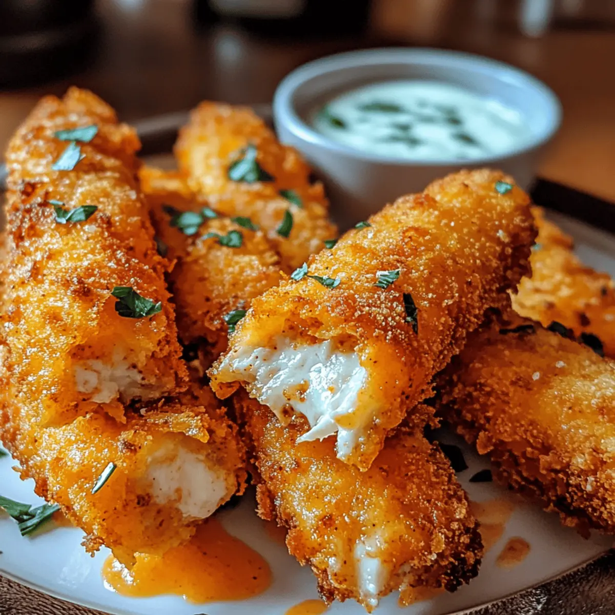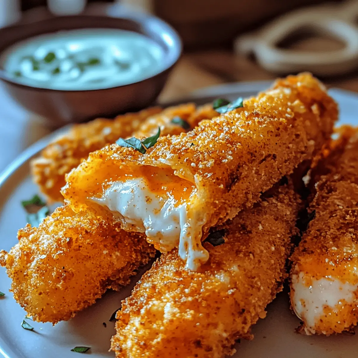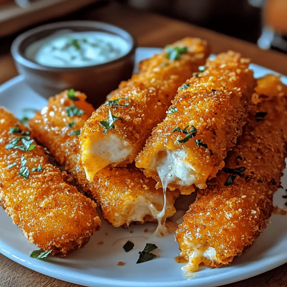 As the clock ticks down to game day, the familiar chatter of friends and family fills the air—the perfect backdrop for a delicious spread. Amidst the usual array of snacks, it’s the Buffalo Chicken Mozzarella Sticks that always steal the spotlight. Offering the ideal balance of crispy exterior and gooey mozzarella, these irresistible treats bring a hearty punch of flavor while letting you control the spice level to suit your crowd. Not only are they a fun and satisfying party appetizer, but they also provide a healthier, homemade alternative to store-bought options. Ready to kick off your next gathering with these spicy delights? Let’s dive into this crispy crowd-pleaser that promises to up your snack game! Why Are Buffalo Chicken Mozzarella Sticks Amazing? Irresistible Flavor: Drenched in spicy buffalo sauce and gooey mozzarella, these sticks are a flavor explosion that no one can resist! Homemade Goodness: Skip the store-bought versions and create your own delicious snacks, ensuring you know exactly what goes into each bite. Quick & Easy: The recipe is straightforward, requiring minimal prep time and cooking skills, making it perfect for even the busiest home cooks. Versatile Pairing Options: Pair these sticks with your favorite dips, like blue cheese or ranch, to enhance the taste experience and cater to all preferences. Crowd Favorite: Perfect for game day or gatherings, they are guaranteed to impress your friends and family, turning any snack spread into a standout platter! So, if you love fun and scrumptious appetizers, these Buffalo Chicken Mozzarella Sticks are just what you need! Buffalo Chicken Mozzarella Sticks Ingredients For the Chicken Mixture • Shredded Chicken – Use store-bought rotisserie chicken for a convenient option, or cook and shred fresh chicken for a homemade touch. • Buffalo Sauce – Adjust to your preferred spice level; brands like Frank’s RedHot are a classic choice for that signature kick. • Mozzarella Cheese – Fresh or low-moisture works best for that gooey stretch; consider cheddar or pepper jack for a fun twist. For the Breading • All-Purpose Flour – This forms the first layer of breading, ensuring the egg adheres smoothly to the sticks. • Eggs – Essential for binding the breadcrumbs to the sticks, contributing to a beautifully golden crust. • Panko Breadcrumbs – Preferred for achieving a light, crispy coat; spice them up with seasonings for extra flavor. For Frying and Serving • Cooking Oil – Use oils with a high smoke point like canola for frying, ensuring perfectly cooked sticks. • Dipping Sauces – Serve with blue cheese or ranch to elevate your Buffalo Chicken Mozzarella Sticks experience! These ingredients come together for a delightful treat, combining spice and gooeyness in every bite of your homemade Buffalo Chicken Mozzarella Sticks! Step‑by‑Step Instructions for Buffalo Chicken Mozzarella Sticks Step 1: Prepare Chicken Mixture In a mixing bowl, combine the shredded chicken with buffalo sauce and grated mozzarella cheese, stirring well until evenly coated. Adjust the amount of buffalo sauce to achieve the desired spice level. This vibrant blend showcases the flavors of your Buffalo Chicken Mozzarella Sticks, making them an irresistible treat. Step 2: Form Sticks Scoop out portions of the chicken mixture and shape them into sticks, about 3 inches long. Line a baking sheet with parchment paper and place the formed sticks on it. Freeze them for at least 30 minutes to firm up, ensuring they hold their shape during frying, which is crucial for the perfect bite. Step 3: Set Up Breading Station Prepare your breading station by setting out three shallow bowls. Fill the first with all-purpose flour, the second with beaten eggs, and the third with seasoned panko breadcrumbs. Organizing these ingredients in this manner will streamline the breading process, making it easier to coat your sticks for that delightful crispy texture. Step 4: Bread the Sticks Remove the frozen sticks from the freezer. Coat each stick in flour, ensuring it’s fully covered, then dip it into the egg, allowing excess to drip off. Finally, roll the stick in the panko breadcrumbs, pressing down gently to secure the coating. This layering is key for achieving that crunchy exterior on your Buffalo Chicken Mozzarella Sticks. Step 5: Heat Oil In a large frying pan, pour in enough cooking oil to cover the bottom and heat it over medium heat. To check if the oil is ready, drop in a few breadcrumbs; they should sizzle and turn golden. Maintaining the right temperature is essential for frying, as it will prevent the sticks from becoming greasy. Step 6: Fry Sticks Carefully add breaded sticks to the hot oil in batches, making sure not to overcrowd the pan. Fry them for 2-4 minutes, turning occasionally until they are golden brown and crispy on all sides. Keep an eye on their color as this will indicate when they’re perfectly cooked and ready to be removed. Step 7: Drain and Serve Once the Buffalo Chicken Mozzarella Sticks are fried to perfection, use a slotted spoon to transfer them onto a plate lined with paper towels. This will absorb any excess oil, keeping them crispy. Serve these delicious treats hot with your favorite dipping sauces like blue cheese or ranch for an extra flavorful experience. Expert Tips for Buffalo Chicken Mozzarella Sticks Shred Finely: Ensure chicken is finely shredded for even distribution of flavors; larger pieces can lead to uneven cooking and texture. Temperature Matters: Maintain oil temperature while frying to avoid greasy sticks. A thermometer can help ensure perfect frying conditions. Freeze for Firmness: Don’t skip the freezing step! It helps the sticks hold their shape while frying, resulting in a more appealing final product. Season Your Breadcrumbs: Enhance the flavor by seasoning your panko breadcrumbs with spices like garlic powder or paprika to add depth to your Buffalo Chicken Mozzarella Sticks. Don’t Ove