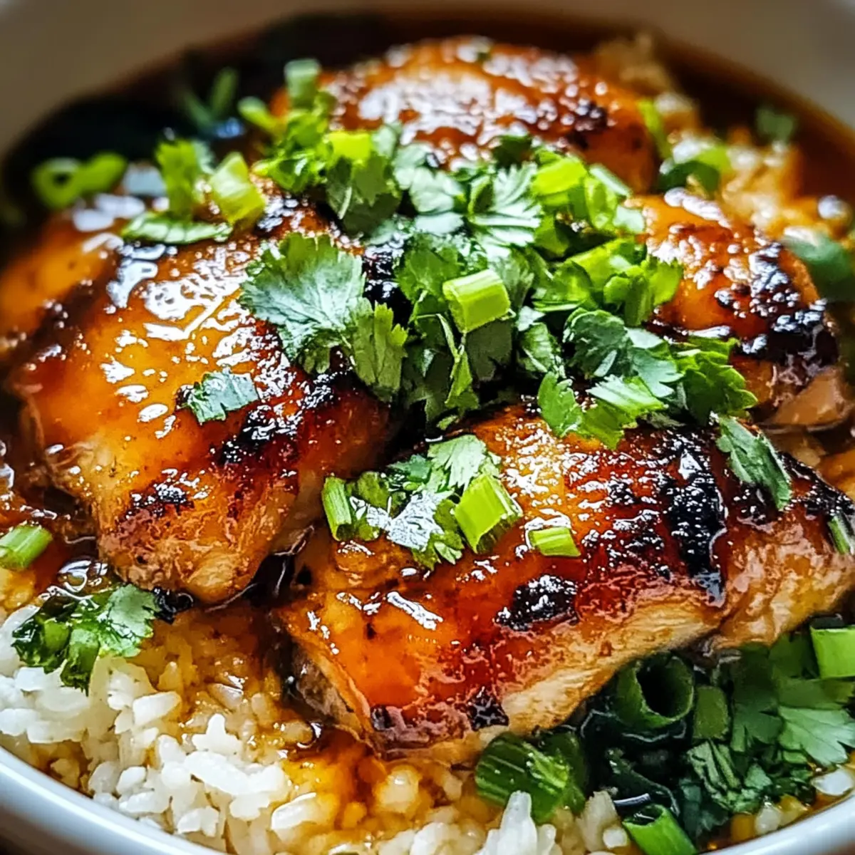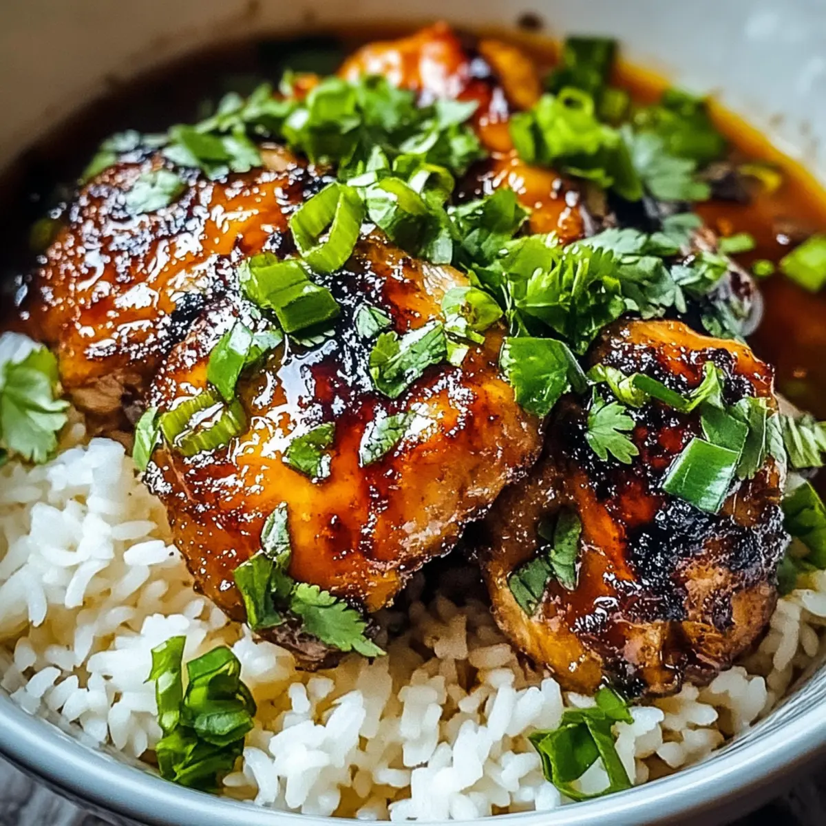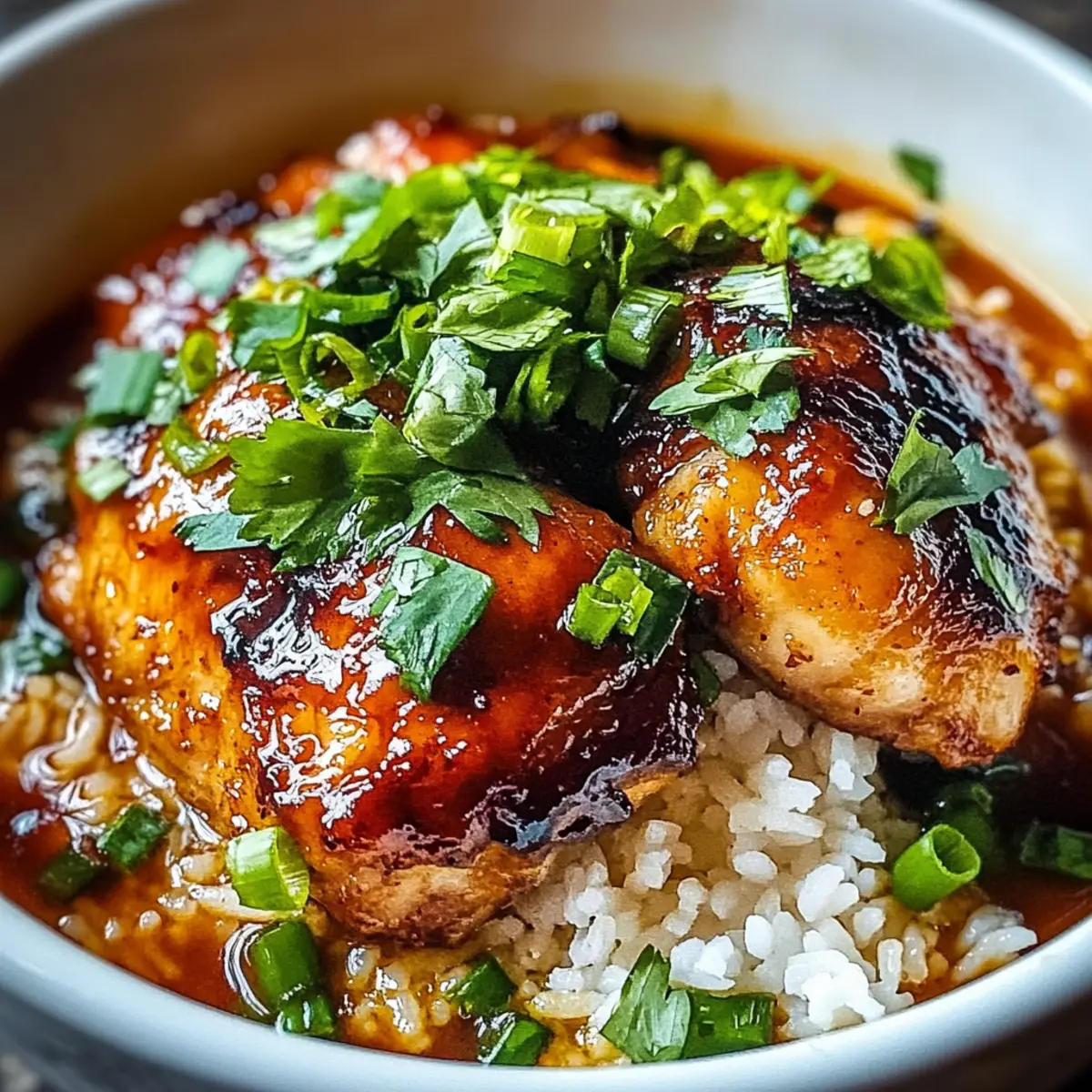 Facebook Twitter Pinterest LinkedInAs I stirred the pot, the fragrant aroma of garlic and ginger filled my kitchen, conjuring memories of cozy dinners with loved ones. This Caramelised Soy Chicken in Garlic Ginger Broth with Rice is an absolute must-try, bringing rich, comforting flavors to the table with surprisingly easy preparation. Tender chicken thighs simmer in a savory broth, nourishing both body and soul, while fluffy jasmine rice absorbs all the delightful goodness. It’s a meal perfect for chilly evenings, ready in no time, and guaranteed to be a crowd-pleaser. So, are you ready to turn your kitchen into a haven of warmth and deliciousness? Let’s dive into this recipe! Why is This Chicken Recipe a Must-Try? Ideal for busy cooks: This dish requires minimal prep time, making it perfect for those weeknight dinners when you want comfort without the hassle. Savory and satisfying: The combination of soy sauce, garlic, and ginger creates a broth that warms the soul. Each bite provides a crescendo of flavor! Versatile and customizable: Feel free to add your choice of veggies; bok choy complements the dish beautifully, or swap chicken thighs for a leaner protein option. Crowd-pleasing appeal: Whether it’s a family gathering or a casual dinner, this meal is sure to impress. If you love flavorful chicken dishes, don’t miss out on our Garlic Roasted Chicken. Easy on the wallet: Simple ingredients come together to deliver an upscale taste without breaking the bank. Caramelised Soy Chicken Ingredients For the Chicken Chicken Thighs – Tender and juicy, these are the stars of the dish; bone-in chicken legs can also be used for added flavor. Soy Sauce – This key ingredient brings depth and saltiness; for a gluten-free version, swap with tamari. Brown Sugar – Balances the saltiness of the soy sauce; feel free to substitute with honey or maple syrup, although flavors may vary. For the Broth Garlic – Fresh garlic elevates the broth’s aroma; garlic powder can be used if fresh isn’t available. Ginger – Adds a warm, spicy kick; fresh ginger is best, but ground ginger can work as a quick alternative. Chicken Broth – The soul of the dish, providing richness; low-sodium varieties can help keep it healthier. Alternatively, vegetable broth can be used. Vegetable Oil – Essential for cooking the chicken to achieve that golden crisp; neutral oils like olive oil will also do the trick. For the Rice Jasmine Rice – Fluffy and fragrant, this rice complements the dish perfectly; long-grain rice can be substituted, keeping in mind that cooking times may vary. Optional Thicker Broth Cornstarch – Use to thicken your broth; be sure to mix it with water beforehand to prevent lumps. Indulge in this Caramelised Soy Chicken in Garlic Ginger Broth with Rice and savor the warm, comforting experience it creates! Step‑by‑Step Instructions for Caramelised Soy Chicken in Garlic Ginger Broth with Rice Step 1: Prepare the Chicken Pat the chicken thighs dry with paper towels and generously season both sides with salt and pepper. This essential step enhances the flavor and ensures a beautiful sear. Set the seasoned chicken aside while you gather and prepare the rest of the ingredients to keep your cooking process smooth and efficient. Step 2: Heat the Oil In a large pot, heat about 2 tablespoons of vegetable oil over medium-high heat. Once the oil shimmers, indicating it’s hot enough, carefully add the chicken thighs skin-side down. Allow them to sear undisturbed for 5-7 minutes, or until the skin turns golden brown and crispy, locking in the juiciness of the chicken. Step 3: Flip the Chicken Once the chicken is beautifully browned, gently flip each thigh over using tongs. Immediately pour in ¼ cup of soy sauce, followed by 2 tablespoons of brown sugar, 4 minced garlic cloves, and a tablespoon of freshly grated ginger. Stir the mixture to ensure the chicken is well coated with the savory sauce, allowing the sweet and umami flavors to meld together. Step 4: Add the Broth Pour in 2 cups of chicken broth, ensuring the chicken is mostly submerged to absorb all those delicious flavors. Increase the heat to bring the mixture to a gentle boil. Once bubbling, reduce the heat to low, cover the pot, and let it simmer for about 20 minutes. This slow cooking will make the chicken tender and infused with the aromatic broth. Step 5: Cook the Rice While the chicken simmers, rinse 2 cups of jasmine rice under cold water until the water runs clear, which helps to remove excess starch. In a separate pot, combine the rinsed rice with 4 cups of water, bringing it to a boil. Once boiling, cover with a lid, reduce the heat to low, and let the rice cook for 15-20 minutes or until fluffy and all the water is absorbed. Step 6: Thicken the Broth (Optional) If you prefer a thicker broth, mix 1 tablespoon of cornstarch with 2 tablespoons of cold water to create a slurry. After 20 minutes of simmering the chicken, stir the slurry into the broth and cook for an additional 2-3 minutes until the broth reaches your desired consistency, adding a rich texture to your Caramelised Soy Chicken in Garlic Ginger Broth. Step 7: Serve the Dish Once the chicken is tender, carefully slice it into bite-sized pieces or serve it whole for a hearty presentation. Fluff the jasmine rice and serve it in bowls, topping each portion with the sliced chicken and ladling over the fragrant garlic ginger broth. This comforting meal is perfect for satisfying your hunger and warming your soul. Step 8: Garnish and Enjoy Finish off your Caramelised Soy Chicken with a sprinkle of chopped green onions and fresh cilantro on top for a burst of color and additional flavor. This delightful dish is now ready to be enjoyed, offering a satisfying blend of textures and savory broth, perfect for any occasion. Caramelised Soy Chicken Variations & Substitutions Explore these delightful twists to personalize your Caramelised Soy Chicken and bring new flavors to your tab