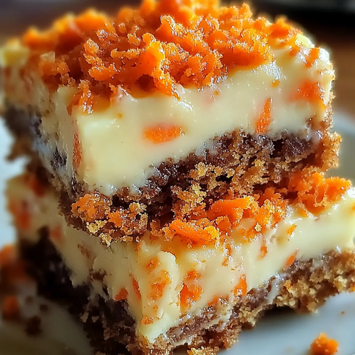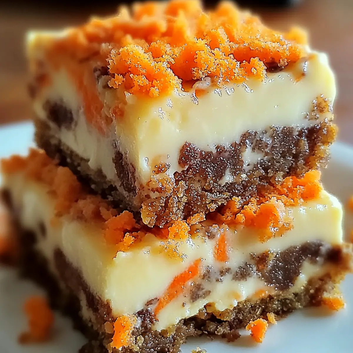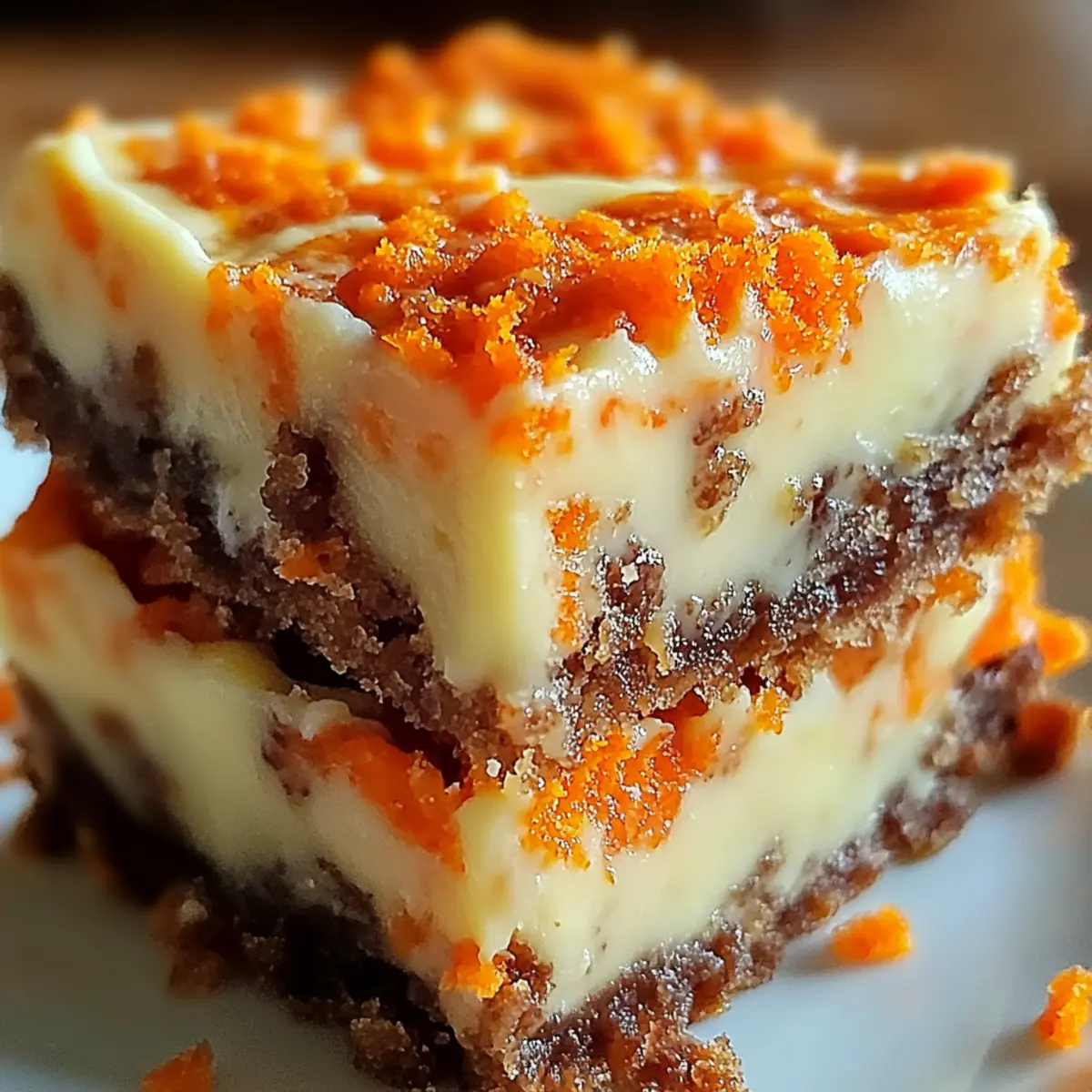 Facebook Twitter Pinterest LinkedInAs the aroma of cinnamon wafts through my kitchen, I can’t help but feel a wave of nostalgia wash over me. These Carrot Cake Cream Cheese Bars are a delightful and healthier twist on a classic dessert, combining warm spices with the natural sweetness of fresh carrots. In just 15 minutes, you can whip up these easy-to-make bars that are perfect for sharing at gatherings or enjoying by yourself with a cozy cup of tea. The luscious cream cheese swirl not only adds a rich layer of flavor but also makes these bars incredibly satisfying without the guilt. Imagine impressing your friends and family with this crowd-pleaser that cleverly incorporates vegetables into dessert! Ready to bake something memorable that’s sure to become a new favorite? Why Are These Bars So Irresistible? Moisture from freshly grated carrots ensures every bite feels tender and luscious, setting these bars apart. Creamy richness from the cream cheese swirl creates a velvety contrast that complements the warmth of spices beautifully. Quick to make, you can whip them up in just 15 minutes, making them an ideal choice for effortless entertaining. Healthier indulgence means you don’t have to feel guilty about enjoying dessert—after all, they cleverly sneak in veggies! Perfect for sharing, these Carrot Cake Cream Cheese Bars are sure to impress guests, just like my delightful Biscoff Cheesecake Bake or No-Bake Oreo Cheesecake for those sweet cravings. Carrot Cake Cream Cheese Bars Ingredients For the Bars Light Brown Sugar – adds deep, caramel-like sweetness to the carrot cake bars. Kosher Salt – enhances and balances all the flavors beautifully. Vanilla Extract – brings warmth and depth to the overall profile. All-Purpose Flour – provides essential structure to the bars. Ground Cinnamon – infuses a cozy, warming spice that complements the carrots. Ground Nutmeg – contributes a hint of earthiness and complexity. Baking Powder – ensures a light and airy texture for perfect bars. Large Egg – binds all ingredients together, adding richness. Unsalted Butter – creates a tender crumb, making the bars moist. Freshly Grated Carrots – adds moisture and nutrition; avoid pre-shredded for best texture. For the Cream Cheese Swirl Cream Cheese (softened) – provides a creamy, tangy swirl that elevates the bars. Large Egg Yolk – adds richness and helps set the cream cheese mixture. Granulated Sugar – sweetens the cream cheese swirl for that indulgent touch. These Carrot Cake Cream Cheese Bars are not just delectable; they are a wonderful example of how you can make desserts that are both satisfying and a tad healthier. Enjoy the warmth they bring to your table! Step‑by‑Step Instructions for Carrot Cake Cream Cheese Bars Step 1: Preheat and Prepare Preheat your oven to 350°F (175°C) and grab an 8×8-inch baking pan. Line the pan with non-stick aluminum foil, ensuring to leave an overhang for easy removal later. Spray the foil with cooking spray to prevent sticking. This step is crucial for achieving those perfect, moist Carrot Cake Cream Cheese Bars without any hassle. Step 2: Melt the Butter In a microwave-safe bowl, melt ½ cup of unsalted butter until completely liquefied, which takes about 30-40 seconds in the microwave. Allow the butter to cool slightly to avoid cooking the egg in the next step. This melted butter will help create a tender crumb in your delicious carrot cake base. Step 3: Mix the Wet Ingredients Whisk the melted butter together with one large egg, 1 cup of light brown sugar, ¼ teaspoon of kosher salt, and 1 teaspoon of vanilla extract in a mixing bowl. Mix until everything is well combined—around 1-2 minutes. This mixture will be the flavorful foundation for your Carrot Cake Cream Cheese Bars, bringing sweetness and warmth. Step 4: Combine the Dry Ingredients Sift in 1 cup of all-purpose flour, 1 teaspoon of baking powder, 1 teaspoon of ground cinnamon, and ½ teaspoon of ground nutmeg into the butter mixture. Gently stir with a spatula until just combined; be careful not to overmix. This step ensures a light and fluffy texture for the bars, providing delightful moisture from the carrots. Step 5: Fold in the Carrots Add 1 ½ cups of freshly grated carrots into the batter, folding them in gently until evenly incorporated. The carrots not only add moisture but also contribute to the sweet, earthy flavor profile of these Carrot Cake Cream Cheese Bars. You’re now ready to bring the creaminess to the next step! Step 6: Make the Cream Cheese Swirl In a separate bowl, beat together 8 ounces of softened cream cheese, one large egg yolk, and ¼ cup of granulated sugar until the mixture is smooth and creamy—about 2-3 minutes. This cream cheese swirl will add a luscious, tangy contrast that perfectly complements the sweet carrot base in your bars. Step 7: Layer the Batter and Swirl Pour the carrot cake batter evenly into the prepared baking pan, smoothing it out with a spatula. Then, spoon dollops of the cream cheese mixture on top and use a knife to swirl gently through the batter. This creates a beautiful marbled effect, giving your Carrot Cake Cream Cheese Bars that irresistible visual appeal. Step 8: Bake and Check for Doneness Place the pan in the preheated oven and bake for 25-30 minutes. To check for doneness, insert a toothpick into the center; it should come out clean or with a few moist crumbs, not wet batter. The bars will be lightly golden around the edges, indicating that they are ready to be taken out. Step 9: Cool and Slice Once baked, remove the pan from the oven and let the bars cool at room temperature for at least 2 hours. This cooling time is essential for the bars to set properly, making them easier to slice. After cooling, lift the foil out of the pan and cut into squares for delightful serving. Expert Tips for Carrot Cake Cream Cheese Bars Fresh Carrots: Use freshly grated carrots for the best texture and moisture; pre-shredded c