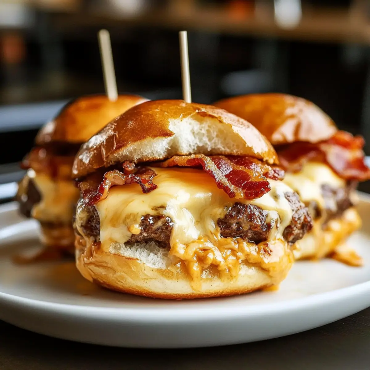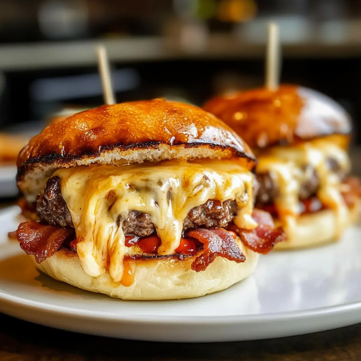 A sizzling sound fills the kitchen as crispy bacon meets juicy ground beef, and my mouth waters in anticipation. Today, I’m sharing my favorite appetizer: Cheesy Bacon Burger Bombs. Perfect for game days or spontaneous get-togethers, these savory delights whip up in just 45 minutes and offer a satisfying crunch with each bite. With the weighty goodness of melted cheddar cheese tucked inside a flavorful beef and bacon embrace, it’s hard not to indulge in these little bundles of joy. Furthermore, they’re incredibly versatile—whether served alongside your favorite dipping sauces or as a fun party centerpiece, they’ll surely win over any crowd. Ready to elevate your snacking game? Let’s dive into this irresistible recipe! Why are Cheeseburger Bacon Bombs so irresistible? Sizzling, Flavorful Combo: The marriage of crispy bacon and juicy ground beef is simply unmatched. Melted Cheese Bliss: Each bite reveals gooey, melted cheddar, elevating your taste experience! Quick & Easy: Whip these up in just 45 minutes—perfect for spontaneous gatherings or game days! Versatile Appeal: Serve with a variety of dipping sauces, like ranch or BBQ, to cater to everyone’s taste buds. Crowd-Pleasing Snack: Whether it’s a party or a cozy movie night, these bomb bites guarantee smiles all around. Try serving them alongside Chicken Bacon Ranch for an even more delicious spread! Cheeseburger Bacon Bombs Ingredients For the Beef Mixture • Ground Beef – A rich protein base that holds everything together; feel free to substitute with ground turkey for a lighter option. • Garlic Powder – Adds a fragrant depth of flavor; fresh garlic works too, just adjust the amount. • Salt and Pepper – Essential seasonings that enhance all the other flavors in the bomb; don’t skip these! • Diced Onions – Brings a touch of sweetness; chives can also work if you’re after something milder. For the Filling • Shredded Cheddar Cheese – Oozes deliciousness with each bite; consider using pepper jack for a spicy kick! • Diced Pickles (optional) – Offers a tangy contrast; you can swap with relish if you prefer it sweeter. For the Wrapping • Bacon – The crispy, savory layer that wraps each bomb in flavor; make sure it’s thick-cut for the best results. Condiments • Ketchup & Mustard – Classic flavor enhancers mixed into the beef; swap for BBQ sauce for a fun twist. For Baking • Olive Oil/Cooking Spray – Prevents sticking; crucial for achieving that perfect crispy bacon finish. These Cheeseburger Bacon Bombs deliver an explosion of flavor that’s sure to impress your guests! Now you’re all set for crafting these savory bites! Step‑by‑Step Instructions for Cheeseburger Bacon Bombs Step 1: Mix Beef Mixture In a large mixing bowl, combine the ground beef with ketchup, mustard, garlic powder, salt, and pepper. Use your hands to mix everything until it’s nicely incorporated, ensuring all seasonings are evenly distributed. This flavor-packed mixture serves as the hearty base for your Cheeseburger Bacon Bombs. Step 2: Shape the Bombs Divide the beef mixture into 8 equal portions and flatten each portion in your hands like a small patty. Place a generous amount of shredded cheddar cheese, diced onions, and optional pickles in the center of each patty. Carefully mold the beef around the fillings, rolling it into a tight ball to seal in all the delicious flavors. Step 3: Wrap in Bacon Once you’ve shaped the beef balls, take a slice of bacon and wrap it around each bomb, ensuring that the entire surface is covered. Secure the bacon with toothpicks if needed, making sure it holds in place. This wrapping process ensures that each Cheeseburger Bacon Bomb will be crispy on the outside and juicy on the inside. Step 4: Bake Preheat your oven to 400°F (200°C) while you prepare your baking sheet. Lightly spray the baking sheet with olive oil to prevent sticking, then arrange the bacon-wrapped bombs on the sheet with some space between them. Bake in the preheated oven for 25 to 30 minutes, until the bacon is crispy and the ground beef is cooked through. It’s a beautiful sight when they emerge from the oven! Step 5: Rest and Serve Once baked, remove the Cheeseburger Bacon Bombs from the oven and let them rest for about 5 minutes. This resting period allows the juices to settle and ensures a flavorful bite. Serve them warm with your favorite dipping sauces like ketchup, ranch, or aioli for an extra layer of deliciousness. How to Store and Freeze Cheeseburger Bacon Bombs Fridge: Store leftovers in an airtight container for up to 3 days. This keeps them fresh and tasty for your next snack craving! Freezer: Place cooled bomb bites in a freezer-safe bag, ensuring to remove as much air as possible. They can be frozen for up to 3 months for a delightful treat anytime! Reheating: To reheat, bake from frozen at 350°F (175°C) for 20-25 minutes or until heated through. Reheating ensures that the bacon stays crispy and the cheese melts beautifully. Thawing: If you prefer to thaw first, place them in the fridge overnight before reheating. This method helps preserve their delicious flavor and texture. Cheeseburger Bacon Bombs Variations & Substitutions Elevate your culinary adventure with these fun twists, ensuring your Cheeseburger Bacon Bombs are uniquely yours! Turkey Bombs: Swap ground beef for ground turkey to create a lighter version while still enjoying that delicious flavor. Cheese Explosion: Experiment with different types of cheese like pepper jack or gouda for a delightful flavor boost. You might discover a new favorite! Vegetarian Delight: Use plant-based meat alternatives for a tasty and satisfying vegetarian option that even meat-lovers will enjoy. Herby Freshness: Incorporate fresh herbs like parsley or basil into the beef mixture for a burst of freshness in every bite. It’s a wonderful way to elevate the taste! Spicy Kick: Add diced jalapeños or a sprinkle of cayenne pepper to the beef m