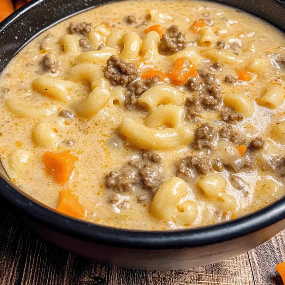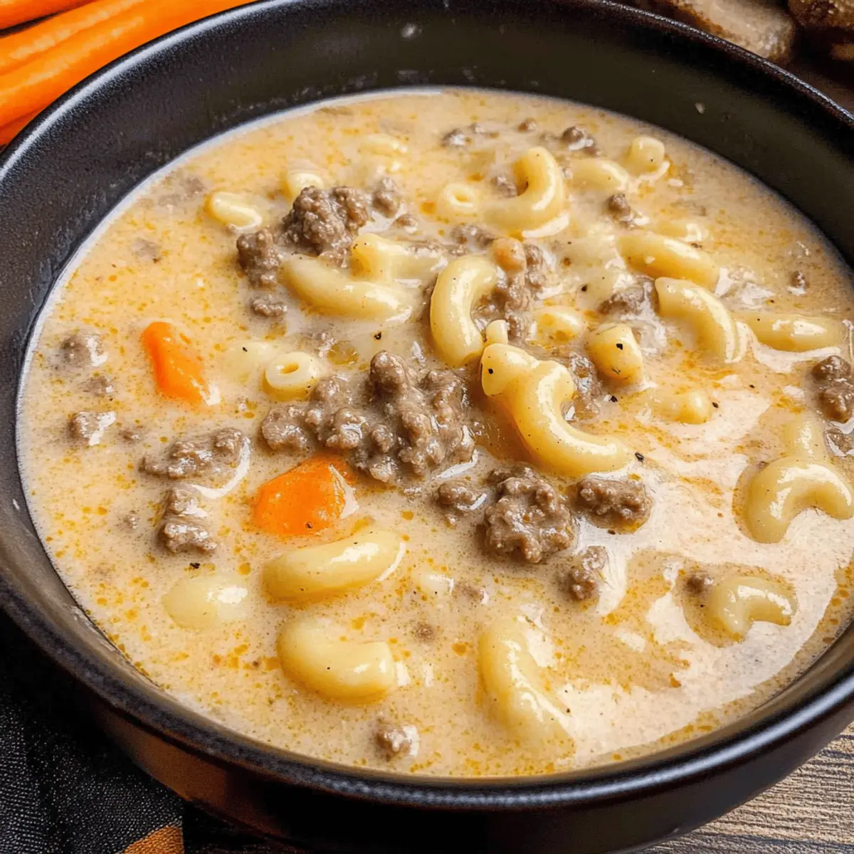 As I stirred the bubbling pot, the rich aroma of savory ground beef mingled with the warmth of garlic and cheese, instantly transporting me back to carefree evenings spent sharing meals with family. This creamy Cheeseburger Macaroni Soup is more than just comfort food; it’s a delightful one-pot meal that transforms the iconic flavors of a cheeseburger into a cozy bowl of happiness. Perfect for those busy weeknights or lazy weekends, this dish is not only quick to prepare but also incredibly satisfying, making it an instant favorite for everyone at the table. Why settle for fast food when you can whip up this nourishing masterpiece in no time? Curious to see how easy it is to make? Let’s dive into the deliciousness together! Why is this Cheeseburger Macaroni Soup a must-try? Comforting, Hearty Flavor: This soup combines all the beloved tastes of a classic cheeseburger in a warm, creamy bowl. One-Pot Wonder: With minimal cleanup, it’s perfect for busy weeknights. Just combine everything in one pot and let the magic happen! Customizable Goodness: Feel free to swap in ground turkey or add your favorite vegetables like bell peppers or corn. Quick to Prepare: Ready in under 30 minutes, it’s an easy way to deliver warmth and satisfaction any day of the week. Family-Friendly Appeal: Everyone from kids to adults will savor every spoonful, making it a hit for family dinners. Try serving it alongside a crisp salad or some crusty bread for the ultimate comfort meal! And if you’re in the mood for more scrumptious soups, check out my Cowboy Soup Hearty or Chicken Gnocchi Soup recipes for additional delicious options! Cheeseburger Macaroni Soup Ingredients For the Soup Base Olive Oil – Adds fat for sautéing; substitute with butter for a richer flavor. Ground Beef – The heartiness comes from this main protein; ground turkey or chicken can be used for a leaner dish. Yellow Onion – Sweetness and depth are enhanced with this; shallots can offer a milder taste. Garlic – Infuses aromatic flavor; fresh garlic is preferred, though garlic powder works in a pinch. All-Purpose Flour – Thickens the soup nicely; cornstarch is a great gluten-free alternative. Chicken Broth – Serves as the base liquid adding umami; vegetable broth can be swapped for a vegetarian option. For Creaminess and Flavor Heavy Cream – Contributes to the soup’s richness; half and half or whole milk can provide lighter alternatives. Salt and Pepper – Essential for flavor enhancement; adjust to your taste preference. Onion Powder, Italian Seasoning, Paprika – Adds extra depth; feel free to adjust these spices based on your palette. For Texture and Nutrition Matchstick Carrots – These add sweetness and a pop of color; you can use fresh or frozen. Uncooked Macaroni Noodles – Provides heartiness and texture; swap for any small pasta shape, adjusting the cooking time accordingly. For the Cheese Finish Shredded Cheddar Cheese – The star cheese, delivering that signature cheeseburger flavor; consider mixing in different cheese varieties for more complexity. Shredded Parmesan Cheese – Offers a nutty finish; Pecorino Romano can be a flavorful substitute. With these ingredients assembled, you’re just minutes away from serving up a warm bowl of Cheeseburger Macaroni Soup that will surely steal the spotlight at your dining table! Step‑by‑Step Instructions for Cheeseburger Macaroni Soup Step 1: Heat the Oil In a large pot, heat 2 tablespoons of olive oil over medium-high heat. As the oil shimmers, watch for the first wisps of smoke, indicating it’s ready to use. This will form the flavorful base for your Cheeseburger Macaroni Soup. Step 2: Brown the Beef Add 1 pound of ground beef and 1 diced yellow onion to the pot. Use a wooden spoon to crumble the beef as it cooks, ensuring all pieces are browned evenly, about 5-7 minutes. The beef should look deep brown with no pink remaining, and the onion should be softened. Step 3: Add Garlic Stir in 2 minced garlic cloves to the pot and sauté for an additional minute. You’ll know it’s done when the garlic becomes fragrant and lightly golden—this will deepen the flavors of your soup. Step 4: Incorporate Flour Sprinkle in ¼ cup of all-purpose flour, stirring constantly for 2-3 minutes until the beef is evenly coated. This step helps to thicken your Cheeseburger Macaroni Soup, turning it into a creamy delight. Step 5: Pour in Broth Carefully pour in 4 cups of chicken broth while stirring continuously. Bring the mixture to a simmer for about 5 minutes, or until it starts to thicken slightly. You want to see gentle bubbles rising to the surface. Step 6: Mix in Cream and Seasonings Add 1 cup of heavy cream, a pinch of salt, pepper, onion powder, 1 teaspoon of Italian seasoning, and 1 teaspoon of paprika. Stir well to combine, allowing the soup to return to a gentle simmer for another 2-3 minutes, ensuring the flavors meld beautifully. Step 7: Add Carrots and Pasta Once simmering, mix in 1 cup of matchstick carrots and 1 ½ cups of uncooked macaroni noodles. Stir thoroughly to keep everything evenly distributed, and bring it back to a rolling boil for a minute. Step 8: Simmer the Soup Reduce heat to low, cover the pot, and simmer for 20 minutes. Stir occasionally; you’ll notice the pasta absorbing flavors and the soup thickening to a creamy consistency, perfect for a comforting meal. Step 9: Add Cheese After 20 minutes, remove the lid and add 1 cup shredded cheddar cheese and ½ cup shredded parmesan cheese. Stir until melted and smoothly integrated into the soup, creating that delightful cheeseburger flavor you love. Step 10: Serve Warm Ladle the Cheeseburger Macaroni Soup into bowls while hot. The enticing aroma will fill the air, inviting everyone to dig in. Consider pairing it with crusty bread or a fresh salad for a complete comforting meal. What to Serve with Cheeseburger Macaroni Soup Cozy up your table with delightful sides that perfectly complement the rich 