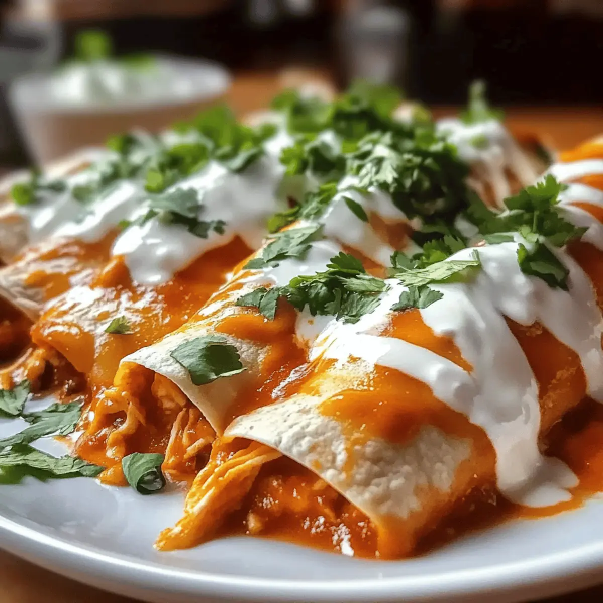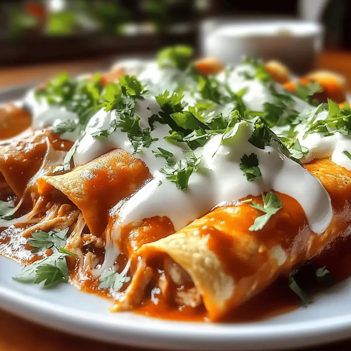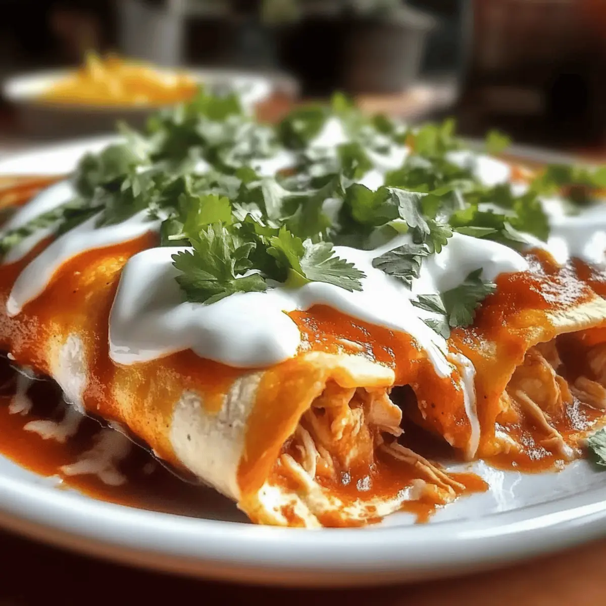Remove the Chicken Enchiladas from the oven and let them rest for about 5 minutes before serving. This resting time allows the flavors to settle and makes serving easier. Garnish with a sprinkle of fresh chopped cilantro and serve with a side of sour cream for a delightful touch. Enjoy this comforting dish with family and friends!