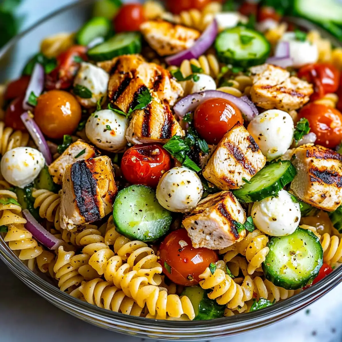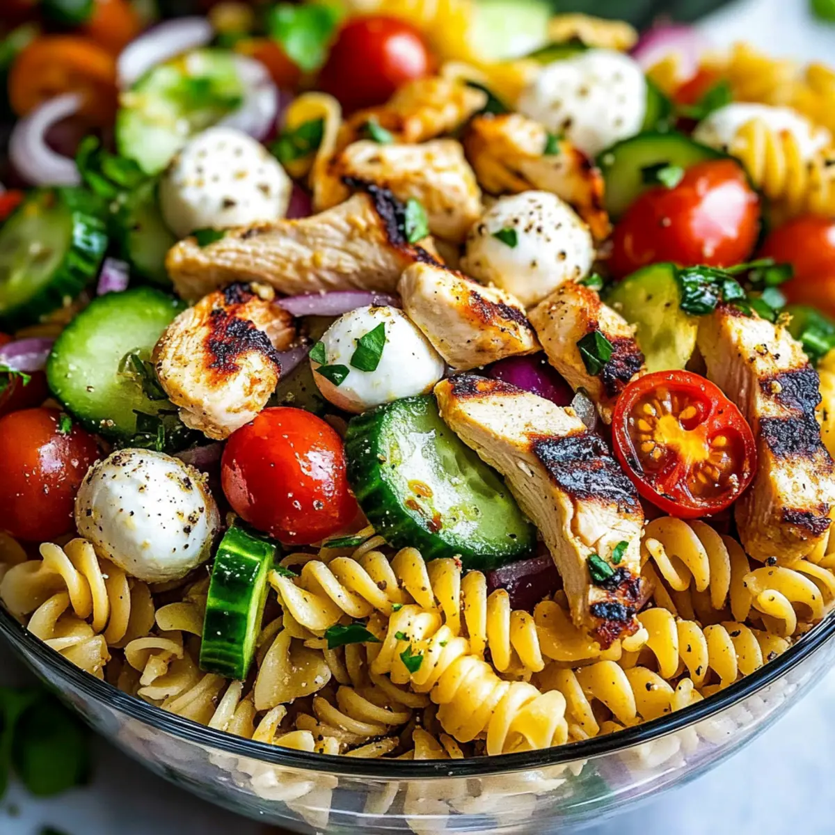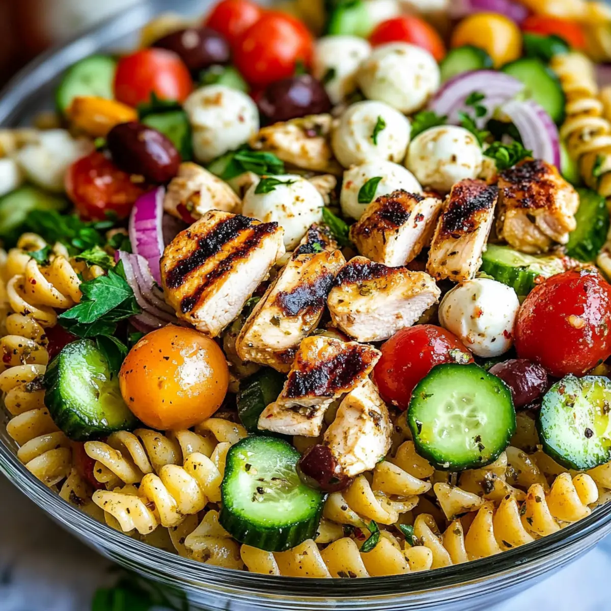 Facebook Twitter Pinterest LinkedIn“Can you believe a full meal can come together in just 30 minutes?” That’s what I wondered when I first discovered this Healthy Chicken Pasta Salad recipe, and it quickly changed my weeknight dinners for good. Imagine tucking into a bowl filled with juicy grilled chicken, crisp cucumbers, and vibrant cherry tomatoes, all drizzled with a zesty homemade dressing that dances on your palate. This Chicken Pasta Salad isn’t just a feast for your taste buds; it’s also a lifesaver on those bustling days when you crave something quick yet satisfying. Whether you’re hosting a summer potluck or prepping meals for the week, you’ll love how this light, fresh dish stays delicious even after a day in the fridge. Curious about how the flavors come together so beautifully? Let’s dive in! Why Is This Chicken Pasta Salad Amazing? Versatile Ingredients: You can customize this salad with various chicken options like grilled, rotisserie, or shredded, making it perfect for every palate. Quick Prep Time: In just 30 minutes, you can have a wholesome meal ready, ideal for busy weeknights! Fresh and Flavorful: Crisp cucumbers and vibrant cherry tomatoes add a refreshing touch that perfectly complements the tangy dressing. Perfect for Meal Prep: This Chicken Pasta Salad stores beautifully, so it’s excellent for preparing ahead to enjoy throughout the week. Just check out our Tortellini Pasta Salad for more meal prep ideas! Crowd-Pleasing Option: Whether it’s a casual dinner or a potluck, this salad impressively caters to everyone’s taste buds. You can also explore variations like our Pizza Pasta Bake for added excitement! Chicken Pasta Salad Ingredients • The key elements create a delicious experience. For the Salad Rotini Pasta – The twisted shape holds dressing and is a great base; switch to penne or bowtie for a fun twist. Boneless, Skinless Chicken Breasts – Provides heartiness; rotisserie or shredded options can add even more flavor. Cucumber – Fresh and crunchy; perfect for a refreshing bite in your Chicken Pasta Salad. Cherry Tomatoes – Juicy and sweet, they add a burst of flavor that brightens every mouthful. Red Onion – Offers a mild sharpness; adjust the quantity based on your taste preferences. Kalamata Olives – Their briny goodness deepens the salad’s flavor profile. Mozzarella Balls – Creamy and soft, they bring a delightful texture; feta is a tangy alternative. Fresh Parsley – Brightens the dish with color and flavor; it’s like a sprinkle of garden magic! For the Dressing Olive Oil – Acts as a base for the dressing and is used for grilling; avocado oil can be a lovely substitute. Italian Seasoning – A blend of herbs that elevates the chicken’s flavor; perfect for adding depth. Italian Dressing – Combine olive oil, red wine vinegar, Parmesan cheese, and herbs; store-bought can make prep even quicker. Seasoning and Additional Ingredients – Bring balance with salt, pepper, garlic powder, and herbs; feel free to spice it up with crushed red pepper flakes for a kick! Step‑by‑Step Instructions for Chicken Pasta Salad Step 1: Prepare Chicken Begin by preheating your grill or grill pan to medium-high heat, around 375°F. While it’s heating, season the boneless, skinless chicken breasts with a drizzle of olive oil, followed by a generous sprinkle of Italian seasoning, salt, and pepper. Grill the chicken for about 5-6 minutes on each side until golden brown and fully cooked, reaching an internal temperature of 165°F. Let the chicken rest before chopping it into bite-sized pieces for your Chicken Pasta Salad. Step 2: Cook Pasta In a large pot, bring salted water to a rolling boil and add the rotini pasta. Cook according to the package instructions, typically around 7-9 minutes, until al dente. Once done, drain the pasta thoroughly and rinse it under cold water to stop the cooking process and prevent it from sticking. This step ensures your Chicken Pasta Salad remains light and refreshing when served. Step 3: Make Dressing While the pasta cools, grab a bowl or jar for the dressing. Combine extra virgin olive oil, red wine vinegar, Parmesan cheese, and your choice of herbs in the bowl. Whisk or shake the mixture until it’s well blended and emulsified. For the best flavor, refrigerate the dressing until you’re ready to assemble the Chicken Pasta Salad, allowing the ingredients to meld beautifully. Step 4: Assemble Salad In a large mixing bowl, combine the cooled rotini pasta, grilled chicken pieces, chopped cucumber, halved cherry tomatoes, sliced red onion, kalamata olives, mozzarella balls, and fresh parsley. Drizzle the homemade Italian dressing over the top and toss everything together gently until well mixed. This ensures the dressing evenly coats all the fresh ingredients in your Chicken Pasta Salad. Step 5: Adjust Seasoning and Serve Taste your Chicken Pasta Salad and adjust seasoning as needed with additional salt and pepper. If it needs more tang, feel free to add a splash of more dressing. Serve immediately for a delightful meal, or cover and refrigerate for a couple of hours to let the flavors develop further. This refreshing Chicken Pasta Salad is perfect any time you crave a satisfying yet light dish! How to Store and Freeze Chicken Pasta Salad Fridge: Keep your Chicken Pasta Salad in an airtight container for up to 3 days to preserve freshness. If possible, store dressing separately to prevent sogginess. Make-Ahead: Prepare the salad ingredients in advance and mix them before serving. The dressing can be made and stored in the fridge for up to 2 days, enhancing the flavors. Room Temperature: If serving at a gathering, aim to keep out for no longer than 2 hours, as bacteria can multiply quickly at room temperature. Freezer: This salad is best enjoyed fresh and should not be frozen. The pasta and veggies will lose their texture and flavor. Make Ahead Options These Chicken Pasta Salad is perfect for busy h