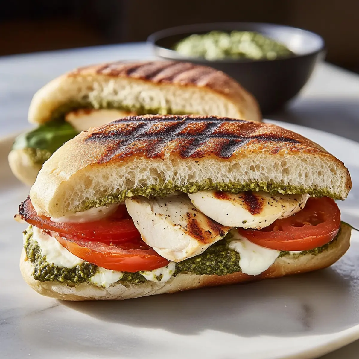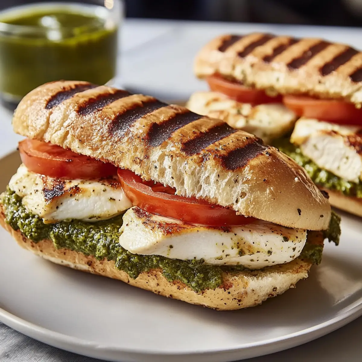 Picture this: a sunny afternoon, the smell of grilled chicken wafting through the kitchen, and the sound of crunchy ciabatta sizzling on the grill. That’s the moment these Chicken Pesto Sandwiches transform a simple mealtime into an unforgettable experience. Bursting with the vibrant flavors of fresh basil pesto, creamy mozzarella, and juicy tomatoes, this recipe is not only incredibly quick—ready in just 20 minutes—but also offers a gluten-free alternative for those who need it. Whether you’re serving it for a delightful lunch or a relaxing dinner, each bite is a comforting reminder of homemade goodness. Ready to elevate your sandwich game and satisfy your taste buds? Let’s dive in! Why Choose Chicken Pesto Sandwiches? Quick Preparation: In just 20 minutes, you can whip up this delicious meal, perfect for busy weeknights or last-minute lunch plans. Flavor Explosion: The combination of pesto, mozzarella, and fresh tomatoes creates a heavenly taste sensation that will keep you coming back for more. Dietary Flexibility: With easy substitutions, enjoy a gluten-free version or a scrumptious vegetarian option without missing out on flavor. Crowd Pleaser: These sandwiches are sure to impress guests at gatherings—pair them with an arugula salad or a cup of tomato soup for a delightful spread. Simple Ingredients: Made with everyday pantry items, you might already have everything on hand, making it a go-to recipe for quick meals! Chicken Pesto Sandwiches Ingredients For the Sandwiches • Ciabatta Rolls – Provides structure and a toasty crunch; substitute with gluten-free rolls for dietary needs. • Olive Oil – Ensures a beautifully toasted crust on the ciabatta; use extra virgin for enhanced flavor. • Basil Pesto – Acts as the flavor foundation, infusing the sandwich with herbaceous notes; consider store-bought for convenience. • Grilled Chicken – Adds protein and juiciness; pre-cooked rotisserie chicken is a quick shortcut. • Fresh Mozzarella – Offers creaminess and melts beautifully; provolone or fontina can be used as alternatives. • Ripe Tomato – Provides freshness and juiciness; avoid using frozen tomatoes to maintain texture. • Salt & Pepper – Enhances flavor; always season to taste. Optional Garnish • Fresh Basil – Elevates flavor with a burst of freshness; perfect for presentation as well. • Flaky Sea Salt – A light sprinkle can enhance the overall flavor profile of the sandwich. Step‑by‑Step Instructions for Chicken Pesto Sandwiches Step 1: Preheat the Grill Pan Start by preheating a grill pan over medium-high heat for about 5 minutes. This will ensure that your Chicken Pesto Sandwiches get those perfect grill marks and a lovely crispiness. While the pan heats, gather your ingredients and slice the ciabatta rolls in half, setting them aside. Step 2: Prepare the Ciabatta Rolls Brush the cut sides of each ciabatta roll generously with olive oil. This will create a beautifully golden crust when grilled. Arrange the rolls cut-side up on a clean surface, ready for the next delicious layers of flavor that will make up your Chicken Pesto Sandwiches. Step 3: Add the Pesto Spread 1 tablespoon of basil pesto on each bottom half of the ciabatta rolls. Ensure an even layer of pesto for full flavor in every bite. This herbaceous spread is the star of the show in your Chicken Pesto Sandwiches, giving them that irresistible taste that will have everyone coming back for more! Step 4: Layer the Fillings Now, layer each sandwich with slices of grilled chicken, followed by fresh mozzarella and ripe tomato slices. Season the layers lightly with salt and pepper to enhance their natural flavors. The combination of toppings will elevate your Chicken Pesto Sandwiches to a whole new level of deliciousness! Step 5: Assemble and Grill Cap each sandwich with the top half of the ciabatta rolls, pressing down gently to hold the fillings in place. Place the sandwiches carefully in the preheated grill pan and grill for 2-3 minutes on each side. Look for a golden-brown crust and melted cheese to signal when they’re ready to be flipped! Step 6: Optional Garnish Once your Chicken Pesto Sandwiches are grilled to perfection, consider garnishing them with fresh basil, a drizzle of extra pesto, or a sprinkle of flaky sea salt. These simple additions are not only visually appealing but also enhance the flavor, making your sandwiches even more delightful to eat! Step 7: Serve and Enjoy Remove the sandwiches from the grill and let them rest briefly before cutting them in half. Serve your Chicken Pesto Sandwiches warm with a side of arugula salad, crunchy kettle chips, or a comforting cup of tomato soup. These delectable sandwiches are sure to impress and satisfy! Make Ahead Options These Chicken Pesto Sandwiches are perfect for meal prep enthusiasts! You can prepare the ciabatta rolls with pesto and layer the grilled chicken, mozzarella, and seasonings up to 24 hours in advance, storing them tightly wrapped in the refrigerator. If you want to extend freshness, consider refrigerating the prepped sandwiches without the ripe tomatoes, which maintain their texture better when added right before grilling. When ready to serve, simply grill the sandwiches for about 2-3 minutes on each side until golden brown and the cheese is melted, ensuring that each bite remains just as delicious as if you made them fresh! Expert Tips for Chicken Pesto Sandwiches Hot Grill Pan: Ensure your grill pan is adequately heated before adding the sandwiches for those perfect grill marks and crispy texture. Layer Wisely: Avoid sogginess by placing mozzarella between the chicken and tomato. This keeps the bread from getting too moist. Storage Savvy: If you plan to freeze leftovers, assemble your sandwiches without tomatoes. Wrap tightly to help preserve freshness for later enjoyment. Substitution Secrets: When making gluten-free Chicken Pesto Sandwiches, opt for gluten-free ciabatta rolls to maintain that sat