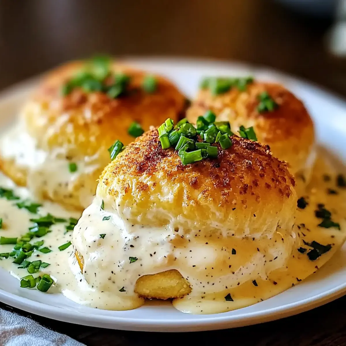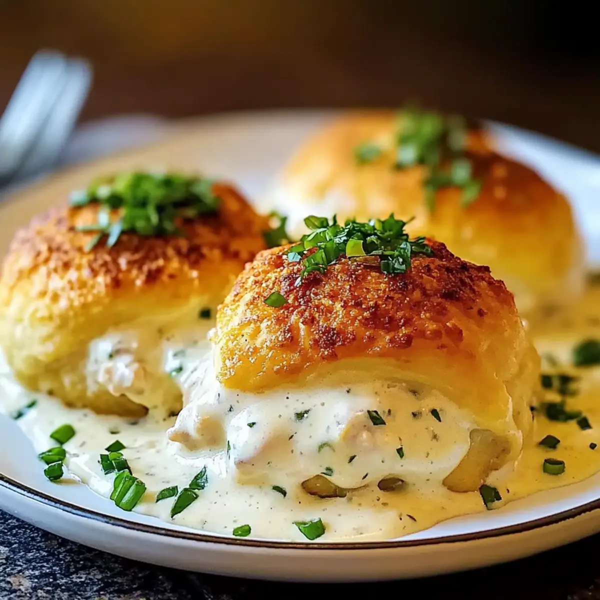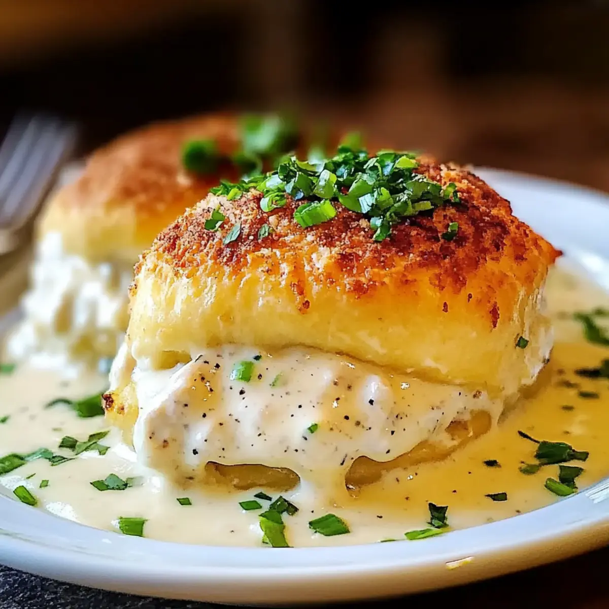 Facebook Twitter Pinterest LinkedInIn the hustle and bustle of a busy week, finding time to create a home-cooked meal can feel like a mini crisis. But don’t fret! My Comforting Chicken Pillows with Creamy Parmesan Sauce are the answer to your weeknight dinner woes. Flaky, buttery crescents cradle a heavenly filling of creamy shredded chicken, and they’re dressed with a silky Parmesan sauce that’s sure to impress. This dish not only comes together quickly but also transforms a simple dinner into an elegant experience for the whole family. Need a little twist? You can easily adapt these pillows with added veggies or different cheeses. Ready to dive into this comforting delight? Let’s roll up our sleeves and start cooking! Why are Chicken Pillows a must-try? Comfort Food Awesomeness: These Chicken Pillows offer a heartwarming taste that reminds everyone of home-cooked meals. Effortless Preparation: With simple ingredients and easy steps, you can have dinner ready in no time, making them ideal for busy weekdays. Creamy Parmesan Sauce: The rich sauce elevates the dish, adding a luxurious touch that will wow your family. Versatile to Customize: Feel free to add veggies or swap cheeses for a personal twist, making this dish versatile enough for any palate. Perfect for Gatherings: Whether it’s a family dinner or a cozy night with friends, these Chicken Pillows impress and satisfy even the pickiest eaters. Try serving them alongside a refreshing salad or some steamed veggies for a complete meal—like a nice complement to my Parmesan Italian Sausage that adds a hearty touch. Dive into these delicious pillows that are sure to become a family favorite! Chicken Pillows with Creamy Parmesan Sauce Ingredients For the Filling • Cooked Shredded Chicken – This is the main protein component; feel free to use rotisserie chicken for a quick fix. • Cream Cheese – Adds a rich creaminess; ensure it’s softened for easy mixing. • Chopped Green Onions – Provides a pop of fresh flavor; shallots are a great alternative if you prefer a sharper taste. • Salt and Pepper – Essential for enhancing overall flavor; adjust according to your taste preference. For the Dough • Refrigerated Crescent Rolls – Creates that delightful flaky texture; you can use puff pastry as a substitute if desired. • Melted Butter – Adds richness and helps breadcrumbs stick; swap with olive oil for a lighter touch. For the Topping • Italian-seasoned Breadcrumbs – Coats your pillows for added crunch and flavor; plain breadcrumbs mixed with Italian herbs will do in a pinch. For the Creamy Sauce • Butter – Unsalted is best for controlling seasoning while making the roux. • All-Purpose Flour – Thickens your sauce; cornstarch can replace it for a gluten-free option. • Chicken Broth – The flavorful base for your sauce; low-sodium varieties work well for less salt. • Milk – Brings creaminess to your sauce; use plant-based milk for a dairy-free alternative. • Grated Parmesan Cheese – Key for that creamy, rich sauce flavor; freshly grated will yield the best results. Indulge in these Chicken Pillows with Creamy Parmesan Sauce, a dish your family will love! Step‑by‑Step Instructions for Chicken Pillows with Creamy Parmesan Sauce Step 1: Preheat the Oven Begin by preheating your oven to 375°F (190°C) and lightly greasing a baking sheet with non-stick spray or melted butter. This ensures your Chicken Pillows won’t stick and will bake evenly. As the oven heats up, gather your ingredients to streamline the preparation process for a smooth cooking experience. Step 2: Prepare the Filling In a mixing bowl, combine the shredded chicken, softened cream cheese, chopped green onions, and a sprinkle of salt and pepper. Use a fork or spatula to mix until the ingredients are well incorporated and creamy. Aim for a smooth consistency that will fill your Chicken Pillows perfectly, keeping them moist and flavorful. Step 3: Unroll the Crescent Dough Carefully unroll the refrigerated crescent roll dough on a clean surface and separate it into individual triangles. Make sure to lay them out without overlapping. Visualize each triangle as a little pillow waiting to be filled—this will make stuffing and sealing them much easier in the next step. Step 4: Fill the Dough Triangles Take a heaping tablespoon of the chicken filling and place it at the wide end of each dough triangle. Be careful not to overfill, as it may cause the pillows to burst during baking. Fold the dough over the filling, then gently roll it up to create a pillow shape, ensuring you seal the edges tightly to keep the filling from seeping out. Step 5: Coat with Butter and Breadcrumbs Melt some butter in a small bowl, and one by one, dip each Chicken Pillow in the melted butter. After that, roll them in Italian-seasoned breadcrumbs, coating them evenly for a crispy texture. The buttery breadcrumb layer will add a delightful crunch when baked, enhancing the overall appeal of your Chicken Pillows. Step 6: Arrange and Bake Place the coated Chicken Pillows on the greased baking sheet. Make sure to space them out slightly to allow even cooking. Bake them in your preheated oven for about 20–25 minutes, or until they turn golden brown and the dough looks flaky. Keep an eye on them towards the end to achieve that perfect golden color. Step 7: Prepare the Creamy Parmesan Sauce While the Chicken Pillows are baking, melt butter in a saucepan over medium heat. Whisk in the all-purpose flour to form a roux, stirring continuously for about 1-2 minutes until golden and bubbly. This will create the base for your creamy sauce, ensuring it has a velvety texture. Step 8: Make the Sauce Creamy Gradually whisk in chicken broth and milk into the roux, continuing to stir until the mixture is smooth. Allow it to simmer gently for a few minutes until it thickens. Watch for bubbles as it thickens up; this will be the perfect consistency for coating your Chicken Pillo