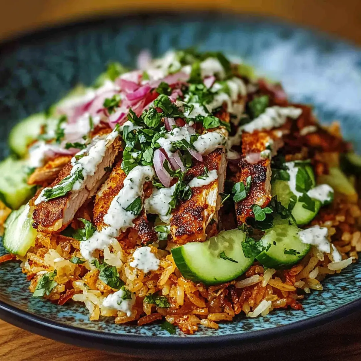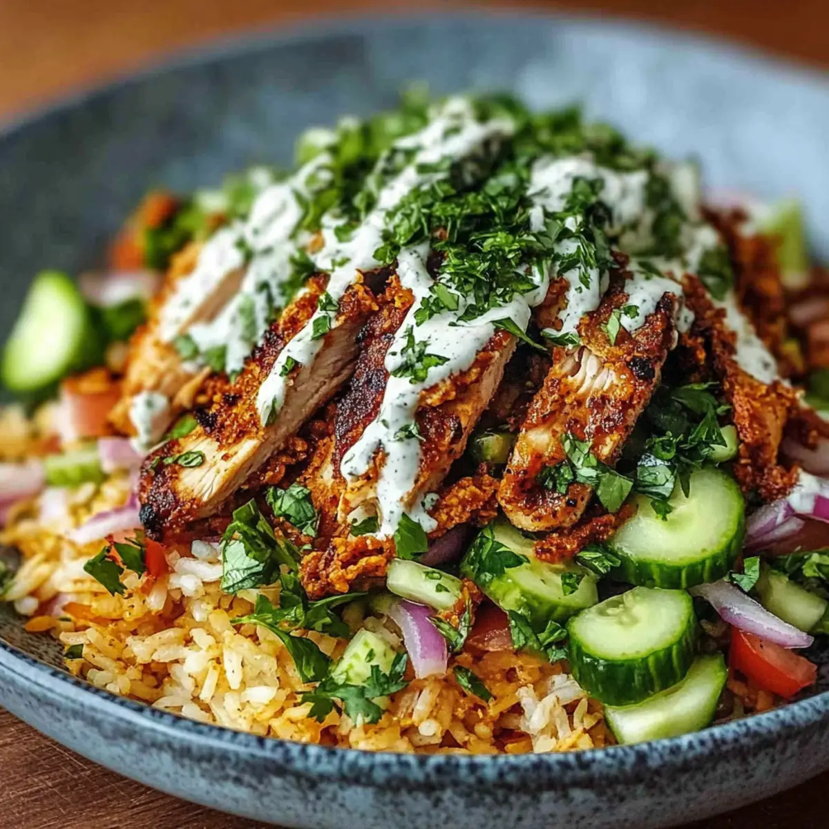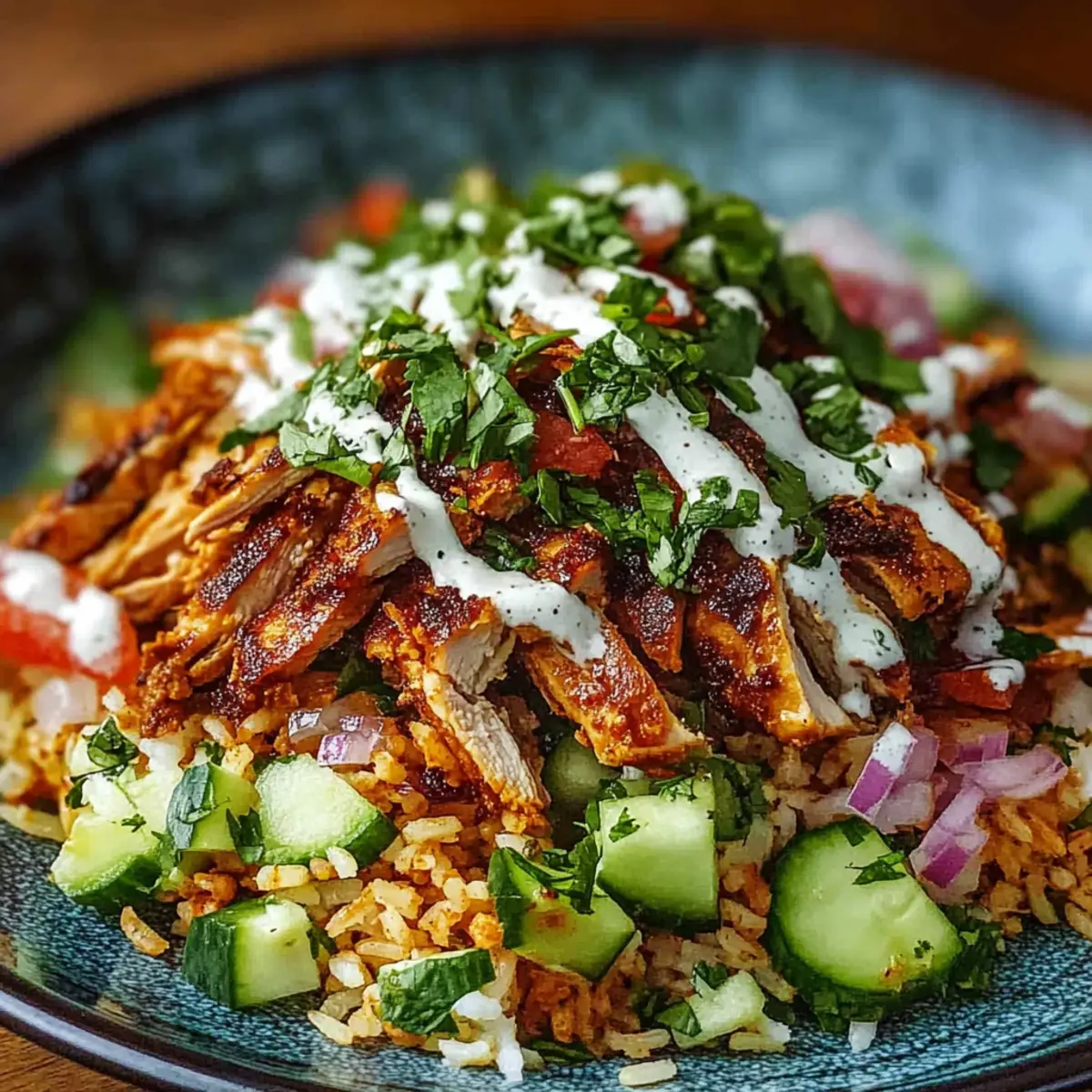 Facebook Twitter Pinterest LinkedInAs the sizzle of marinated chicken meets the heat of the skillet, my kitchen transforms into a bustling Middle Eastern bazaar. This Chicken Shawarma Crispy Rice Salad brings together succulent spices, crunchy rice, and fresh vegetables, topped with a creamy tahini dressing that takes your taste buds on an adventure. With its healthy meal prep benefits and the ability to impress even the pickiest of eaters, this dish strikes the perfect balance between comfort and innovation. Whether you’re looking for a fulfilling dinner or a standout lunch, this salad is the answer to your quest for something vibrant yet satisfying. Ready to dive into a bowl of irresistible flavors and textures? Let’s get cooking! Why Is This Salad So Delicious? Bold flavors of Middle Eastern spices mingle seamlessly in this Chicken Shawarma Crispy Rice Salad, ensuring every bite bursts with taste! Hearty yet light, this dish is perfect for a balanced meal any time of day. Meal prep friendly, enjoy ready-to-go portions that maintain freshness throughout the week. Unique textures come from crispy rice and tender chicken, making it visually appealing and satisfying. Serve it with warm pita bread for a complete experience or try it alongside other favorites like Restaurant Style Chicken for variety! Chicken Shawarma Crispy Rice Salad Ingredients • Get ready to create a dish bursting with Middle Eastern flavors! For the Chicken Chicken (1 lb) – This is your main protein; thighs are juicier, while breasts offer leaner options. Olive Oil (4 tbsp total) – Adds richness for marinating and cooking; can substitute with avocado oil for a different flavor. Cumin (2 tsp) – Infuses warm, earthy tones; adjust for spiciness. Paprika (1 tsp) – Adds richness and a touch of sweetness to the chicken. Garlic Powder (1 tsp) – Enhances the savory profile; fresh garlic can be used as a substitute. Turmeric (½ tsp) – Provides a lovely golden hue and unique flavor. Salt & Pepper – Essential for enhancing flavors; adjust based on dietary needs. For the Salad Base Cooked Rice (2 cups, cooled) – This is the foundation; provides crunch and can be swapped for any cooked grain. Cucumber (1, diced) – Fresh and crisp, it adds texture; feel free to replace with bell peppers or radishes. Tomatoes (2, chopped) – Bright and juicy; a great source of freshness. Red Onion (½, sliced) – Adds a flavorful bite; use green onions for a milder taste. Fresh Parsley or Cilantro – These herbs brighten the dish and offer a burst of flavor; choose based on your liking. For the Dressing Tahini (¼ cup) – A creamy base that brings everything together; yogurt is a suitable alternative. Lemon Juice (from 1 lemon) – Adds essential acidity; lime can be used as a zesty substitute. Garlic Clove (1, minced) – Brings a robust punch to the dressing; optional if you prefer a softer flavor. Water – Adjust the amount to achieve your desired dressing consistency. Enjoy preparing this Chicken Shawarma Crispy Rice Salad—your taste buds will thank you! Step‑by‑Step Instructions for Chicken Shawarma Crispy Rice Salad Step 1: Marinate Chicken In a bowl, combine 4 tablespoons of olive oil with 2 teaspoons of cumin, 1 teaspoon of paprika, 1 teaspoon of garlic powder, and ½ teaspoon of turmeric. Season with salt and pepper to taste. Add the 1 pound of chicken, coating it thoroughly with the marinade. Cover and let it marinate for at least 30 minutes in the refrigerator to absorb the flavors. Step 2: Cook Chicken Preheat a skillet over medium-high heat. Add the marinated chicken and cook for about 6-7 minutes per side, until it reaches an internal temperature of 165°F and is nicely browned. Once cooked, transfer the chicken to a cutting board and let it rest for 5 minutes, allowing the juices to redistribute before slicing it into strips. Step 3: Crisp Rice In the same skillet, add a drizzle of olive oil over medium heat. Add the 2 cups of cooled cooked rice, spreading it out evenly. Cook for about 5-7 minutes, flipping occasionally until the rice is golden and crispy. Alternatively, you can use an air fryer, preheating it to 400°F and cooking the rice for about 10 minutes, shaking the basket halfway through. Step 4: Prepare Vegetables While the rice crisps, wash and chop your fresh vegetables. Dice a cucumber, chop two tomatoes, slice half a red onion, and finely chop some fresh parsley or cilantro. This medley will add both flavor and texture to your Chicken Shawarma Crispy Rice Salad, so make sure to enjoy the vibrant colors as you prepare them. Step 5: Make Dressing In a mixing bowl, whisk together ¼ cup of tahini, juice from one lemon, 1 minced garlic clove, and 2 tablespoons of olive oil. Gradually add water until you reach your desired consistency; it should be creamy yet pourable. Allow the dressing to chill in the refrigerator for 15 minutes to meld the flavors, making it even more delightful. Step 6: Assemble Salad To put together your Chicken Shawarma Crispy Rice Salad, start with a layer of the crispy rice as a base on a serving platter or bowl. Top the rice with the sliced chicken, followed by the prepared vegetables and herbs. Drizzle the creamy tahini dressing all over the top, and for extra flair, add some pickles as a garnish if desired. Expert Tips for Chicken Shawarma Crispy Rice Salad Marinate Well: Ensure the chicken marinates for at least 30 minutes to allow the spices to penetrate deeply and enhance flavors. Crisp the Rice: Cook the rice thoroughly until golden brown for the perfect crunchy texture and avoid overly wet rice, which can become soggy. Chill the Dressing: Letting the tahini dressing chill for 15 minutes before serving allows the flavors to meld beautifully for a richer taste in your Chicken Shawarma Crispy Rice Salad. Store Separately: For meal prep, keep the components (chicken, rice, veggies, and dressing) in separate airtight containers; this maintains freshness and textur