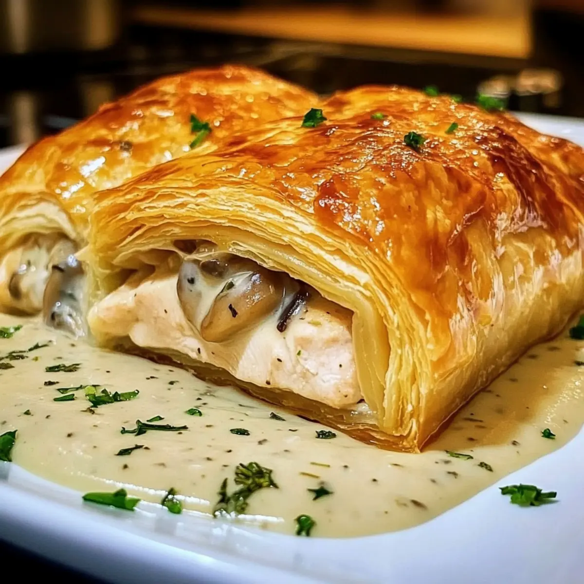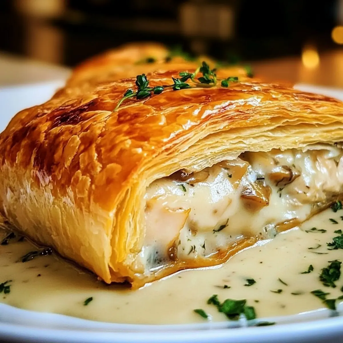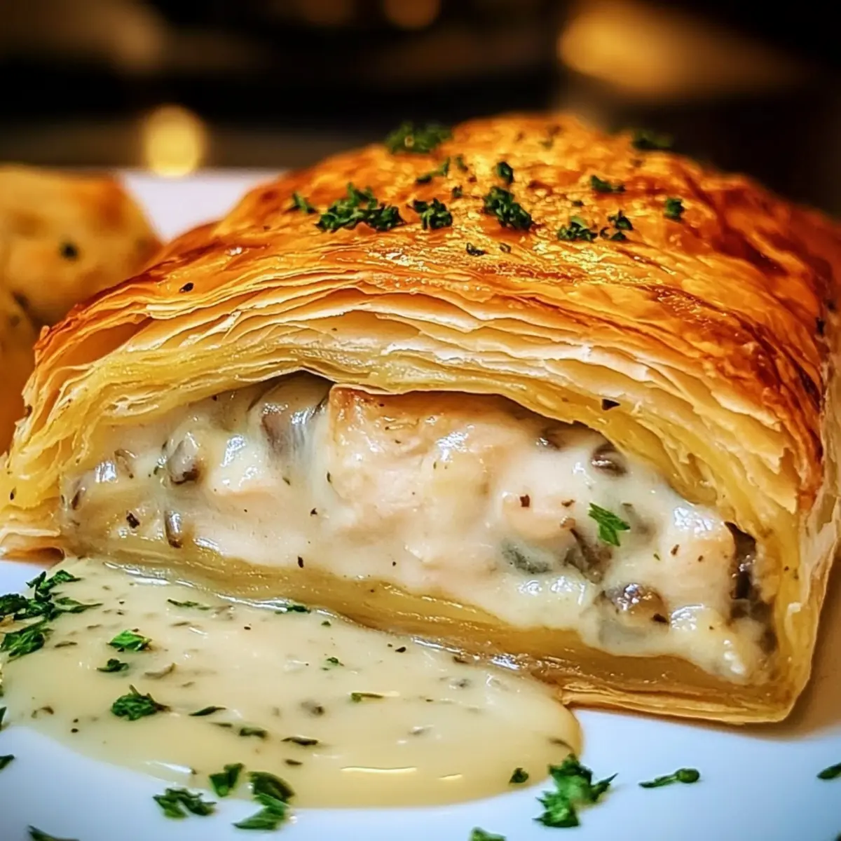 Facebook Twitter Pinterest LinkedInAs I stood in my kitchen, the aroma of sautéed garlic and earthy mushrooms wafted through the air, instantly transporting me to a quaint Parisian bistro. That’s when I decided to elevate my usual chicken dinner and try my hand at the delightful Chicken Wellington, a dish that transforms the everyday into something truly gourmet. This recipe wraps tender chicken breast, a rich mushroom duxelles, and creamy cheese inside a flaky pastry, making it not only a comforting main course but also an impressive showstopper for any occasion. The best part? It’s surprisingly quick to prepare while still delivering that fancy restaurant feel right at home. Are you ready to indulge in this culinary adventure? Let’s dive into the details! Why is Chicken Wellington a Must-Try? Elevated Comfort Food: Chicken Wellington takes your average dinner to the next level, merging home-cooked warmth with gourmet flair. Impressive Presentation: The golden, flaky crust not only looks stunning but also tempts everyone to slice in and discover the delicious filling. Quick & Easy: You can have a restaurant-quality meal on the table in about an hour, perfect for busy weeknights or last-minute guests. Flavors to Fall In Love With: With its rich mushroom duxelles and creamy cheese, every bite is a taste sensation that’s sure to please any palate. Versatile Options: Feel free to swap out the mushrooms or cheeses to match your preferences, making this dish adaptable for any taste. Pair It Perfectly: Serve alongside a light salad or creamy herb sauce, and don’t forget to explore other recipes like Hawaiian Chicken Sheet or Grilled Chicken Broccoli for a complete meal experience. Chicken Wellington Ingredients For the Filling • Chicken Breasts – The star of the dish providing protein and structure. Use boneless and skinless for even cooking. • Mushrooms – Finely chopped to create the duxelles, which adds depth of flavor. Use cremini or button mushrooms for the best results. • Garlic – Minced for aromatic depth in the filling. Fresh garlic enhances flavor and aroma. • Shallots – Also minced, contributing a subtle sweetness that pairs wonderfully with the mushrooms. • Fresh Thyme – Adds a touch of earthiness and brightens the filling; can substitute with dried thyme if needed. • Fresh Parsley – Offers freshness and complexity to the overall flavor. A sprinkle of fresh herbs is always a welcome addition. • Cream Cheese or Boursin – Provides creaminess and binds the filling together; can substitute with similar soft cheeses. For the Pastry • Puff Pastry – Creates the flaky, buttery shell unique to Wellington; ensure it’s thawed properly before use for best results. • Egg Yolk – Serves as an egg wash for achieving a golden, shiny crust; a must for that beautiful finish. For Seasoning • Salt & Pepper – Essential for seasoning throughout the recipe to enhance all flavors; don’t skip this step for balanced taste! With these ingredients at your fingertips, your Chicken Wellington will not only be a stunning centerpiece but also a delightful experience in every bite! Step‑by‑Step Instructions for Chicken Wellington Step 1: Preheat the Oven Begin by preheating your oven to 400°F (200°C). This ensures it reaches the perfect temperature for baking the Chicken Wellington to a golden perfection. While the oven warms up, prep a baking sheet by lining it with parchment paper to prevent sticking and aid in cleanup. Step 2: Sauté the Mushroom Mixture In a skillet, melt a tablespoon of butter and a drizzle of olive oil over medium heat. Add finely chopped mushrooms, minced garlic, and shallots, stirring frequently until the mixture thickens and moisture evaporates, about 10-12 minutes. Season generously with fresh thyme, parsley, salt, and pepper. Once done, transfer the mixture to a bowl and allow it to cool while you prepare the chicken. Step 3: Sear the Chicken Breasts Season your chicken breasts with salt and pepper while heating a skillet over high heat. Add a touch of oil, searing the chicken for about 4-5 minutes on each side until golden brown. This step is crucial for enhancing flavor and texture. Once done, remove the chicken from the skillet and let it cool to room temperature. Step 4: Roll Out the Puff Pastry On a lightly floured surface, roll out the thawed puff pastry until it’s about 1/8 inch thick, ensuring it’s large enough to envelop the chicken entirely. Lay the pastry on the prepared baking sheet. This pastry is essential for achieving the delightful flaky crust of Chicken Wellington, so handle it with care. Step 5: Assemble the Filling Spread the cooled mushroom mixture evenly over the center of the pastry, leaving an inch border around the edges. Then, place the seared chicken breasts on top of the mushrooms. Finally, spread a layer of cream cheese or Boursin over the chicken. This adds a luscious creaminess that complements the dish beautifully. Step 6: Fold and Seal the Pastry Carefully fold the pastry over the chicken and mushroom filling, ensuring it completely encases everything. Pinch the seams tightly to seal and prevent any filling from escaping while baking. If you want a decorative touch, you can score the top with sharp knife cuts, which also allows steam to escape. Step 7: Brush with Egg Wash In a small bowl, whisk together an egg yolk with a tablespoon of water to create an egg wash. Brush the mixture generously over the surface of the wrapped Chicken Wellington. This will give it that beautiful shiny, golden finish once it’s out of the oven. Step 8: Chill Before Baking Refrigerate the assembled Chicken Wellington for 15-20 minutes. Chilling helps the pastry maintain its shape and ensures it’s perfectly flaky when baked. During this time, you can clean up your workstation and prepare the creamy herb sauce to serve it with. Step 9: Bake the Wellington Place the chilled Chicken Wellington in the preheated oven 