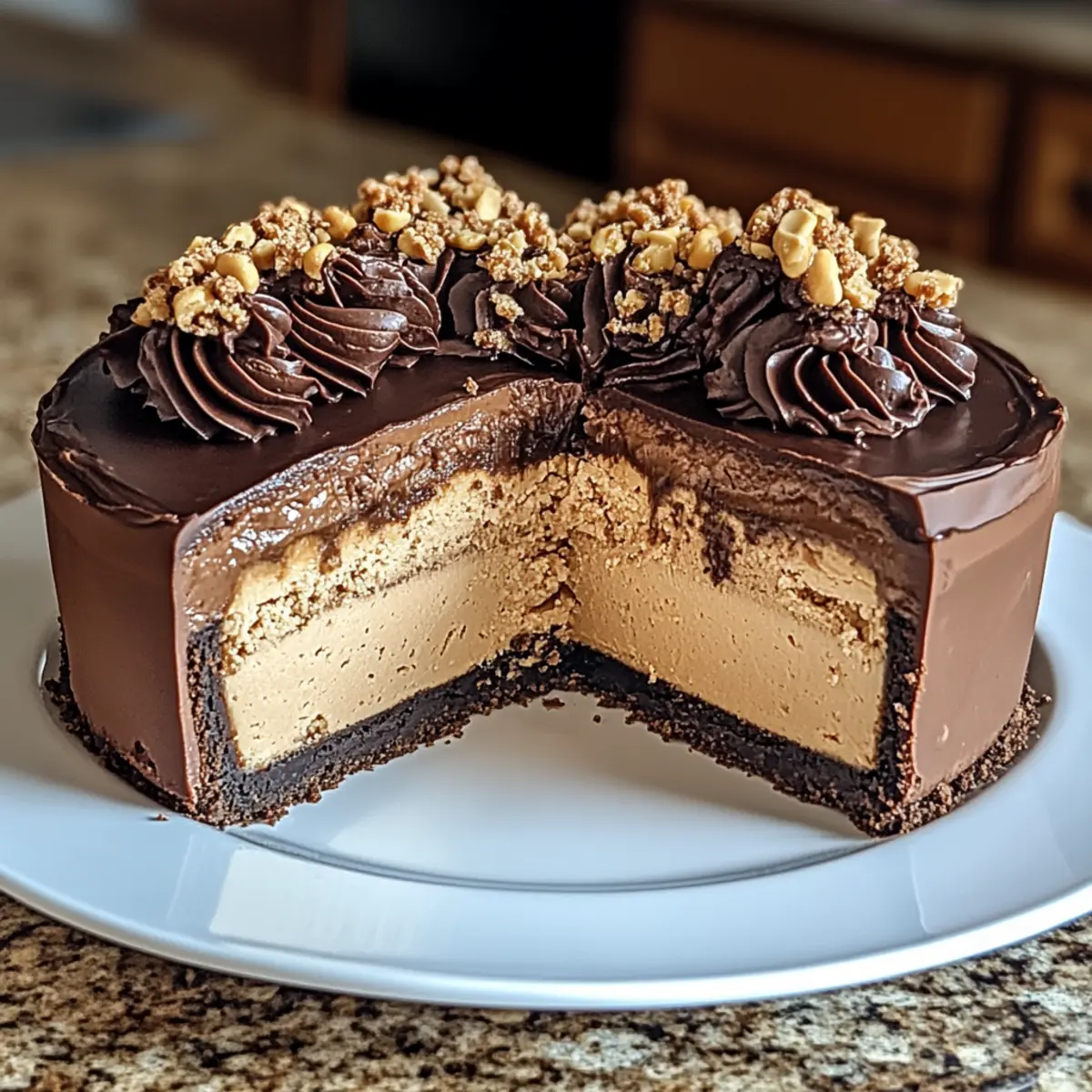 Facebook Twitter Pinterest LinkedInThe moment the rich aroma of melting chocolate envelops my kitchen, I know it’s time to whip up something truly special. Today, I’m excited to share my recipe for Chocolate Peanut Butter Cheesecake, a dessert that effortlessly marries creamy cheesecake with the nutty honesty of peanut butter, all drizzled in a velvety chocolate ganache. Whether you’re hosting a dinner party, celebrating a birthday, or simply treating yourself on a cozy night in, this cheesecake is a guaranteed crowd-pleaser. Plus, with a no-bake variation for those warmer days, it’s perfect for any occasion. Trust me, after one bite, you’ll be in dessert heaven! Are you ready to dive into this delightful treat? Why is this cheesecake a must-try? Decadent Delight: Each bite of this Chocolate Peanut Butter Cheesecake is a rich experience, balancing creamy cheesecake and chocolate ganache. Easy Preparation: With simple steps, even beginner bakers can create this showstopper. Versatile Options: Whether you prefer a classic baked version or a quick no-bake choice, this recipe adapts effortlessly. Crowd-Pleasing Flavor: It’s sure to impress at gatherings; expect compliments all around! Perfect for Any Occasion: From casual nights to celebrations, this cheesecake fits every event, making it a go-to dessert choice. For more cheesecake ideas, check out my delicious Biscoff Cheesecake Bake or try the refreshing Vegan Mango Cheesecake. Chocolate Peanut Butter Cheesecake Ingredients • Dive into the deliciousness of this decadent treat! For the Crust Graham Cracker Crumbs – Perfect base structure; you can swap with cookie crumbs like Oreos for a sweeter twist. Butter (Melted) – Binds crust ingredients so they hold together; margarine works well for a dairy-free option. Granulated Sugar – Adds delightful sweetness; for a richer flavor, consider using brown sugar. Salt – Balances sweetness, enhancing all flavors with a touch of savoriness. For the Filling Cream Cheese – Provides that creamy goodness; ensure it’s at room temperature to avoid lumps in your cheesecake. Peanut Butter – Boozy richness; choose smooth or crunchy depending on your texture preference. Granulated Sugar – Sweetens the filling; feel free to adjust based on how sweet you like it! Eggs – Provides structure and stability; beat until pale yellow for the best results. Sour Cream – Adds moisture and a subtle tang; Greek yogurt makes a healthy alternative. Vanilla Extract – Deepens flavor notes; opt for pure vanilla for an enhanced taste. For the Ganache Heavy Cream – The star for making ganache; light cream or coconut cream can create a lighter alternative. Chocolate Chips – Essentials for the ganache topping; dark or milk chocolate works based on your flavor preference. Now you have everything you need to create this irresistible Chocolate Peanut Butter Cheesecake! Happy baking! Step‑by‑Step Instructions for Chocolate Peanut Butter Cheesecake Step 1: Prepare the Crust Preheat your oven to 325°F (163°C). In a medium bowl, combine graham cracker crumbs, melted butter, granulated sugar, and a pinch of salt until well mixed. Press this mixture firmly into the bottom of a greased 9-inch springform pan, creating an even base. Bake for 8–10 minutes until slightly golden, then remove and let it cool completely while you prepare the filling. Step 2: Make the Filling In a large mixing bowl, beat the cream cheese until creamy and smooth, ensuring there are no lumps. Gradually incorporate the peanut butter and granulated sugar, mixing until fully combined. Add in the eggs one at a time, blending thoroughly after each addition, followed by the sour cream and vanilla extract. You’re aiming for a silky and uniform cheesecake filling ready to pour. Step 3: Bake the Cheesecake Pour the luscious filling into the cooled crust, smoothing the top evenly. Place the springform pan in the center of your oven and bake for 50–60 minutes. The edges should be set while the center remains slightly jiggly. Once finished, turn off the oven, crack the door open, and let the cheesecake cool inside for about an hour to prevent cracking. Step 4: Prepare Ganache While your cheesecake cools, prepare the chocolate ganache. In a small saucepan, heat the heavy cream along with a tablespoon of butter over medium heat until it just begins to simmer. Remove it from the heat and add the chocolate chips. Stir gently until the mixture is smooth and glossy. Allow it to cool slightly before pouring it over the cheesecake. Step 5: Finish the Cheesecake Once the ganache has cooled to a pourable consistency, gently pour it over the chilled cheesecake, spreading it evenly. You can spread it out with a spatula or let it drip down the sides for a beautiful presentation. Chill the cheesecake in the refrigerator for an additional 30 minutes to allow the ganache to set for that perfect slice. Step 6: Serve When ready to indulge, carefully remove the cheesecake from the springform pan. Slice it into generous pieces and serve it garnished with crushed peanuts, a dollop of whipped cream, or a drizzle of caramel sauce for added sweetness. Each slice of this Chocolate Peanut Butter Cheesecake promises rich layers of flavor that everyone will love! Chocolate Peanut Butter Cheesecake Variations Feel free to sprinkle your unique touch on this delightful cheesecake and watch it transform! No-Bake Version: Simply chill the filling instead of baking; perfect for hot days when you want a quick treat. Cookie Crust: Swap out graham cracker crumbs for crushed Oreos or Biscoff cookies, adding a Signature depth to the base flavor. Dairy-Free Delight: Substitute cream cheese with a vegan alternative and use coconut cream for the ganache for a delightful dairy-free variation. Swirled Peanut Butter: Mix in a swirl of extra peanut butter into the filling for a bolder nutty flavor that will leave taste buds dancing. Coconut Flake Topping: Sprinkle toasted cocon