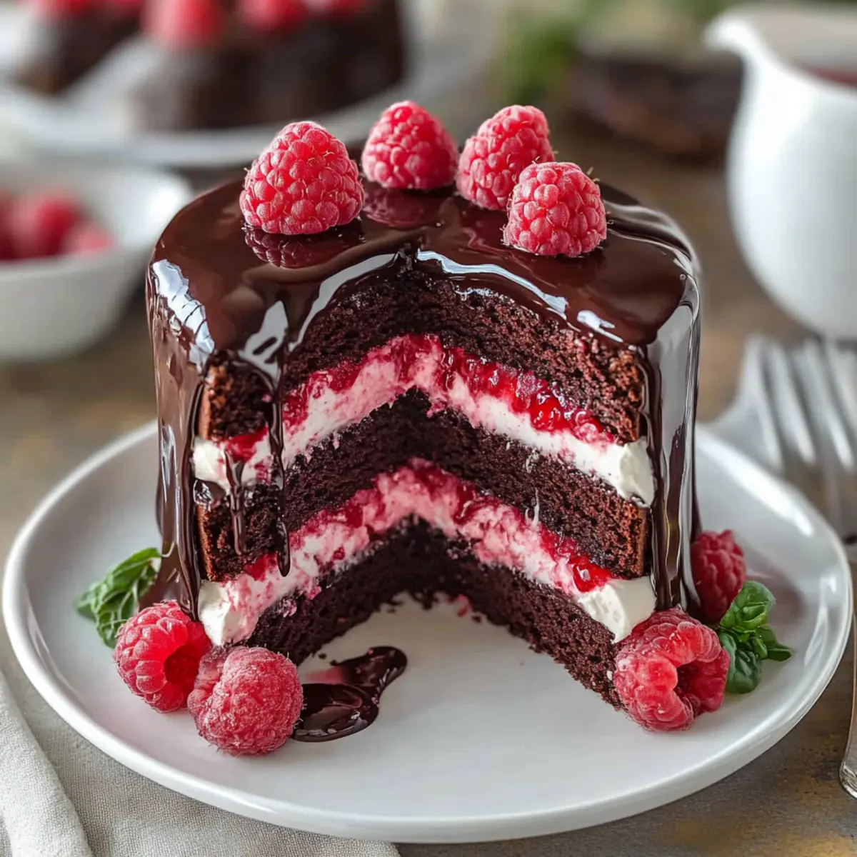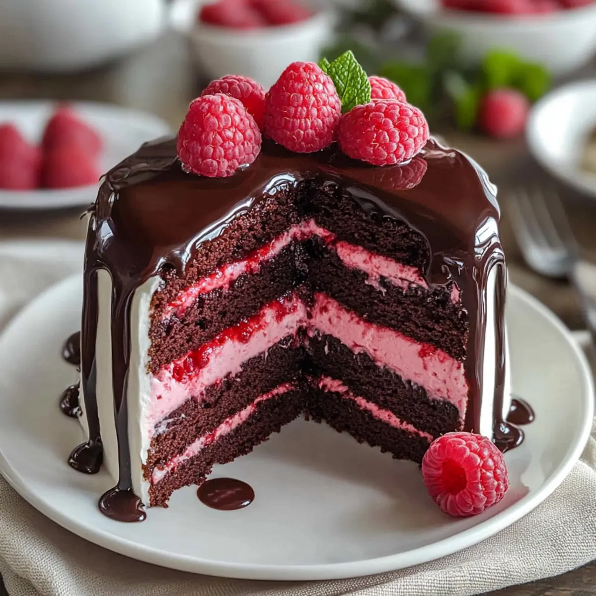 There’s something incredibly satisfying about slicing into a cake and revealing its luscious layers—it’s like unwrapping a gift! Today, I’m thrilled to share my recipe for a Chocolate Raspberry Drip Cake, a dessert that not only looks stunning but also tastes heavenly. Picture velvety chocolate layers complemented by a tangy raspberry cream cheese filling, all draped in a shiny ganache that makes a statement on any table. This cake isn’t just a showstopper; it’s also a crowd-pleaser that can be whipped up for any celebration or cozy gathering. You’ll love how easy it is to assemble and how the delightful contrast of rich chocolate and vibrant fruit flavors captivates the senses. Ready to dive into the magic of baking? Let’s create something memorable together! Why is this cake a must-try? Irresistible flavor combination: The luscious mix of rich chocolate and bright raspberry creates an unforgettable taste that dances on your palate. Visual appeal: The glossy ganache drip and radiant raspberries give this cake a stunning, professional look, making it perfect for special occasions. Easy to make: You don’t need to be a baking expert to pull this off—just follow the straightforward steps and enjoy the process! Endless customization: Feeling adventurous? Try swapping the raspberry filling for a light whipped cream or use strawberries for a different twist. Perfect for sharing: Whether it’s a birthday bash or a cozy dinner party, this cake is sure to impress your guests and leave them wanting more. It’s a delightful dessert that combines elegance with comfort, reminiscent of a high-end bakery treat! Chocolate Raspberry Drip Cake Ingredients • Get ready to bake a masterpiece! For the Cake All-Purpose Flour – Provides structure for the cake; whole wheat flour yields a denser texture. Dutch-Process Cocoa Powder – Adds deep chocolate flavor; use natural cocoa with adjusted leaveners if needed. Baking Powder & Baking Soda – Essential leavening agents for a fluffy rise. Salt – Enhances overall flavor and balances the sweetness. Sugar – Sweetens the cake, contributing to its lovely texture. Eggs – Adds moisture and structure; flax eggs work as a vegan option. Buttermilk – Brings richness; milk with vinegar can be a substitute. Vegetable Oil – Ensures a moist texture; can be swapped with melted butter. Vanilla Extract – Adds depth of flavor; omit if necessary. For the Raspberry Filling Cream Cheese – Provides tanginess; substitute with whipped cream for a lighter filling. Powdered Sugar – Sweetens and stabilizes the raspberry filling. Raspberries – The star ingredient for a tart, fruity flavor; frozen raspberries work well if thawed. For the Ganache Heavy Cream – Creates a smooth texture for ganache; coconut cream can substitute for a dairy-free option. Chocolate – Choose high-quality chocolate for the best ganache consistency in your Chocolate Raspberry Drip Cake. Step‑by‑Step Instructions for Chocolate Raspberry Drip Cake Step 1: Preheat and Prepare Pans Begin by preheating your oven to 350°F (175°C) while you prepare two 9-inch round cake pans. Grease the pans thoroughly with vegetable oil or butter and dust with flour to ensure your Chocolate Raspberry Drip Cake comes out easily once baked. Set the prepared pans aside and let’s move to mixing the ingredients! Step 2: Mix Dry Ingredients In a large mixing bowl, sift together 2 cups of all-purpose flour, ¾ cup of Dutch-process cocoa powder, 1½ teaspoons of baking powder, ½ teaspoon of baking soda, and ½ teaspoon of salt. Whisk these dry ingredients until evenly blended, creating a rich base for the cake. This step is crucial for the texture; it allows the cake layers to rise perfectly! Step 3: Beat Wet Ingredients In another bowl, use an electric mixer to beat together 1¾ cups of sugar and 3 large eggs for about 3-4 minutes, until the mixture is light and fluffy. Slowly add 1 cup of buttermilk, ½ cup of vegetable oil, and 2 teaspoons of vanilla extract. Mix until fully combined and smooth; this rich blend makes the cake moist and flavorful. Step 4: Combine Ingredients Gradually fold the wet ingredients into the dry mixture, combining until just mixed. Be careful not to overmix; a few lumps are perfectly fine. Once combined, evenly divide the batter between the two prepared cake pans, ensuring you level the batter out for even baking. Now, it’s time to bake! Step 5: Bake the Cakes Place the pans in the preheated oven and bake for 25-30 minutes. To check for doneness, insert a toothpick into the center; it should come out clean. Once baked, remove the cake layers from the oven and let them cool in the pans for about 10 minutes before transferring to wire racks to cool completely. Step 6: Prepare Raspberry Filling While the cakes cool, make the raspberry filling. In a mixing bowl, beat 8 oz of cream cheese until smooth, then gradually add 1 cup of powdered sugar and 1 teaspoon of vanilla extract. Once smooth, gently fold in 1 cup of mashed raspberries until fully incorporated. Reserve the filling in the fridge to keep it firm while the cakes finish cooling. Step 7: Make the Ganache For the luscious ganache, heat 1 cup of heavy cream in a saucepan over medium heat until it simmers. Pour the hot cream over 8 oz of chopped high-quality chocolate in a bowl and let it sit for about 5 minutes. Stir the mixture until smooth and glossy, ensuring it’s the perfect consistency for drizzling over your Chocolate Raspberry Drip Cake. Step 8: Assemble the Cake Once the chocolate layers have cooled completely, place one layer on a serving plate. Spread an even layer of raspberry filling on top, then add the second cake layer. Pour the ganache over the top, allowing it to drip down the sides for that beautiful, decadent look. Finish with fresh raspberries and chocolate shavings for a stunning presentation. Make Ahead Options These Chocolate Raspberry Drip Cakes are perfect for busy home cooks who 