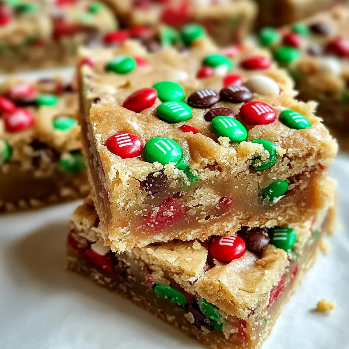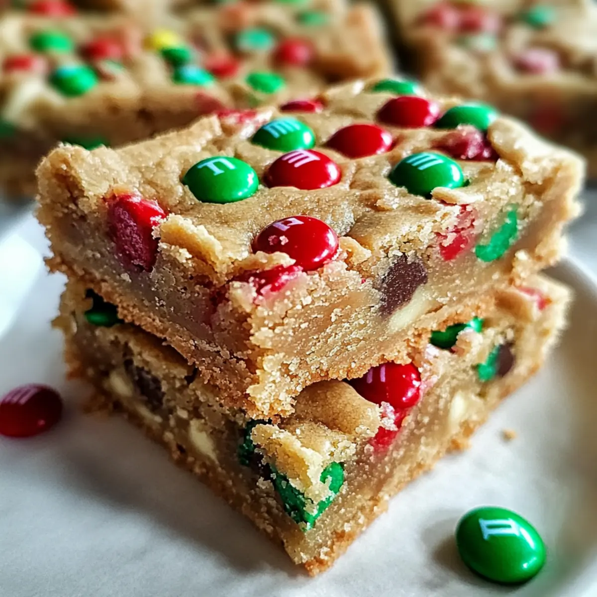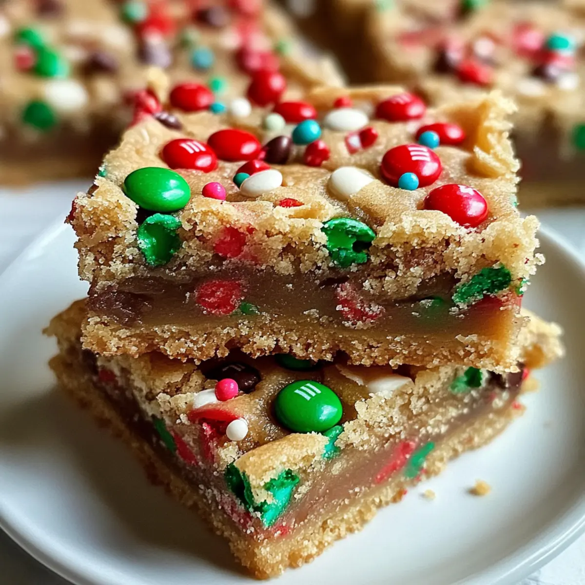 Amid the hustle and bustle of the holiday season, nothing beats the feeling of pulling freshly baked treats from the oven. These delightful Christmas Cookie Bars come together in a flash, making them a perfect solution for those busy evenings when you crave something sweet without all the fuss. Bursting with rich, buttery flavor and vibrant M&Ms, these bars are not only easy to whip up but also a crowd-pleaser for festive gatherings. Plus, they’re designed for sharing—ideal for holiday parties or as a thoughtful homemade gift. What festive twist will you add to your batch? Why are Christmas Cookie Bars a Must-Bake? Quick to Make: These delightful bars come together in no time, allowing you to focus on enjoying the season rather than spending hours in the kitchen. Festive Appeal: With vibrant M&Ms and sprinkles, they add a pop of color to your holiday gatherings. Versatile Options: Feel free to switch up the mix-ins—chocolate chips or dried fruits work beautifully! Perfect for Sharing: Their easy-to-slice format makes them the ideal treat for parties or thoughtful gifts. Check out these Turkey Sugar Cookies for another festive touch. Chewy Perfection: Enjoy the chewy, buttery texture that pairs perfectly with a cup of hot cocoa after a busy day. Don’t miss the chance to whip up these bars for endless holiday joy! Christmas Cookie Bars Ingredients • Let’s gather your ingredients for a festive baking adventure! For the Cookie Base Unsalted Butter – Adds richness and moisture; be sure it’s at room temperature for easy creaming. Brown Sugar – Provides sweetness and a chewy texture; can partially substitute with granulated sugar if desired. Eggs – Essential for binding the ingredients and ensuring moisture in your bars. Vanilla Extract – Enhances the warm, sweet flavor of the cookie bars. All-Purpose Flour – Creates the structure needed for these delightful bars; vital for the perfect consistency. Baking Powder – Acts as a leavening agent to keep the bars light and fluffy. Salt – Balances the sweetness and amplifies the flavor of the bars. For the Festive Touch M&Ms – Provides colorful flair and a fun crunch; swap with chocolate chips or any other colorful candies to suit your taste. Sprinkles – Adds a decorative, festive element; entirely optional but highly recommended for the holiday spirit! Step‑by‑Step Instructions for Christmas Cookie Bars Step 1: Preheat the Oven and Prepare the Pan Begin by preheating your oven to 350°F (175°C). While it warms, take a 9×13-inch metal pan and line it with aluminum foil, leaving some overhang for easy removal. Lightly spray the foil with cooking spray to ensure the Christmas Cookie Bars release effortlessly after baking. Step 2: Cream the Butter and Brown Sugar In a large mixing bowl, combine the room-temperature unsalted butter and brown sugar. Using a hand mixer or a sturdy spatula, cream the mixture together until it achieves a crumbly yet well-combined texture. This should take about 2-3 minutes, and you’ll know it’s ready when the mixture appears light and fluffy. Step 3: Add Eggs and Vanilla Next, crack in the eggs, followed by the vanilla extract. Mix the ingredients on medium speed until the batter is smooth and fully blended together, which should take an additional 1-2 minutes. Pay attention to the color, as it will lighten slightly during this process, signaling it’s perfectly incorporated. Step 4: Incorporate Dry Ingredients Sprinkle the baking powder and salt over the batter, mixing briefly to distribute. Gradually add the all-purpose flour while stirring gently until just combined. It’s important not to over-mix at this stage; you want the Christmas Cookie Bars to remain tender and chewy. Step 5: Fold in M&Ms and Sprinkles Once the dough is fully combined, gently fold in the colorful M&Ms and a handful of festive sprinkles, reserving some for the top. Use a spatula to carefully incorporate these mix-ins, ensuring they are evenly distributed throughout the dough for a burst of flavor and color in every bite. Step 6: Transfer to the Pan Scoop the cookie dough into the prepared pan, using a silicone spatula to spread it evenly into all corners. The layer should be smooth and level. Gently press the mixture down to compact it slightly, which helps the bars maintain their shape while baking. Step 7: Bake to Golden Perfection Place the pan in the preheated oven, baking the Christmas Cookie Bars for 22-25 minutes. Keep an eye out for them turning a lovely golden brown around the edges while the centers remain slightly soft—this will ensure a perfect chewy texture once cooled. Step 8: Cool and Slice After baking, remove the pan from the oven and let the cookie bars cool in the pan for at least 10-15 minutes. Carefully lift the bars out using the foil overhang and transfer them to a cooling rack. Once completely cooled, slice them into squares and enjoy these delightful Christmas Cookie Bars. Storage Tips for Christmas Cookie Bars Room Temperature: Store your Christmas Cookie Bars in an airtight container at room temperature for up to 4 days, keeping them fresh and delicious for snacking. Fridge: If you prefer a colder treat, these bars can be stored in the fridge for up to a week; just ensure they’re covered tightly to prevent drying out. Freezer: For longer storage, freeze the bars in an airtight container or freezer bag for up to 1 month. Thaw at room temperature before serving for the best texture. Reheating: For a warm treat, you can pop a bar in the microwave for 10-15 seconds; enjoy the melty M&Ms! What to Serve with Christmas Cookie Bars Indulging in these festive treats opens up a world of delightful pairings that enhance your holiday experience. Hot Cocoa: A classic warm drink that contrasts perfectly with the chewy texture of the bars. Top it with whipped cream for extra indulgence. Peppermint Ice Cream: Cool, creamy, and refreshing, this dessert balances the sweetness of the bars and add