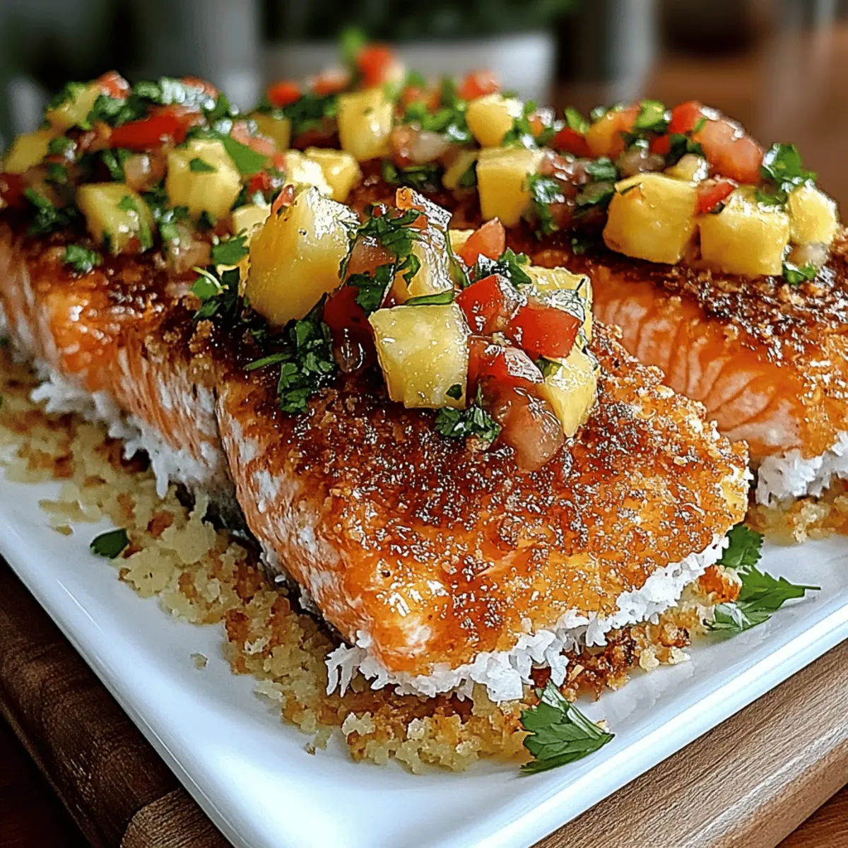 As I stood in my kitchen, the warm scent of coconut mingling with the vibrant aroma of fresh pineapple brought me back to that sunny beachside cafe in Hawaii. Today, I’m excited to share my recipe for Coconut Crusted Salmon with Pineapple Salsa, a dish that encapsulates the essence of tropical bliss. This delightful recipe not only offers a healthy and gluten-free option but also comes together in no time, making it perfect for any occasion, whether it’s a laid-back dinner or a special celebration. The crispy coconut crust provides a satisfying crunch, while the tangy pineapple salsa adds a refreshing burst that can transform dinner into a mini getaway. Curious about how to create this mouthwatering combination? Let’s dive in! Why is this dish a must-try? Deliciously Unique: This Coconut Crusted Salmon with Pineapple Salsa is not your average fish dish—it’s a tropical getaway on a plate! Quick Prep Time: Perfect for busy weeknights; it comes together in just 30 minutes. Health-Conscious Choice: A gluten-free delight packed with omega-3s, making it a nourishing option that doesn’t compromise on flavor. Crowd-Pleasing Appeal: Whether for family dinners or hosting friends, it’s sure to impress with its vibrant colors and delightful flavors. Flexible Cooking Methods: Bake it for a healthier option or fry for indulgence; the choice is yours! This dish pairs beautifully with a side of Baked Salmon Lemon or as a standout against a Salmon Rice Bowl backdrop. Coconut Crusted Salmon Ingredients • Dive into the flavors of Coconut Crusted Salmon with Pineapple Salsa and gather these essentials! For the Salmon Salmon Fillets – Choose fresh, high-quality salmon for the best buttery flavor. Unsweetened Shredded Coconut – This adds a delightful crunch; sweetened coconut can be used for a sweeter taste. Panko Breadcrumbs – Ideal for achieving a light, crispy crust; substitute with gluten-free panko if needed. All-Purpose Flour – Helps the breading stick; use rice flour for a gluten-free version. Large Eggs – Serves as a binding agent for the crust; no need for alternatives here. Salt and Pepper – Adjust to your taste for enhanced flavor. Coconut Oil (or Olive Oil for Baking) – Adds a tropical essence when frying; olive oil is a great alternative for baking. For the Pineapple Salsa Fresh Pineapple (diced) – The sweet base of the salsa; ripeness is key for optimal flavor. Red Bell Pepper (finely chopped) – Brings sweetness and color; feel free to swap with yellow or orange bell peppers. Red Onion (finely chopped) – Adds a sharp flavor to the salsa; consider using green onions as a milder alternative. Jalapeño (seeded and minced) – Provides a kick; adjust according to your spice preference. Lime Juice – Essential for balancing the sweetness; freshly squeezed is highly recommended. Fresh Cilantro (chopped) – Infuses a fresh herbal note; parsley can be used for a gentler taste. Salt (for salsa) – Use to taste to elevate the salsa flavors. Step‑by‑Step Instructions for Coconut Crusted Salmon with Pineapple Salsa Step 1: Prepare Pineapple Salsa Begin by dicing the fresh pineapple while finely chopping the red bell pepper, red onion, and jalapeño. In a medium bowl, combine all these ingredients along with the juice of one lime and chopped cilantro. Sprinkle with salt to taste, then let the mixture sit for 15-20 minutes at room temperature, allowing the flavors to meld beautifully while you prepare the salmon. Step 2: Set Up Breading Station Gather three shallow bowls to create your breading station: one for all-purpose flour, one for beaten eggs, and the last for a mixture of shredded coconut and panko breadcrumbs. This setup helps streamline the coating process for your Coconut Crusted Salmon, ensuring even coverage. Make sure your salmon fillets are patted dry to help the crust adhere perfectly. Step 3: Bread Salmon Take each salmon fillet and first dredge it in the flour, ensuring all surfaces are coated. Next, dip it into the beaten eggs, allowing excess to drip off. Finally, press the fillet into the coconut-panko mixture, covering it thoroughly for a delightful crispy crust. Repeat this process for all fillets, placing them aside once fully coated, ready for cooking. Step 4: Cook Salmon For baking, preheat your oven to 375°F (190°C) and line a baking sheet with parchment paper. Place the coated salmon fillets on the sheet and bake them for 15-20 minutes until golden brown and the salmon flakes easily with a fork. If frying, heat a generous amount of coconut oil in a skillet over medium heat, and fry the fillets for about 3-4 minutes on each side until they achieve a golden color and are cooked through. Step 5: Serve Once your Coconut Crusted Salmon is perfectly cooked, carefully plate the fillets. Generously top each piece with the vibrant pineapple salsa for a burst of flavor. This dish pairs wonderfully with a side of steamed jasmine rice or a fresh salad, enhancing the tropical experience of your meal. Coconut Crusted Salmon with Pineapple Salsa Variations Feel free to get creative and tailor this dish to suit your tastes or dietary needs with these exciting variations! Gluten-Free Option: Swap out panko for gluten-free breadcrumbs or ground almonds to keep the crispy texture. Dairy-Free: This recipe is naturally dairy-free, making it perfect for those who avoid animal products. Vegan Option: Replace salmon with firm tofu. Press and coat in the same coconut-panko mixture for a delicious plant-based twist. Spicy Kick: Add more jalapeño or some red chili flakes to the salsa for an extra layer of heat; it will elevate your flavor profile! Herb Twist: Experiment with different herbs like mint or basil in your salsa for a fragrant enhancement; the freshness will surprise and delight. Fruit Fusion: Substitute the pineapple with mango or kiwi for a completely different fruit salsa experience that still bursts with flavor. Nutty Flavor: Incorporate chopped ma