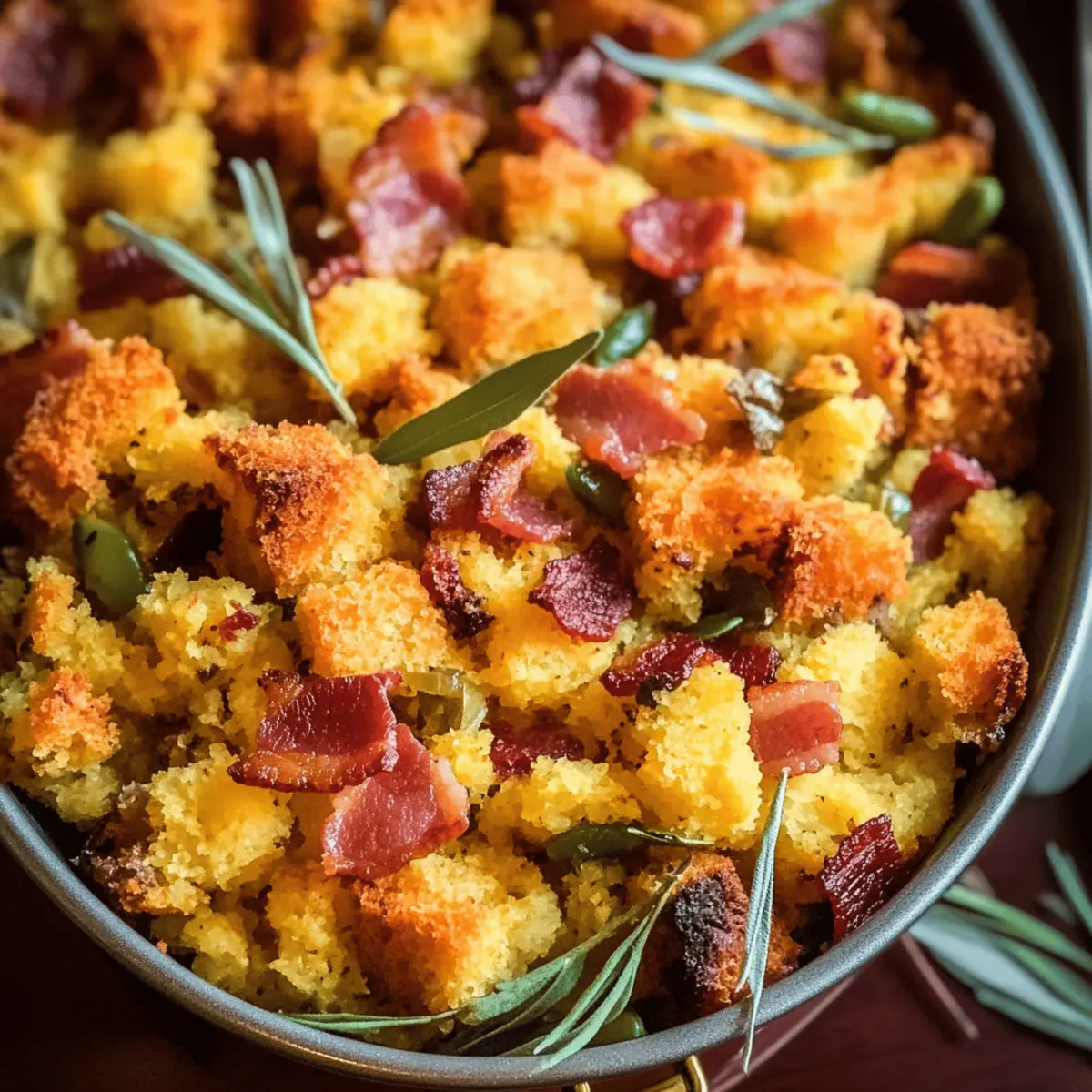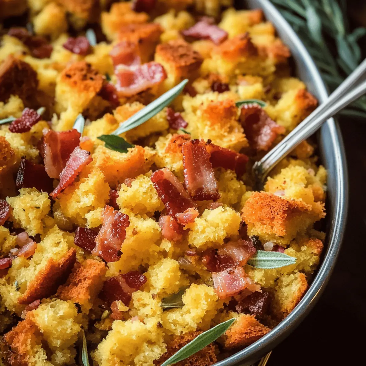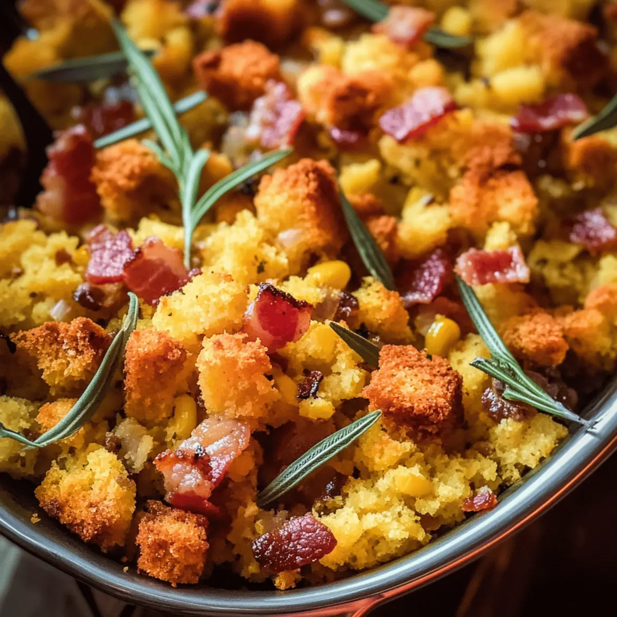 As the savory scent of crispy bacon mingles with sweet cornbread fills my kitchen, I can’t help but feel a wave of nostalgia for family gatherings and holiday feasts. This Cornbread Stuffing with Bacon recipe is more than just a side dish; it’s a comforting creation that’s both easy to make and perfectly customizable to suit your taste. With its rich flavors and simple prep, it’s the ideal addition to any meal, ensuring it’s a crowd-pleaser whether you’re hosting a festive feast or enjoying a weeknight dinner. Plus, if you’re looking to put your own spin on it, you can easily swap in vegetarian options or add your favorite cheeses. Ready to dive into a dish that will have everyone asking for seconds? Let’s get cooking! Why is This Stuffing So Irresistible? Comforting Tradition: This Cornbread Stuffing with Bacon embodies nostalgia, combining the beloved flavors of the South with tender cornbread and smoky bacon. Customizable Perfection: Easily adapt the recipe to suit diverse tastes, whether you prefer a vegetarian option or a cheesy twist for extra indulgence. Simple Preparation: Even novice cooks can whip up this dish with straightforward steps, making it a stress-free addition to any holiday feast. Crowd-Pleasing Appeal: It complements a range of main dishes like turkey and ham, making it a staple for family gatherings and celebrations. Make Ahead Magic: You can prepare it in advance, freeing up time for other culinary creations or last-minute tasks. Enjoy it alongside dishes like Strawberry Caprese Salad or Chicken Sauce for a complete meal experience! Cornbread Stuffing with Bacon Ingredients For the Stuffing Base • Cornbread – Use about 8 cups, crumbled; store-bought is convenient for this delicious Cornbread Stuffing with Bacon. • Bacon – Provides a savory, smoky flavor; feel free to substitute with turkey bacon for a lighter option. • Onion – Adds a natural sweetness; yellow or white onion works best in this recipe. • Celery – Delivers crunch and freshness; green bell pepper can be used as a replacement. • Garlic – Enhances the overall flavor profile; fresh garlic is highly recommended for the best aroma. For the Seasoning • Dried Thyme & Sage – Bring herbal notes; if you have fresh herbs, use them in double quantities for vibrant flavor. • Black Pepper – Adds a touch of mild heat; adjust according to your personal taste preferences. • Salt – Enhances overall taste; be cautious and adjust based on the saltiness of your broth. For Binding and Moisture • Chicken Broth – Moistens the stuffing and infuses flavor; use vegetable broth for a vegetarian version. • Eggs – Acts as a binder; necessary for structure but can be omitted for a vegan alternative. For Garnish • Fresh Parsley – Provides freshness and a pop of color; you can substitute with fresh chives if desired. Step‑by‑Step Instructions for Cornbread Stuffing with Bacon Step 1: Prepare Cornbread Start by crumbling the cooled cornbread into a large mixing bowl, aiming for pieces about one inch in size. This will ensure even distribution in your Cornbread Stuffing with Bacon. If you’re using store-bought cornbread, let it cool to room temperature first, which will make crumbling easier. Step 2: Cook Bacon In a large skillet over medium heat, cook the chopped bacon until it’s crispy and golden brown, which should take about 8-10 minutes. Stir occasionally to ensure even cooking. Once done, use a slotted spoon to remove the bacon and drain it on paper towels to absorb excess grease, leaving the drippings in the skillet for the next step. Step 3: Sauté Vegetables Add diced onion and celery to the hot bacon drippings in the skillet, and sauté over medium heat until they’re softened, roughly 5-7 minutes. Stir in minced garlic for the final minute, allowing it to become fragrant. This aromatic blend will lend incredible flavor to your Cornbread Stuffing with Bacon. Step 4: Combine Ingredients In the bowl with the crumbled cornbread, add the sautéed vegetables, crispy bacon, dried thyme, sage, black pepper, and salt. Mix thoroughly with a large spoon until everything is well combined. This creates the rich base of your stuffing, infusing every bite with the savory flavors you crave. Step 5: Moisten Mixture Pour in the chicken broth and add the beaten eggs to the cornbread mixture. Stir gently but thoroughly until the ingredients are evenly combined. The mixture should feel moist but not overly wet, creating the perfect texture for your Cornbread Stuffing with Bacon to bake beautifully. Step 6: Add Fresh Herbs Fold the chopped fresh parsley into the stuffing mixture, which will add color and freshness to your dish. This step contributes delightful herbal notes that elevate the overall flavor. Make sure the parsley is well distributed within the stuffing. Step 7: Transfer to Baking Dish Preheat your oven to 350°F (175°C). Lightly grease a baking dish with cooking spray or butter, then spread the stuffing mixture evenly into the dish. This ensures an even cook and a beautiful golden top when baked, which is essential for your Cornbread Stuffing with Bacon. Step 8: Bake Cover the baking dish with aluminum foil and bake in the preheated oven for 25 minutes. After that, remove the foil and bake for an additional 10-15 minutes, or until the top is golden brown and crispy. Keep an eye on it during the final baking stage for that perfect crispy layer. Step 9: Cool and Serve Once baked, remove the Cornbread Stuffing with Bacon from the oven and let it rest for about 10 minutes. This allows the stuffing to set slightly, making it easier to serve. Once slightly cooled, dish it out, and watch your family gather around for seconds! Make Ahead Options These Cornbread Stuffing with Bacon can be a lifesaver for busy home cooks looking to simplify their meal prep! You can prepare the entire stuffing mixture up to 24 hours in advance; simply combine all the ingredients (excluding t