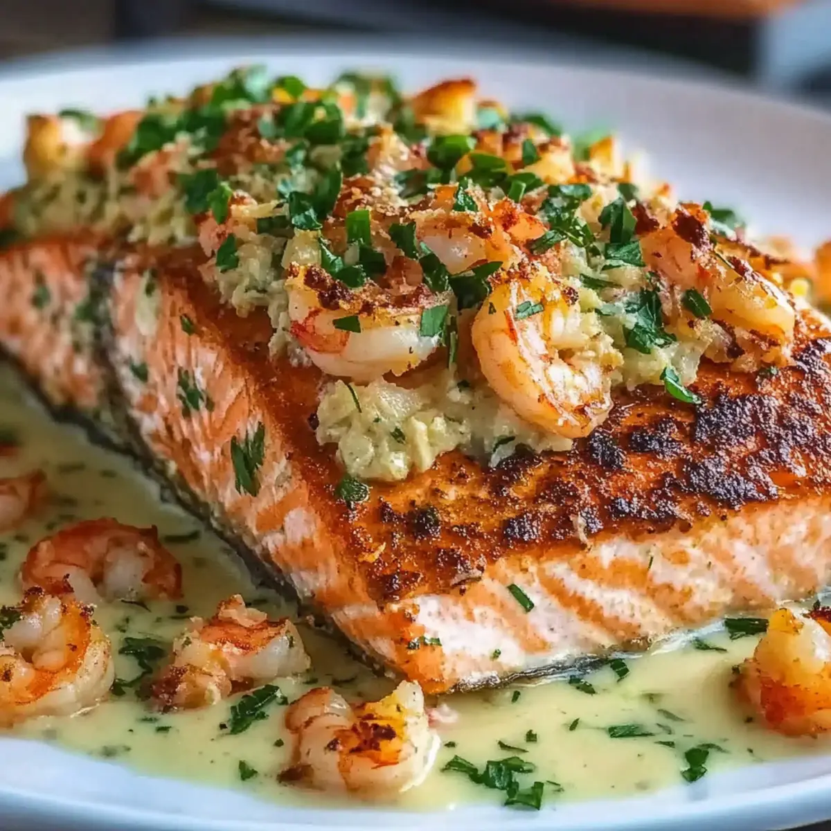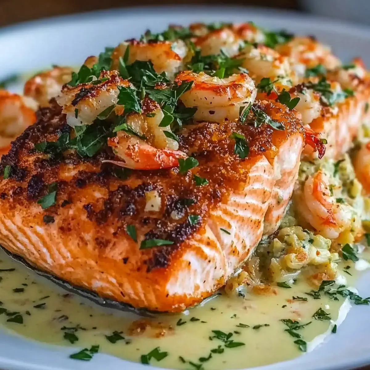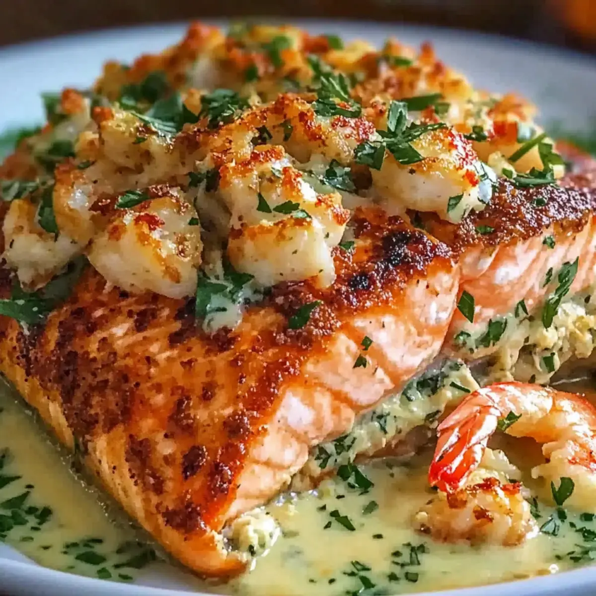 As I stood by the kitchen window, the sun dipped low, bathing my countertop in a golden hue, and I couldn’t help but think about the beauty of home-cooked meals. That’s when I decided to whip up my favorite Crab and Shrimp Stuffed Salmon. This dish brings together moist, flaky salmon fillets and a heavenly mix of sweet crab and tender shrimp, making it a go-to for impressing guests or treating the family. Its charm lies in how incredibly quick it is to prepare and clean up, all while filling your home with an inviting aroma that entices everyone to gather around the table. It’s a delightful blend of flavors that speaks comfort and sophistication in every bite. Curious how easy it is to elevate your dinner game with this recipe? Let’s dive in! Why Is This Salmon Recipe a Must-Try? Simplicity at its finest: This Crab and Shrimp Stuffed Salmon takes minimal prep time, making it perfect even on busy nights. Flavor explosion: The combination of sweet crab, tender shrimp, and zesty lemon creates a sumptuous and satisfying filling. One-pan wonder: Easy clean-up is guaranteed as everything cooks in one pan, perfect for carefree entertaining or family meals. Crowd-pleaser: Impress your guests or delight your family with this unique dish that feels gourmet but is so approachable. Versatile options: Add your twist; try a Mediterranean-style stuffing or an Asian-inspired flare for variety! This recipe can easily become the star of your meal rotation, alongside favorites like Baked Salmon Pasta or Cajun Salmon Lemon. Crab and Shrimp Stuffed Salmon Ingredients • To create your Crab and Shrimp Stuffed Salmon, gather these fresh ingredients for a delightful dish that shines at the dinner table. For the Salmon • Salmon Fillets – Use skinless, boneless thick fillets for maximum moisture and flavor. • Olive Oil – A touch of olive oil enhances the natural taste of the salmon fillets. • Sea Salt & Black Pepper – Essential to bring out the salmon’s rich, natural flavors. • Lemon – Zested and sliced to lend a refreshing acidity that balances the filling. For the Filling • Lump Crabmeat – The star of the show, this adds a sweet, delicate flavor; fresh or canned works well. • Cooked Shrimp – Chopped small to infuse robust flavor and appealing texture throughout the stuffing. • Cream Cheese – Use softened to bind everything together smoothly and effortlessly. • Fresh Breadcrumbs – Adds texture and absorbs moisture in the filling, making it delightful. • Green Onions – Offers a pop of flavor and vibrant color for an eye-catching dish. • Fresh Dill – Enhances everything with its fragrant, bright flavor; fresh is best! • Garlic Powder – Adds depth; feel free to swap in fresh garlic if that’s your preference. • Old Bay Seasoning – A classic pairing with crab that boosts flavor; Cajun or Italian seasoning can be great substitutes. For Baking • Butter – A brush of melted butter before baking adds richness to the dish. • White Wine – A splash enhances the overall flavor when finishing the dish. • Fresh Parsley – For garnish; it adds a final touch of freshness and a vibrant splash of color. Step‑by‑Step Instructions for Crab and Shrimp Stuffed Salmon Step 1: Prep the Salmon Start by preheating your oven to 375°F (190°C). While the oven heats, take the salmon fillets and gently cut pockets into each one, being careful not to slice all the way through. Season the salmon with sea salt, black pepper, and a sprinkle of lemon zest. Allow the seasoned fillets to rest while you prepare the stuffing. Step 2: Make the Stuffing In a large mixing bowl, combine the lump crabmeat, chopped cooked shrimp, softened cream cheese, fresh breadcrumbs, sliced green onions, and fresh dill. To enhance the flavor, sprinkle in garlic powder and Old Bay seasoning. Stir everything together until well mixed, ensuring the filling holds together nicely; this delightful mixture is what makes your Crab and Shrimp Stuffed Salmon shine. Step 3: Stuff the Salmon Take a spoonful of the crab and shrimp filling and gently stuff each salmon pocket with the mixture. Be careful not to overfill to avoid spillage during the baking process. Once filled, secure the openings with toothpicks to keep the stuffing intact. This step ensures that each bite is a perfect blend of flavors when you serve the Crab and Shrimp Stuffed Salmon. Step 4: Bake Now, prepare a baking dish by lightly greasing it with olive oil or spraying it with cooking spray. Place the stuffed salmon in the dish, and brush the tops with melted butter for added richness. Bake in the preheated oven for 18-22 minutes, or until the salmon flakes easily with a fork and reaches an internal temperature of 145°F (63°C). Enjoy the irresistible aroma filling your kitchen! Step 5: Finish and Serve Once your Crab and Shrimp Stuffed Salmon is done, remove it from the oven and let it rest for 5 minutes. Carefully take out the toothpicks, and garnish the dish with fresh parsley for a pop of color and freshness. It’s now ready to be served alongside salad or steamed vegetables, making for an impressive meal the whole family will love. Make Ahead Options These Crab and Shrimp Stuffed Salmon are perfect for busy home cooks who want a delicious meal without the last-minute rush! You can prepare the seafood stuffing up to 24 hours in advance; just mix the crabmeat, shrimp, cream cheese, breadcrumbs, and seasonings in a bowl, then cover and refrigerate it. Additionally, you can cut pockets in the salmon fillets and season them ahead of time. When you’re ready to bake, simply stuff the salmon with the prepared filling, brush with melted butter, and pop it in the oven for 18-22 minutes. This way, you’ll enjoy a flavorful, impressive dish that’s just as delicious, saving you valuable time on busy weeknights! Crab and Shrimp Stuffed Salmon Customizations Feel free to explore these flavorful twists to make this dish uniquely yours and del