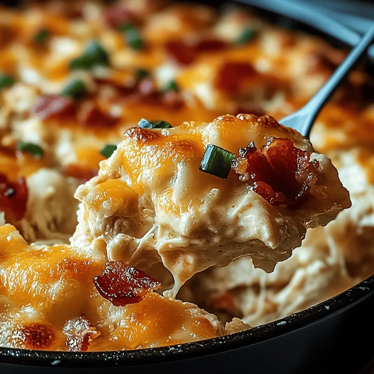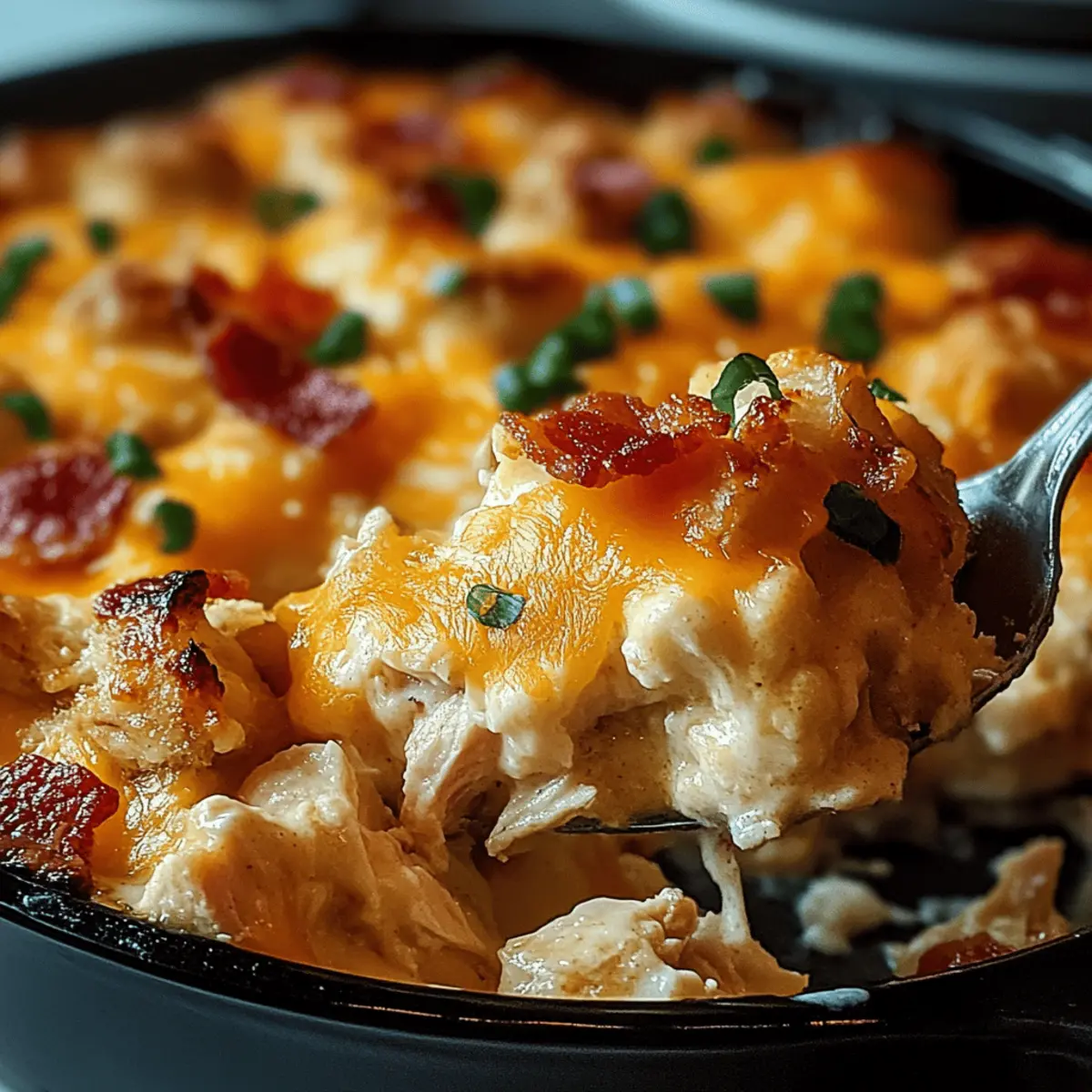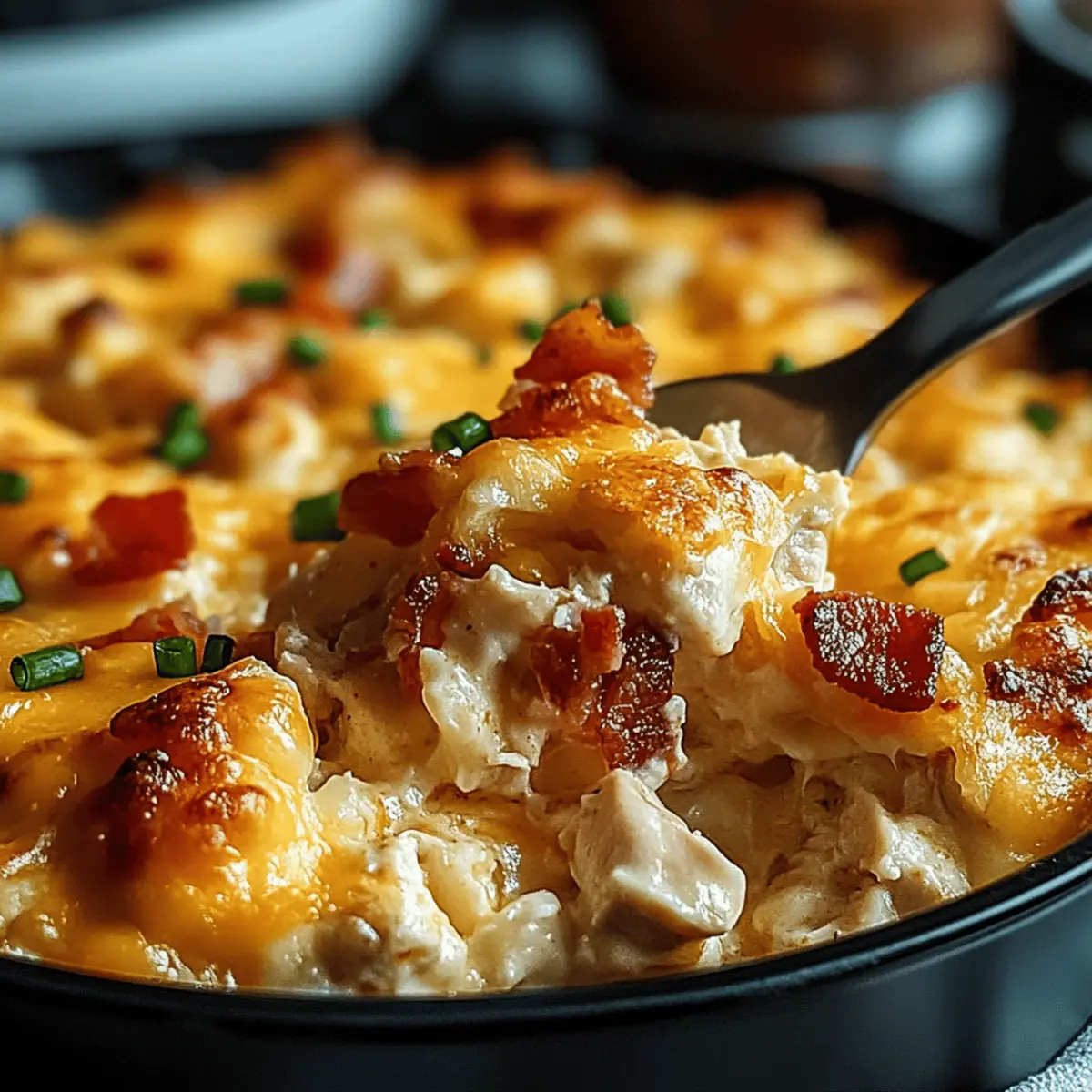 As I stood in my kitchen surrounded by the comforting aroma of melting cheese and sizzling bacon, I couldn’t help but feel a wave of happiness wash over me. This Creamy Crack Chicken Casserole has become my go-to dish for busy weeknights and cozy family gatherings alike. With its tender shredded chicken swimming in a rich, creamy sauce made with cream cheese and ranch seasoning, this casserole serves as the ultimate comfort food experience. Not only is it a breeze to prepare—with the option of using rotisserie chicken for an even quicker meal—but it’s also endlessly customizable to suit every family member’s taste. So, what will you add to make it your own? Why is this casserole a must-try? Unmatched Convenience: The use of rotisserie chicken makes this Crack Chicken Casserole a speedy dinner option, perfect for those hectic weekdays. Rich, Flavorful Layers: Creamy cream cheese and zesty ranch seasoning blend together flawlessly, while crispy bacon and melted cheddar elevate every bite. Customizable Delight: Tailor the recipe to your family’s preferences by adding your favorite veggies or switching cheeses—there’s a delicious twist for everyone! Crowd-Pleasing Recipe: Serve it at family gatherings, and watch it disappear; everyone loves the gooey, cheesy goodness. Plus, it holds up great for leftovers! For a different spin, check out our Hobo Casserole Ground or Hawaiian Chicken Sheet recipes for even more family-friendly meals! Crack Chicken Casserole Ingredients • Ready to bring comfort food to your table? For the Casserole Cooked Shredded Chicken – Provides the main protein and heartiness; you can save time by using rotisserie chicken. Cream Cheese (8 oz) – Adds a rich, creamy texture; make sure it’s at room temperature for easy mixing. Ranch Seasoning (1 oz packet) – Enhances flavor with a blend of herbs and spices; consider making your own for a personal touch. Shredded Cheddar Cheese (2 cups) – Contributes creamy flavors; try other cheeses like mozzarella for a new twist. Bacon Bits (1 cup) – Adds crunch and smokiness; for a lighter option, turkey bacon works well. Chopped Green Onions (1/2 cup) – Provides color and a mild onion flavor; substitute with chives if desired. Serving Suggestions Crusty Bread – Serve alongside warm crusty bread for a delightful meal experience. Side Salad – A light salad drizzled with vinaigrette complements the richness of the casserole perfectly. With these simple ingredients, your Crack Chicken Casserole will be ready to delight your family and friends! Step‑by‑Step Instructions for Crack Chicken Casserole Step 1: Preheat the Oven Begin by preheating your oven to 350°F (175°C). This step is crucial, as a preheated oven ensures your Crack Chicken Casserole cooks evenly. While the oven warms up, gather your ingredients and prepare the baking dish to keep everything flowing smoothly. Step 2: Mix the Cream Cheese and Seasoning In a mixing bowl, combine the softened cream cheese with the ranch seasoning packet. Using a hand mixer or a whisk, blend the mixture until it’s smooth and creamy, about 2-3 minutes. This rich base will bring flavor and creaminess to the casserole. Take a moment to enjoy the delightful aroma as you blend. Step 3: Combine the Chicken and Cheese Next, gently fold in the cooked shredded chicken, 1 cup of shredded cheddar cheese, and half of the bacon bits into the cream cheese mixture. Use a spatula to ensure all ingredients are well incorporated, creating a cohesive filling. This step will make your Crack Chicken Casserole irresistibly flavorful and hearty. Step 4: Prepare the Baking Dish Lightly grease a 9×13-inch baking dish with cooking spray or butter to prevent sticking. Once prepared, spread the chicken mixture evenly across the bottom of the dish. Use the spatula to smooth the top, creating an even layer that will cook uniformly in the oven, ensuring every bite is delicious. Step 5: Add the Toppings Sprinkle the remaining 1 cup of shredded cheddar cheese over the chicken mixture, followed by the rest of the bacon bits. This layer of cheese will melt beautifully while baking, adding rich flavor and a golden, bubbly top to your Crack Chicken Casserole. Make sure everything is evenly distributed for the best results. Step 6: Bake the Casserole Place the baking dish in your preheated oven and bake uncovered for 30-35 minutes. Keep an eye on the casserole; it should be bubbly and lightly golden on top when ready. This visual cue ensures that the flavors meld perfectly, creating a satisfying cheesy crust you won’t be able to resist. Step 7: Let It Cool and Serve Once baked, remove the casserole from the oven and allow it to cool for about 5-10 minutes before serving. This brief resting period helps set the flavors, making it easier to serve. For an extra touch, garnish with chopped green onions to add a pop of color and freshness to your delicious Crack Chicken Casserole. How to Store and Freeze Crack Chicken Casserole Fridge: Store leftovers in airtight containers for up to 3–4 days. This ensures the flavors stay fresh and delicious for your next meal. Freezer: If you’re planning ahead, this Crack Chicken Casserole can be frozen for up to 2 months before baking. Wrap it well to prevent freezer burn. Reheating: To enjoy your casserole again, reheat in the oven at 350°F (175°C) for about 20-25 minutes until heated through, or microwave individual portions for 2-3 minutes, checking for warmth. Make-Ahead Tip: Assembling the casserole a day in advance allows the flavors to meld beautifully. Just cover it tightly and refrigerate until you’re ready to bake! Expert Tips for Crack Chicken Casserole Seasoning Balance: Ensure your chicken is generously seasoned with salt, pepper, and your favorite spices to elevate the overall flavor of the Crack Chicken Casserole. Cheese Choices: Experiment with different cheeses like mozzarella or pepper jack for a unique twist, but stick to quality che