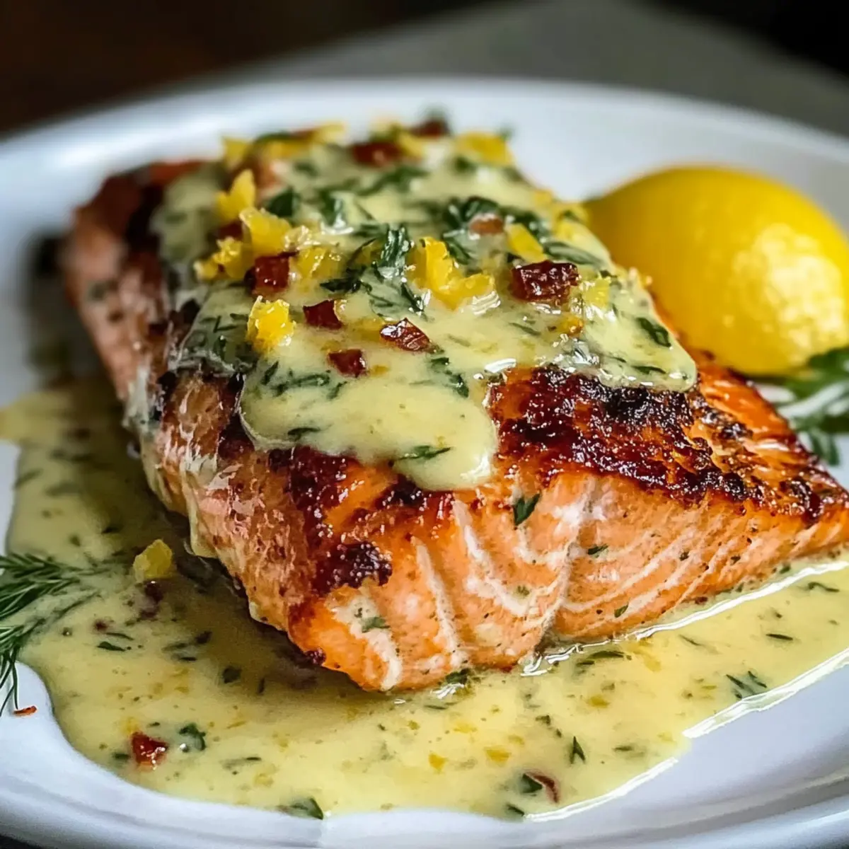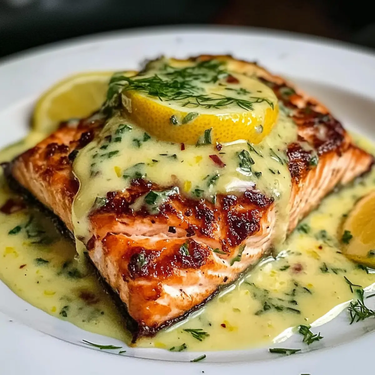 Facebook Twitter Pinterest LinkedInAs I stood in my kitchen, the scent of lemon and garlic wafted through the air, transforming an ordinary weeknight into something special. This Creamy Baked Salmon with Lemon Butter Sauce is all about celebrating the joy of cooking at home, delivering restaurant-quality elegance in under 30 minutes. Not only is it a crowd-pleaser that will impress your family and friends, but it also offers a delightful creamy texture that pairs perfectly with the bright zing of fresh lemon. Whether you’re treating yourself on a busy evening or hosting a gathering, this easy seafood dinner is your ticket to happiness in just one dish. Are you ready to elevate your dinner game with a recipe that feels fancy but comes together effortlessly? Why Is This Salmon Recipe Special? Effortless Preparation: This recipe comes together in under 30 minutes, perfect for busy weeknights or spontaneous gatherings. Luscious Creamy Sauce: The combination of cream cheese and rich butter creates a truly indulgent sauce that envelops the salmon in flavor. Versatile Option: Enjoy a delectable dairy-free adaptation by simply swapping cream cheese with olive oil or Greek yogurt, tailoring it to your dietary preferences. Crowd-Pleasing Delight: Impress your family and friends with restaurant-quality elegance without the fuss—everyone will be asking for seconds! Fresh Zing: The addition of lemon juice and zest brightens the dish, balancing the richness of the sauce and elevating your meal to new heights. Pair this dish with fresh sides like steamed vegetables or a crisp salad for a well-rounded dinner that’s sure to please. Whether you’re inspired by my recipe for Salmon Lemon Butter or feel like trying a lighter dish with Baked Salmon Lemon, you won’t be disappointed! Creamy Baked Salmon with Lemon Butter Sauce Ingredients For the Salmon • Salmon fillet – The main protein; pat dry to enhance sauce adherence. For the Creamy Sauce • Cream cheese – Adds creaminess; soften before blending for a smooth texture. • Butter – Contributes richness; substitute with olive oil for a dairy-free option. • Lemon juice and zest – Provide brightness; fresh lemon is ideal for best flavor. • Garlic – Adds aromatic depth; adjust quantity based on taste preferences. • Optional herbs (e.g., dill or parsley) – Enhances flavor and presentation; sprinkle according to preference. The ingredients for this Creamy Baked Salmon with Lemon Butter Sauce come together to create a dish that’s not only delicious but also exudes comfort and elegance, making it perfect for any occasion! Step‑by‑Step Instructions for Creamy Baked Salmon with Lemon Butter Sauce Step 1: Preheat the Oven Begin by preheating your oven to 375°F (190°C). This temperature is perfect for ensuring your salmon cooks evenly and thoroughly. Use an oven thermometer if you have one to guarantee accuracy, as a precise baking temperature is key for achieving that tender and succulent salmon. Step 2: Prepare the Salmon While the oven is heating, pat the salmon fillets dry with paper towels. This step ensures that the creamy sauce adheres beautifully to the salmon, enhancing the flavor. Next, place the salmon in a lightly greased baking dish, arranging it skin-side down for optimal cooking results. Step 3: Make the Creamy Sauce In a mixing bowl, combine softened cream cheese, fresh lemon juice, zest, melted butter, and minced garlic. Use a whisk or electric mixer to blend these ingredients together until you achieve a smooth, creamy consistency. This luscious mixture will ultimately envelop your salmon in flavor, providing that rich, indulgent experience. Step 4: Apply the Sauce Generously spread the creamy sauce over the salmon fillets, ensuring each piece is evenly covered. The creamy baked salmon with lemon butter sauce is what makes this dish irresistible, so don’t be shy! You want to create a thick coating that will melt into the fish and enhance its taste while baking. Step 5: Bake the Salmon Place the dish in the preheated oven and bake for 15–18 minutes. Keep an eye on it, and look for the salmon to flake easily with a fork when it’s done. This visual cue indicates that your fish has reached that perfect doneness level, ensuring a moist and flavorful bite in every morsel. Step 6: Broil for a Crispy Finish For an extra layer of flavor and texture, switch your oven to broil for an additional 1-2 minutes once the salmon is baked. Watch closely to prevent burning; this step adds a delightful crispy topping to your creamy baked salmon. When it’s perfectly golden, pull it out and prepare to impress! Step 7: Serve and Enjoy Using a spatula, carefully transfer the salmon to serving plates. Drizzle any remaining lemon butter sauce from the baking dish over the top for added richness. Garnish with optional fresh herbs for a pop of color, and serve with your favorite sides like steamed vegetables or a salad, making this creamy baked salmon truly shine! What to Serve with Creamy Baked Salmon with Lemon Butter Sauce Enhance the dining experience with delightful sides that complement the rich and creamy salmon. Buttery Mashed Potatoes: The smooth and creamy texture of mashed potatoes perfectly contrasts the flaky salmon, creating a comfort food classic. A drizzle of lemon butter sauce over the potatoes adds an extra zing! Garlic Roasted Asparagus: Tender, roasted asparagus provide a fresh and crunchy contrast to the creamy sauce, brightening the plate with vibrant color and flavor. Their slight char enhances the overall dining experience. Crisp Garden Salad: A refreshing mix of greens and cherry tomatoes tossed in a light vinaigrette balances the richness of the salmon. The crunchy textures and bright flavors make each bite a delight. Quinoa Pilaf: Fluffy quinoa cooked with herbs offers a nutty flavor and excellent texture, serving as a nutritious base to soak up the luscious sauce from the salmon. It’s a wholesome side op