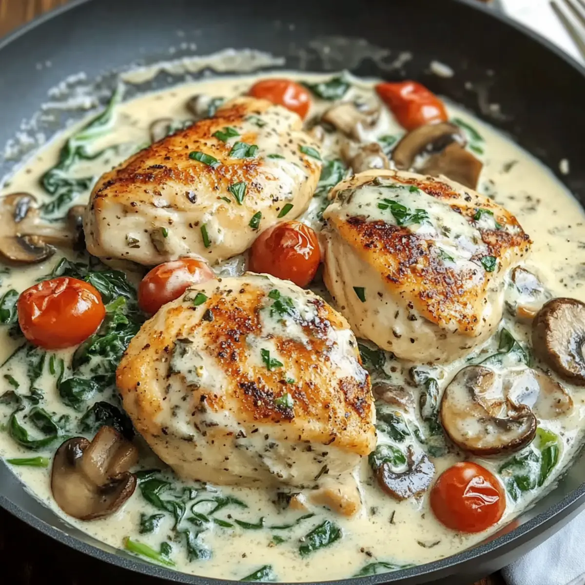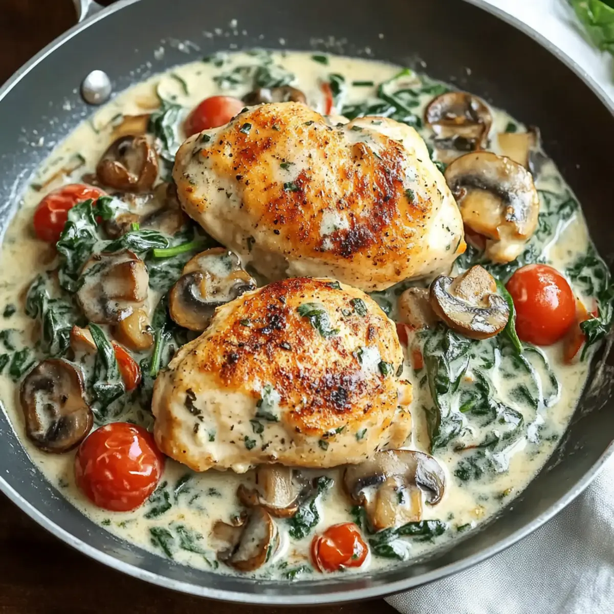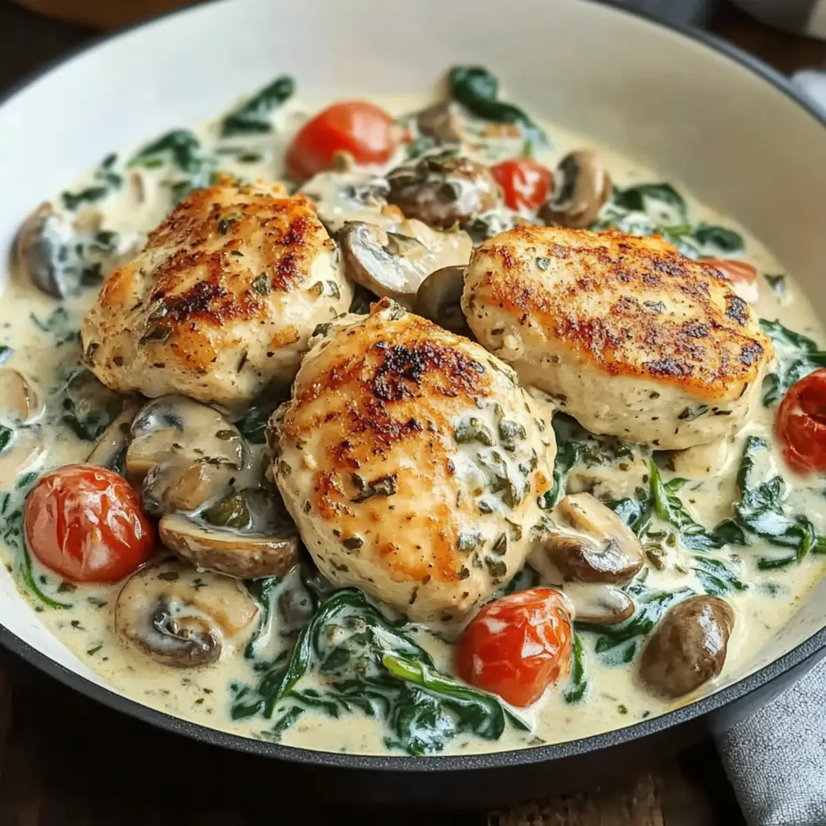 Facebook Twitter Pinterest LinkedInAs the aroma of sizzling garlic fills my kitchen, I can’t help but smile at the simplicity of cooking a delicious meal. This Creamy Mediterranean Chicken Skillet is a delightful escape, whisking you away to sunny shores with each bite. With its easy one-pan preparation, this dish is a lifesaver for busy weeknights, and the creamy sauce makes it feel indulgent without all the fuss. Juicy chicken meets vibrant veggies like bell peppers and spinach, creating a harmony of flavors that’s both comforting and satisfying. Plus, it’s freezer-friendly, making leftovers something to look forward to! Are you ready to bring some Mediterranean magic into your dinner routine? Why Is This Recipe So Satisfying? Simplicity at Its Best: Preparing this Creamy Mediterranean Chicken Skillet requires minimal effort, using just one pan to create a quick meal. Rich, Creamy Sauce: The combination of heavy cream and Parmesan envelops the chicken, providing a luxurious taste that feels gourmet yet homey. Vibrant Veggies: Spinach and bell peppers not only add color but also pack a nutritious punch. Freezer-Friendly: Leftovers can be easily stored, allowing you to enjoy this meal again—perfect for meal prep enthusiasts! Crowd-Pleasing Flavor: This dish appeals to all ages and tastes. Pair it with Chicken Alfredo Pasta or Buffalo Chicken Mac for a full Mediterranean feast. With every bite, you’ll experience a medley of flavors and comfort that can elevate any dinner table. Get ready to impress family and friends with this delightful dish! Creamy Mediterranean Chicken Skillet Ingredients For the Skillet Olive Oil – A healthy base for cooking; rich in flavor. You can substitute it with canola oil or butter if necessary. Chicken Breasts – Provides the main protein; substituting with boneless, skinless chicken thighs keeps the dish juicy. Mushrooms – Adds an earthy flavor; cremini is preferred but white, shiitake, or portobello work well too. Heavy Cream – Gives the sauce its richness; for a lighter option, use half-and-half or coconut cream. Capers – Offers a briny kick; substitute with chopped green olives or omit for a splash of lemony freshness. Garlic – Enhances overall flavor; be sure to sauté until fragrant but avoid burning. Cherry Tomatoes – Adds sweetness and acidity; cook until softened for the best flavor. Spinach – Introduces a fresh element; wilting it in the skillet brings out its vibrant color. For the Sauce Chicken Broth – Adds depth to the sauce; use low-sodium broth to control the saltiness. Parmesan Cheese – Mix in for added creaminess and flavor; freshly grated will melt beautifully into the sauce. With these key ingredients, your Creamy Mediterranean Chicken Skillet will be a comforting dish that’s both easy to prepare and bursting with Mediterranean flavors! Step‑by‑Step Instructions for Creamy Mediterranean Chicken Skillet Step 1: Heat the Oil In a large skillet, heat 2 tablespoons of olive oil over medium-high heat. Allow the oil to shimmer, which indicates it’s hot enough. This will serve as the flavorful base for your Creamy Mediterranean Chicken Skillet. Step 2: Cook the Chicken Season 1 pound of chicken breasts or thighs with salt, pepper, and oregano. Add the chicken to the hot skillet and cook for 5-7 minutes on each side until golden brown and an internal temperature of 165°F is reached. Once cooked, carefully remove the chicken and set aside on a plate. Step 3: Sauté the Mushrooms In the same skillet, add the sliced mushrooms and sauté for 4-5 minutes, stirring occasionally until they become tender and release their juices. The mushrooms should be nicely browned, contributing rich flavors to the dish. Step 4: Add Garlic Add 3 cloves of minced garlic to the skillet with the mushrooms and cook for about 1 minute until fragrant. Be attentive and stir to prevent any burning, as you want the garlic to enhance the overall flavor of your Creamy Mediterranean Chicken Skillet. Step 5: Incorporate Tomatoes and Spinach Toss in 1 cup of halved cherry tomatoes and 2 cups of fresh spinach. Cook for 2-3 minutes, stirring gently until the spinach wilts and the tomatoes soften. This step brings vibrant color and freshness to your dish. Step 6: Create the Sauce Pour in 1 cup of heavy cream and 1/2 cup of chicken broth, stirring well to combine all the ingredients in the skillet. Allow the mixture to come to a gentle simmer over medium heat, which will help develop the sauce’s flavors. Step 7: Thicken the Sauce Mix in 1/2 cup of grated Parmesan cheese, stirring until melted and well incorporated into the sauce. Let it simmer for 3-5 minutes, allowing the creamy sauce to thicken and coat the back of a spoon beautifully. Step 8: Return the Chicken Place the cooked chicken back into the skillet and spoon the creamy sauce over the top. Warm through on medium heat for about 2 minutes, allowing the chicken to absorb some of the delicious flavors of the sauce. Step 9: Garnish and Serve Once everything is heated through, garnish your Creamy Mediterranean Chicken Skillet with fresh chopped parsley and crushed red pepper flakes if desired. Serve warm, perhaps over rice or pasta, to soak up the rich sauce and enjoy a satisfying meal. Storage Tips for Creamy Mediterranean Chicken Skillet Fridge: Store leftovers in an airtight container for up to 3 days, ensuring you can enjoy this delicious Creamy Mediterranean Chicken Skillet later. Freezer: Seal portions in freezer-safe bags, keeping them airtight, and freeze for up to 3 months. Thaw overnight in the fridge before reheating. Reheating: Gently reheat on the stove over low to medium heat, adding a splash of chicken broth or cream if the sauce thickens too much. Avoid Room Temperature: Do not leave leftovers at room temperature for more than 2 hours; refrigerating promptly helps maintain freshness and safety. Make Ahead Options Preparing the Creamy Mediterranean Chicken Skillet ahead of time i