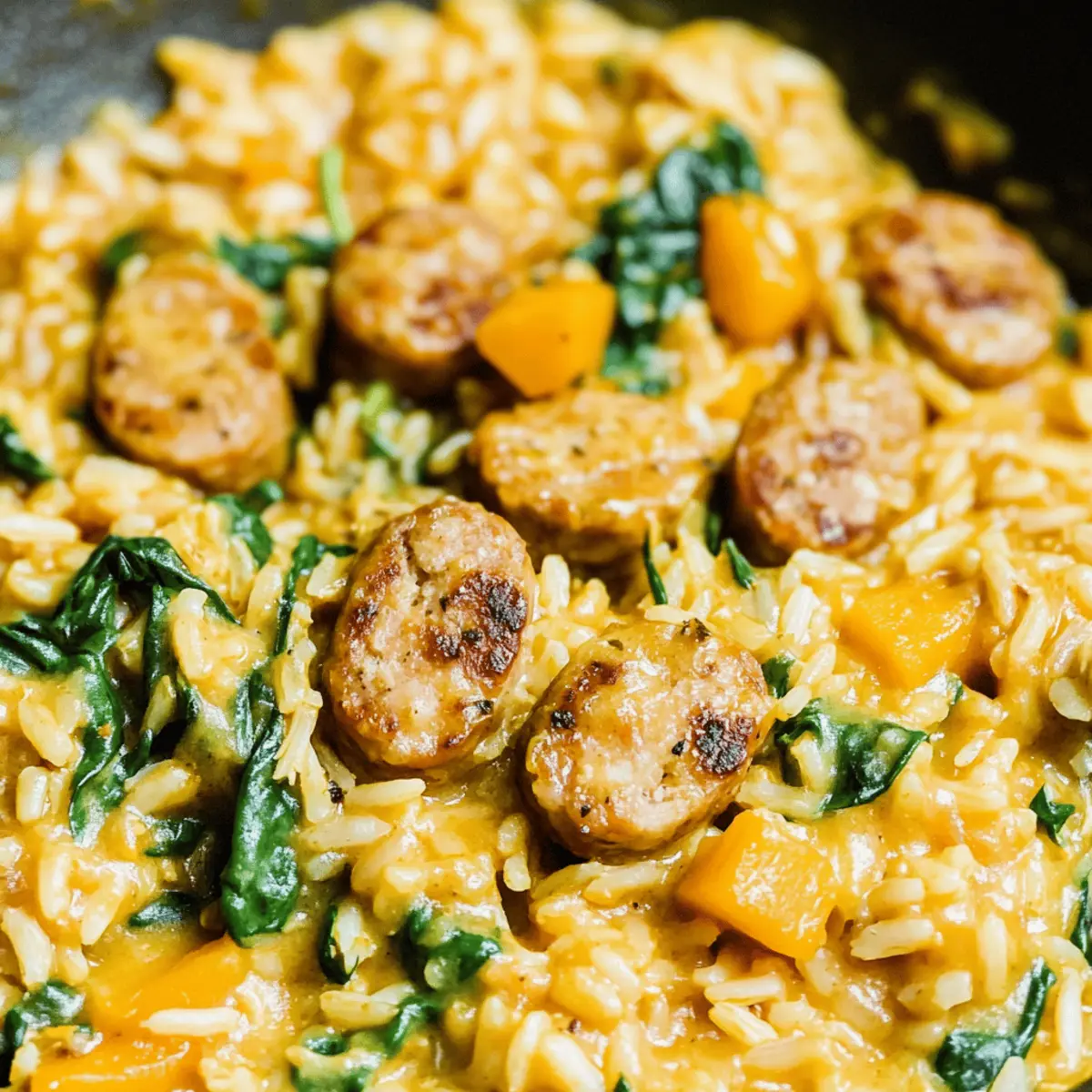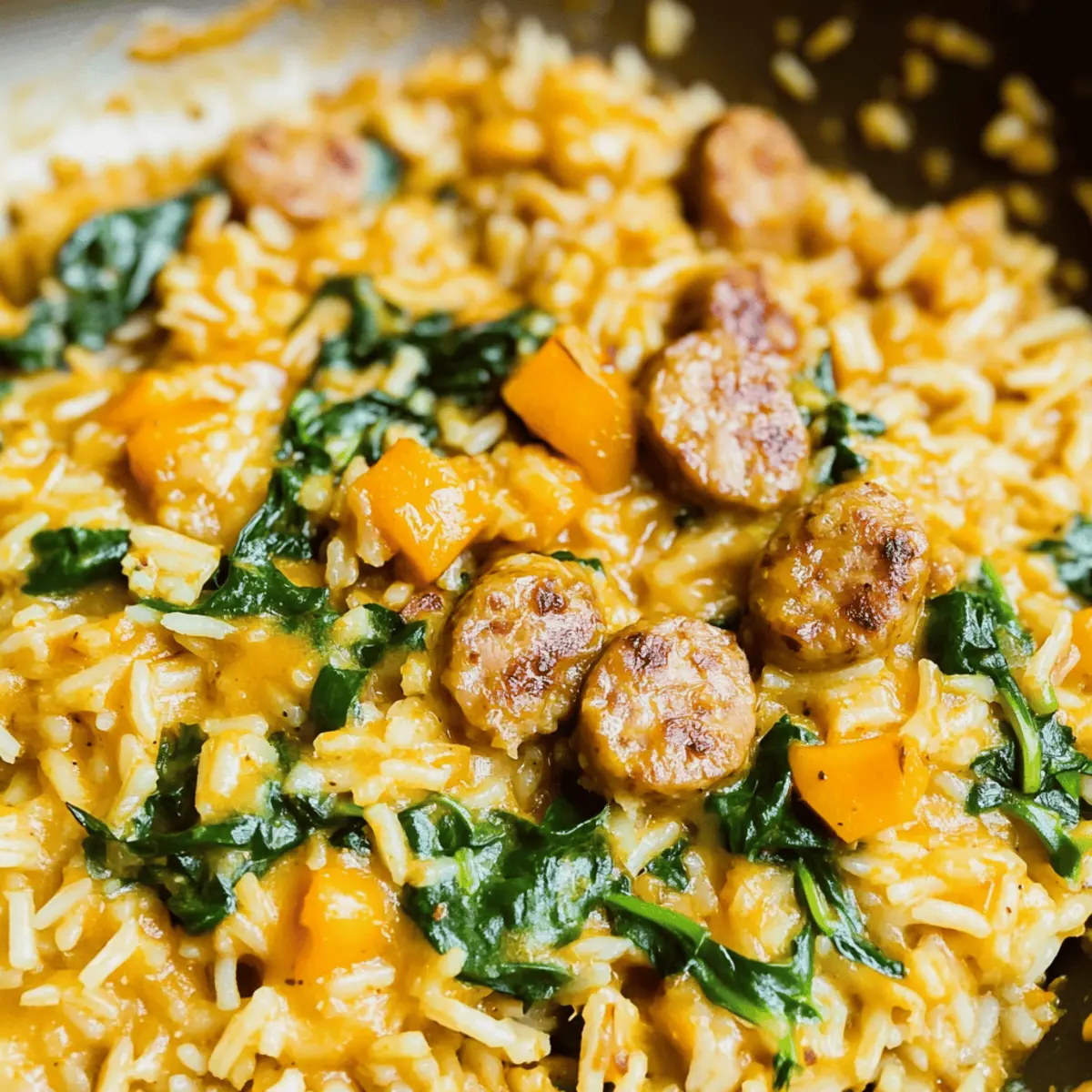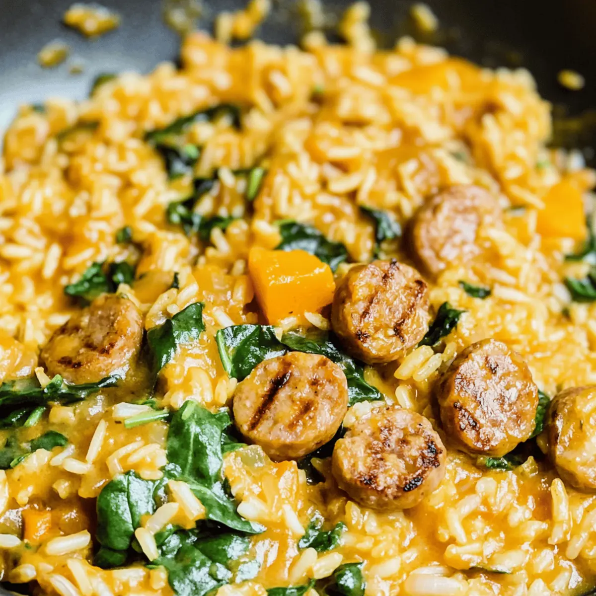 As I stood in my kitchen, navigating the delightful chaos of pots and pans, a comforting aroma enveloped me—nothing beats the promise of a creamy One Pot Chicken Sausage and Rice simmering on the stove. With its hearty blend of flavors and the added nutrition of butternut squash, this dish is the perfect solution for a healthy weeknight meal. Prepped in just under an hour, it requires minimal cleanup, giving you more time to relax after a long day. I love how the creamy rice harmonizes with the savory chicken sausage, creating a satisfying dish that marks the end of fast food dinners. Why stick to takeout when you can whip up this scrumptious meal in no time? Are you ready to dive into the flavors of this easy one-pot wonder? Why is This Recipe a Must-Try? Simplicity at its core: This recipe combines all ingredients in one pot, minimizing the cleanup. Flavor-packed goodness: The creamy rice and savory chicken sausage create an irresistible taste that will have everyone coming back for seconds. Healthy twist with butternut squash: This dish adds nutrition without sacrificing flavor, ensuring you still enjoy comfort food guilt-free. Time-saving delight: Ready in under an hour, it’s perfect for busy weeknights when you want something wholesome without the hassle. Crowd-pleaser guaranteed: Whether you’re cooking for yourself or guests, this meal appeals to all, leaving no leftovers behind! Pair it with a simple salad for a complete meal or check out my recipes for Honey BBQ Chicken or One Pot Smoked for more weeknight inspiration! Creamy One Pot Chicken Sausage and Rice Ingredients • Dive into this cozy dish with a delightful mix of flavors! For the Creamy Base Chicken and Apple Sausage – Adds a rich protein and zesty flavor that elevates the dish. Cubed Butternut Squash – Provides a creamy texture and nutritious boost; sweet potatoes work well as a substitute. Chicken Broth – Acts as the key cooking liquid, enhancing flavors; opt for low-sodium options for a healthier meal. Uncooked Basmati Rice – Absorbs all the savory goodness; jasmine rice can be an excellent alternative. For the Freshness Baby Spinach – A simple way to add greens and nutrients; swap with kale or Swiss chard if you prefer. For Sautéing Sweet Onion, Diced – Offers a hint of sweetness and depth; yellow onion can be used in a pinch. Garlic, Minced (2-4 cloves) – Brings aromatic flavor to the melody; if fresh isn’t on hand, garlic powder will do. Olive Oil – Essential for sautéing; feel free to substitute with avocado oil if you like. Seasoning Essentials Salt (1 tsp) and Black Pepper (½ tsp) – The foundation of flavor; adjust to your taste preferences. With these Creamy One Pot Chicken Sausage and Rice ingredients, you’re well on your way to creating a warm, satisfying meal that will sweep away any remnants of fast food! Step‑by‑Step Instructions for Creamy One Pot Chicken Sausage and Rice Step 1: Sauté the Sausage In a large pot or Dutch oven, heat 1 tablespoon of olive oil over medium heat. Thinly slice the chicken sausage and add it to the pot, sautéing for about 5-7 minutes until it’s golden brown and fragrant. Stir occasionally to ensure even cooking, then remove the sausage from the pot and set it aside on a plate. Step 2: Cook the Vegetables In the same pot, heat another tablespoon of olive oil over medium heat. Add the cubed butternut squash, diced onion, minced garlic, salt, and pepper. Cover and cook for 10-15 minutes, stirring occasionally, until the squash is fork-tender and the onions are softened, creating a luscious base for your creamy One Pot Chicken Sausage and Rice. Step 3: Create the Creamy Base Next, pour in 3 cups of chicken broth and bring the mixture to a gentle simmer. Using an immersion blender, puree the contents directly in the pot until you achieve a creamy, smooth consistency. If you don’t have an immersion blender, carefully transfer the mixture to a traditional blender, purée, and then return it to the pot. Step 4: Add the Rice and Sausage Stir in 1 cup of uncooked basmati rice and the sautéed chicken sausage. Ensure everything is well mixed and covered with the creamy base. Cover the pot and reduce the heat to low, letting it simmer for approximately 20 minutes, or until the rice is tender and has absorbed the flavors beautifully. Step 5: Fold in the Spinach Once the rice is cooked, fold in 2 cups of baby spinach until it wilts and brightens the dish’s color. Allow it to heat through for another minute or two. This final touch not only elevates your creamy One Pot Chicken Sausage and Rice but also adds a pop of fresh flavor and nutrients. Step 6: Serve and Enjoy Once everything is well combined and heated through, remove from heat. Scoop generous portions of your creamy One Pot Chicken Sausage and Rice into bowls, and enjoy it hot. This hearty meal is perfect for cozy weeknight dinners, freeing you from the temptation of fast food! Creamy One Pot Chicken Sausage and Rice Variations Feel free to customize this delicious dish to fit your preferences and dietary needs! Turkey Sausage: Swap out chicken sausage for turkey sausage for a leaner option without losing flavor. It’s a satisfying alternative that’ll still deliver that savory kick. Plant-Based Sausage: For a vegan twist, use your favorite plant-based sausage. This option retains the delicious taste while keeping it entirely meat-free! Sweet Potatoes: Replace butternut squash with sweet potatoes for a sweeter profile that adds a different layer of nutrition and flavor—wonderful for those chilly nights! Extra Veggies: Toss in diced bell peppers or peas for added texture and color. They brighten the dish and provide a fresh burst of flavor, perfect for veggie lovers. Spicy Kick: If you’re a fan of heat, sprinkle in some red pepper flakes or diced jalapeños while cooking! This will transform the dish into a zesty fiesta that will wake up your palate. Creamy Coconut Substitute: For a dai