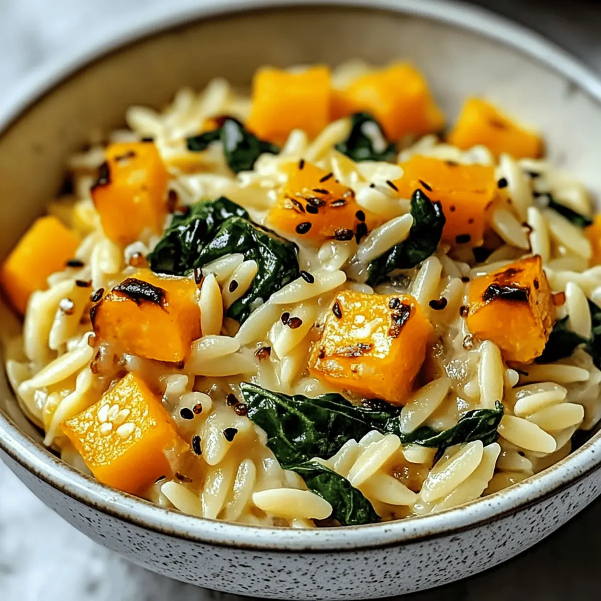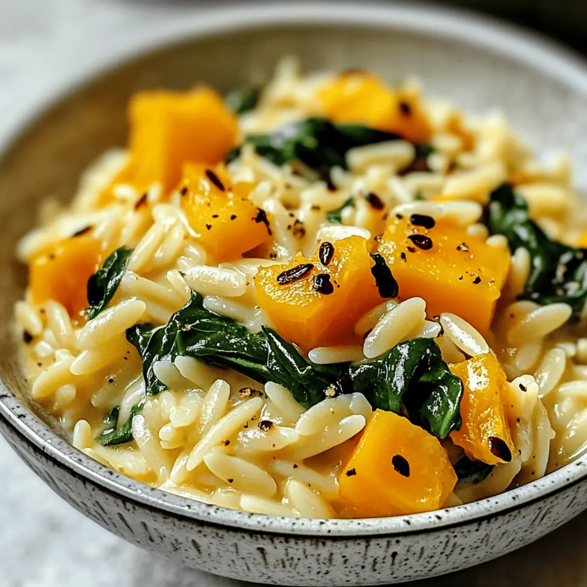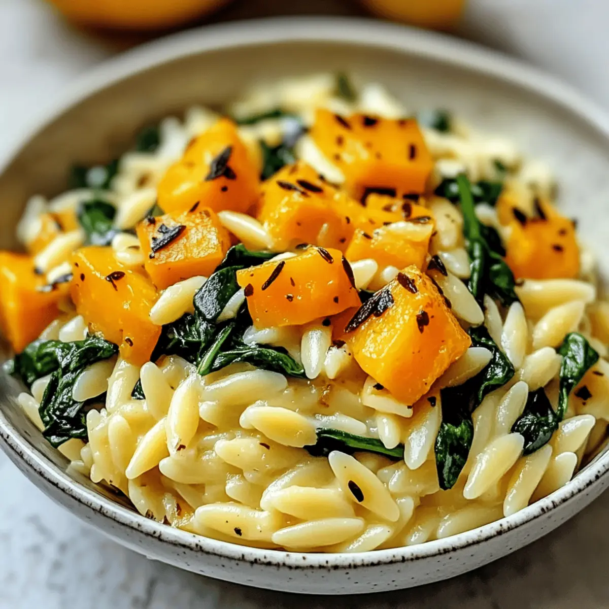 As I stirred the pot, the tantalizing aroma of roasted butternut squash wafted through my kitchen, instantly transporting me to autumn harvest festivals. This Creamy Orzo with Roasted Butternut Squash and Spinach combines the warmth of comfort food with the ease of an easy weeknight meal, beckoning everyone to the table. The creamy orzo envelops tender, caramelized squash and vibrant spinach, creating a dish that is not only delicious but also wallet-friendly and customizable to suit your pantry. Whether you’re enjoying a quiet dinner at home or impressing friends at a charming gathering, this dish is sure to steal the show. Curious to see how to create this delightful meal? Let’s dive into the recipe! Why is this creamy orzo a must-try? Comforting and Wholesome: Indulge in a dish that warmly hugs your taste buds, thanks to the sweetness of roasted butternut squash and the creaminess of orzo. Versatile Ingredients: Easily customize your meal by swapping in seasonal veggies or adding protein like chickpeas for a hearty twist. Simple Preparation: With just a few straightforward steps, this recipe is perfect for busy weeknights when you crave a home-cooked meal without the fuss. Crowd-Pleasing Appeal: Whether it’s a cozy family dinner or a friendly gathering, the vibrant colors and rich flavors of this dish are bound to impress! You might also appreciate serving it alongside a refreshing side salad or crusty bread to soak up the creamy goodness. Enjoy every delightful spoonful! Creamy Orzo with Roasted Butternut Squash and Spinach Ingredients For the Roasted Squash • Butternut Squash – Adds sweetness and depth; substitute with zucchini or bell peppers for variation. • Olive Oil – Essential for roasting and flavor; can replace with avocado oil for a higher smoke point. • Salt & Black Pepper – Essential for seasoning; adjust to taste. For the Orzo • Orzo Pasta – Provides a hearty, creamy texture; substitute with small pasta shapes like ditalini or rice if needed. • Vegetable Broth – Infuses flavor into the dish; use water for a lighter option. • Butter – Adds richness and flavor; omit for a vegan version or replace with plant-based butter. • Garlic – Adds aromatic flavor; fresh minced garlic is preferred, but garlic powder can work in a pinch. For Creaminess • Parmesan Cheese – Creates creaminess and umami; substitute with nutritional yeast for a vegan option. • Heavy Cream – For a luxurious texture; use cream cheese for a richer consistency or plant-based cream for a lighter alternative. • Baby Spinach – Adds a fresh, vibrant element; substitutable with kale or Swiss chard. For Flavor Enhancement • Dried Thyme – Optional herb for added flavor; omit or replace with fresh thyme for a more intense herbal note. • Red Pepper Flakes – Optional for a hint of heat; omit for a milder dish. This Creamy Orzo with Roasted Butternut Squash and Spinach is not only delicious but also adaptable to your unique tastes! Step‑by‑Step Instructions for Creamy Orzo with Roasted Butternut Squash and Spinach Step 1: Roast the Butternut Squash Preheat your oven to 400°F (200°C). Cube the butternut squash and toss it in a mixing bowl with olive oil, salt, and pepper until evenly coated. Spread the squash in a single layer on a baking sheet and roast for 25-30 minutes, flipping halfway through, until golden brown and tender. The squash should caramelize nicely, filling your kitchen with a wonderful aroma. Step 2: Cook the Orzo In a medium saucepan, melt 2 tablespoons of butter over medium heat. Add minced garlic and sauté for about 1 minute until fragrant but not browned. Stir in 1 cup of orzo pasta and toast for about 2 minutes, stirring constantly. This step enhances the flavor of the orzo, giving it a lovely nuttiness before you add the broth. Step 3: Add Broth Pour in 4 cups of vegetable broth and bring the mixture to a gentle simmer. Cook the orzo uncovered for 10-12 minutes, stirring occasionally. Keep an eye on it, as the orzo should absorb the broth and become al dente. If needed, add a splash more broth or water if it becomes too thick or dry. Step 4: Make It Creamy Once the orzo is tender, reduce the heat to low and stir in 1 cup of grated Parmesan cheese and ½ cup of heavy cream. Integrate until the mixture turns luxurious and creamy. Add 4 cups of fresh baby spinach, stirring constantly until the spinach wilts down, approximately 1-2 minutes. This is where the dish transforms into a beautifully creamy orzo with roasted butternut squash and spinach. Step 5: Incorporate Squash Carefully fold in the roasted butternut squash from Step 1 into the creamy orzo mixture. Gently mix until everything is combined. Taste and adjust the seasonings with additional salt, pepper, or red pepper flakes for a bit of heat if you like. The creamy orzo should now be beautifully enhanced by the sweetness of the roasted squash. Step 6: Serve Warm Remove the pan from heat and allow the dish to sit for a minute to thicken slightly. Spoon the creamy orzo with roasted butternut squash and spinach into bowls. Garnish with extra Parmesan and a drizzle of olive oil, if desired. Serve immediately to enjoy this comforting, hearty dish at its best! Make Ahead Options These Creamy Orzo with Roasted Butternut Squash and Spinach are perfect for meal prep enthusiasts! You can roast the butternut squash and cook the orzo up to 24 hours in advance, allowing for quick assembly during your busy week. Simply store the roasted squash and cooked orzo in airtight containers in the refrigerator. To maintain freshness and flavor, make sure to keep them separate. When you’re ready to serve, combine them in a saucepan with the remaining ingredients, adding the spinach and creamy elements, and warm it gently over low heat for about 5 minutes. This technique ensures your dish will be just as delicious as if you had made it fresh! Creamy Orzo Variations & Substitutions Feel free to make this cream