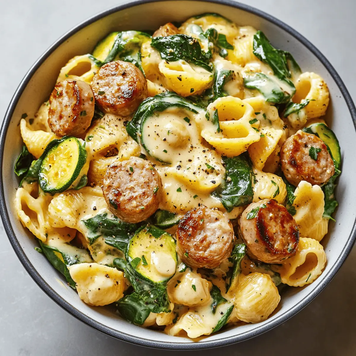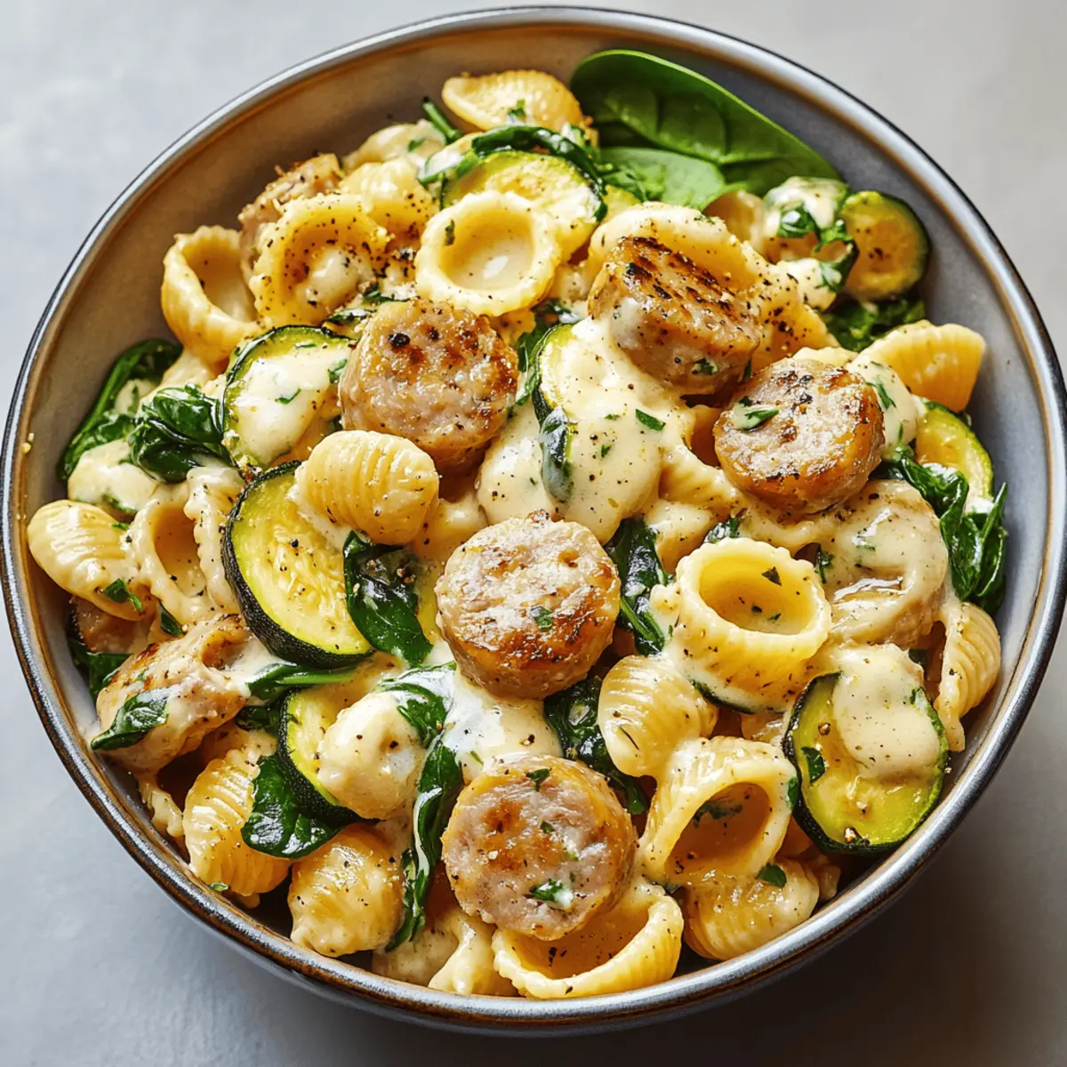 In just 15 minutes, I can turn dinner plans into a creamy delight that everyone will rave about. This Creamy Protein-Packed Pasta Bowl is not only a lifesaver for busy weeknights; it’s the cozy hug your cravings have been yearning for. Satisfy your hunger and fuel your body with a dish that combines al dente shells, juicy chicken sausage, and vibrant vegetables—all enveloped in a luxurious sauce. With over 30 grams of protein per serving, you won’t have to compromise on nutrition while enjoying comfort food. Plus, it’s incredibly versatile, making it easy to swap in your favorite ingredients for a personalized touch. Who’s ready to dive into this pasta paradise and make weeknight cooking a breeze? Why is this pasta bowl a must-try? Quick and Easy: In just 15 minutes, you can whip up this satisfying dish, perfect for busy weeknights! Protein-Packed: With over 30 grams of protein, it’s a nourishing option that keeps you energized. Comfort Food Redefined: Enjoy a creamy, savory sauce that brings warmth and satisfaction to the table. Versatile & Adaptable: Swap the chicken sausage for Cajun Sausage Pasta or mix in different veggies to make it your own! Meal Prep Friendly: Store ingredients separately for quick reheating, making it perfect for meal prepping. Crowd-Pleasing: This pasta bowl is sure to impress family and friends, turning any meal into a memorable feast! Creamy Protein-Packed Pasta Bowl Ingredients For the Pasta • Cooked Shell Pasta – Provides the base of the dish, offering a hearty texture. Substitute with any preferred pasta shape. For the Protein • Applegate Chicken Sausage – Adds protein and savory flavors; can be replaced with turkey sausage or veggie sausage for a lighter option. For the Veggies • Zucchini – Introduces freshness and crunch; use summer squash as an alternative. • Fresh Spinach – Offers nutrition and color; frozen spinach can be used; adjust quantity to avoid sogginess. For the Sauce • Light Cream Cheese or Alfredo Sauce – Creates the creamy sauce; alternate with Greek yogurt for a lighter option. For Seasoning • Salt & Pepper – Enhances flavors; adjust to personal taste preference. For Sautéing • Olive Oil Spray or Olive Oil – Used for sautéing vegetables; use a non-stick pan to minimize oil usage. Step‑by‑Step Instructions for Creamy Protein-Packed Pasta Bowl Step 1: Cook the Pasta Begin by bringing a large pot of salted water to a boil. Add the cooked shell pasta and cook according to package directions, typically around 8–10 minutes for al dente. Once done, drain the pasta in a colander and set aside. Keep a small cup of pasta water to adjust the sauce later if needed. Step 2: Sauté the Vegetables In a non-stick skillet, heat a drizzle of olive oil over medium heat. Once hot, add the zucchini and sauté for about 3–4 minutes until it turns golden brown. Next, toss in the fresh spinach, cooking for an additional 1–2 minutes until wilted and vibrant. This colorful mix will enhance the Creamy Protein-Packed Pasta Bowl. Step 3: Add the Chicken Sausage Introduce the sliced Applegate chicken sausage to the skillet with the sautéed vegetables. Cook for around 3–5 minutes until the sausage is heated through and slightly browned, allowing its savory flavors to meld with the veggies. Stir occasionally to ensure even cooking, creating a delicious filling for your pasta bowl. Step 4: Combine & Cream It Up Reduce the heat to low and stir in the cooked pasta along with your choice of light cream cheese or Alfredo sauce. Mix gently for about 2–3 minutes until everything is well combined and the pasta is luxuriously coated in the creamy sauce. If you prefer a thinner sauce, add a splash of the reserved pasta water until reaching the desired consistency. Step 5: Season & Serve Finally, season the Creamy Protein-Packed Pasta Bowl with salt and pepper to taste. Give it a good stir, ensuring even distribution of flavors. Serve warm, optionally garnished with fresh herbs or a sprinkle of cheese, and enjoy a comforting meal that’s both nourishing and delightful. Make Ahead Options These Creamy Protein-Packed Pasta Bowls are perfect for meal prep, saving you time on busy weeknights! You can cook and store the pasta, zucchini, and chicken sausage separately up to 3 days in advance; just refrigerate them in airtight containers to maintain their quality. For the creamy sauce, simply mix the light cream cheese or Alfredo sauce with the pasta when you’re ready to serve. Avoid adding fresh spinach until you’re ready to eat to keep it vibrant and crisp. When it’s time to enjoy your meal, gently combine everything in a skillet over low heat, and you’ll have a delicious dinner on the table in no time! Storage Tips for Creamy Protein-Packed Pasta Bowl Fridge: Store the cooked pasta, sausage, and sauce separately in airtight containers for up to 3 days. This keeps flavors vibrant and prevents sogginess. Freezer: For longer storage, freeze individual components, like the sauce or sausage, in airtight bags or containers for up to 3 months. Reheating: To reheat, simply warm up in the microwave or on the stove over low heat, adding a splash of water or broth to keep the sauce creamy. Fresh Spinach: Add fresh spinach only when serving, as it wilts quickly. If using frozen, reheat gently with the other ingredients in your Creamy Protein-Packed Pasta Bowl. Expert Tips for Creamy Protein-Packed Pasta Bowl • Creamy Sauce Control: Keep the heat low when incorporating cream cheese to prevent the sauce from breaking. If it does, whisk in a little cold water or milk to rescue it. • Perfect Pasta: Avoid overcooking the shell pasta; al dente is key for that delightful bite. Remember, it will continue cooking slightly after draining. • Freshness Matters: Add fresh spinach just before serving for the best texture and flavor. If using frozen, ensure it’s fully thawed and drained to avoid sogginess in your Creamy Protein-Packed Pas