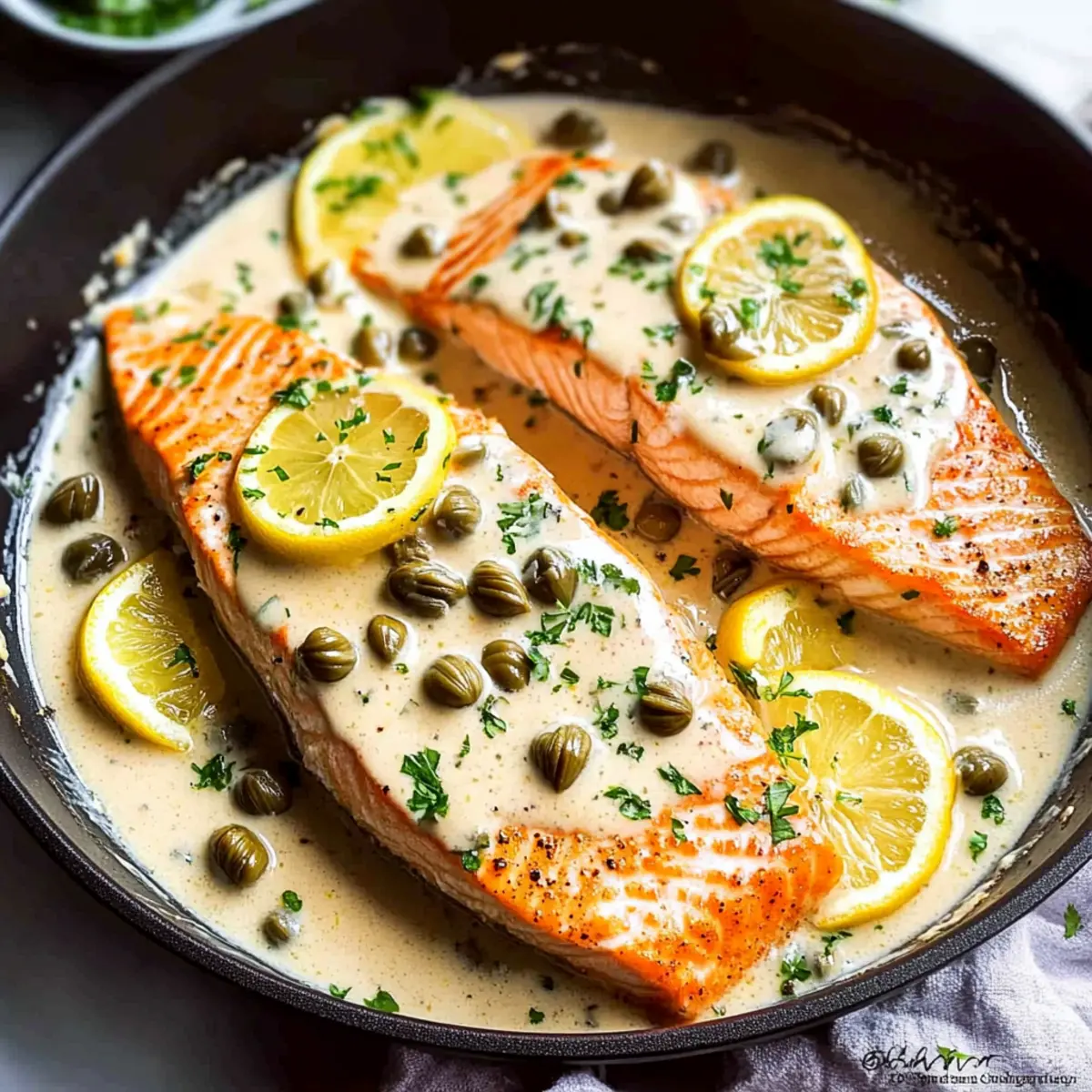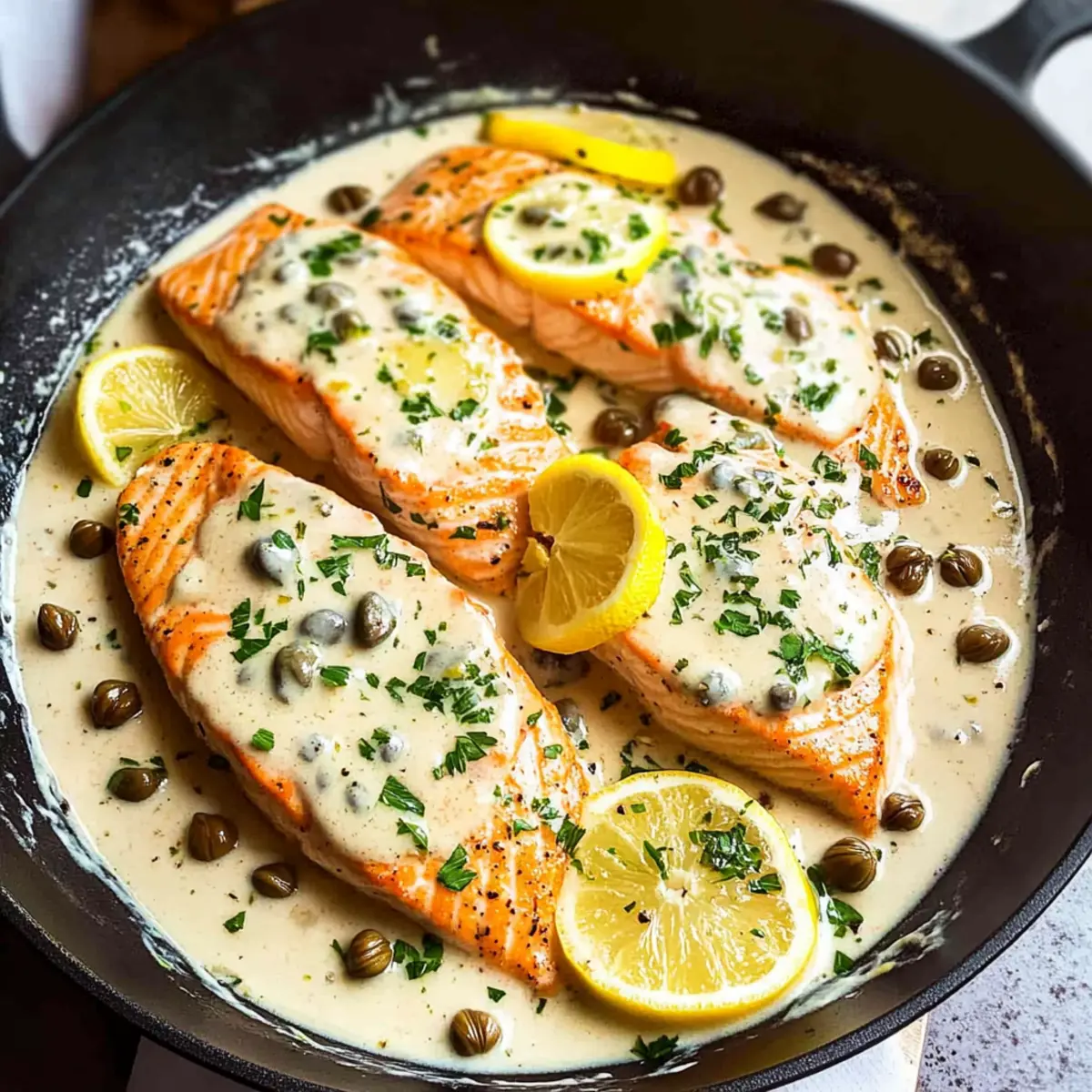 Facebook Twitter Pinterest LinkedInThe aromatic sizzle of salmon hitting the skillet is one of those small kitchen moments that fills me with excitement. Today, I’m thrilled to share my take on Creamy Salmon Piccata with Lemon Caper Sauce—a dish that’s not just quick to prepare but also balances comforting richness with vibrant flavors. This delightful recipe features tender salmon fillets enveloped in a luxurious lemon garlic sauce, accented with the briny goodness of capers and the freshness of parsley. Whether you’re in need of a stress-free weeknight dinner or simply want to impress your loved ones, this meal is a perfect choice. So, what fabulous sides will you pair with your creamy creation? Let’s dive in! Why is Creamy Salmon Piccata a Must-Try? Quick and Easy: The beauty of this dish lies in its simplicity, allowing you to whip up a comforting, home-cooked meal in just 30 minutes. Zesty Flavor: A delightful blend of lemon, garlic, and capers infuses each bite, making it a taste sensation that’ll keep your taste buds dancing. Versatile Pairings: Serve it with Cheesy Garlic Sweet Potatoes or a refreshing Grilled Chili Lime Chicken Fajita Salad for a truly satisfying meal. Crowd-Pleaser: Impress family and friends alike with this gourmet yet approachable recipe, perfect for any occasion. Creamy Comfort: The luscious sauce envelops the salmon, creating a rich texture that makes every bite truly indulgent. Creamy Salmon Piccata Ingredients For the Salmon • Skinless Salmon Fillets – Tender and flaky; skin-on fillets can also be used for added crunch. • Salt & Pepper – Essential for seasoning; adjust to your taste preference. • Flour – Optional for dredging; adds a slight crust for that perfect texture. For the Sauce • Unsalted Butter – Enriches the sauce; substitute with olive oil for a lighter version. • Olive Oil – Non-stick cooking fat; opt for this for a healthier choice. • Garlic – Fills the dish with aromatic flavor; fresher garlic heightens the taste. • Dry White Wine – Introduces acidity and depth; substitute with chicken broth for non-alcoholic variations. • Low-Sodium Chicken Stock – Serves as the flavor base for your sauce; can choose fat-free for a lighter option. • Cornstarch – Acts as a thickening agent; adjust based on how thick you like your sauce. • Fresh Lemon Juice – Brightens the dish with acidity; always best with freshly squeezed juice. • Capers – Adds a tangy, briny flavor; rinse before using to reduce saltiness. • Reduced Fat Cream or Heavy Cream – Creates that creamy sauce texture; evaporated milk can be a lower-fat substitute. For Garnish • Fresh Parsley – Elevates presentation with a fresh touch; dill is a perfect alternative for a different flavor. • Lemon Slices – Not only for garnish but enhances flavor; they add a lovely visual appeal to the dish. This Creamy Salmon Piccata is ready to shine on your dinner table, and you now have all the ingredients at hand to create a comforting masterpiece! Step‑by‑Step Instructions for Creamy Salmon Piccata Step 1: Prep Salmon Begin by seasoning your skinless salmon fillets generously with salt and pepper on both sides for enhanced flavor. If you desire a light crust, dredge the fillets in flour, shaking off any excess. This step will add a delightful texture to your creamy salmon piccata once cooked. Step 2: Sear Salmon In a large skillet, melt 1 tablespoon of unsalted butter and 1 tablespoon of olive oil over medium-high heat. Once the mixture is bubbling and fragrant, carefully place the seasoned salmon fillets into the skillet. Cook for about 4 minutes on each side, or until the fillets are golden brown and easily flake with a fork. Transfer them to a plate and set aside. Step 3: Make Sauce In the same skillet, reduce the heat to medium and add an additional tablespoon of unsalted butter. Once melted, add 2 cloves of minced garlic, sautéing for about 30 seconds or until fragrant. Carefully deglaze the skillet with ½ cup of dry white wine, bringing it to a boil for 1-2 minutes to reduce slightly, scraping up any browned bits for added flavor. Step 4: Thicken Sauce After the wine reduces, pour in 1 cup of low-sodium chicken stock and 2 tablespoons of fresh lemon juice. Bring the mixture to a rolling boil for about 1 minute. Meanwhile, in a small bowl, mix 1 tablespoon of cornstarch with a splash of reserved broth, then stir to combine. Add this mixture to the pan, stirring until the sauce thickens to your desired consistency. Step 5: Combine Stir in ½ cup of reduced fat cream or heavy cream and 2 tablespoons of rinsed capers into the thickened sauce, allowing it to simmer gently. Return the salmon fillets to the skillet, spooning the sauce over them. Let everything simmer together for another minute before removing from heat, ensuring the salmon is well-coated in the creamy sauce. Step 6: Serve Garnish your creamy salmon piccata with freshly chopped parsley and place lemon slices on top for an appealing presentation. Serve immediately over your choice of sides, such as rice, pasta, or a crisp salad, allowing the rich flavors to shine and make every bite delightful. Creamy Salmon Piccata Variations Feel free to get creative and make this recipe your own with delightful twists that will surprise your taste buds! Chicken Swap: Use chicken breasts instead of salmon for a classic chicken piccata. It’s a comforting option perfect for those who prefer poultry. Herb Changes: Swap parsley for fresh basil or tarragon to add an aromatic twist to the sauce. Each herb brings a unique flavor that can transform the dish. Veggie Boost: Toss in some fresh spinach or halved cherry tomatoes into your sauce for an extra dose of vitamins and a pop of color. Gluten-Free Alternative: Omit the flour for a gluten-free option, ensuring you can still enjoy a delicious, creamy dish without any gluten concerns. Dairy-Free Version: Substitute heavy cream with coconut mil
