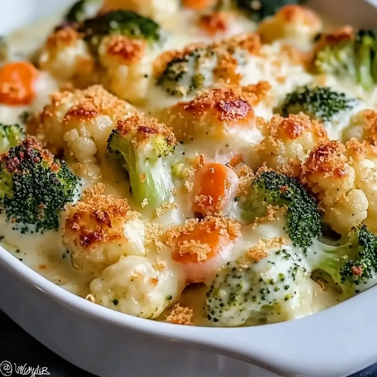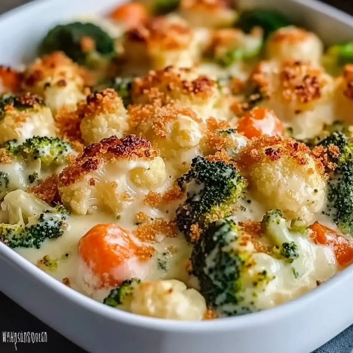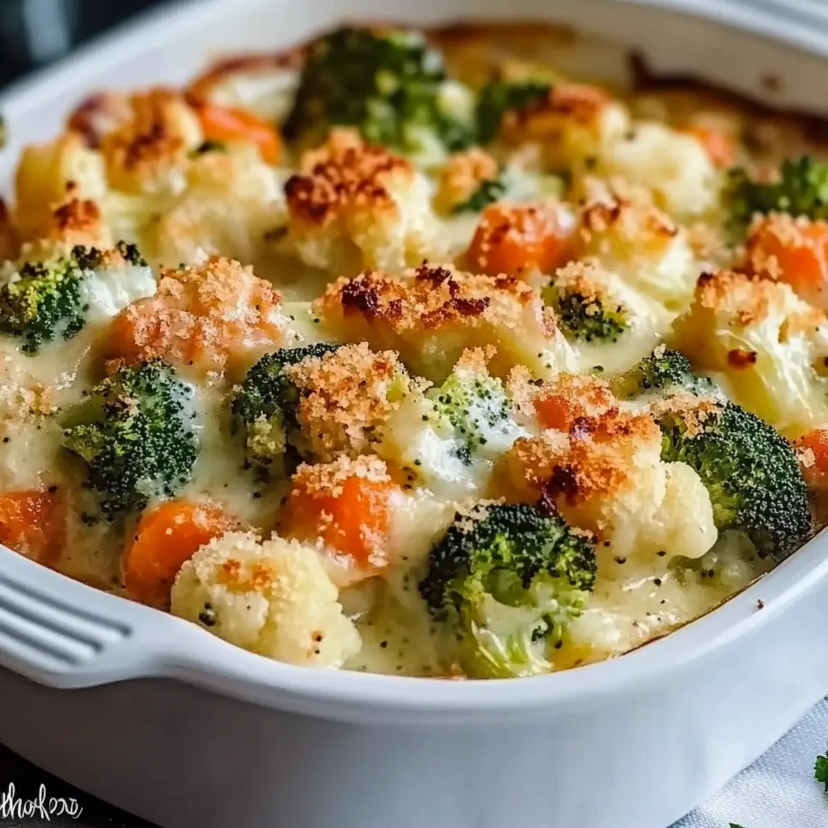 Facebook Twitter Pinterest LinkedInAs I stood in my kitchen, the crisp chill of winter air spilled in through the windows, calling for a soul-warming dish. There’s nothing quite like the aroma of a bubbling Creamy Winter Vegetable Casserole to lift your spirits and embrace the season. This comforting dish features a medley of vibrant roasted vegetables nestled in a velvety cheese sauce that can sway even the most devoted meat lovers. Not only is it an impressive centerpiece for your dinner table, but it also offers endless customization options—think gluten-free alternatives or hearty protein additions. Whether you’re seeking a wholesome vegetarian main or a delightful side dish, this casserole promises to be a crowd-pleaser on wintry nights. Curious about how to bring this cozy favorite to your table? Let’s dive in! Why is this casserole a must-try? Comforting warmth: This Creamy Winter Vegetable Casserole wraps you in delicious coziness, perfect for chilly evenings. Easily customizable: Tailor the ingredients to your taste—swap vegetables, choose gluten-free options, or add protein for a heartier dish! Deliciously creamy: Velvety cheese sauce transforms seasonal vegetables into an inviting main course or side. Crowd-pleaser: Its rich, savory flavor will impress everyone, even non-vegetarians. Make-ahead friendly: Prep it in advance for convenience, making weeknight dinners a breeze. Consider pairing it with crusty bread or a refreshing green salad for a complete meal! Creamy Winter Vegetable Casserole Ingredients For the Vegetables • Cauliflower Florets – Adds bulk and a mild flavor; can substitute with Brussels sprouts or butternut squash. • Broccoli Florets – Provides nutrition and a slightly crunchy texture; swap with green beans or zucchini if desired. • Sliced Carrots – Adds sweetness and color to the dish; replace with parsnips or sweet potatoes for variation. For the Cheese Sauce • Butter – Used for flavor and as a base for the sauce; vegan butter can be used for a dairy-free option. • All-Purpose Flour – Creates a roux to thicken the cheese sauce; substitute with gluten-free flour to make the dish gluten-free. • Whole Milk – Provides creaminess to the cheese sauce; use half-and-half for a richer flavor or plant-based milk for a vegan version. • Cheddar Cheese – Adds sharp flavor and creaminess; substitute with Gruyere or Monterey Jack for different flavor profiles. • Parmesan Cheese – Enhances richness and depth of the sauce; nutritional yeast can be used for a vegan alternative. Seasonings & Extras • Garlic Powder – Adds savory flavor; fresh garlic can be used instead for a more pungent taste. • Ground Nutmeg – Provides warmth and depth of flavor; omit or use a pinch of cinnamon if preferred. • Salt and Black Pepper – Essential for seasoning; adjust to taste based on personal preference. • Breadcrumbs (optional) – For a crispy topping; use gluten-free breadcrumbs to maintain dietary restrictions. • Chopped Parsley (for garnish) – Adds freshness and a pop of color; omit if not available. Step‑by‑Step Instructions for Creamy Winter Vegetable Casserole Step 1: Preheat the Oven and Prepare the Dish Begin by preheating your oven to 375°F (190°C). While the oven warms, take a moment to grease a 9×13-inch baking dish with butter or non-stick spray. This ensures that your Creamy Winter Vegetable Casserole will slide out smoothly once baked, and helps achieve that delightful golden color on the bottom. Step 2: Chop and Steam the Vegetables Next, chop the cauliflower, broccoli, and carrots into bite-sized pieces. Steam these vibrant vegetables for 5-7 minutes or until they are just tender but still crisp. This step allows their natural flavors to shine while ensuring they hold up against the creamy sauce in your casserole. Step 3: Create the Roux for the Cheese Sauce In a medium saucepan, melt 4 tablespoons of butter over medium heat. Sprinkle in ¼ cup of all-purpose flour and whisk it together to create a roux. Cook this mixture for about 1-2 minutes until it turns a light golden color, which will add depth to the cheese sauce and help it thicken beautifully. Step 4: Whisk in the Milk Gradually whisk in 2 cups of warm whole milk to the roux, ensuring there are no lumps. Keep cooking this mixture over medium heat for about 3-5 minutes, stirring frequently, until the sauce thickens to a velvety consistency. This creamy base is the heart of your Creamy Winter Vegetable Casserole. Step 5: Add Cheeses and Seasonings Once thickened, stir in 1 teaspoon of garlic powder, a pinch of ground nutmeg, and salt and black pepper to taste. Then, fold in 1 cup of shredded cheddar cheese and ½ cup of grated Parmesan cheese until they melt into the sauce, creating that rich, gooey texture that makes this casserole so irresistible. Step 6: Combine Vegetables and Cheese Sauce In a large mixing bowl, gently combine the steamed vegetables with the creamy cheese sauce. Make sure all the vegetables are thoroughly coated. This step is essential to ensure each bite of your Creamy Winter Vegetable Casserole is filled with delightful flavors and textures. Step 7: Transfer to Baking Dish Carefully pour the vegetable and cheese mixture into your prepared baking dish, spreading it out evenly. If you’d like a crispy topping, sprinkle a layer of breadcrumbs over the casserole. This adds a nice crunch that complements the creamy filling perfectly. Step 8: Bake Until Golden and Bubbly Place the casserole into the preheated oven and bake for 20-25 minutes, or until it is bubbling and golden on top. For an extra crispy finish, you may broil the casserole for an additional 2-3 minutes. Just watch closely to avoid burning that perfect crust! Step 9: Cool and Garnish Once out of the oven, let the casserole cool for 5-10 minutes to set. Before serving, garnish with freshly chopped parsley for a burst of color and flavor. Now, your Creamy Winter Vegetable 