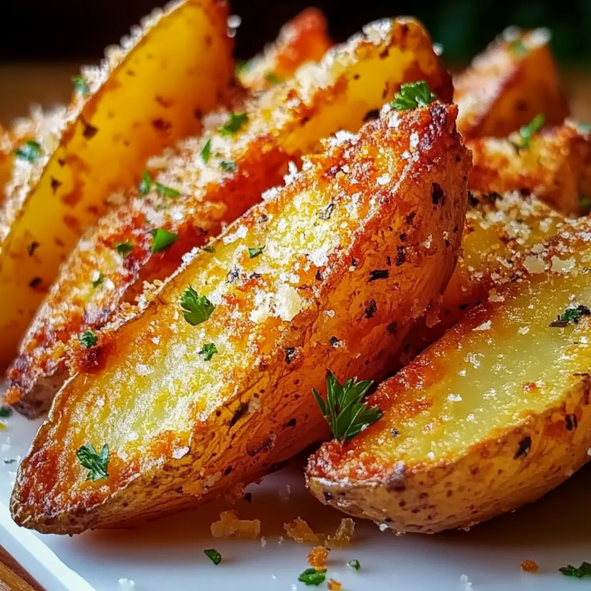 Facebook Twitter Pinterest LinkedInAmidst the chaos of everyday life, have you ever found yourself yearning for that perfect snack that satisfies both your cravings and your health goals? Enter my Crispy Baked Garlic Parmesan Potato Wedges! These delightful wedges are not only crispy and packed with flavor, but they also provide a guilt-free alternative to the typical fried fare we often reach for. In just under 30 minutes, you can whip up this easy and healthy side dish or snack that’s sure to impress family and friends alike. With simple ingredients you likely already have on hand, including the tantalizing flavors of garlic and parmesan, you’ll feel like a culinary superstar without breaking a sweat. Who’s ready to dive into this crispy potato goodness? Why Are These Potato Wedges Irresistible? Crispy Texture: Each wedge boasts a golden, crunchy exterior that totally satisfies your snack cravings, offering the perfect guilt-free alternative to classic fried treats. Flavor Explosion: Infused with zesty garlic and rich Parmesan, these wedges create an irresistible aroma that will have everyone gathering around the kitchen! Quick and Easy: In under 30 minutes, you can whip up a dish that feels gourmet while using just a handful of ingredients. Versatile Serving: Pair them with delicious dips like garlic aioli or zesty ketchup for a crowd-pleasing appetizer or side dish that enhances any meal, maybe like your favorite Garlic Roasted Chicken. Healthy Indulgence: Baked rather than fried, these wedges cut down on oil and calories, allowing you to indulge without the guilt! Endless Variations: Want to mix it up? Try substituting sweet potatoes or experimenting with different spices like chili powder for a unique twist! Crispy Baked Garlic Parmesan Potato Wedges Ingredients • For the Wedges Potatoes – Use medium russet potatoes for the best texture and flavor; their starchiness helps achieve that crispy finish. Olive Oil – Choose high-quality olive oil for richness and to aid in crisping; feel free to substitute with avocado oil or melted coconut oil. Garlic Powder – This key seasoning infuses the wedges with a distinct garlic flavor that elevates the dish. Onion Powder – Adds a subtle sweetness that enhances the overall savory profile of the wedges. Smoked Paprika – A sprinkle of this ingredient gives an inviting smoky depth to the flavor. • For the Finish Grated Parmesan Cheese – A must for creating that delicious, cheesy crust; using fresh cheese will maximize flavor. Salt and Black Pepper – Essential for bringing out all the flavors in the potato wedges; adjust to your taste preference. Fresh Parsley – Use this optional garnish to add a pop of color and freshness before serving. Experience the delight of these Crispy Baked Garlic Parmesan Potato Wedges that deliver flavor and crunch without the guilt! Step‑by‑Step Instructions for Crispy Baked Garlic Parmesan Potato Wedges Step 1: Preheat the Oven Start by preheating your oven to 425°F (220°C) to create the ideal environment for crispy baked garlic parmesan potato wedges. This high temperature ensures that the wedges will turn golden brown and delightfully crunchy. Meanwhile, gather your ingredients and prep your baking sheet with parchment paper to prevent sticking. Step 2: Prepare the Potatoes Wash and scrub your medium-sized russet potatoes under cold water, ensuring any dirt is removed. Next, cut the potatoes into wedges, maintaining thickness for even cooking. Leaving the skins on not only adds texture but also provides additional nutrients, ready to embrace the garlic and parmesan flavors. Step 3: Season the Wedges In a large mixing bowl, toss the potato wedges with olive oil, garlic powder, onion powder, smoked paprika, salt, and pepper. Ensure each wedge is evenly coated to maximize flavor and crispiness. The olive oil will help create that golden exterior while the spices elevate the taste, ensuring your crispy baked garlic parmesan potato wedges are nothing short of irresistible. Step 4: Coat with Cheese Add the freshly grated Parmesan cheese to the seasoned potato wedges in the bowl. Toss again until every wedge is covered with a generous layer of cheese. This cheesy crust is what will make your baked wedges savorily addictive, creating a satisfying crunch as they bake. Step 5: Arrange for Baking Spread the potato wedges out in a single layer on the parchment-lined baking sheet. Make sure to leave some space between each wedge to allow for even cooking and to prevent steaming. This step is crucial for achieving that perfect crispy texture you’re aiming for with your crispy baked garlic parmesan potato wedges. Step 6: Bake to Perfection Place the baking sheet in your preheated oven and bake the wedges for 30 minutes. Flip them halfway through the cooking time to ensure an even brownness and crispiness. You’ll know they are ready when they are golden and crispy on the outside yet tender and fluffy inside, perfect for satisfying your snack cravings. Step 7: Garnish and Serve Once your crispy baked garlic parmesan potato wedges are finished baking, remove them from the oven and allow to cool for a couple of minutes. For an extra touch, garnish with freshly chopped parsley for color and added flavor. Serve your delicious wedges immediately, and watch as everyone gathers around to enjoy this scrumptious snack! What to Serve with Crispy Baked Garlic Parmesan Potato Wedges Elevate your dining experience with delightful pairings that complement these scrumptious potato wedges! Garlic Aioli: This creamy dip offers a decadent garlic flavor that enhances your wedges beautifully, bringing a gourmet touch to your snack. Zesty Ketchup: A classic choice that adds a sweet and tangy contrast to the savory baked wedges, pleasing both kids and adults alike. Side Salad: A fresh arugula or spinach salad adds a crisp and peppery bite, balancing the richness of the potato wedges for a wholesome meal. Steak or Grilled