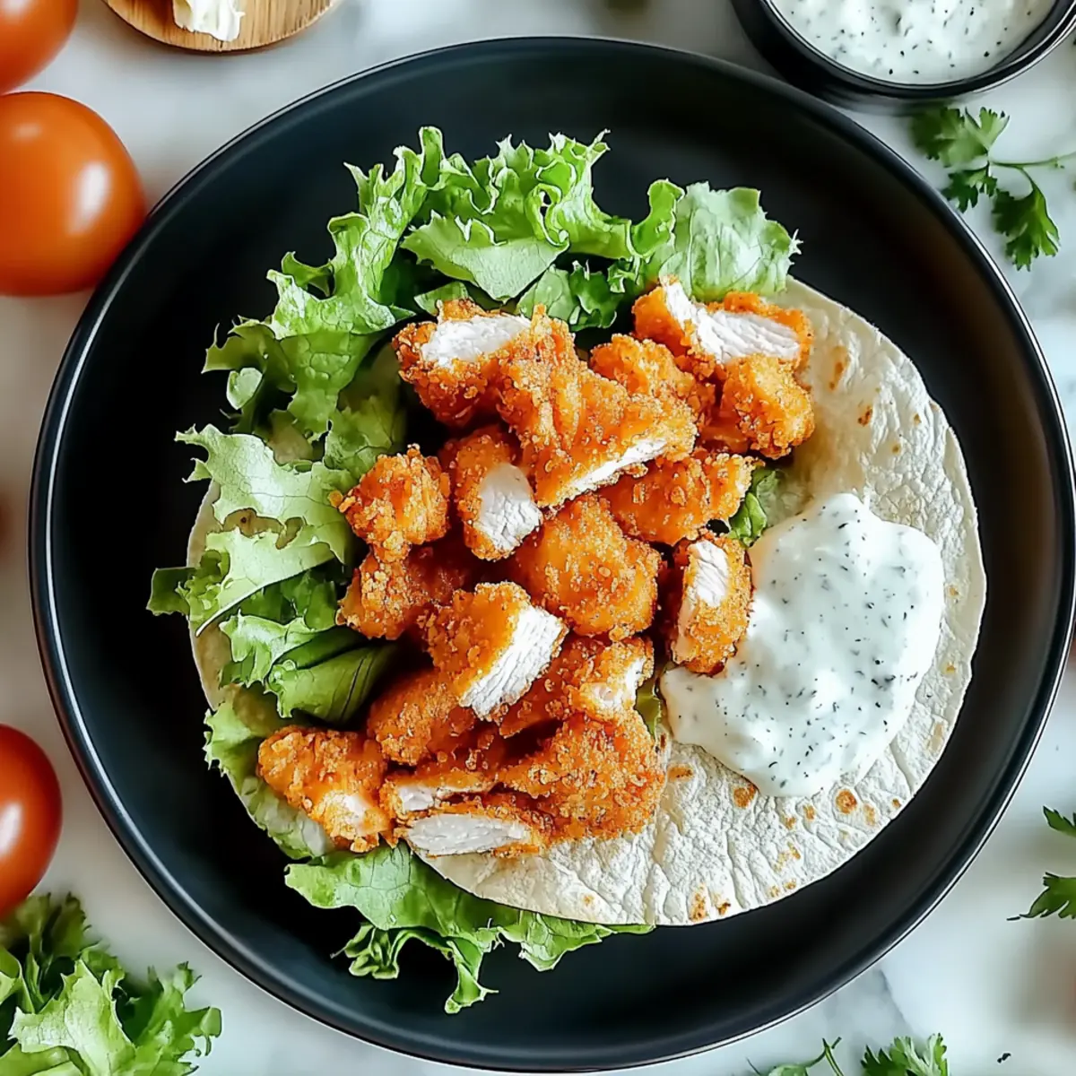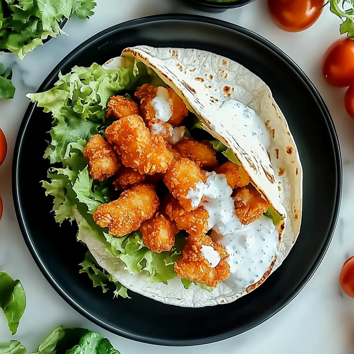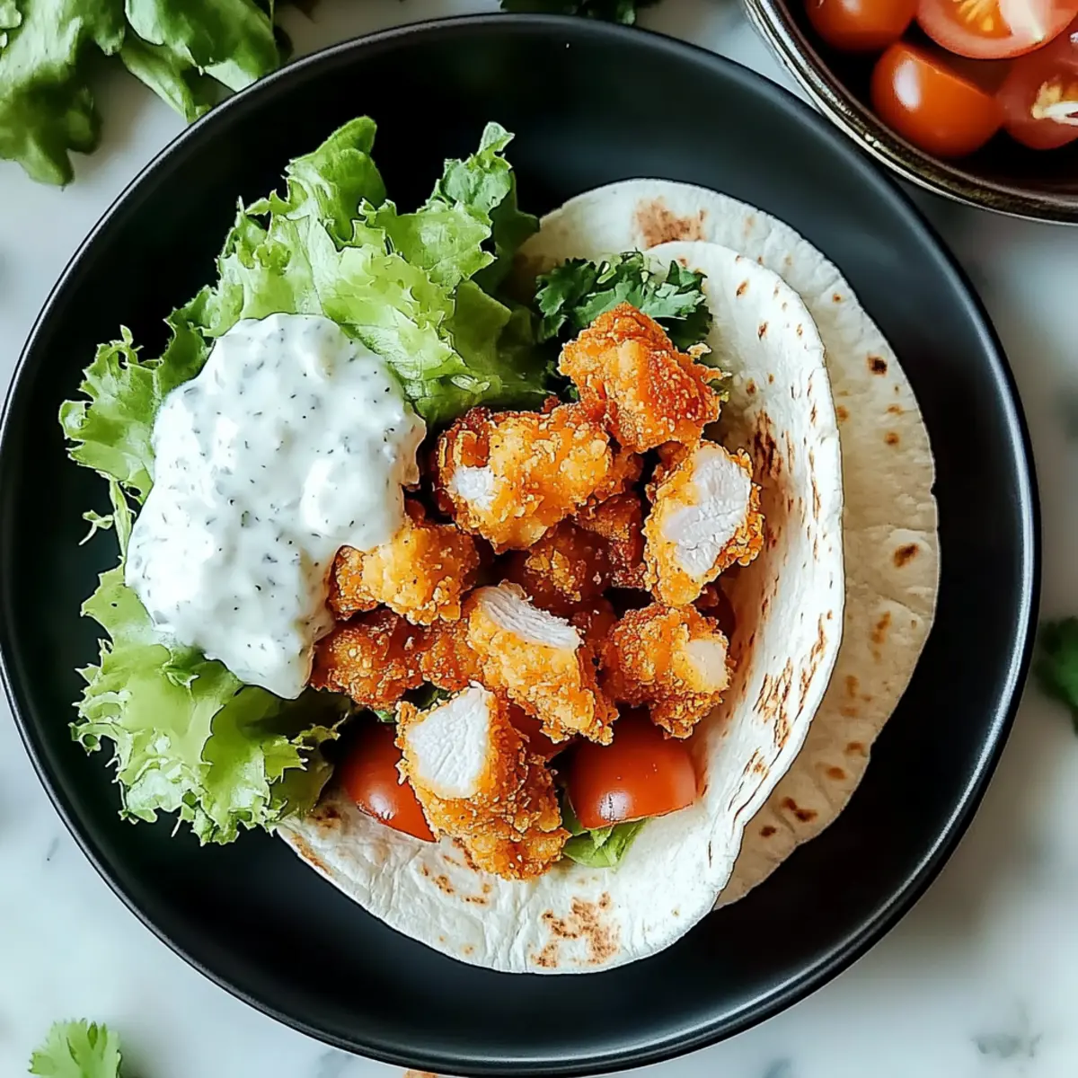 Facebook Twitter Pinterest LinkedInAs I rummaged through my kitchen, I discovered an unexpected yet delightful combination waiting to come alive: the Crispy Chicken Ranch Snack Wrap. Picture this: golden-brown chicken tenders, a rich ranch drizzle, and a medley of fresh veggies, all embraced by a soft tortilla. This recipe is a lifesaver for anyone looking to whip up a delicious meal in no time—perfect for busy weekdays or a laid-back dinner! Plus, it’s super easy to customize, so feel free to toss in your favorite toppings or sides to make it uniquely yours. Intrigued to see how this tasty creation comes together? Let’s jump into the recipe! Why is this wrap a must-try? Crispy texture: The dynamic crunch of golden-brown chicken contrasts beautifully with the creamy ranch dressing, making each bite a delight! Quick and Easy: This recipe is friendly for beginners, allowing you to create a gourmet-like wrap in just 30 minutes, perfect for those hectic nights. Customizable delights: Whether you prefer classic ranch or want to switch things up with a spicy twist, you can personalize the flavors to suit your cravings. Healthy alternative: Ditch fast food for this homemade option that packs in the flavor without the guilt. Trust me, once you taste this wrap, you’ll be reluctant to reach for the takeout menu again! Family-friendly: It’s a meal everyone will love, including the kids! Pair it with some crispy sweet potato fries or a fresh fruit salad for the ultimate dinner experience. Crispy Chicken Ranch Snack Wrap Ingredients • Dive into this delightful recipe with these simple ingredients! For the Chicken Chicken Breast – A great source of protein; substitute with thighs for juiciness. Olive Oil – Essential for achieving that beautiful golden-brown finish. Salt – Highlights all the flavors in your wrap. Black Pepper – Adds just the right amount of warmth. Garlic Powder – Infuses a savory depth into your chicken. Onion Powder – Enhances the taste with a subtle sweetness. Paprika – Brings flavor and a rich color to your crispy chicken. Flour – Helps the coating stick for that perfect crunch. Egg – Acts as a binder for your crispy goodness. Panko Breadcrumbs – Provides the ultimate crunch in this crispy chicken wrap. For the Dressing & Wrap Ranch Dressing – Adds creaminess and tanginess; try spicy ranch for a kick! Flour Tortilla – The perfect vehicle for all those delicious fillings; opt for gluten-free wraps if preferred. Cheddar Cheese – A rich companion to the chicken; feel free to swap it with mozzarella or pepper jack. For the Fresh Fixings Shredded Lettuce – Offers freshness and a delightful crunch. Diced Tomatoes – Brings juiciness and acidity, balancing the richness of the wrap. Step‑by‑Step Instructions for Crispy Chicken Ranch Snack Wrap Step 1: Preheat the Oven Begin by preheating your oven to 400°F (200°C) to ensure the perfect crispiness of the chicken later on. While the oven heats, gather your ingredients and equip yourself with a large skillet, a cutting board, and a sharp knife. This initial step sets the stage for a delicious Crispy Chicken Ranch Snack Wrap! Step 2: Prepare the Chicken Carefully slice the chicken breast horizontally to create thinner pieces, which cook more evenly and quickly. After your chicken is prepped, season both sides generously with salt, black pepper, garlic powder, onion powder, and paprika. This flavorful seasoning will be key to achieving scrumptious, golden-brown chicken in your wrap. Step 3: Cook the Chicken In your large skillet, heat a drizzle of olive oil over medium-high heat. Once the oil shimmers, add your seasoned chicken. Cook for about 4-5 minutes on each side, or until the chicken is golden brown and reaches an internal temperature of 165°F (74°C). This process creates not just a topping but the star ingredient of your crispy chicken ranch snack wrap! Step 4: Slice the Chicken Once the chicken is perfectly cooked, remove it from the skillet and allow it to rest for a few minutes. This resting time allows the juices to redistribute for maximum flavor. After resting, slice the chicken into strips, ready to be layered into your wrap with all the delicious toppings. Step 5: Set Up the Dredging Station Prepare for the extra crunch by setting up a dredging station. On one plate, spread a layer of flour; in a bowl, beat an egg; and on another plate, pour out panko breadcrumbs. This station will help you to create a crispy coating for each chicken strip, perfect for your Crispy Chicken Ranch Snack Wrap. Step 6: Bread the Chicken Take each chicken strip and dredge it in flour, shaking off the excess. Next, dip the floured chicken into the beaten egg, then coat it thoroughly with panko breadcrumbs. Make sure each piece is well covered to achieve the ultimate crunch in your wrap. Step 7: Bake the Chicken Place the breaded chicken strips on a lined baking sheet, ensuring they’re not touching for even cooking. Bake in the preheated oven for 10-12 minutes, or until golden brown and crispy. The oven will work its magic here, transforming your chicken into the crunchy component of your crispy chicken ranch snack wrap. Step 8: Prepare the Tortilla While the chicken bakes, lay a flour tortilla flat on a clean surface. Spread a generous amount of ranch dressing in the center—this will add a creamy layer to your wrap. Top it off with a slice of cheese for extra richness. This is the base layer of your flavorful snack wrap that will bring everything together beautifully. Step 9: Assemble the Wrap Once your chicken is fully baked, it’s time to assemble the wrap! Place the crispy chicken strips atop the cheese, then add a handful of shredded lettuce and diced tomatoes for that fresh crunch. Don’t hold back on these fresh ingredients; they elevate the entire eating experience of your crispy chicken ranch snack wrap. Step 10: Roll Up the Wrap Fold the sides of the tortilla inward, then begin rolling it f