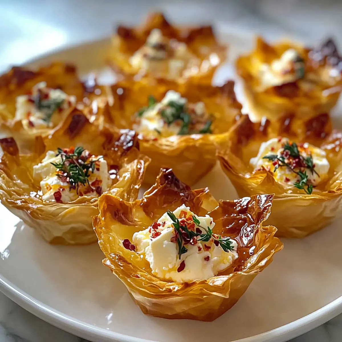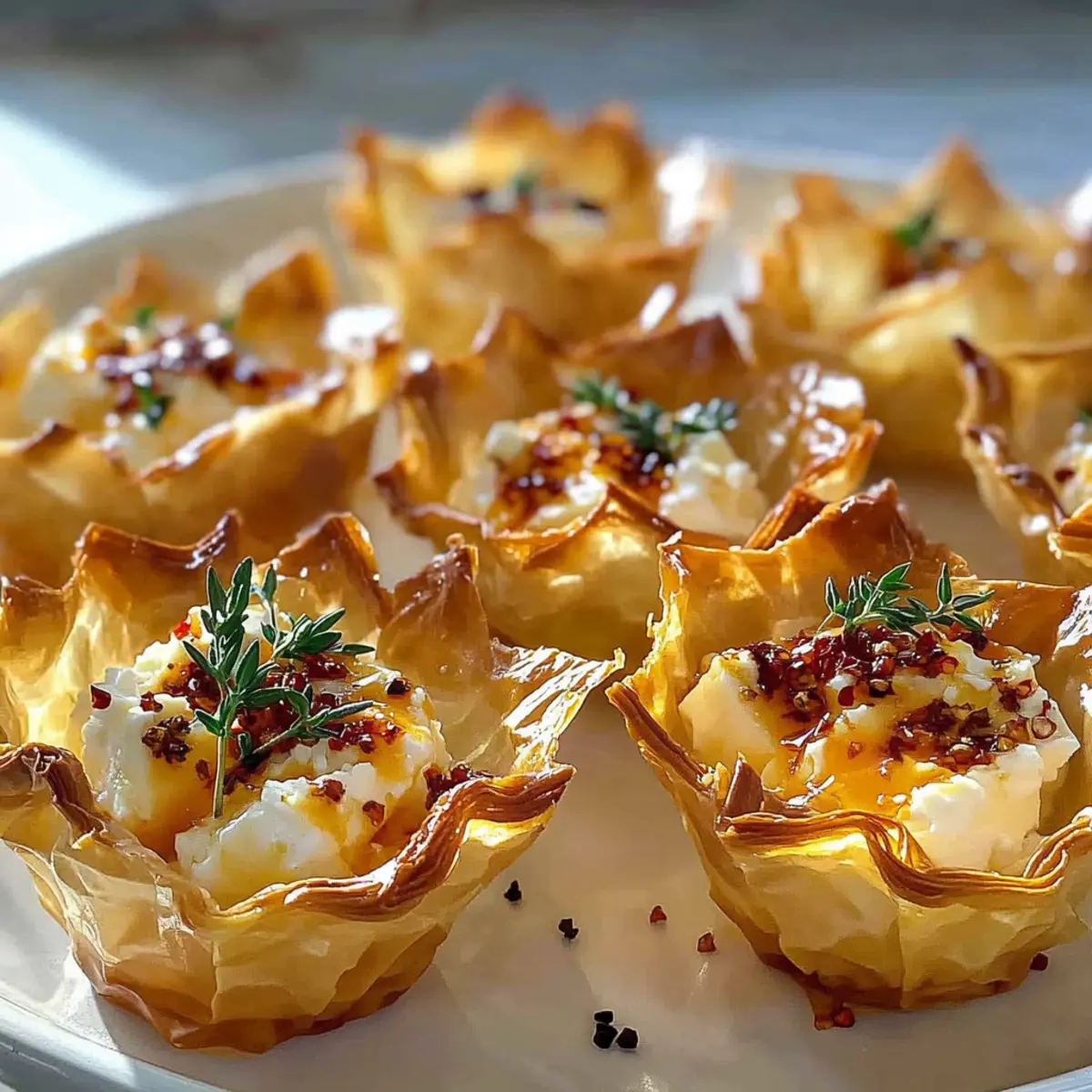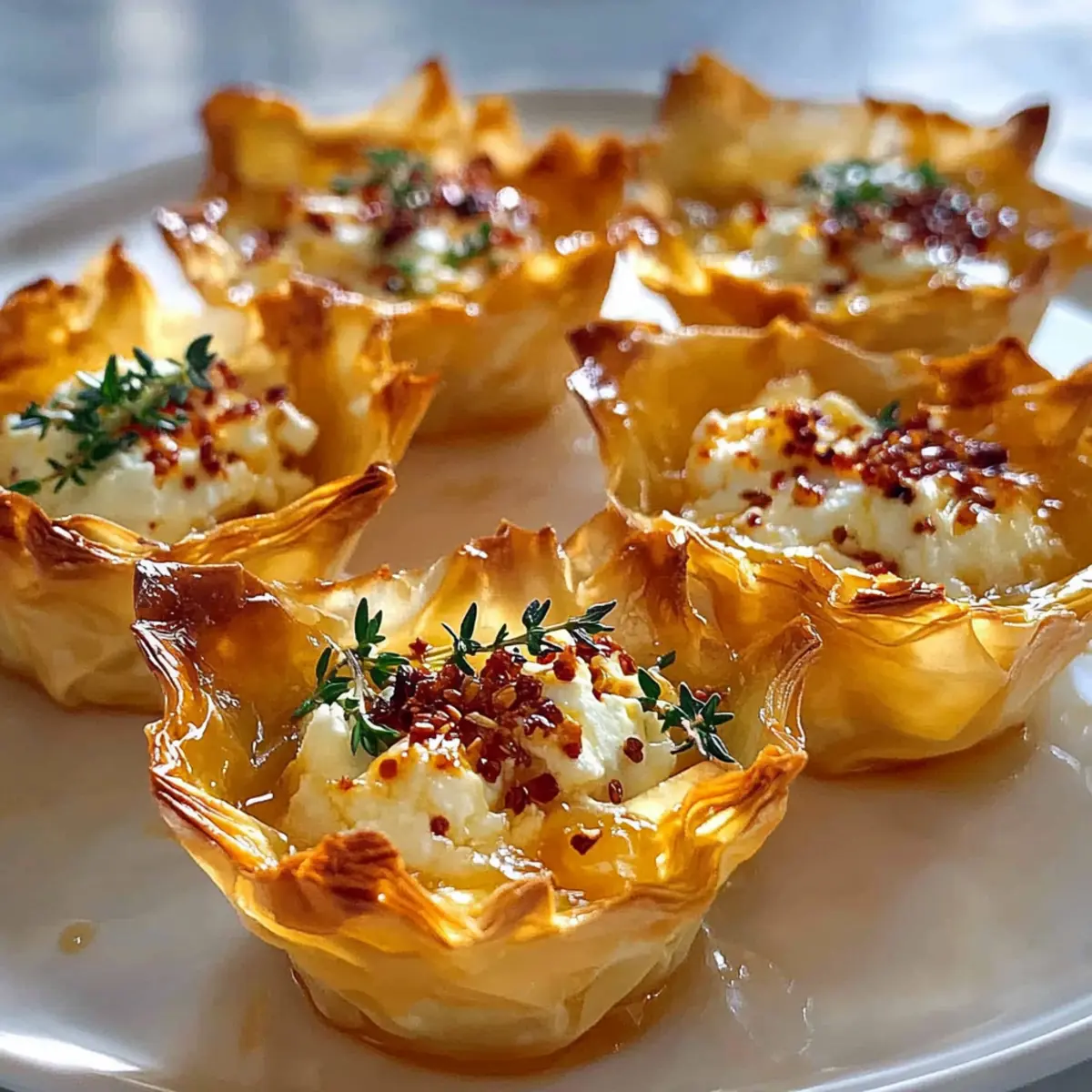 Facebook Twitter Pinterest LinkedInAs I stood in my kitchen, the tempting aroma of baked phyllo wafted around me, sending memories of vibrant Mediterranean markets rushing back. Today, I’m excited to share my recipe for 15-Minute Crispy Feta and Hot Honey Phyllo Cups. These delightful little bites are not just a labor of love; they come together in mere minutes, making them the perfect quick appetizer for your next gathering. The combination of creamy feta enveloped in crispy phyllo, drizzled with a sweet-and-spicy hot honey, creates an irresistible flavor harmony that will captivate your taste buds and leave your guests craving more. Plus, they’re vegetarian-friendly, fitting perfectly into any dietary needs while elevating your appetizer game. Curious about how to bring this mouthwatering experience to your own table? Let’s dive into the recipe! Why are these phyllo cups a must-try? Simplicity: These Crispy Feta and Hot Honey Phyllo Cups come together in just 15 minutes, perfect for spontaneous gatherings or busy weeknights. Unique Flavors: The delightful contrast of creamy feta and spicy honey will have your guests raving, making them a standout addition to your appetizer spread. Versatile: Feel free to customize by experimenting with herbs or drizzling different sauces—dare to try them with a bit of chocolate sauce for an unexpected twist! Crowd-Pleaser: Whether you’re entertaining friends or family, these cups are sure to impress, effortlessly elevating your event. Pairing Perfection: Serve them alongside refreshing drinks like honey-lavender lemonade or Honey Butter Chicken for a complete culinary experience. Indulge in this recipe and watch them disappear! Crispy Feta and Hot Honey Phyllo Cups Ingredients For the Filling • Feta Cheese – A creamy, salty filling that melts beautifully; for the best melting experience, choose Greek or Bulgarian feta. • Fresh Thyme – Adds a lovely herbal note; substitute with rosemary for an alternative flavor or omit if preferred. For the Phyllo Cups • Phyllo Dough – The star of the show, creating flaky, crispy textures; puff pastry can be used but will yield a denser end result. • Olive Oil – Essential for browning and enhancing flavor; brush on phyllo for a golden finish. For the Drizzle • Hot Honey – Offers a sweet-spicy kick that elevates the flavor profile; maple syrup can stand in, with additional chili for heat if desired. • Red Pepper Flakes – Provides a touch of heat; reduce or omit for a milder flavor, or use cayenne for a stronger spice. Whip up these Crispy Feta and Hot Honey Phyllo Cups and watch the smiles bloom around your table! Step‑by‑Step Instructions for Crispy Feta and Hot Honey Phyllo Cups Step 1: Preheat the Oven Begin by preheating your oven to 300°F (150°C). This slow baking temperature will ensure your phyllo cups get beautifully crisp without overcooking the filling. As the oven warms, you can prepare your phyllo dough to create the perfect base for your Crispy Feta and Hot Honey Phyllo Cups. Step 2: Prepare Phyllo Cups Unroll the phyllo dough carefully, keeping it covered with a damp cloth to prevent drying. Take a sheet and lightly brush it with olive oil using a pastry brush, allowing it to glisten. Fold the brushed sheet into quarters and gently press it into a muffin tin to create your cups. Repeat this process until you’ve formed enough cups for your filling. Step 3: Fill with Feta Now it’s time to fill your phyllo cups! Crumble the feta cheese into small pieces, ensuring it’s spread evenly. Spoon a generous amount of feta into each phyllo cup, filling them just below the rim. This will create a perfect, gooey center when baked, giving your Crispy Feta and Hot Honey Phyllo Cups that delightful creamy texture. Step 4: Bake to Perfection Place the muffin tin in the preheated oven and bake for approximately 10 minutes, or until the phyllo cups are golden brown and crispy. Keep an eye on them during the final minutes—once they start to turn a lovely shade of gold, you know they’re almost ready! This step is crucial for achieving that satisfying crunch. Step 5: Drizzle with Hot Honey Once baked, remove your Crispy Feta and Hot Honey Phyllo Cups from the oven. Immediately drizzle hot honey generously over each cup. The heat from the cups will help the honey soak into the feta, amplifying the flavors. You can also sprinkle a few red pepper flakes over top for an extra kick, adding both flavor and a pop of color. Step 6: Serve Warm Let the phyllo cups cool for a couple of minutes before transferring them to a serving platter. It’s best to serve your crispy delights warm to enjoy the full flavor impact alongside the wonderful texture combination. These Crispy Feta and Hot Honey Phyllo Cups are sure to delight your guests and leave them asking for the recipe! Make Ahead Options These Crispy Feta and Hot Honey Phyllo Cups are a fantastic choice for meal prep enthusiasts! You can fill the phyllo cups with feta up to 2 hours in advance, covering them tightly with plastic wrap and refrigerating to maintain freshness. This prevents the phyllo from getting soggy while allowing the flavors to meld. If you want to prep even further ahead, prepare the honey drizzle and store it in an airtight container in the fridge for up to 3 days. When you’re ready to finish, simply bake the cups at 300°F for about 10 minutes until crispy, drizzle with hot honey, and serve warm for delightful, restaurant-quality results with minimal effort. Expert Tips for Crispy Feta and Hot Honey Phyllo Cups Storage Guidance: Keep leftover crispy cups in an airtight container for up to 2 days and reheat in the oven to maintain crispiness. Feta Choice: Opt for Greek or Bulgarian feta for superior melting quality; avoid pre-crumbled varieties that lack creaminess. Avoid Soggy Cups: Brush each phyllo layer with olive oil to create a moisture barrier, preventing sogginess after baking your phyllo cups. Watch the Ba