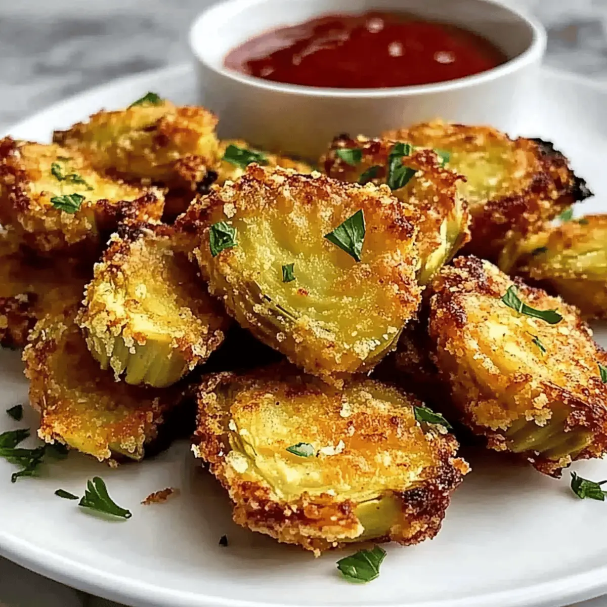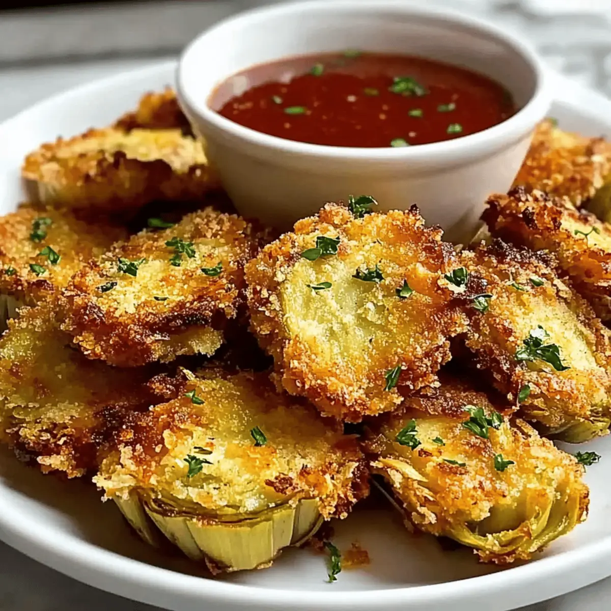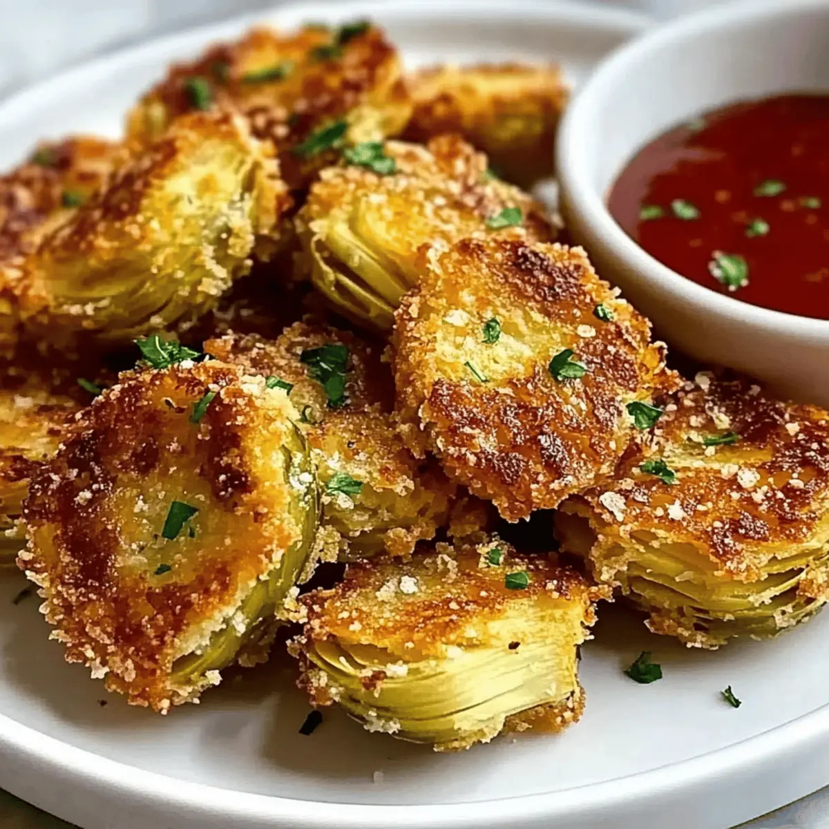 The sizzling sound of artichoke hearts hitting the baking sheet has a way of bringing everyone into the kitchen, doesn’t it? With my Crispy Parmesan Artichoke Hearts, you’re not just preparing an appetizer; you’re crafting a genuine crowd-pleaser that has the power to transform any gathering or cozy night in. This easy-to-make delight pairs the rich crunch of parmesan with the softness of artichoke hearts, ensuring every bite is an inviting experience. Plus, they are vegetarian-friendly and perfect for whenever you’re looking to indulge without the guilt. Trust me, the aroma that wafts through your kitchen as they bake will draw your family and friends in, leaving them eagerly anticipating each golden, crispy bite. So, what’s your favorite way to enjoy artichokes? Let’s dive into this delectable recipe! Why are These Artichoke Hearts Irresistible? Crispy Delight: These Crispy Parmesan Artichoke Hearts bring a satisfying crunch that contrasts perfectly with the tender artichoke inside. Quick & Easy: In just a few simple steps, you’ll have an appetizer that looks and tastes gourmet—perfect for any occasion. Vegetarian-Friendly: Enjoyable for everyone, this dish satisfies cravings without the meat, making it a go-to for gatherings. Versatile Serving Options: Pair these bites with marinara, garlic aioli, or ranch for a flavor explosion. Consider dipping them into delicious sauces like in my Parmesan Chicken Garlic for added zest! Crowd-Pleasing: Impress your guests with a snack that’s both sophisticated and simple. Set these out at your next gathering to see them vanish in minutes! Crispy Parmesan Artichoke Hearts Ingredients • Here’s what you need to create these irresistible bites! For the Batter Artichoke Hearts – The main ingredient; choose canned or frozen packed in water for the best flavor. Parmesan Cheese – Adds a rich, savory flavor; freshly grated will ensure the crispiest coating. Breadcrumbs – Provides that essential crunch; panko gives an extra crispy texture that pairs perfectly. Garlic Powder – Adds depth of flavor; choose high-quality powder to elevate the taste. Dried Oregano – Infuses an Italian essence into the dish; an essential component for balanced flavor. Olive Oil – Crucial for coating; extra virgin olive oil yields a beautifully golden-brown finish. Salt & Pepper – Enhances all the flavors; adjust to your preference for the perfect bite. Optional Dipping Sauces Marinara Sauce – Perfect for dipping; balances the flavors beautifully. Garlic Aioli – Adds creaminess and a gourmet touch to each bite. Ranch Dressing – For those who enjoy a tangy twist, this is a crowd favorite. Enjoy whipping up these crispy parmesan artichoke hearts, a delicious appetizer that’ll surprise and delight your friends and family! Step‑by‑Step Instructions for Crispy Parmesan Artichoke Hearts Step 1: Preheat the Oven Begin by preheating your oven to 400°F (200°C). This is crucial for achieving the perfect golden brown on your Crispy Parmesan Artichoke Hearts. While the oven heats up, you can prepare your ingredients, ensuring everything is ready for a smooth cooking process. Step 2: Prepare the Artichoke Hearts Next, open your canned or frozen artichoke hearts and drain them thoroughly, rinsing under cold water. Pat them dry with paper towels to remove excess moisture. This is an essential step to ensure your artichokes achieve maximum crispiness when baked, as moisture can lead to soggy bites. Step 3: Mix the Coating In a mixing bowl, combine freshly grated parmesan cheese, panko breadcrumbs, garlic powder, dried oregano, salt, and black pepper. Stir the mixture until it’s evenly blended, creating a flavorful coating for your artichoke hearts. This mixture will add the irresistible crunch and taste that make these artichokes so delightful. Step 4: Coat the Artichoke Hearts Working with tongs, gently coat each artichoke heart in olive oil, ensuring it’s evenly covered. After that, roll each heart in the breadcrumb and parmesan mixture, pressing lightly to adhere the coating. This step ensures that every artichoke heart gets that delicious crispy layer and mouthwatering flavor. Step 5: Arrange on Baking Sheet On a parchment-lined baking sheet, arrange the coated artichoke hearts with space between each piece. This spacing is important as it allows the hot air to circulate, helping each artichoke bake evenly and achieve that coveted crunch. Make sure they are not overcrowded to maximize crispiness. Step 6: Bake Until Golden Place the baking sheet in the preheated oven and bake for 25-30 minutes. Keep a close eye on them, as oven temperatures can vary. Look for a golden brown color and a crispy exterior as indicators of doneness, signaling that your Crispy Parmesan Artichoke Hearts are ready. Step 7: Cool and Serve Once baked, remove the artichoke hearts from the oven and let them cool slightly. This short cooling period allows them to firm up a bit more. Serve warm, either on their own or alongside marinara sauce or garlic aioli for dipping. Their enticing aroma will draw everyone in for a taste! Storage Tips for Crispy Parmesan Artichoke Hearts Fridge: Store leftover Crispy Parmesan Artichoke Hearts in an airtight container in the refrigerator for up to 3 days to retain freshness. Freezer: If you’d like to keep them longer, place the baked artichoke hearts in a single layer on a baking sheet to freeze. Once solid, transfer them to a freezer-safe bag for up to 2 months. Reheating: To bring back the crunch, reheat frozen or refrigerated artichoke hearts in the oven at 350°F (175°C) for about 10 minutes, checking frequently to avoid overcooking. Avoid Sogginess: Always allow the artichoke hearts to cool before storing, as excess moisture can lead to sogginess. What to Serve with Crispy Parmesan Artichoke Hearts? Elevate your appetizer experience by pairing these crispy bites with delicious complementary dishes that ignite your taste buds. C