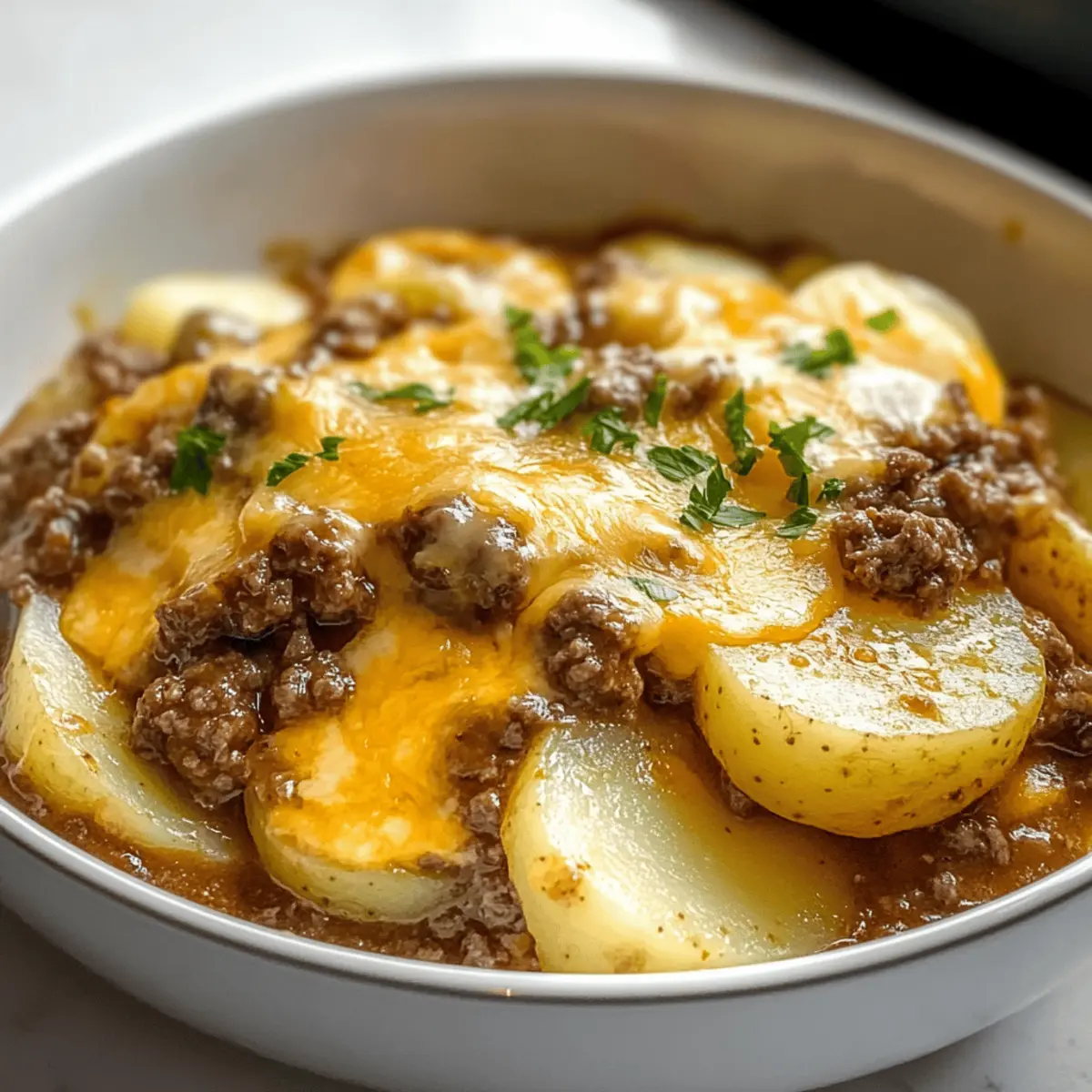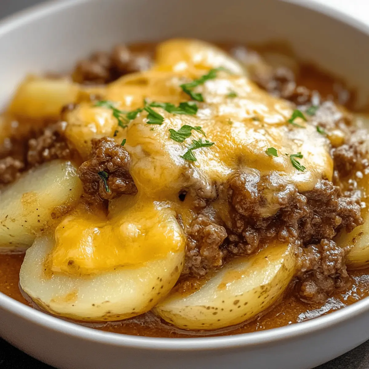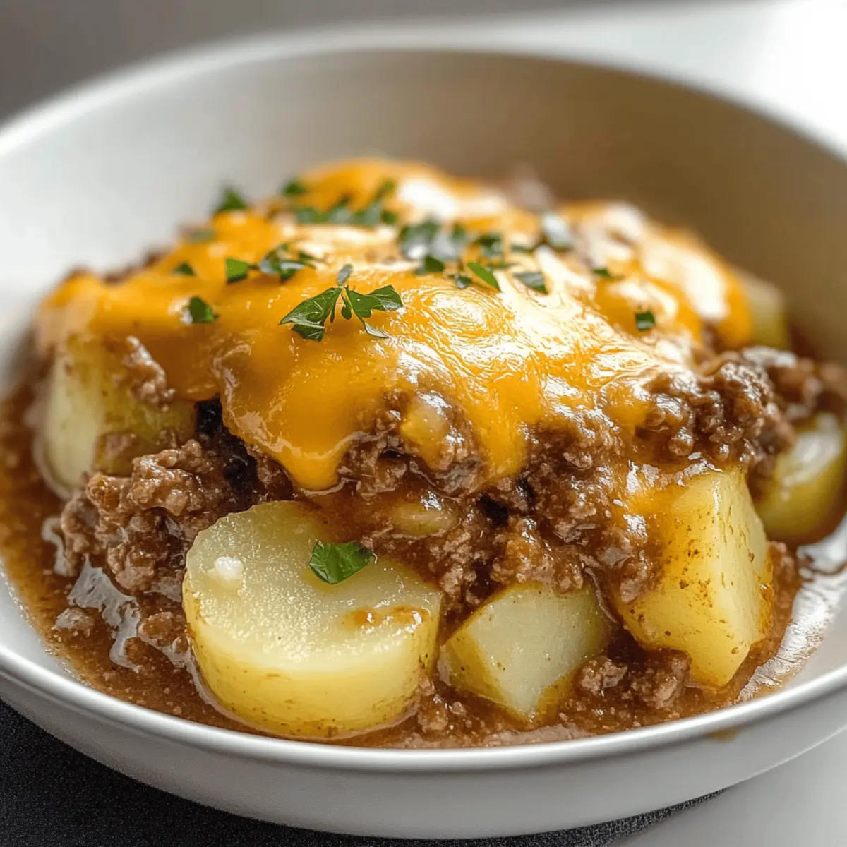 As the sun dipped below the horizon, the warm, inviting aroma of comfort food wafted through the kitchen. That’s the magic of my Crockpot Hamburger Potato Casserole. This simple yet satisfying dish is a lifesaver on those hectic weeknights when you crave a home-cooked meal but the clock is ticking. With tender ground beef melding beautifully with creamy potatoes and gooey cheese, it’s a crowd-pleaser that even the pickiest eaters will adore. What I love most is the flexibility this recipe offers—swap in veggies or leaner meats for a nutritious twist. Plus, it’s gluten-free, making it a guilt-free pleasure! Who wouldn’t want to come home to a steaming bowl of this heartwarming casserole? Are you ready to discover how to bring this delightful dish to your table? Why is this casserole a must-try? Simplicity at its Finest: This Crockpot Hamburger Potato Casserole offers an easy, hands-off cooking experience, perfect for busy days. Flavor Explosion: The rich blend of beef, creamy potatoes, and melted cheese creates an irresistible taste that warms the heart. Customization Delight: Feel free to swap ingredients like using ground turkey or adding seasonal veggies for extra nutrition. Guilt-Free Indulgence: Enjoy this dish confidently; it’s gluten-free and adaptable, ensuring everyone at the table can dig in. Crowd-Pleasing Comfort: Watch as this delicious casserole becomes a favorite—perfect for family dinners or gatherings! Pair it with a light salad for a balanced meal, or try it alongside comforting classics like Sweet Potato Casserole for an impressive spread! Ingredients • • ## Crockpot Hamburger Potato Casserole Ingredients For the Casserole Ground Beef – Main protein source; provides savory flavor. Substitute with ground turkey for a leaner option. Potatoes – Adds bulk and texture; must be thinly sliced for even cooking. Fresh ones preferred, but frozen can work if thawed properly. Cheddar Cheese – Provides creaminess and richness. Other cheeses like Monterey Jack or mozzarella can be used for variation. Onion – Enhances flavor base; can be replaced with shallots or omitted for a milder taste. Cream of Mushroom Soup – Acts as the sauce base for moisture and creaminess; substitute with cream of chicken or homemade white sauce for variety. Milk – Adds creaminess; can use any milk or dairy alternative. Garlic Powder – Offers depth of flavor; fresh minced garlic may be used if you prefer a stronger garlic taste. Salt & Pepper – Essential seasonings for flavor enhancement; adjust to taste. For Serving Chopped Parsley or Chives – A fragrant garnish to elevate your casserole presentation and taste. This delightful Crockpot Hamburger Potato Casserole is sure to bring warmth and joy to your family table! Step‑by‑Step Instructions for Crockpot Hamburger Potato Casserole Step 1: Brown the Beef In a skillet over medium heat, add the ground beef and chopped onion, cooking until the beef is browned and no pink remains, about 5-7 minutes. As you stir, ensure the onion becomes translucent and aromatic, creating a flavor base for your Crockpot Hamburger Potato Casserole. Drain any excess fat and set aside to cool slightly. Step 2: Slice Potatoes While the beef is cooling, wash and thinly slice your potatoes to about 1/8-inch thickness. This thinness is crucial for even cooking in the crockpot, allowing the potatoes to become perfectly tender. Arrange the sliced potatoes on a clean surface, ensuring they are all of similar size for consistent texture in your comforting casserole. Step 3: Layer in Crockpot Begin layering the ingredients in your crockpot with half of the sliced potatoes placed at the bottom. Follow this with half of the cooked beef mixture, sprinkling a portion of cheddar cheese over the top. Repeat the layering process with the remaining potatoes, beef, and an additional portion of cheese. This layering technique helps distribute flavors evenly throughout the dish. Step 4: Prepare Sauce In a mixing bowl, whisk together the cream of mushroom soup, milk, garlic powder, salt, and pepper until smooth. Pour this creamy mixture evenly over the layered ingredients in the crockpot, ensuring every bit of potato and beef is well coated. This sauce will add moisture and richness, essential for your Crockpot Hamburger Potato Casserole’s delightful taste. Step 5: Cook Cover the crockpot and set it to low heat, cooking for 6-8 hours. During this time, the potatoes will become tender, and the flavors will meld beautifully. If you prefer a quicker option, you can cook it on high for about 3-4 hours, but low and slow is best for a comforting final product. Step 6: Final Touch About 15 minutes before serving, sprinkle the remaining cheddar cheese on top of the casserole. Cover again and allow the cheese to melt into a gooey, delicious topping, giving your Crockpot Hamburger Potato Casserole that inviting, cheesy goodness everyone craves. Step 7: Garnish and Serve Once cooked, carefully scoop out servings of the casserole into bowls. Garnish with freshly chopped parsley or chives for a touch of color and flavor. This final touch elevates the dish’s presentation, transforming your hearty casserole into a comforting meal that’s as nutritious as it is satisfying. What to Serve with Crockpot Hamburger Potato Casserole Discover the perfect pairings to elevate your cozy dinner experience, bringing a delightful balance to your meal. Crisp Green Salad: A fresh garden salad with tangy vinaigrette cuts through the richness, offering a refreshing contrast. Steamed Green Beans: Their bright color and crisp texture complement the casserole, adding both nutrition and visual appeal. Garlic Bread: Crunchy on the outside and soft inside, garlic bread is perfect for dipping and soaking up the creamy casserole sauce. Roasted Vegetables: Seasonal roasted vegetables bring a caramelized sweetness that beautifully enhances the savory flavors of the casserole. Try pairing with carrots a
