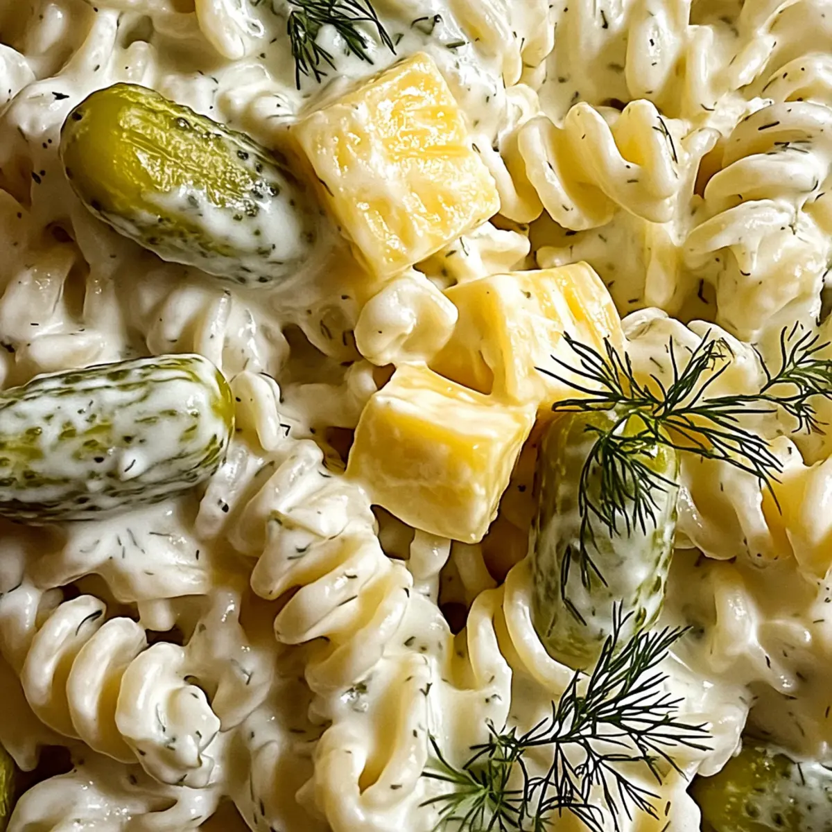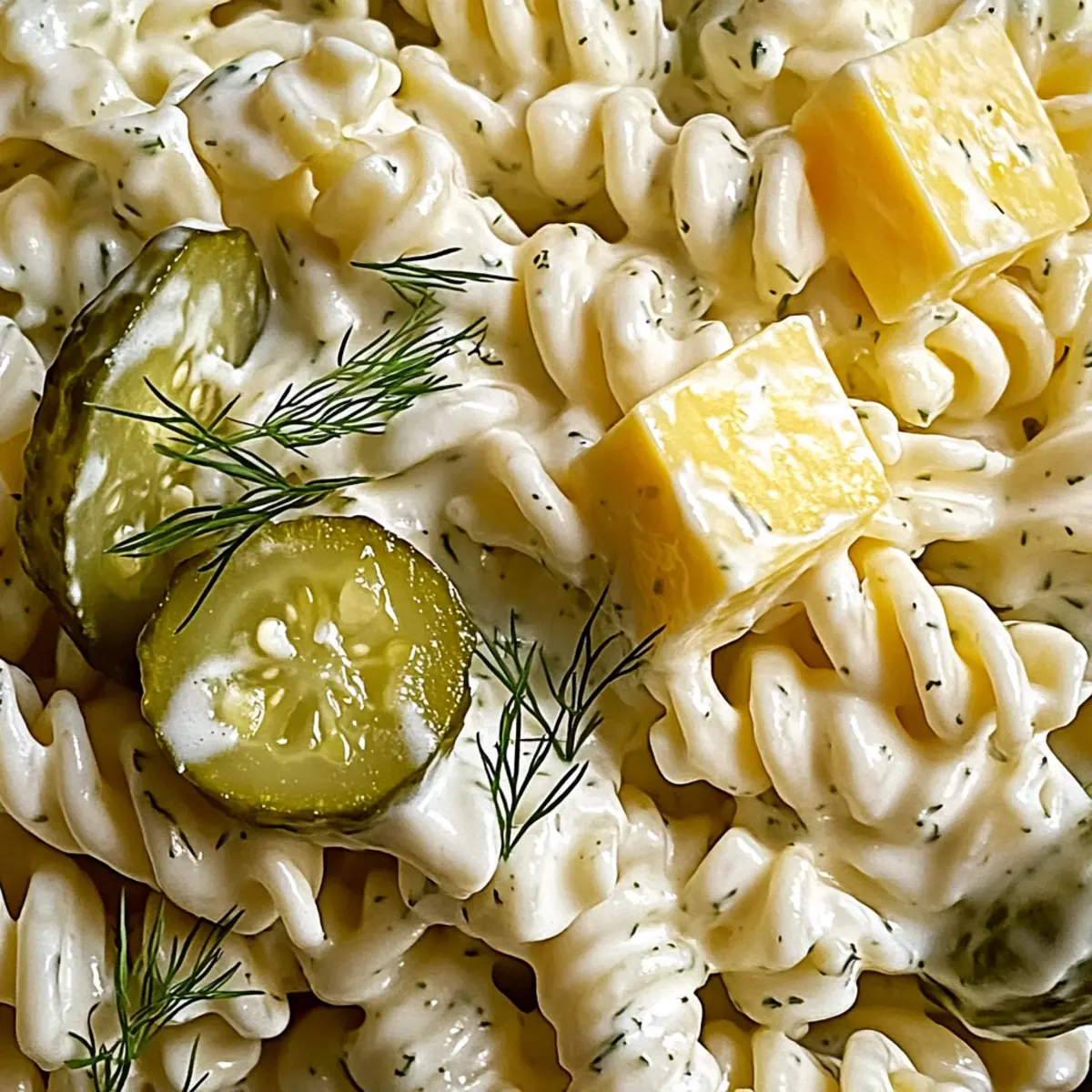 Facebook Twitter Pinterest LinkedInThere’s something truly magical about a pasta salad that captures the essence of summer. As I sat on my porch with a refreshing drink, I reminisced about sun-soaked picnics filled with laughter and joy, where my family’s favorite dish took center stage: Dill Pickle Pasta Salad. This creamy, tangy delight marries the satisfying texture of rotini with the delightful crunch of baby dill pickles, making it an irresistible addition to any potluck or barbecue. What makes this salad even better is its quick preparation—perfect for busy summer days—and the way it elevates comfort food into a vibrant dish that everyone will love. Curious about how to create this seasonal sensation? Let’s dive into the recipe! Why is Dill Pickle Pasta Salad a Must-Try? Creamy, Tangy Delight: The blend of sour cream and mayonnaise creates a luscious dressing that pairs perfectly with the crunch of dill pickles. Quick and Easy: You’ll love how fast this salad comes together—just boil pasta, mix, and chill! Nostalgic Flavor: It evokes memories of sunny picnics and gatherings, making it a crowd favorite. Versatile Ingredients: Feel free to toss in extras like crispy bacon or colorful veggies according to your preference. Potluck Hit: With its one-of-a-kind taste, this dish is guaranteed to steal the show. Make sure to double the batch if you’re serving a large group! Check out this beautiful Strawberry Caprese Salad as a delightful pairing for your summer spread. Dill Pickle Pasta Salad Ingredients For the Pasta • Rotini Pasta – The spiral shape holds the creamy dressing, ensuring every bite is deliciously coated. For the Dressing • Mayonnaise – A full-fat version provides the richest flavor for a creamy base. • Sour Cream – This adds a tangy richness; it’s optional but highly recommended. • Dill Pickle Juice – Don’t skip this! It adds depth and enhances the dill pickle flavor in your pasta salad. • Salt and Pepper – Essential seasonings to elevate the overall taste of the salad. For the Mix-ins • Baby Dill Pickles – Their crunch and tang are what make this Dill Pickle Pasta Salad irresistible! Use as many as you’d like. • Colby Jack Cheese – Provides creaminess and flavor; feel free to substitute with cheddar for a different twist. • White Onion – Adds a sharp crunch; can be swapped with finely chopped celery if preferred. • Fresh Dill (or Dried) – Enhances the dill flavor profile; fresh is ideal, but use dried if you’re in a pinch. Enjoy assembling this delightful Dill Pickle Pasta Salad, perfect for summer gatherings! Step‑by‑Step Instructions for Dill Pickle Pasta Salad Step 1: Cook Pasta Begin by boiling a large pot of well-salted water. Once the water reaches a rolling boil, add the rotini pasta and cook it according to package instructions until al dente, usually about 8-10 minutes. When done, drain the pasta in a colander and rinse it under cold water to stop cooking, allowing it to cool completely before proceeding. Step 2: Flavor Soak In a large mixing bowl, toss the cooled, drained pasta with ⅓ cup of dill pickle juice. Let the pasta soak in the juice for about 10 minutes, stirring occasionally. This step is crucial as it infuses the pasta with a tangy flavor that enhances the overall taste of your Dill Pickle Pasta Salad. Step 3: Prep Mix-ins While the pasta is absorbing the delicious dill pickle juice, take this time to prepare your mix-ins. Dice the baby dill pickles into small pieces, cube the Colby Jack cheese into bite-sized chunks, and finely chop the white onion. Having everything ready will make the final assembly smooth and quick. Step 4: Combine Ingredients Once the pasta has soaked, add the diced pickles, cubed cheese, and chopped onion to the bowl with the pasta. Using a large spoon, gently mix all the ingredients together until they are evenly distributed. This combination forms the hearty base of your flavorful Dill Pickle Pasta Salad. Step 5: Make Dressing In a separate mixing bowl, whisk together the mayonnaise, sour cream, an additional splash of dill pickle juice, fresh dill, salt, and pepper. Stir well until the mixture is smooth and creamy. This dressing will enhance the pasta salad with a rich creaminess and a delightful tangy flavor, perfectly complementing the crunchy elements. Step 6: Toss Salad Pour the dressing over the pasta and mix-ins in your large bowl. Gently fold the ingredients together, ensuring everything is well-coated with the creamy dressing. Be careful not to break the pasta; you want each piece to remain intact for that perfect texture in every bite. Step 7: Chill Cover the bowl with plastic wrap or a lid and refrigerate the salad for at least 1-2 hours. Chilling allows the flavors to meld together beautifully, making your Dill Pickle Pasta Salad even more delicious when served. When ready to serve, enjoy it chilled for the ultimate refreshing taste, perfect for any summer gathering! What to Serve with Dill Pickle Pasta Salad Transform your summer meal into a delightful feast, complementing that creamy, tangy dish with perfect sides! Grilled Chicken Skewers: Juicy and flavorful, these skewers add protein and pair beautifully with the tanginess of the salad. Classic Potato Chips: Their crunch and lightly salted flavor create a satisfying contrast, making for a classic summer combo. Caprese Salad: Fresh tomatoes and mozzarella bring vibrant flavors to the table, balancing the richness of the pasta salad while adding colorful appeal. Roasted Corn on the Cob: Sweet and smoky, this summer favorite offers sweetness and texture, enhancing each bite of your meal. Watermelon Feta Salad: A refreshing, juicy salad with a hint of saltiness from feta, it’s perfect for hot days and complements the tang of the dill pickle salad. Lemonade or Iced Tea: A cool drink to wash it all down enhances the summer vibe, as both provide a refreshing, citrusy punch. Brownie Bites: For a sweet f