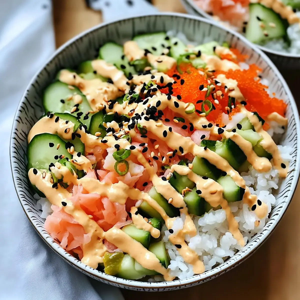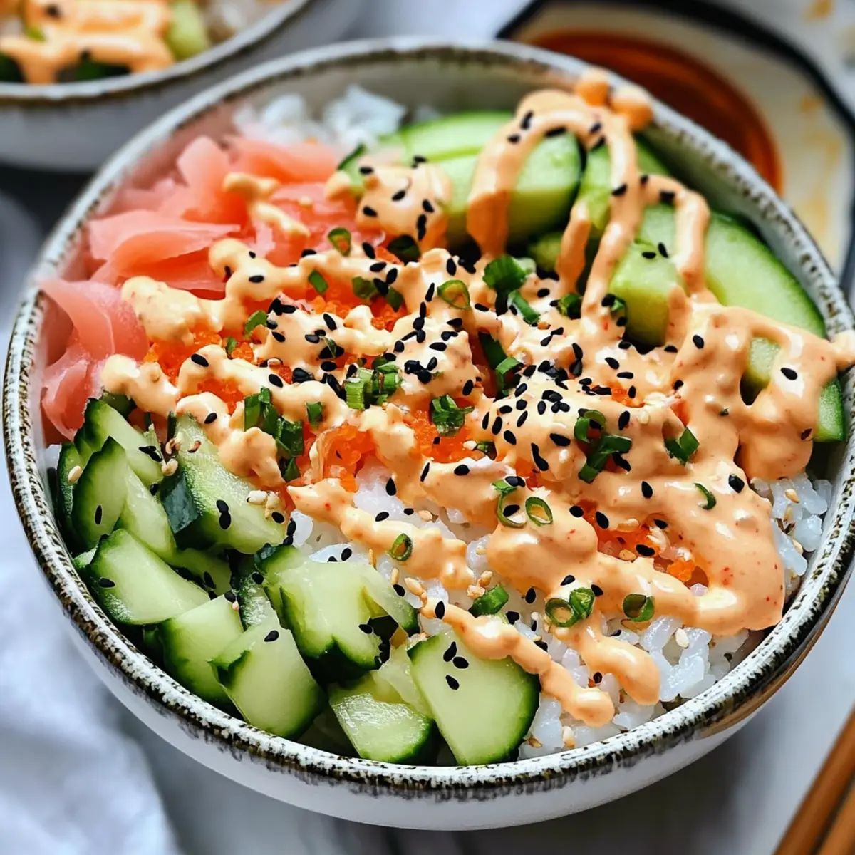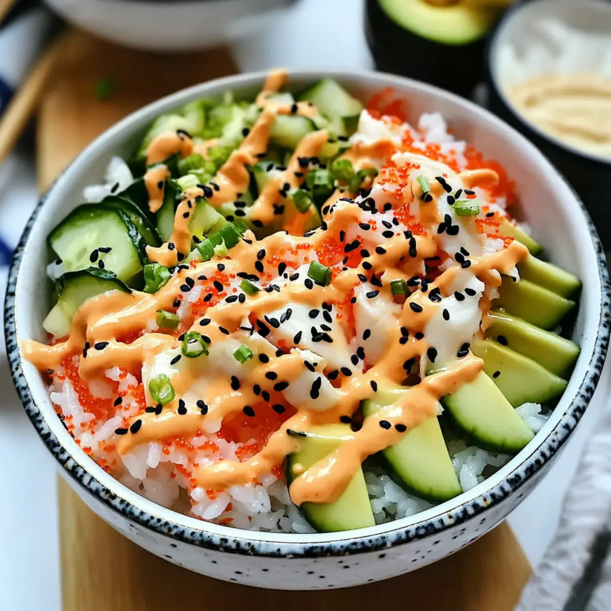 Facebook Twitter Pinterest LinkedInAs I set my sights on an effortlessly delicious meal, a wave of inspiration hit me: Easy California Roll Sushi Bowls. These vibrant bowls are not just a quick meal; they’re a delightful twist on sushi that you can whip up in 30 minutes! Each bowl boasts creamy avocado, crunchy cucumber, and your choice of tender crab or tofu atop perfectly seasoned sushi rice, creating a satisfying blend of textures and flavors. What’s more, these bowls are completely customizable—substitute ingredients to cater to your cravings or dietary needs. Whether you’re seeking a light lunch or a refreshing dinner option, these sushi bowls bring the joy of homemade dining to your table in no time. Curious about how to bring this sushi-inspired delight to life? Let’s dive in! Why Try Easy California Roll Sushi Bowls? Simplicity: In just 30 minutes, you can enjoy a homemade meal that impresses without requiring sushi-making skills. Customizable: Personalize each bowl with your favorite proteins like tofu or shrimp, plus any veggies you fancy—it’s your sushi twist! Fresh Ingredients: Packed with vibrant flavors and textures, these bowls feature creamy avocado and crunchy cucumber for a nourishing meal. Crowd-Pleasing: Whether for a family dinner or a gathering, these bowls are sure to delight everyone’s palate, just like my Hawaiian Roll French dish! Versatile: Pair with a drizzle of soy sauce or spicy mayo for an extra kick, or keep it light and fresh for a satisfying lunch. Take the leap into a sushi-inspired meal that will have you coming back for seconds! Easy California Roll Sushi Bowls Ingredients Transform your kitchen into a sushi haven with these delightful ingredients! For the Sushi Rice Sushi Rice – Essential for the perfect texture; opt for Japanese short-grain rice for the best results. Rice Vinegar – Adds the necessary acidity; it beautifully balances the flavors of the rice. Sugar – Provides a hint of sweetness; adjust to your liking or omit for a less sweet base. Salt – Ensures the rice is well-seasoned; don’t skip this vital ingredient! For the Protein Imitation Crab or Real Crab Meat – Choose based on your dietary preference; crab adds a delicious umami flavor. Tofu – A great vegetarian alternative, soak it in soy sauce for extra flavor before using. For the Fresh Veggies Cucumber – Brings crispness and freshness; feel free to substitute with zucchini or bell pepper for variety. Avocado – Adds creaminess; use ripe ones and a splash of lemon juice to keep them vibrant. For Toppings and Sauce Soy Sauce – Enhances umami; swap with tamari for a gluten-free option. Sriracha (optional) – For those who love a spicy kick; drizzle it over your bowl or mix it with the soy sauce. Sesame Seeds/Nori Strips (optional) – Sprinkle on top for added texture and depth of flavor. Gather these fresh ingredients for your Easy California Roll Sushi Bowls, and get ready to enjoy a delicious and customizable meal! Step‑by‑Step Instructions for Easy California Roll Sushi Bowls Step 1: Prepare Sushi Rice Begin by rinsing 1 cup of sushi rice under cold water until the water runs clear, which helps remove excess starch. In a medium saucepan, combine the rinsed rice with 1.5 cups of water. Bring to a boil over medium-high heat, reduce the heat to low, cover, and simmer for about 18 minutes until all the water is absorbed. Once cooked, remove from heat and let it sit for 10 minutes with the lid on to finish steaming. Step 2: Season Rice In a mixing bowl, combine 3 tablespoons of rice vinegar, 2 tablespoons of sugar, and 1 teaspoon of salt. Transfer the warm sushi rice into the bowl and gently fold the vinegar mixture into the rice with a wooden spatula. Be careful not to mash the rice—you’re aiming for a light, fluffy texture. Let the seasoned rice cool to room temperature while preparing the other ingredients. Step 3: Chop Vegetables While the rice cools, it’s time to prepare the fresh vegetables for your Easy California Roll Sushi Bowls. Slice 1 cucumber into thin strips for a refreshing crunch, and carefully dice 1 ripe avocado into bite-sized pieces. Keep the avocado covered with a sprinkle of lemon juice to prevent browning and maintain its vibrant color until assembling your bowls. Step 4: Assemble Bowls Grab your favorite serving bowls, and start by adding a generous layer of sushi rice at the bottom of each bowl, ensuring an even spread. Next, artistically arrange the cucumber strips and avocado pieces on top of the rice. For a protein-rich addition, sprinkle shredded imitation crab or real crab meat generously over the layered vegetables, creating a colorful and inviting presentation. Step 5: Drizzle Sauce In a small bowl, mix together soy sauce and a few dashes of sriracha (if you like some heat) until well combined. Drizzle this flavorful sauce liberally over each assembled bowl, adding both umami and a bit of spice. For an extra touch, you can also sprinkle sesame seeds or crumbled nori strips on top for added texture and flavor. Step 6: Serve Immediately Your Easy California Roll Sushi Bowls are now ready to enjoy! Serve them fresh for the best flavor and texture, allowing everyone to dive into their own vibrant bowl. Pair with pickled ginger and wasabi on the side for an authentic sushi experience, if desired. Enjoy your delicious creation that bursts with freshness and flavor! Make Ahead Options These Easy California Roll Sushi Bowls are perfect for meal prep, saving you time during busy weeknights! You can prepare the sushi rice up to 3 days in advance. Simply cook and season the rice, then refrigerate it in an airtight container to maintain its texture and flavor. The vegetables, like cucumber and avocado, are best sliced just 1-2 hours before serving to maintain their freshness—toss the avocado in lemon juice to prevent browning. When you’re ready to enjoy your sushi bowls, simply layer the rice with your chosen toppings, d