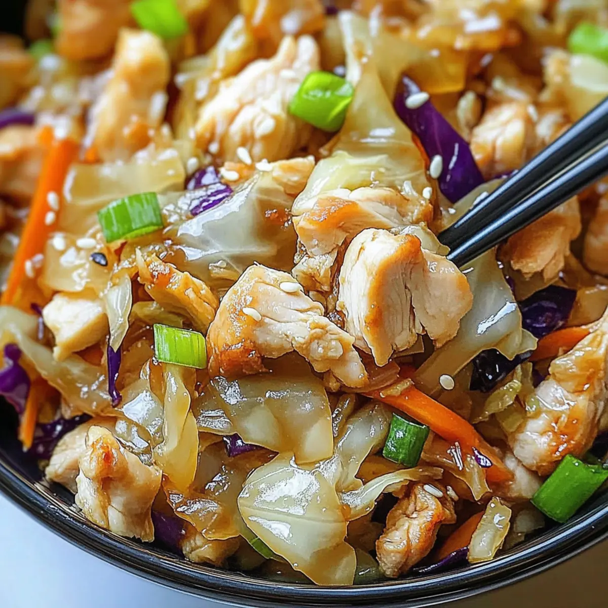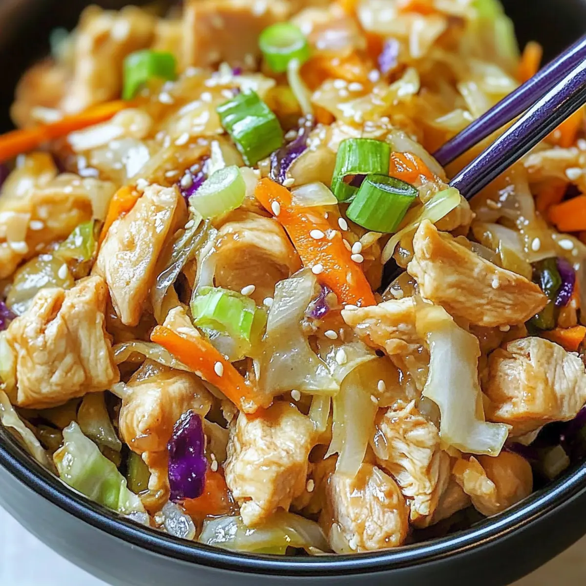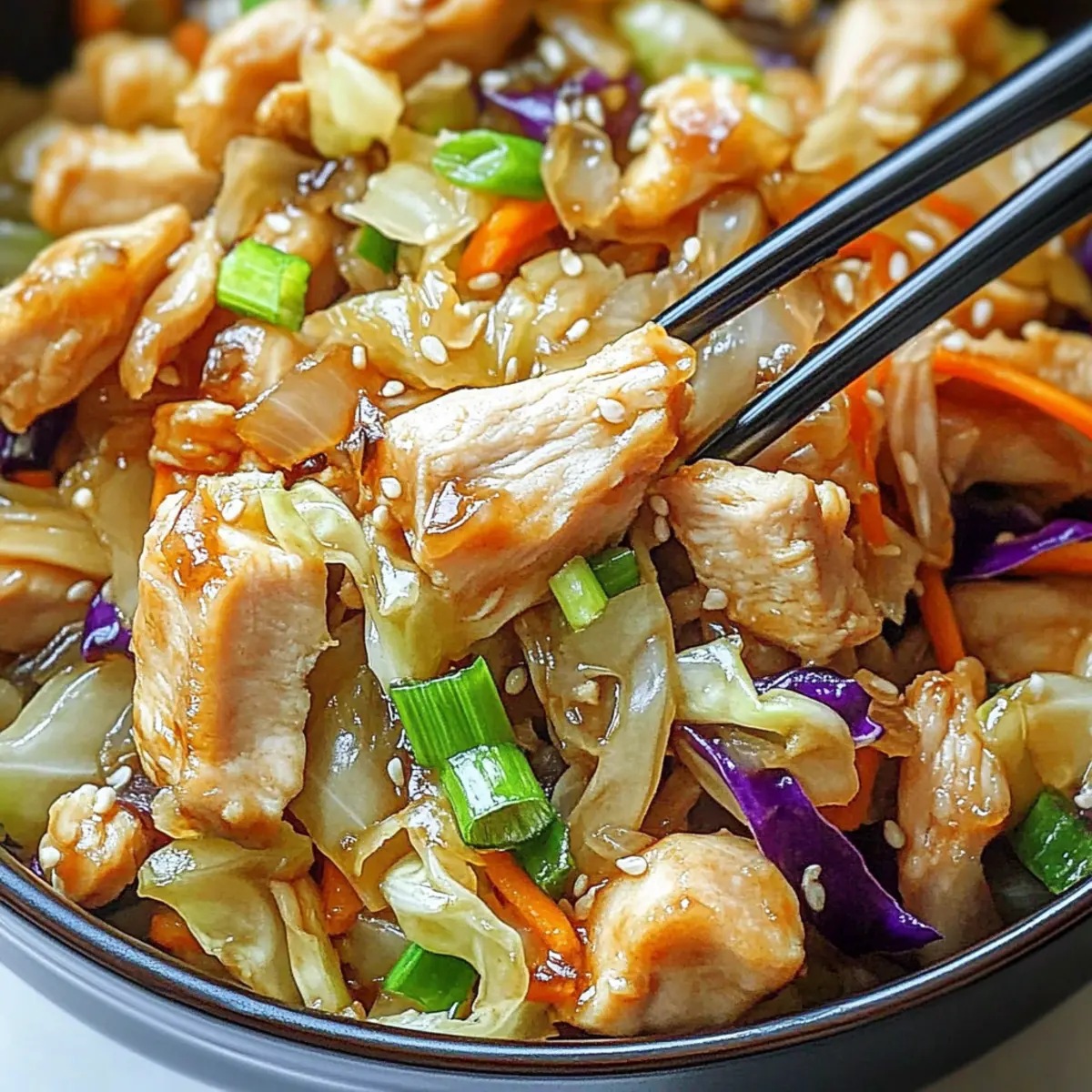 Facebook Twitter Pinterest LinkedInAs the clock ticks toward another hectic weeknight dinner, a savory aroma dances through my kitchen, transforming it into a cozy retreat. This Egg Roll Bowl with Chicken and Cabbage is my secret weapon for those nights when takeout tempts but homemade goodness wins my heart. Ready in just 10 minutes, it’s a quick meal that marries the delightful crunch of fresh vegetables with protein-packed chicken, ensuring each bite feels both satisfying and nutritious. What’s even better? This recipe is highly customizable, allowing you to swap in your favorite proteins or veggies, making it a breeze to suit any palate or dietary need. The joy of creating a wholesome, flavorful dish has never been easier! Curious about how to whip up this deliciously simple meal? Let’s get cooking! Why Choose Egg Roll Bowls? Quick, Delicious Meal: In just 10 minutes, you can create a mouthwatering dish that rivals takeout! Customizable Options: You can easily swap proteins like chicken for tofu, catering to different dietary preferences. Nutritious Ingredients: Packed with fresh vegetables like cabbage and carrots, this recipe supports healthy eating without sacrificing flavor. Crowd-Pleasing Appeal: Whether you’re cooking for yourself or a group, everyone will love this comforting bowl that’s both familiar and innovative. Minimal Cleanup: One skillet means less mess, making this a time-saver for any busy night. If you’re looking for more quick meals, try these Sausage Egg Cheese Breakfast Roll-Ups or Buffalo Chicken Mac. Egg Roll Bowls with Chicken and Cabbage Ingredients Get ready to savor every bite of this delicious dish! For the Chicken • Chicken Breast – Provides protein; substitute with firm tofu or tempeh for a vegetarian option. For the Vegetables • Shredded Cabbage (4 cups) – Adds crunch and volume; mix green and purple cabbage for a vibrant look. • Grated Carrots (1 cup) – Contributes sweetness and color; fresh carrots work best for this dish. • Green Onions (3, chopped) – Adds a fresh onion flavor; can substitute with shallots if desired. • Garlic (3 cloves, minced) – Enhances flavor depth; freshly minced is preferred for the best aroma. For Seasoning • Soy Sauce (2 tbsp) – Provides umami and saltiness; use tamari for a gluten-free option. • Sesame Oil (1 tbsp) – Adds a nutty flavor; olive oil can be substituted, but expect a different taste. • Ground Ginger (1 tsp) – Provides warm spice; freshly grated ginger can elevate the flavor further. • Salt and Pepper – To taste; adjust according to preference. Optional Toppings • Sesame Seeds – Sprinkle them on for an extra crunch and appeal. • Fresh Cilantro – Adds a refreshing touch that enhances flavor. • Sriracha – For those who crave a little heat; drizzle it on top! These Egg Roll Bowls with Chicken and Cabbage are ready to please every palate and are perfect for a quick meal that doesn’t skimp on flavor! Step‑by‑Step Instructions for Egg Roll Bowls with Chicken and Cabbage Step 1: Heat Oil In a large skillet, pour in 1 tablespoon of sesame oil and heat over medium-high heat for about 1 minute. You’ll know it’s ready when the oil starts to shimmer slightly. Using a non-stick skillet works best to prevent sticking and ensure even cooking, setting the stage for your Egg Roll Bowls. Step 2: Cook Chicken Add diced chicken breast to the hot skillet, spacing it out for even cooking. Season the chicken with a pinch of salt and pepper, cooking for 5–7 minutes. Stir occasionally, ensuring all sides become golden brown and crispy. The chicken should be fully cooked and no longer pink inside when ready. Step 3: Add Vegetables Once the chicken is cooked, stir in 3 minced garlic cloves, 4 cups of shredded cabbage, 1 cup of grated carrots, and 3 chopped green onions. Cook this colorful mixture for another 3–5 minutes, stirring frequently until the cabbage softens but remains crisp. The vibrant colors will make your Egg Roll Bowls irresistible. Step 4: Season Pour 2 tablespoons of soy sauce and add 1 teaspoon of ground ginger into the skillet. Mix thoroughly to combine all flavors and coat the vegetables and chicken evenly. Continue cooking for another 1-2 minutes, allowing the sauce to caramelize slightly and enhance the flavors in your bowl. Step 5: Taste and Adjust Take a moment to taste your delicious creation! If you prefer, adjust the seasonings by adding more salt, pepper, or ginger to suit your palate. This step is vital to ensure your Egg Roll Bowls are perfectly seasoned and just right for you. Step 6: Serve Finally, remove the skillet from heat and prepare to serve your Egg Roll Bowls hot. Spoon the mixture into vibrant bowls, and consider adding optional toppings like sesame seeds, fresh cilantro, or a drizzle of Sriracha for extra flavor. The presentation will make this meal even more delightful! Make Ahead Options These Egg Roll Bowls with Chicken and Cabbage are perfect for meal prep enthusiasts! You can chop the vegetables and marinate the chicken up to 24 hours in advance, storing them in airtight containers to maintain freshness (this prevents browning and retains crispness). If you prefer, the fully cooked dish can be refrigerated for up to 3 days; just allow it to cool before transferring it to your container. When you’re ready to serve, simply reheat the mixture in a skillet over medium heat for a few minutes, stirring in a splash of soy sauce to bring it back to life. Enjoy restaurant-quality Egg Roll Bowls with minimal effort on busy weeknights! Storage Tips for Egg Roll Bowls Fridge: Store leftover Egg Roll Bowls in airtight containers for up to 3 days to maintain freshness. Freezer: For longer storage, freeze portions in airtight containers for up to 3 months. This allows you to enjoy this quick meal at a later date. Reheating: When ready to eat, thaw frozen bowls in the fridge overnight. Reheat in a skillet over medium heat for 5-7 minut