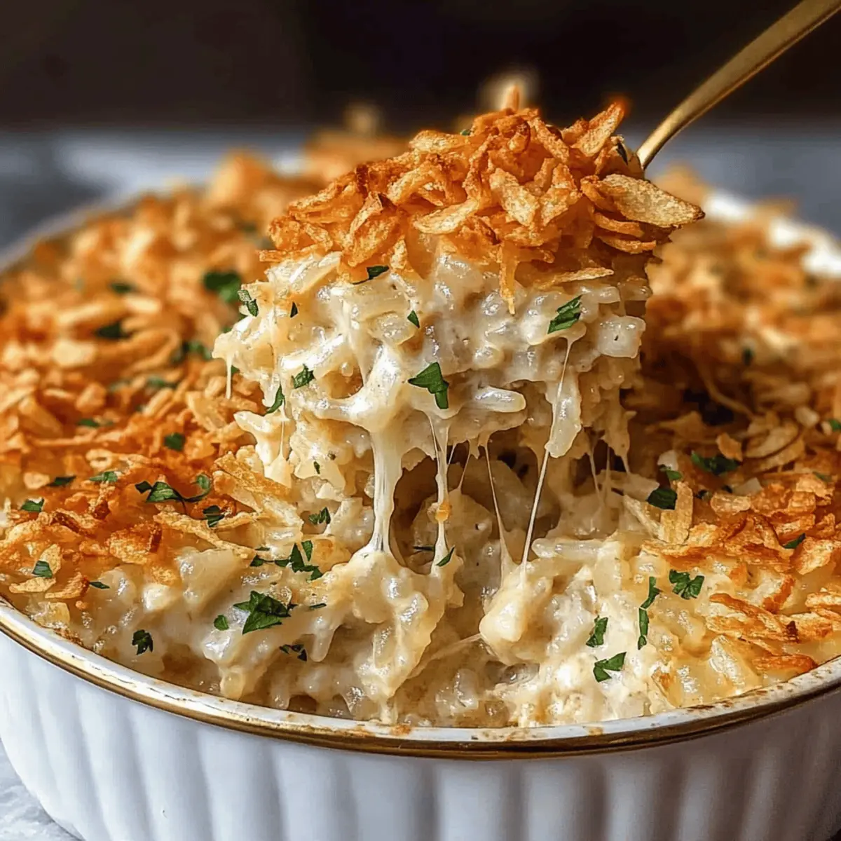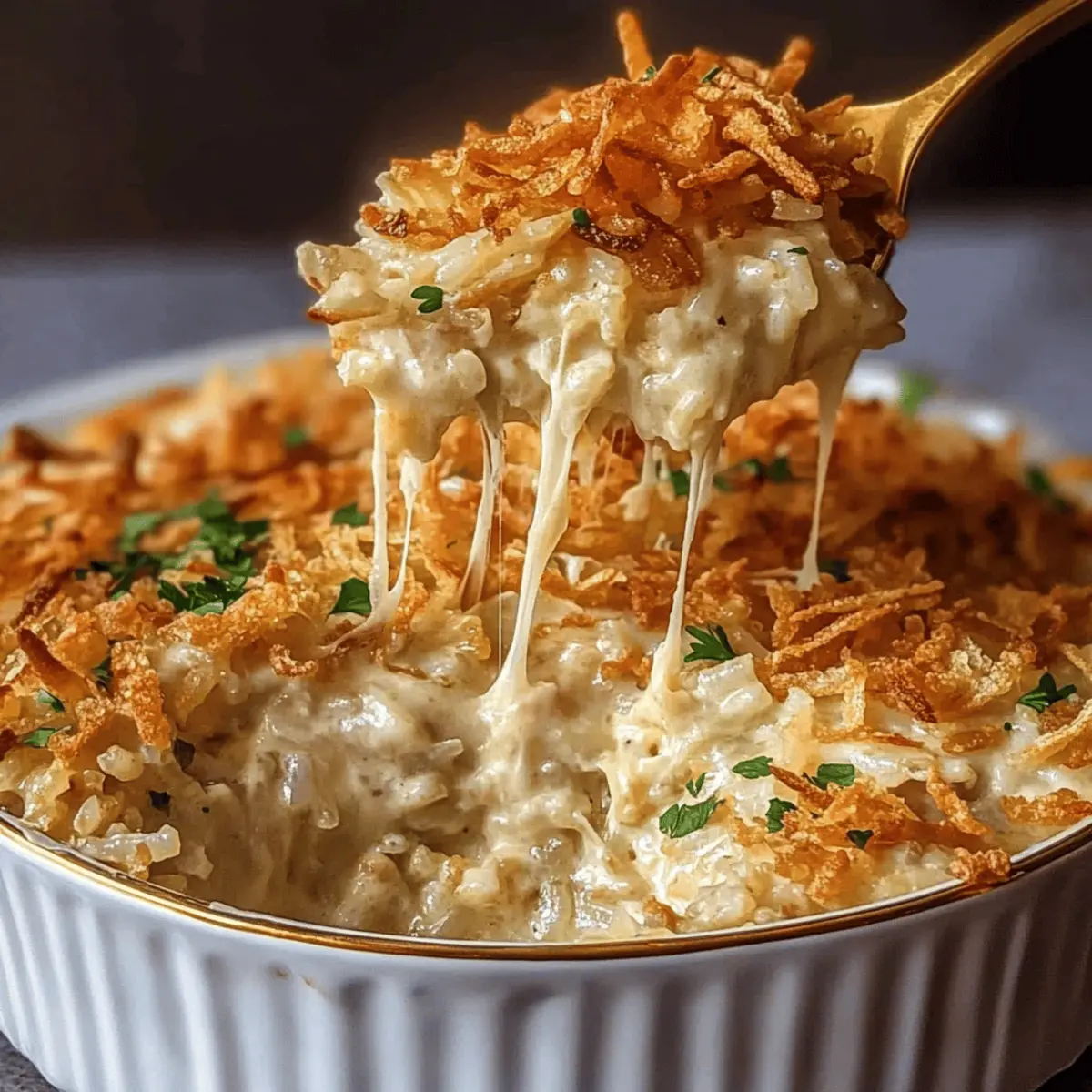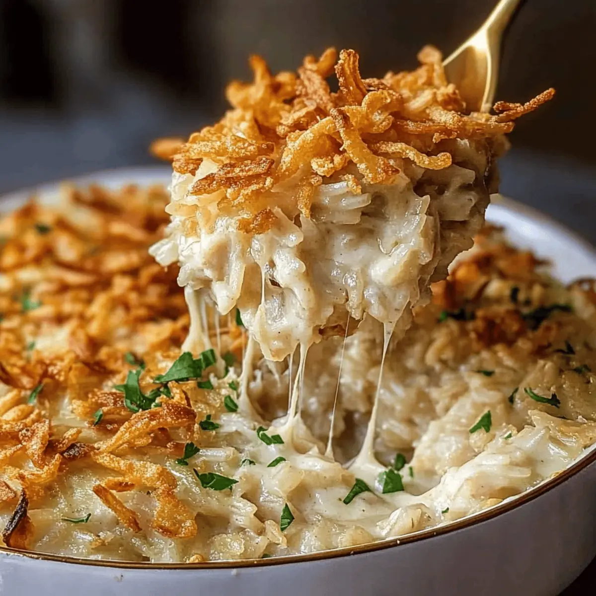 As I stirred together the comforting ingredients for my French Onion Chicken Rice Bake, the warm, savory aroma wafted through the kitchen, igniting memories of cozy family gatherings. This delightful casserole combines tender chicken, creamy soups, and a perfect blend of spices, all topped with crispy French fried onions that take it to the next level. Not only is this dish a total crowd-pleaser, but it’s also quick and easy to whip up, making it ideal for those busy weeknights when you just need something satisfying. Trust me, once you serve this dish, you’ll have everyone asking for seconds. Are you ready to create a new family favorite? Why is this casserole perfect for families? Comforting and Familiar: This French Onion Chicken Rice Bake combines classic flavors that everyone loves, making it a go-to recipe for family dinners. Quick Preparation: With straightforward steps, you can have this delicious dish in the oven in no time, allowing you to enjoy more moments with your loved ones. Customizable to Your Taste: Feel free to swap in turkey for chicken or try a vegetarian version with cream of mushroom soup for added variety. Crowd-Pleasing Flavor: The combination of creamy soups and crispy onions creates a taste sensation that keeps everyone coming back for more. Filling and Sustaining: Packed with protein and veggies, this casserole is a wholesome choice to satisfy those hearty appetites! Pair it with a vibrant green salad, and you’ve got a well-rounded meal the whole family will adore! For more family-friendly options, check out my recipes for Bbq Chicken Rice and Chicken Scampi Rice. French Onion Chicken Rice Bake Ingredients For the Casserole • Cooked White Rice – Provides bulk and structure to the casserole. Substitute with brown rice for nuttiness and added fiber. • Shredded Cooked Chicken – Adds protein and heartiness. Use rotisserie chicken or any leftover cooked turkey for convenience. • Cream of Chicken Soup – Acts as a creamy binder with rich flavor. Low-sodium or homemade alternatives can be used but may alter texture slightly. • French Onion Soup – Infuses the casserole with its classic, rich onion flavor. • Sour Cream – Adds creaminess and balances flavor. For a dairy-free alternative, substitute with dairy-free yogurt. • Shredded Cheese (Mozzarella or Swiss) – Provides a melty, creamy texture. Choose mozzarella for a milder taste or Swiss for a nuttier flavor. • French Fried Onions – Adds a crispy topping and robust onion flavor. These should be divided for sprinkling on top and within the casserole. • Garlic Powder & Onion Powder – Enhances savory flavors; the combination brings depth to the dish. • Salt & Black Pepper – For seasoning to taste. • Chopped Parsley – Fresh garnish to add color and brightness upon serving. Enjoy making this comforting French Onion Chicken Rice Bake, perfect for family gatherings! Step‑by‑Step Instructions for French Onion Chicken Rice Bake Step 1: Preheat and Prepare Begin by preheating your oven to 350°F (175°C). This temperature is perfect for baking the French Onion Chicken Rice Bake to perfection. While the oven heats up, gather your ingredients and prepare a large mixing bowl. Make sure you have everything at hand to ensure a smooth and enjoyable cooking experience! Step 2: Combine the Ingredients In the large bowl, mix together the cooked white rice, shredded cooked chicken, cream of chicken soup, French onion soup, sour cream, and shredded cheese. Add 1 cup of French fried onions along with garlic powder, onion powder, salt, and black pepper. Stir thoroughly until everything is well combined and the mixture has a creamy texture, showcasing the flavor-packed components of your casserole. Step 3: Transfer to Baking Dish Once your mixture is well incorporated, take a greased 9×13-inch baking dish and transfer the mixture into it. Use a spatula to spread the mixture evenly across the dish, ensuring every corner is filled. This step is crucial for achieving uniform cooking and a deliciously crispy top layer on your French Onion Chicken Rice Bake. Step 4: Bake the Casserole Place your baking dish in the preheated oven and bake uncovered for about 30 minutes. You’ll know it’s ready when the edges are bubbling and the center is hot. This is your cue that the flavors are merging beautifully and it’s almost time for that crispy, comforting layer to be added on top. Step 5: Add the Crispy Topping After 30 minutes, take the casserole out of the oven and sprinkle the remaining ½ cup of French fried onions on top. This will provide a delightful crunch when baked. Return the dish to the oven for an additional 5 minutes, or until the onions are golden brown and toasty, adding that irresistible texture to your French Onion Chicken Rice Bake. Step 6: Garnish and Serve Once baking is complete, carefully remove the casserole from the oven. Let it cool slightly before garnishing with freshly chopped parsley for a touch of brightness. Serve hot to your family and friends, and watch their faces light up with delight as they dig into this comforting dish! Make Ahead Options These French Onion Chicken Rice Bake preparations are perfect for meal prep enthusiasts looking to save time! You can assemble the entire casserole up to 24 hours in advance by mixing all the ingredients as per the recipe and transferring them to your greased 9×13-inch baking dish. Just cover tightly with plastic wrap and refrigerate until you’re ready to bake. This not only saves time but allows the flavors to meld beautifully. When you’re ready to serve, simply remove the wrap and bake in a preheated oven as directed, possibly adding an extra few minutes if baked straight from the fridge. Enjoy the comforting taste, just as delicious as when freshly made! French Onion Chicken Rice Bake Variations Invite your taste buds on an exciting journey as you explore these delightful twists on the classic casserole! Turkey Upgrad
