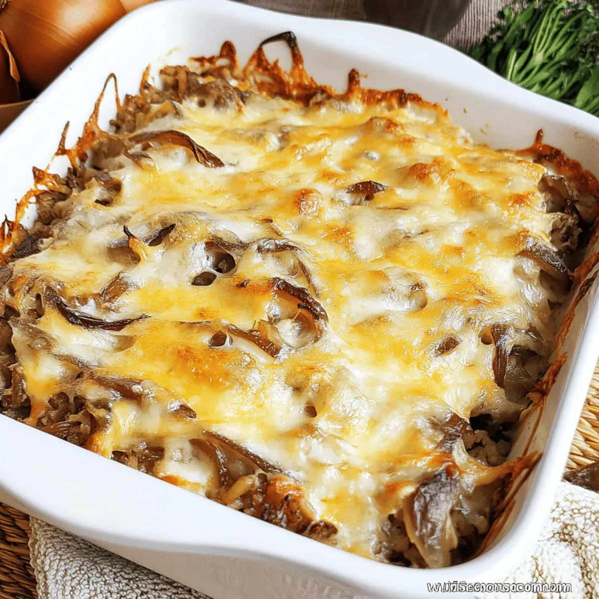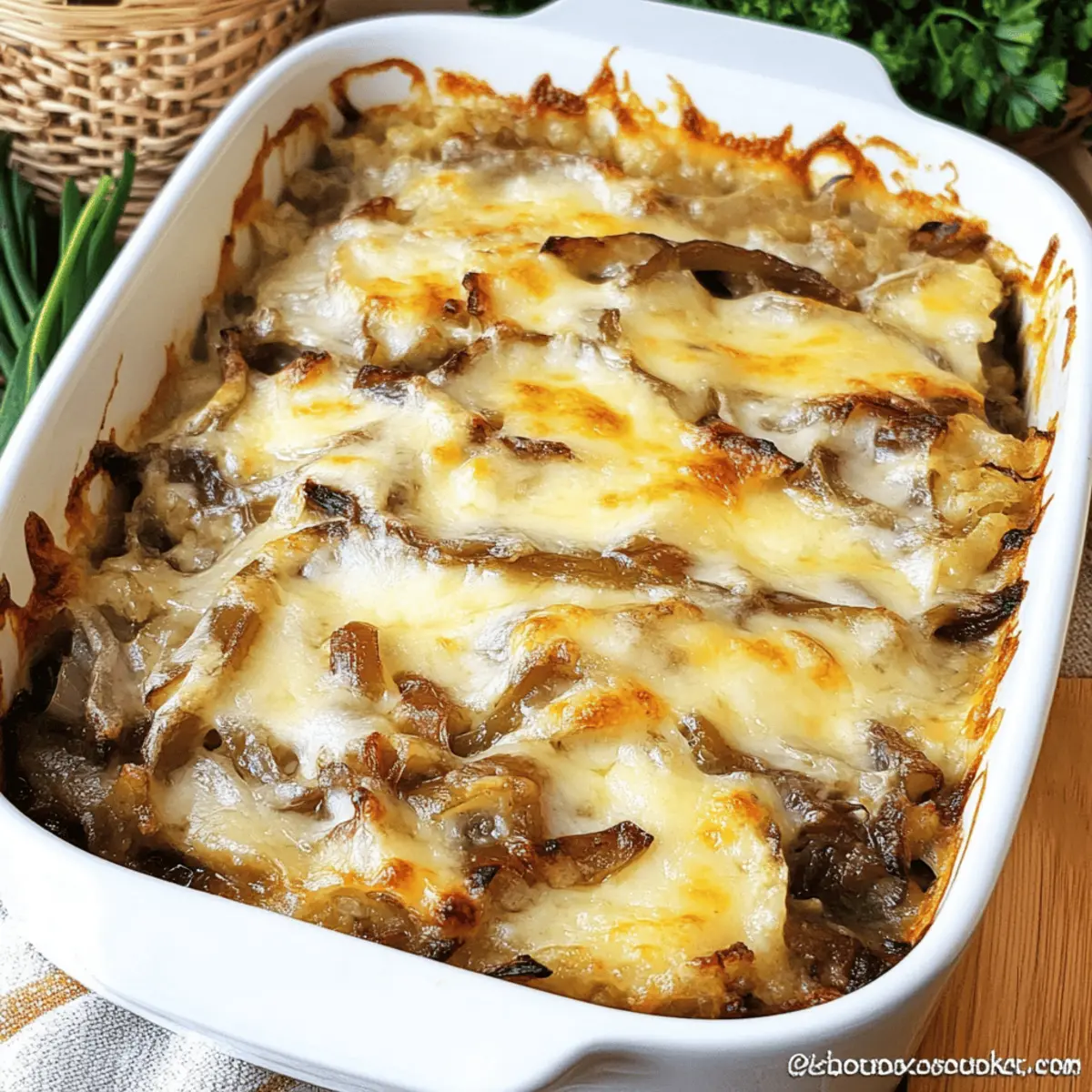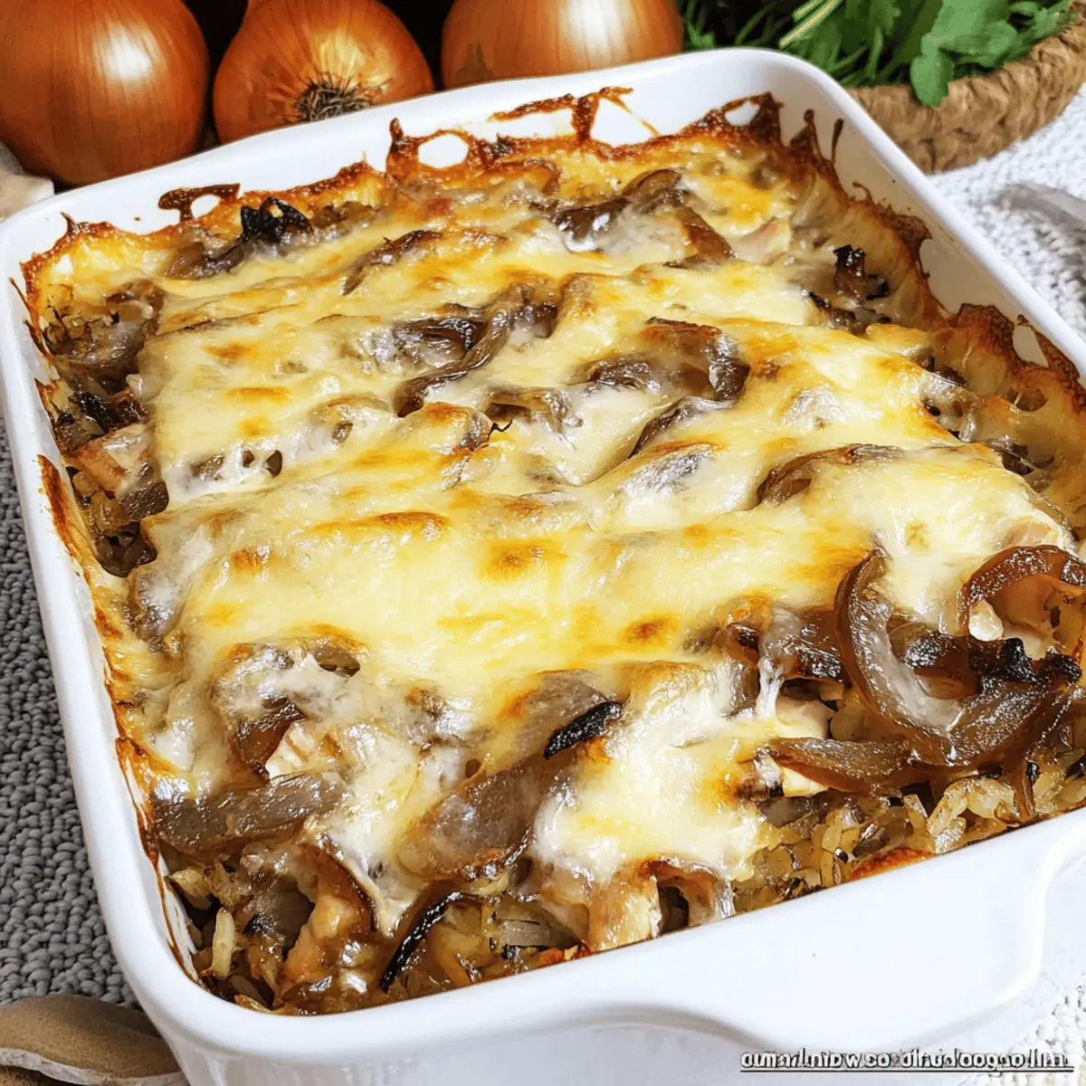 As I stood by the stove, the sweet aroma of caramelized onions enveloped the kitchen, instantly whisking me away to a cozy bistro in Paris. This French Onion Chicken & Rice Casserole combines the heartwarming flavors of classic French onion soup, and let me tell you, it’s the ultimate comfort food that the whole family will love. With tender chicken chunks, fluffy rice, and sautéed mushrooms all baked under a luscious layer of melted Gruyère, this dish is not just a treat for the taste buds but also a quick weeknight meal that will have everyone asking for seconds. Plus, it’s an impressive way to elevate any casual dinner gathering. So, why not bring a touch of French elegance to your dinner table? What’s your favorite ingredient to make a casserole unforgettable? What makes this casserole extra special? Irresistible Comfort: This French Onion Chicken & Rice Casserole delivers the warm embrace of classic French onion soup and is sure to become your new family favorite. Quick and Easy: With straightforward preparation, it’s perfect for busy weeknights when you crave something hearty without spending hours in the kitchen. Flavor Explosion: The combination of sweet caramelized onions, succulent chicken, and creamy Gruyère cheese creates a mouthwatering symphony of flavors that captivates the taste buds. Customizable Delight: Feel free to swap in your favorite veggies—spinach, mushrooms, or even a dash of your preferred herbs to personalize this delicious dish. Plus, if you’re in the mood for a unique twist, try pairing it with a refreshing side salad for a balanced meal. Perfect for Entertaining: Whether it’s a cozy family dinner or a casual gathering with friends, this casserole is sure to impress and satisfy, just like my Hawaiian Chicken Sheet or Bbq Chicken Rice options. French Onion Chicken & Rice Casserole Ingredients For the Casserole Butter – Adds richness; you can substitute with margarine for a non-dairy option. Extra Virgin Olive Oil – Ideal for sautéing; can be replaced with any light cooking oil. Sweet Onion (3 pounds) – Provides sweetness and depth; substitute with yellow onions if needed. Fresh Garlic (1 tablespoon) – Enhances flavor; fresh is recommended for best results, although garlic powder works in a pinch. Kosher Salt (1.5 teaspoons) – Essential for seasoning; adjust to taste based on dietary preferences. Black Pepper (0.5 teaspoon) – Adds warmth; use white pepper for a milder flavor. Dry Tarragon (1 teaspoon) – Provides a subtle anise flavor; thyme works as a substitute if needed. Dry Thyme (1 teaspoon) – Earthy flavor that complements the dish; fresh can also be used, but adjust the quantity. Brandy or White Wine (0.33 cups) – Adds depth to the flavor profile; can be substituted with extra chicken broth if preferred. Worcestershire Sauce (1 tablespoon) – Contributes umami flavor; look for a vegan version if desired. Button Mushrooms (8 ounces) – Adds earthiness; portobello mushrooms can be used for a heartier texture. White Uncooked Rice (1.5 cups) – Serves as the base for the dish; brown rice can be used but may require an adjustment in cooking time. Baby Spinach (2 cups, packed) – Adds color and nutrition; kale or Swiss chard work as alternatives as well. Chicken Stock (3 cups) – Used for cooking the rice; homemade stock is ideal, but store-bought works just as well. Heavy Cream (1 cup) – Contributes creaminess; half-and-half or non-dairy alternatives can provide a lighter option. Cooked Chicken (3-4 cups) – Torn into bite-sized pieces; rotisserie chicken is a convenient option. Gruyère Swiss Cheese (4 ounces, shredded) – Melting cheese topping; you can substitute with mozzarella or cheddar for different flavor profiles. Bring the warmth of French Onion Chicken & Rice Casserole to your table with these delightful ingredients that come together for a truly unforgettable meal! Step‑by‑Step Instructions for French Onion Chicken & Rice Casserole Step 1: Caramelize the Onions In a large skillet, melt 2 tablespoons of butter along with 2 tablespoons of olive oil over medium-low heat. Add the sliced sweet onions, stirring occasionally, and sauté for about 30-45 minutes until they become deeply caramelized and golden brown. This process requires patience, so keep the heat low to avoid burning and ensure even cooking. Step 2: Add Flavors Once the onions are caramelized, stir in 1 tablespoon of minced garlic, 1.5 teaspoons of kosher salt, 0.5 teaspoon of black pepper, 1 teaspoon of dry tarragon, and 1 teaspoon of dry thyme. Cook for an additional minute to release the flavors, then remove from heat. Off the heat, carefully pour in 0.33 cups of brandy (or white wine) and 1 tablespoon of Worcestershire sauce. Set aside while you prepare the rest of the casserole. Step 3: Sauté the Mushrooms In a separate pot, heat 8 ounces of button mushrooms over medium heat without any fat for 5-10 minutes, allowing them to brown nicely. Once the mushrooms are beautifully browned, add in the remaining 2 tablespoons of butter and 2 tablespoons of olive oil, stirring to combine. Let them sauté for another 2-3 minutes until coated and fragrant. Step 4: Cook the Rice Next, stir in 1.5 cups of white uncooked rice and let it toast for about 5 minutes, mixing constantly to prevent sticking. Then, fold in 2 cups of baby spinach and cook until wilted, which should take about another 2 minutes. Pour in 3 cups of chicken stock, cover the pot, and reduce the heat to low. Simmer for 15 minutes or until the rice is tender and absorbs the liquid. Step 5: Combine Ingredients Once the rice is cooked, stir in 1 cup of heavy cream and 3-4 cups of shredded cooked chicken. Ensure everything is well-combined and heated through, then transfer this rich mixture into a greased casserole dish, spreading it evenly. Step 6: Finish with Onions and Cheese Layer the sautéed caramelized onions on top of the rice mixture in the casserole dish. Then, sprinkle 4 oun