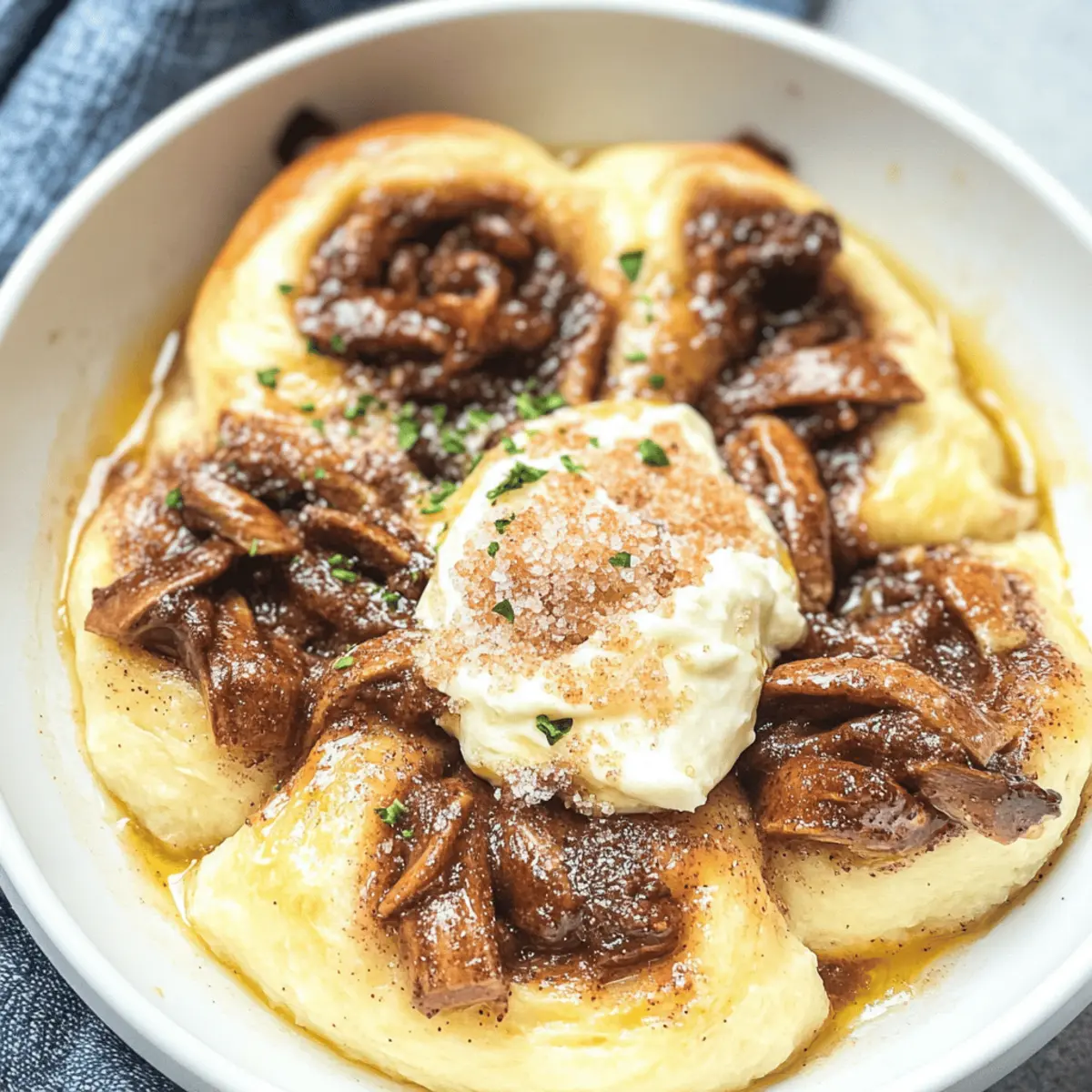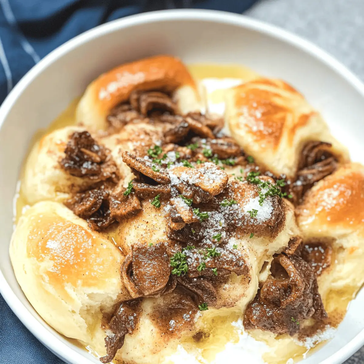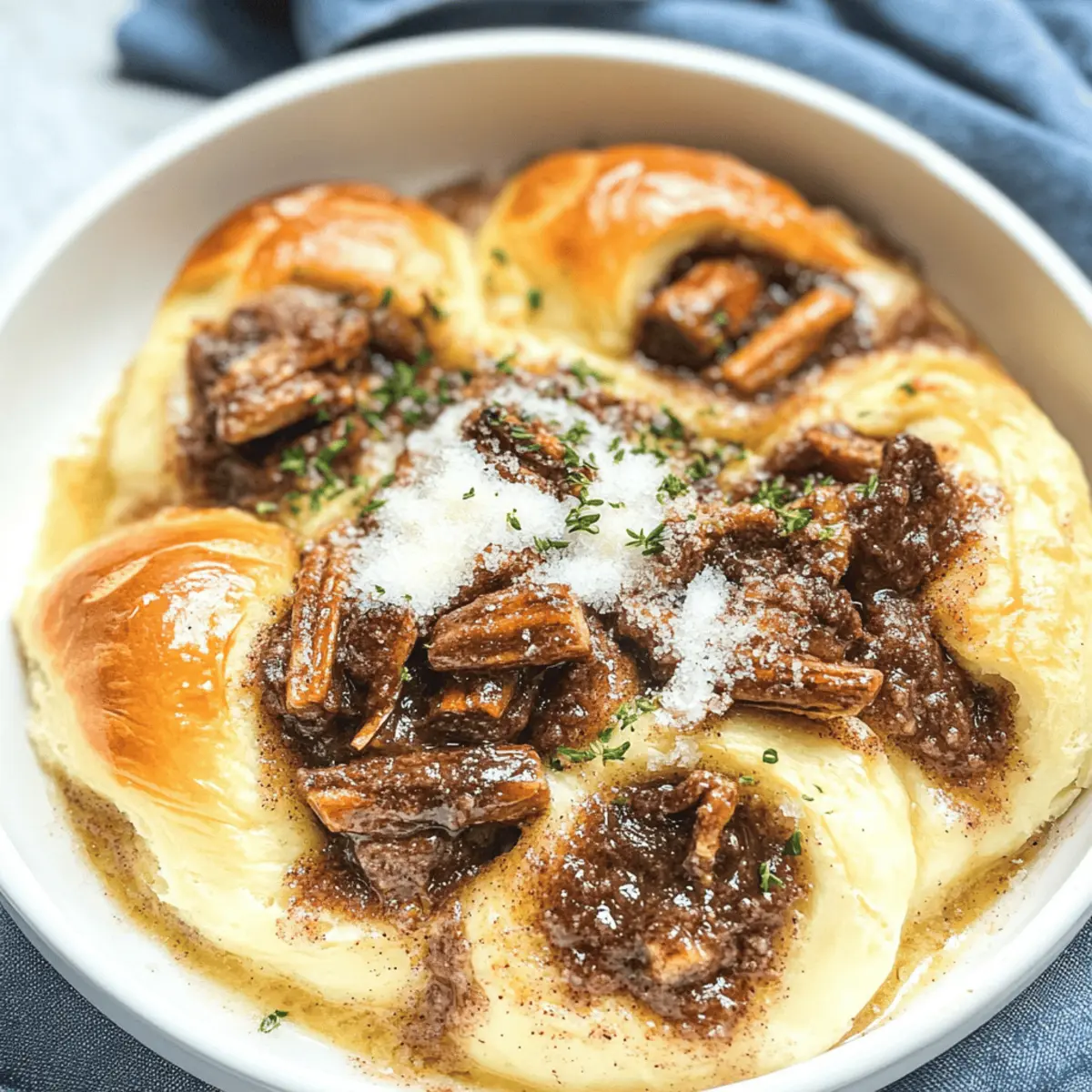 A warm, savory aroma filled my kitchen as I introduced my friends to the delectable sensation of French Onion Pot Roast. This dish, with its tender beef slow-cooked alongside sweet, caramelized onions, transforms any meal into a heartwarming experience. The beauty of this pot roast lies in its simplicity—set it, forget it, and in a few hours, you’ll have a gourmet feast with minimal effort. Not only is it a comforting crowd-pleaser perfect for family dinners, but it’s also freezer-friendly for those busy weeknights when you crave something homemade yet easy. Are you ready to elevate your mealtime with this comforting delight? Let’s dive in! Why is French Onion Pot Roast a Must-Try? Simplicity at Its Best: This recipe requires minimal prep time, allowing you to spend more moments with your loved ones while it slowly cooks to perfection. Savory Richness: The combination of tender beef and sweet, caramelized onions creates an irresistible depth of flavor that will have everyone asking for seconds. Versatile Serving Options: Enjoy it on its own, over mashed potatoes, or even stuffed in a sandwich—there’s no wrong way to savor this dish! Crowd-Pleasing Comfort: Whether it’s a cozy family dinner or a gathering with friends, this French Onion Pot Roast is guaranteed to impress. Freezer-Friendly Delight: Make ahead and freeze for those nights when you want something homemade without the hassle. You’ll appreciate having this comforting meal on hand! French Onion Pot Roast Ingredients For the Roast Beef chuck roast – The perfect cut for slow cooking, yielding tender, melt-in-your-mouth goodness. Onions – Sweet or yellow onions are ideal; they’ll caramelize beautifully, enhancing the dish’s richness. Beef broth – Adds depth and moisture; opt for low-sodium to better manage the saltiness of your dish. Red wine – Incorporate it for an extra layer of flavor; substitute with more broth for a non-alcoholic option. Garlic – Freshly minced garlic brings aromatic warmth to the pot roast experience. Thyme – Adds a lovely herbal note; try using fresh thyme for a more vibrant flavor. Bay leaves – Infuses the dish with a comforting earthiness as it cooks. Salt and pepper – Essential for seasoning; adjust to taste for the perfect balance. For the Optional Garnish Gruyère cheese – Melts wonderfully on top, creating a rich, gooey finish to your pot roast. Fresh parsley – A sprinkle adds color and a fresh herbal kick, brightening up the hearty dish. French Onion Pot Roast is an authentic and hearty dish that will surely become a family favorite! Step‑by‑Step Instructions for French Onion Pot Roast Step 1: Prepare the Onions Start by slicing 2-3 large sweet or yellow onions into thin strips. In a large skillet, melt 2 tablespoons of butter over medium heat. Add the onions, stirring occasionally for about 15-20 minutes until they become deeply caramelized and golden. This step enhances the flavor profile of your French Onion Pot Roast, giving it that delicious sweetness you desire. Step 2: Sear the Beef While the onions are caramelizing, season a 3-4 pound beef chuck roast generously with salt and pepper. In a large Dutch oven, heat 1 tablespoon of olive oil over medium-high heat. Sear the roast on all sides for about 3-4 minutes until it develops a nice brown crust, which locks in the juices and adds depth to your dish. Step 3: Combine Ingredients Once the beef is seared, remove it from the Dutch oven and set aside momentarily. In the same pot, add the caramelized onions and 4 cloves of minced garlic, stirring for another minute. Pour in 1 cup of red wine or additional beef broth, scraping up any delicious brown bits from the pot, which adds incredible flavor to your French Onion Pot Roast. Step 4: Add Braising Liquid Return the beef to the pot, nestling it among the onions. Then pour in 2 cups of beef broth and add 2 sprigs of fresh thyme along with 2 bay leaves. This combination will keep the meat tender while infusing aromatic goodness as it cooks. Bring the mixture to a gentle simmer, ensuring everything is well-combined. Step 5: Slow Cook the Roast Cover the Dutch oven with its lid and transfer it to a preheated oven at 300°F (150°C). Let it braise for about 3-4 hours, or until the beef is fork-tender and easily pulls apart. The low temperature helps maintain moisture in the French Onion Pot Roast, producing an unforgettable dish that you and your guests will love. Step 6: Final Touches Once the pot roast is done, remove it from the oven and let it rest for a few minutes. Discard the bay leaves and thyme stems. If desired, shred the beef into chunks and return it to the juices. For a gourmet finish, sprinkle with grated Gruyère cheese on top, allowing it to melt into a gooey layer of flavor as you serve. Step 7: Serve and Enjoy Plate the delicious French Onion Pot Roast with its rich onion-flavored broth poured over the top. Optionally, garnish with fresh parsley for a pop of color and flavor. This pot roast pairs beautifully with mashed potatoes, crusty bread, or even on its own, making it the ultimate comfort food for any gathering! Variations & Substitutions for French Onion Pot Roast Feel free to put your own spin on this comforting dish and explore exciting variations! Low-Sodium: Use low-sodium beef broth to control your salt intake without sacrificing flavor. Red Wine Alternative: If you prefer not to use wine, replace it with additional beef broth or a splash of balsamic vinegar for a tangy twist. Vegetarian Version: Swap out the beef roast for a hearty portobello mushroom or a combination of root vegetables, ensuring a delightful meatless option. Flavor Boost: Add a tablespoon of Worcestershire sauce for an umami kick that enhances the savory profile of the dish. For a deliciously rich finish, consider pairing the roast with homemade Worcestershire Butter Roast for that extra touch. Herbal Twist: Try incorporating fresh rosemary or marjoram along with th