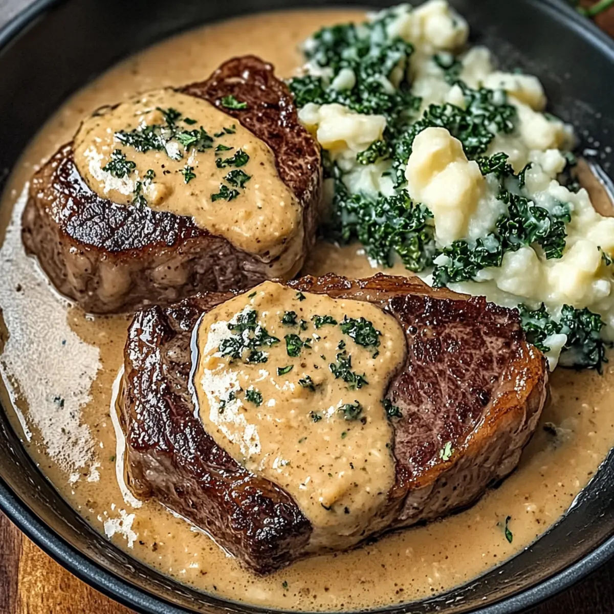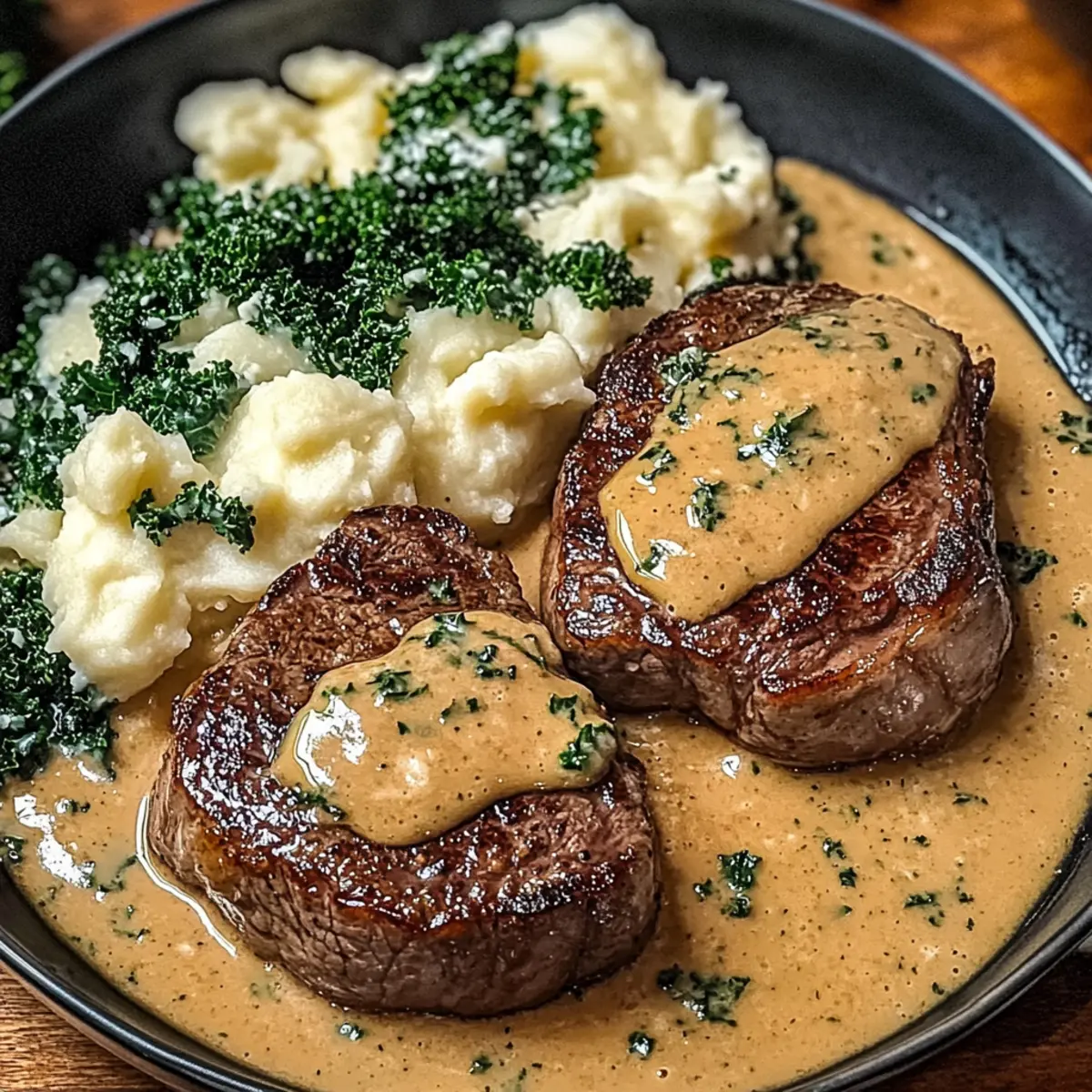 Indulge in Garlic Irish Steaks with Whiskey Cream and Colcannon, a comforting dish that's perfect for cozy gatherings.