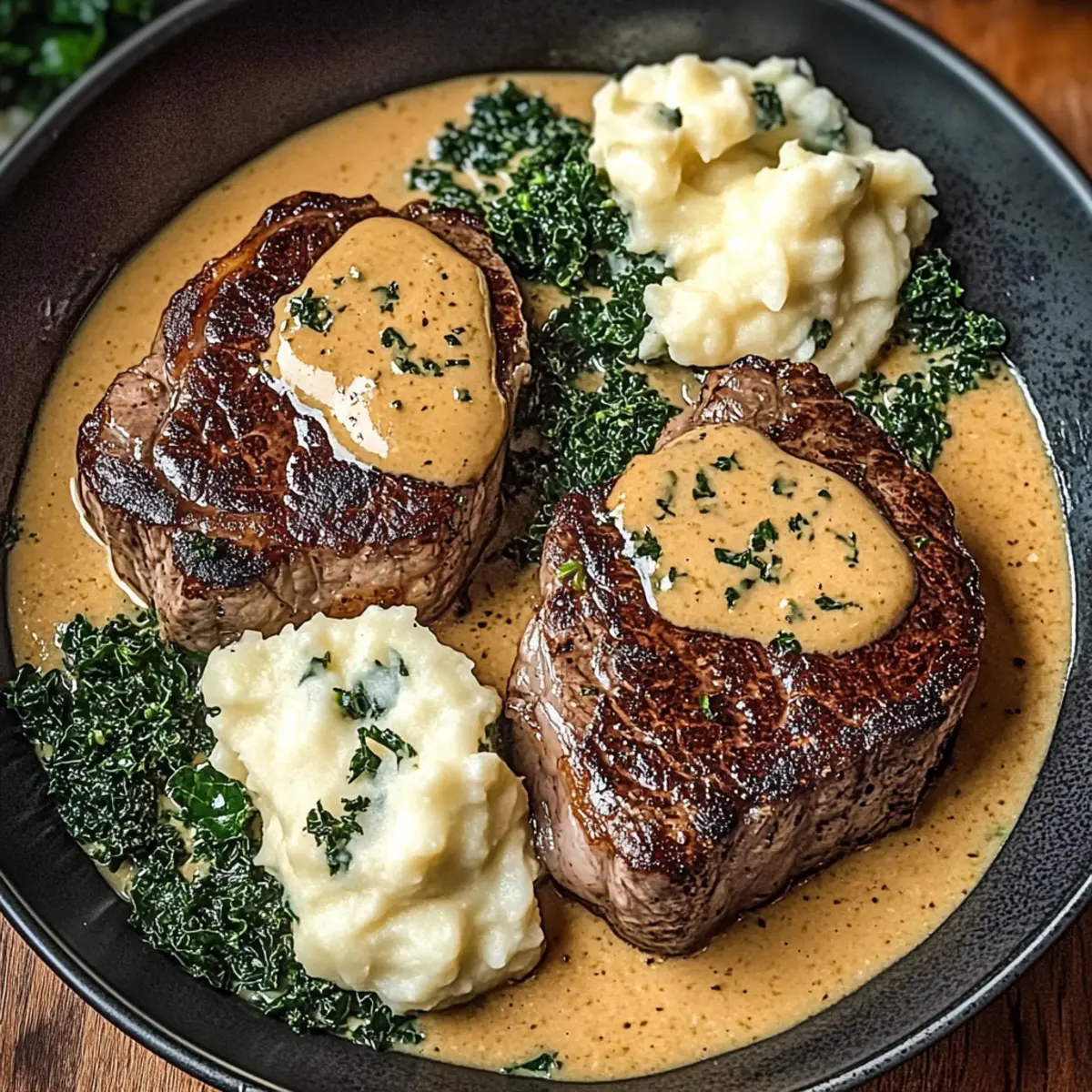 Garlic Irish Steaks with Whiskey Cream and Colcannon Bliss