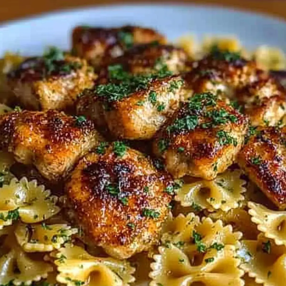 Facebook Twitter Pinterest LinkedInAs I stirred the garlic in sizzling butter, a wave of nostalgia washed over me, reminding me of cozy family dinners from my childhood. The irresistible aroma filled the kitchen, wrapping around me like a warm embrace. This is the magic of Garlic Butter Chicken with Bowtie Pasta—a dish that checks all the boxes for a quick and easy dinner, perfect for those busy weeknights when a burst of flavor is just what you need. It’s not only comforting but also wonderfully adaptable; whether you whip it up in a skillet, slow cooker, or air fryer, you’ll find it to be a delightful dinner option that pleases everyone at the table. As your family digs in, the creamy garlic sauce and tender chicken will have them coming back for seconds, proving that homemade meals can be both simple and heartwarming. Curious about how to bring this aromatic masterpiece to life? Let’s dive in! Why is Garlic Butter Chicken so special? Simplicity: This recipe is incredibly easy to make, perfect for those busy weeknights when you crave a delicious meal without the fuss. Rich Flavor: The combination of garlic and butter creates an irresistible sauce that beautifully coats the chicken and pasta, making every bite a delight. Versatile Options: Whether you prefer slow cooker or air fryer methods, this dish can adapt to your cooking style, ensuring you achieve that comforting taste every time. Crowd-Pleaser: With its rich and savory profile, this dish appeals to everyone at the table—kids and adults alike will be begging for seconds! If you’re in the mood for more comforting ideas, check out my Garlic Roasted Chicken or Chicken Alfredo Pasta for more delicious options! Garlic Butter Chicken with Bowtie Pasta Ingredients For the Chicken Boneless, skinless chicken breasts – juicy and tender, perfect for absorbing the rich garlic butter flavors. Salt and pepper – essential for seasoning; adjusting to your taste enhances the overall dish. For the Pasta Bowtie pasta – playful and fun to eat; you can substitute with any pasta shape for variety. Water – to boil the pasta; make sure it’s well-salted for added flavor. For the Sauce Butter – adds a rich creaminess to the dish; feel free to substitute with olive oil for a lighter option. Fresh garlic – the star ingredient that fills your kitchen with an irresistible aroma; always opt for fresh for the best taste. Parmesan cheese (optional) – for a savory finish; use grated cheese or nutritional yeast for a dairy-free alternative. Optional Add-Ins Red pepper flakes – for a spicy kick; perfect if you want to amp up the heat! Seasonal vegetables (like spinach or asparagus) – adds nutrition and colorful appeal to your dish. Fresh herbs (like basil or parsley) – a delightful way to enhance flavor and freshness. Get ready to savor the comforting magic of Garlic Butter Chicken with Bowtie Pasta! Step‑by‑Step Instructions for Garlic Butter Chicken with Bowtie Pasta Step 1: Cook the Garlic In a large skillet, melt 4 tablespoons of butter over medium heat, allowing it to bubble slightly. As the butter sizzles, add 4 minced garlic cloves and sauté for about 1-2 minutes until fragrant and golden, but be careful not to let them burn. The warm aroma in the kitchen is the first sign of the delicious Garlic Butter Chicken with Bowtie Pasta coming together! Step 2: Add the Chicken Season 1 pound of boneless, skinless chicken breasts with salt and pepper while the garlic cooks. Place the chicken pieces in the skillet in a single layer and cook for 6-7 minutes on one side until browned. Flip the chicken, reduce the heat slightly, and continue cooking for another 5-6 minutes until the chicken reaches an internal temperature of 165°F and is no longer pink. Step 3: Prepare the Pasta While the chicken is cooking, bring a large pot of salted water to a boil. Add 8 ounces of bowtie pasta and cook according to package instructions until al dente, usually around 10-12 minutes. Just before draining, reserve about 1 cup of the pasta water; this will help to create a luscious sauce later. Step 4: Combine Chicken and Pasta Once the chicken is cooked through, stir in the cooked bowtie pasta directly into the skillet. Toss everything together in the garlicky butter sauce for about 2-3 minutes, allowing the flavors to meld. If the mixture seems too dry, add a little reserved pasta water, stirring until you reach a creamy consistency that coats the pasta. Step 5: Serve and Garnish Remove the skillet from heat and plate the Garlic Butter Chicken with Bowtie Pasta into bowls. For a delicious finishing touch, sprinkle each serving with freshly grated Parmesan cheese, adding a savory depth. Serve hot alongside a side salad for a complete meal that will chase away any cravings for fast food! Garlic Butter Chicken with Bowtie Pasta Variations Feel free to get creative and customize this delightful dish to suit your taste buds! Spicy Kick: Add red pepper flakes while sautéing the garlic for a fiery twist that awakens your palate. It’s like a zesty dance with every bite! Vegetable Boost: Toss in seasonal veggies, such as spinach or asparagus, for added nutrition and a pop of color. It’s a fantastic way to sneak in some greens for the family! Herb Infusion: Mix in fresh herbs, like basil or parsley, to elevate the dish’s aroma and freshness. Just imagine how aromatic the kitchen will smell! Dairy-Free Delight: Substitute butter with olive oil and skip the Parmesan for a delicious vegan version that still packs a flavorful punch. Your plant-based friends will thank you! Cheese Lover’s Dream: Add a variety of cheeses like mozzarella or feta to the dish for an indulgent experience that oozes creaminess. Extra cheese always brings smiles all around! Mediterranean Twist: Incorporate olives and sun-dried tomatoes for a Mediterranean flair that takes this comfort dish to new heights. It introduces a wonderful change that sings of summer! Slow Cooker Comfo