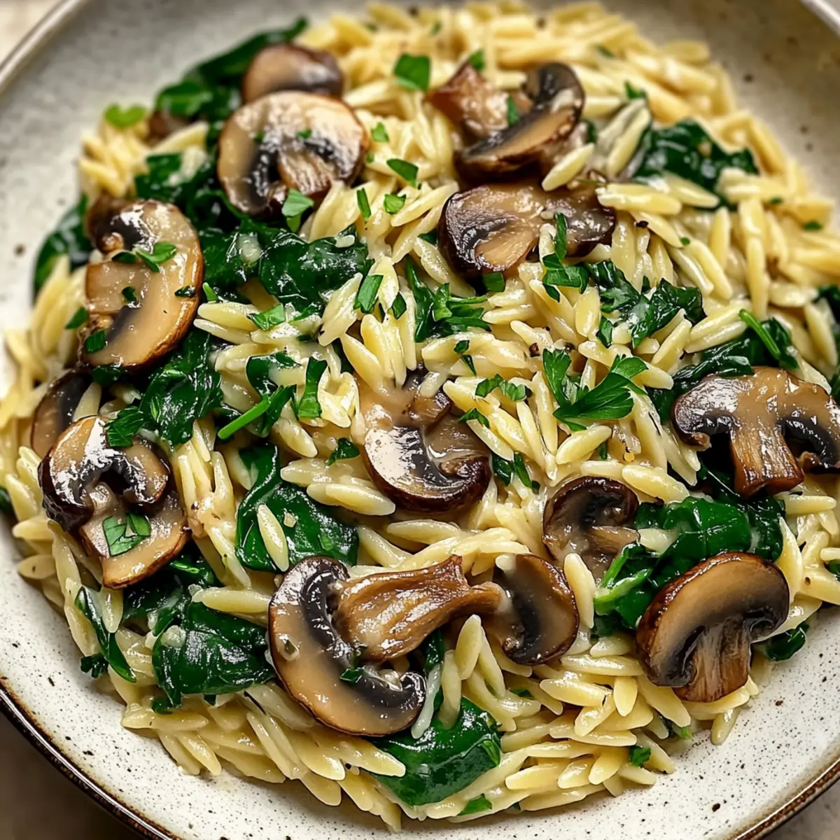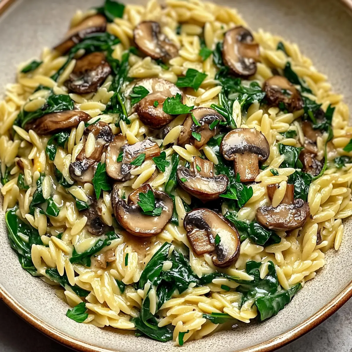 Facebook Twitter Pinterest LinkedInAs the delicious aroma of garlic begins to waft through my kitchen, I can’t help but feel a little thrill of anticipation. Today, I’m whipping up a bowl of Garlic Butter Orzo with Mushrooms and Spinach—a delightful vegetarian dish that is as comforting as it is quick to make. In just 20 minutes, tender orzo dances with earthy mushrooms and vibrant spinach, all enveloped in a rich garlic butter sauce that practically begs to be savored. This dish is not only easy on the schedule, but it’s also a fantastic way to elevate your weeknight meals into something extraordinary! So, are you ready to indulge in this cozy bowl of goodness that will definitely become a go-to recipe in your home? Why Choose Garlic Butter Orzo Tonight? Quick & Easy: This dish comes together in just 20 minutes, making it perfect for a busy weeknight dinner without sacrificing flavor. Comfort in Every Bite: The luscious garlic butter sauce envelops every morsel of orzo, mushrooms, and spinach for a satisfying experience that feels like a warm hug. Versatile Base: Swap the orzo for ditalini or acini di pepe to mix things up, or even add proteins like chicken or shrimp for a heartier meal. Satisfies Cravings: If you’re looking for a comforting vegetarian option, this dish strikes the right balance between indulgence and health. Don’t forget to pair it with a simple mixed green salad for a complete dining experience or try it with crusty bread for extra coziness. Flavorful and Nutritious: Packed with nutrients from spinach and earthy mushrooms, this dish looks after your palate and your health. Plus, it’s a great way to impress family or guests without spending hours in the kitchen! Garlic Butter Orzo Ingredients • Get ready to create your cozy bowl of goodness! For the Orzo Orzo Pasta – The delightful base of this dish; you can substitute with acini di pepe or ditalini for a different bite. For the Sauce Unsalted Butter – Adds richness and flavor; swap it out for vegan butter if you’re looking for a dairy-free option. Olive Oil – Enhances depth of flavor and helps prevent butter from browning; any neutral oil will work as a substitute. Garlic – Delivers a fragrant, savory kick; fresh garlic is best, but in a pinch, garlic powder works (1/4 tsp per clove). For the Aromatics Onion – Provides natural sweetness; shallots can be used if you prefer a milder flavor. For the Vegetables Cremini or Button Mushrooms – Impart an earthy, meaty texture; try shiitake or portobello for unique flavors. Fresh Spinach – Brings vibrant color and nutrients; feel free to replace it with kale or Swiss chard but adjust cooking time as needed. For the Finish Grated Parmesan Cheese – Contributes nuttiness and helps to thicken the sauce; use nutritional yeast for a vegan alternative. Vegetable or Chicken Broth – Adds savory flavor and moisture; low-sodium options are available by using water or homemade broth. Salt and Pepper – Essential for balancing the flavors; adjust to your taste. Lemon Juice – Brightens the dish and enhances flavors; fresh lemon is ideal, but bottled juice can work in moderation. Fresh Parsley – For garnish, it adds a fresh finishing touch; basil or cilantro can be substituted for a twist on flavor. Now that you have everything you need, let’s dive into crafting this delightful Garlic Butter Orzo with Mushrooms and Spinach! Step‑by‑Step Instructions for Garlic Butter Orzo with Mushrooms and Spinach Step 1: Cook Orzo Begin by bringing a large pot of salted water to a rolling boil over high heat. Once boiling, add the orzo pasta and cook according to the package instructions until al dente, usually about 8-10 minutes. You’ll know it’s ready when it’s tender yet slightly firm to the bite. Drain the orzo and set it aside in a large bowl. Step 2: Sauté Aromatics In a large skillet, melt 2 tablespoons of unsalted butter with 1 tablespoon of olive oil over medium heat. Once the butter has melted and starts to bubble, add 2 minced garlic cloves and 1 finely chopped onion. Sauté for 2-3 minutes until the onion is translucent and aromatic, being careful not to let the garlic brown to avoid bitterness. Step 3: Cook Mushrooms Add 8 ounces of sliced cremini or button mushrooms to the skillet with the sautéed garlic and onion. Cook for about 5-7 minutes, stirring occasionally until the mushrooms become tender and their moisture evaporates, leaving a deep earthy aroma. This step is crucial for enhancing the flavor in your Garlic Butter Orzo. Step 4: Add Spinach Stir in 4 cups of fresh spinach into the skillet, cooking for another 2-3 minutes until the leaves are wilted and vibrant green. As the spinach reduces, it will blend seamlessly with the sautéed mushrooms and aromatics, creating a lush base for your dish. Step 5: Simmer Broth Pour in 1 cup of vegetable or chicken broth to the skillet, bringing it to a gentle simmer over medium heat. This will help deglaze the pan and incorporate all those beautiful flavors. Allow it to simmer for about 3 minutes, stirring occasionally, until the mixture gently bubbles and begins to thicken slightly. Step 6: Combine Orzo Add the reserved orzo pasta into the skillet, tossing gently to combine all the ingredients thoroughly. Stir for about 2 minutes, ensuring that the orzo absorbs the delicious garlic butter sauce and evenly distributes with the mushrooms and spinach. Step 7: Add Cheese Reduce the heat to low and sprinkle in ½ cup of grated Parmesan cheese, stirring constantly until it has melted and the sauce thickens. You will notice a creamy texture enveloping the orzo, making your Garlic Butter Orzo truly comforting and indulgent. Step 8: Season to Taste Taste your rich dish and adjust the flavors with salt, freshly cracked pepper, and a squeeze of lemon juice for brightness. Let the flavors meld together for another minute, ensuring your Garlic Butter Orzo with Mushrooms and Spinach is perfectly balanced an